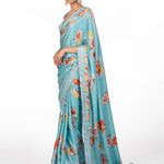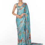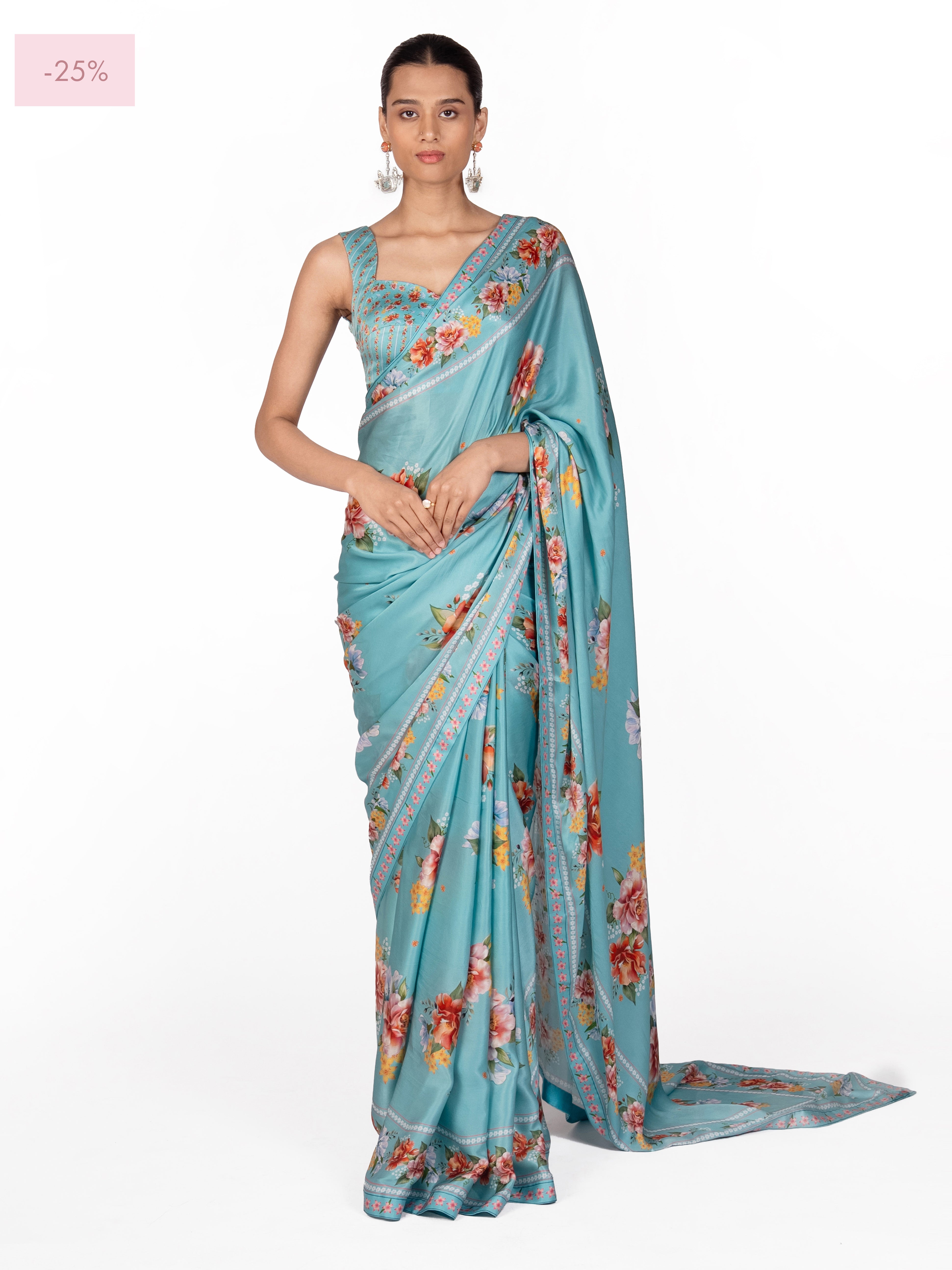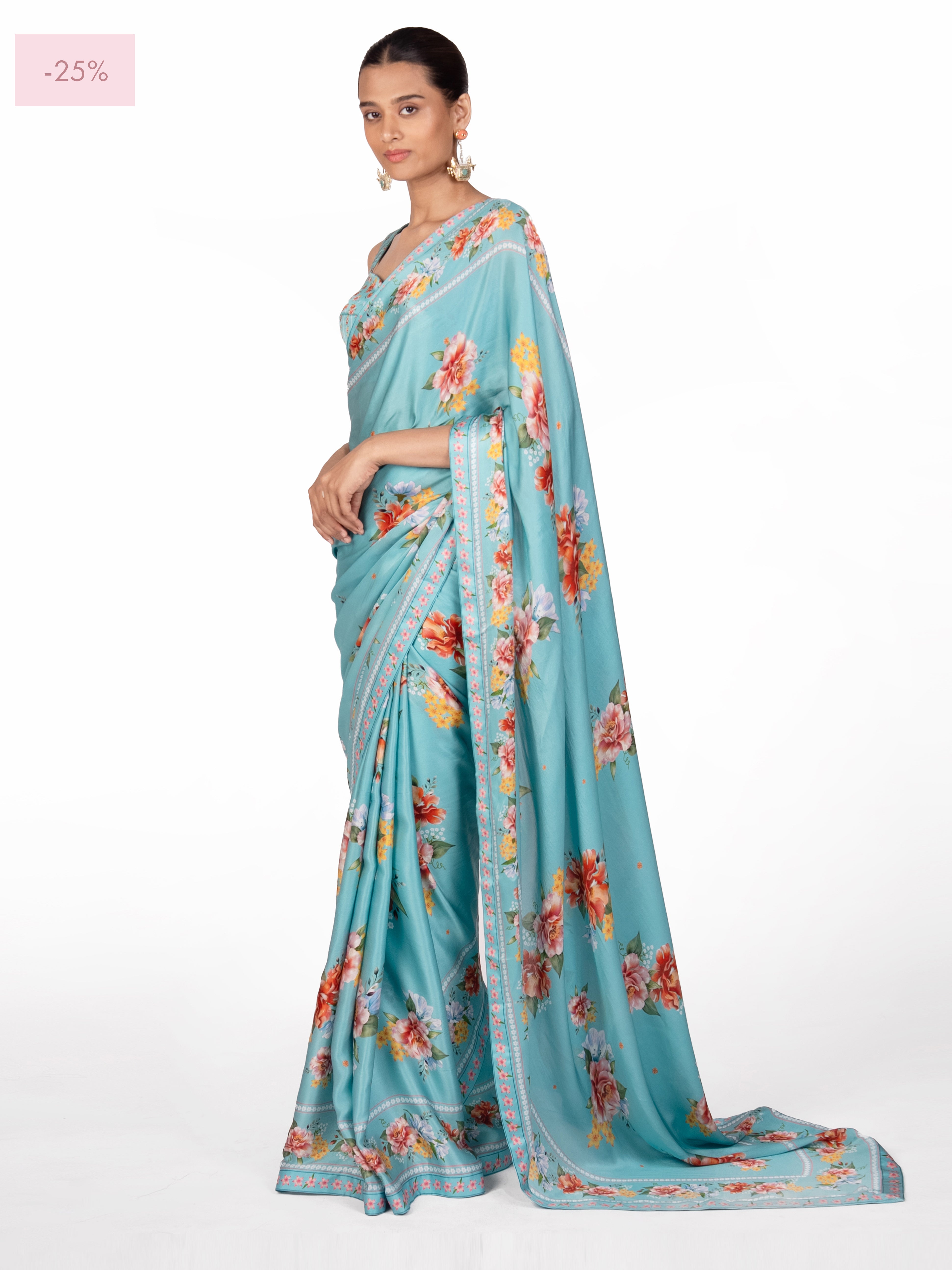 ‘Liora’ teal blue satin silk saree featuring floral butis and floral border and comes with matching floral printed blouse with sweetheart neckline.