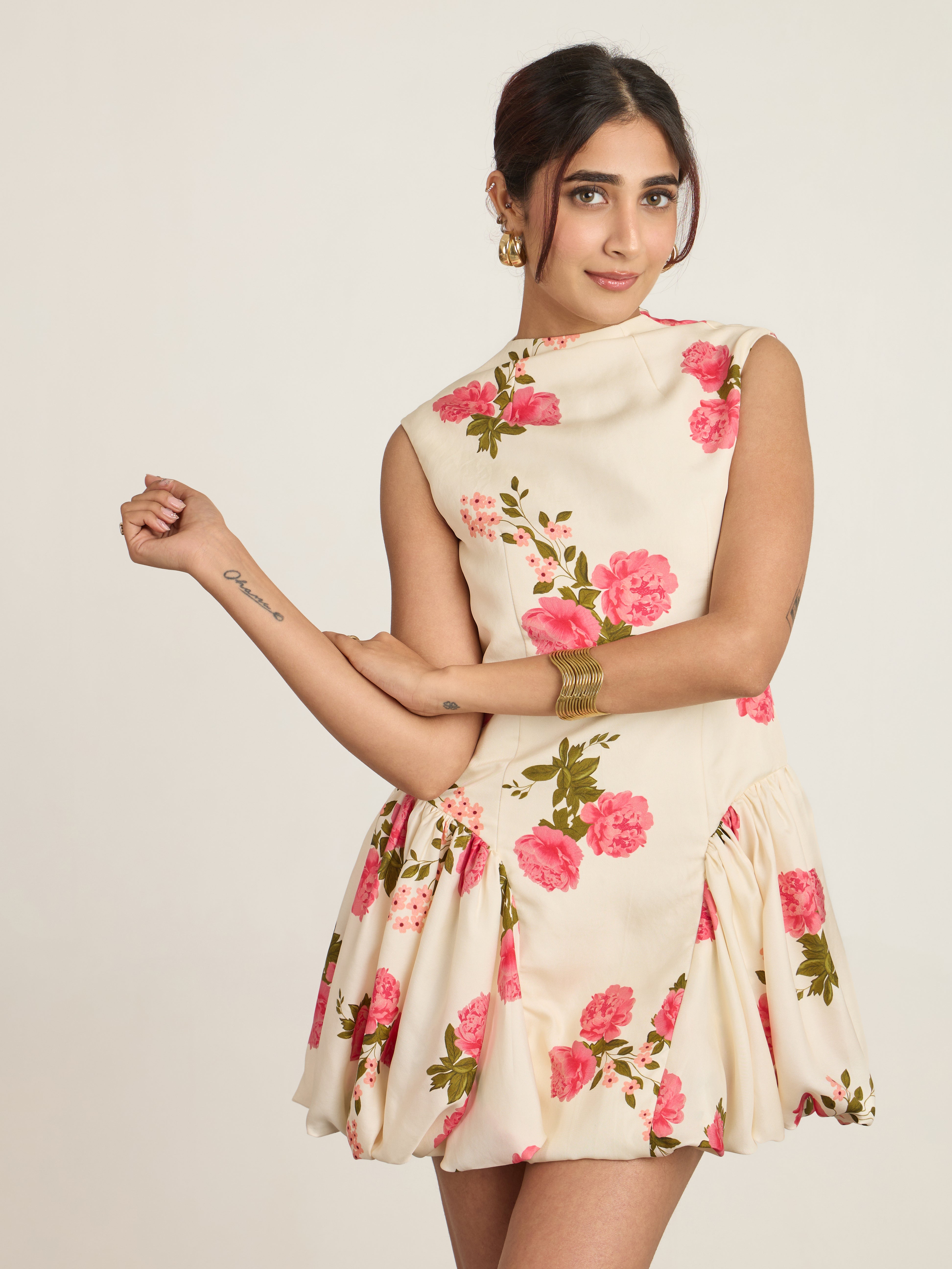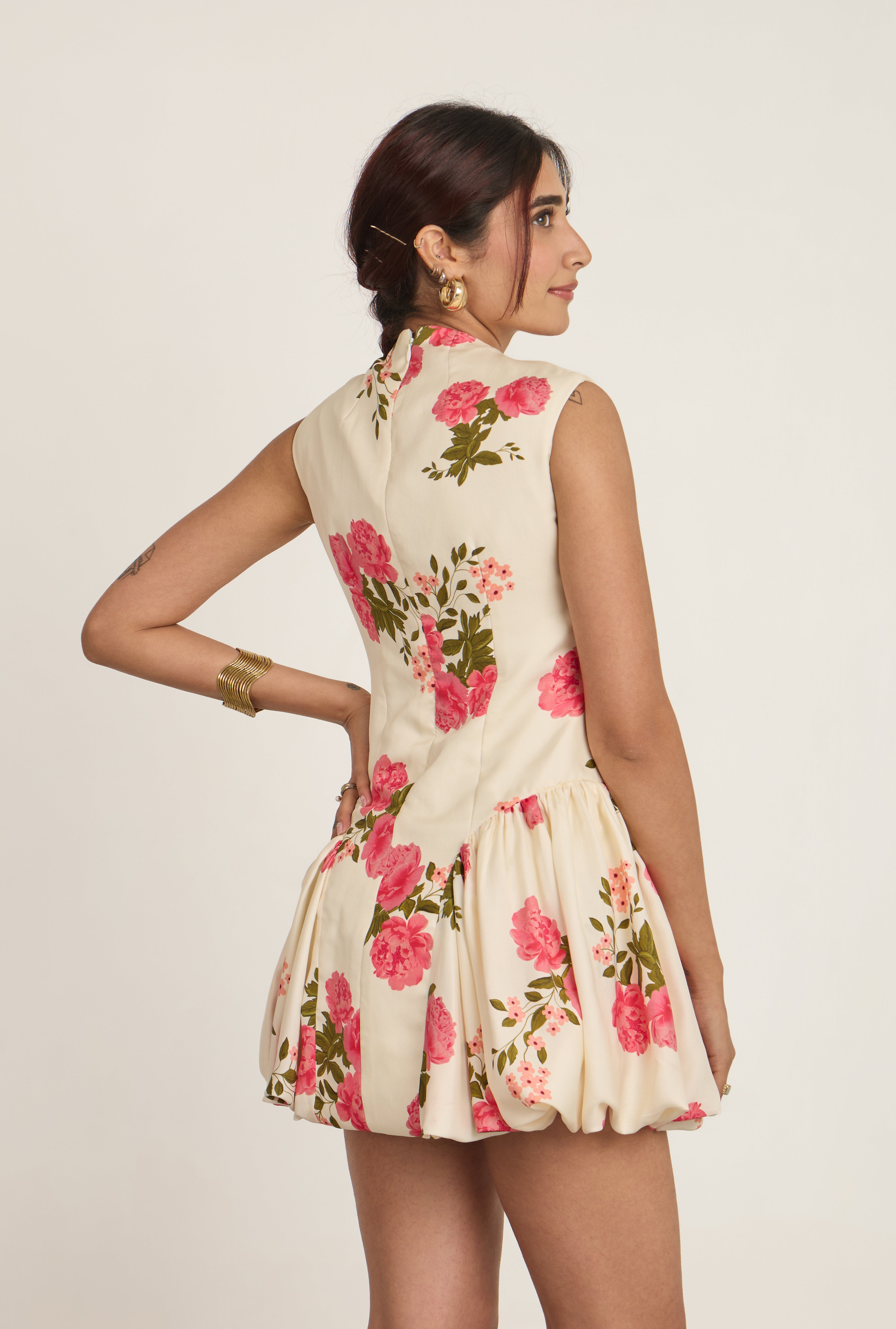 'Alora' ivory high neck drop waist puffball floral printed mini dress.