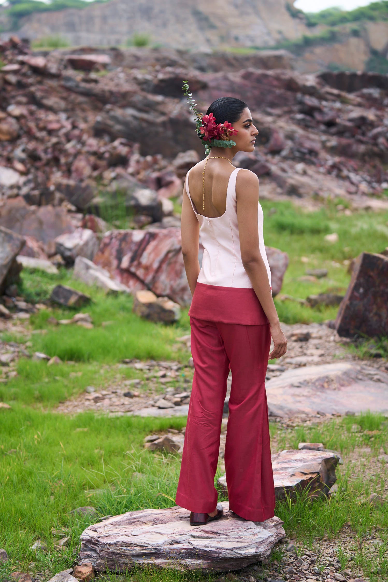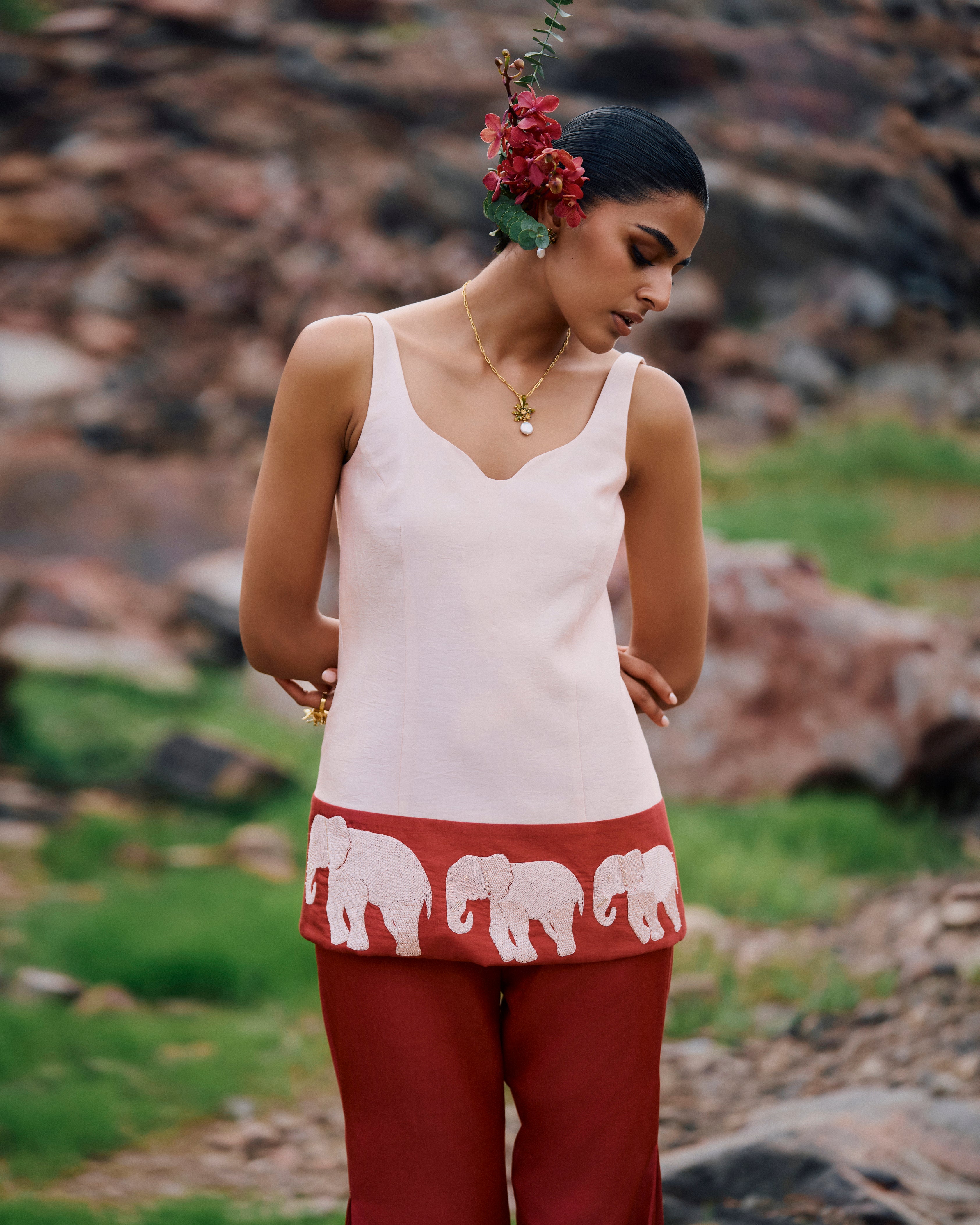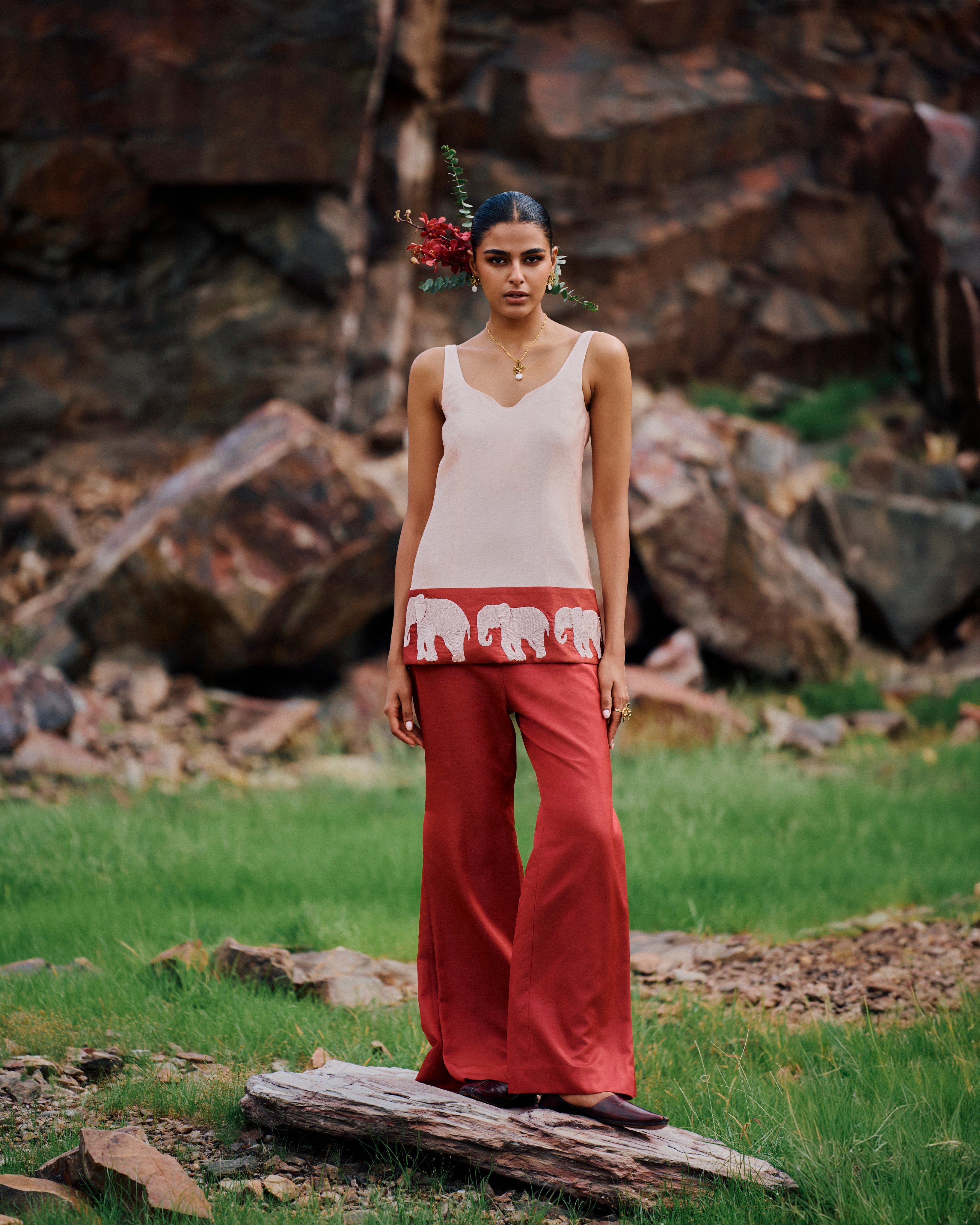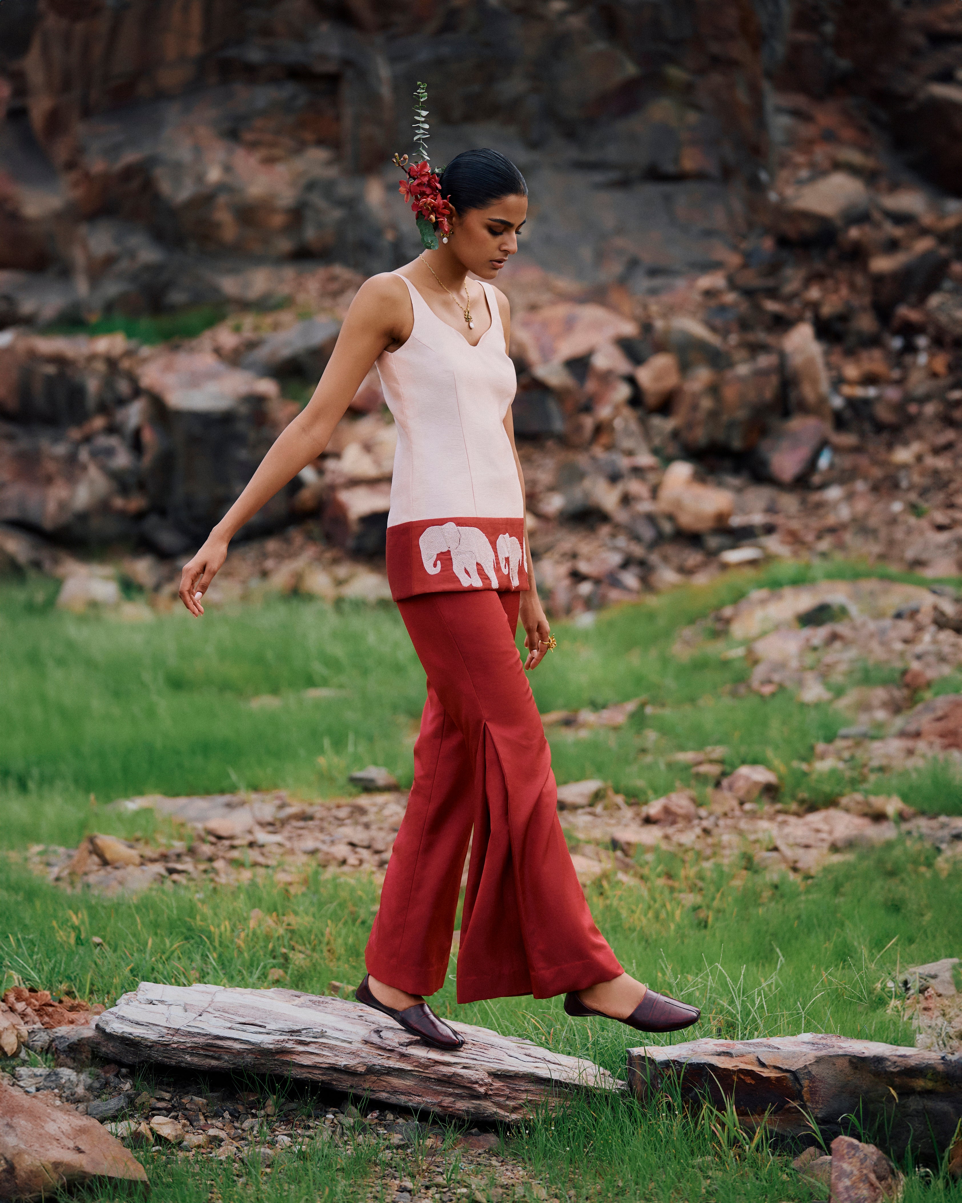 Short blush pink and maroon panneled 'Anjana' kurta features hand embroidered elephant herd and is paired with 'Charu' Katan Silk Godet pants.