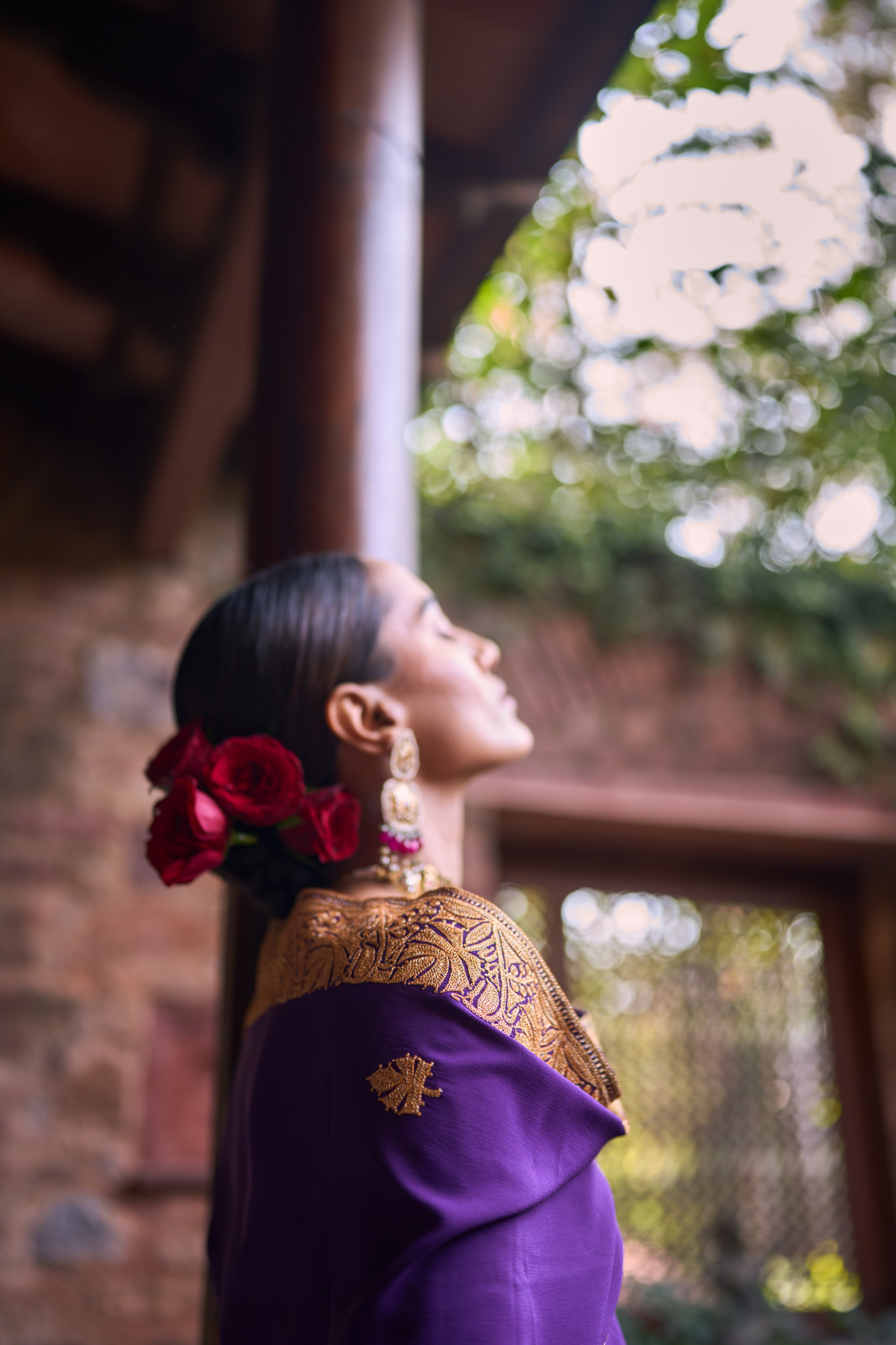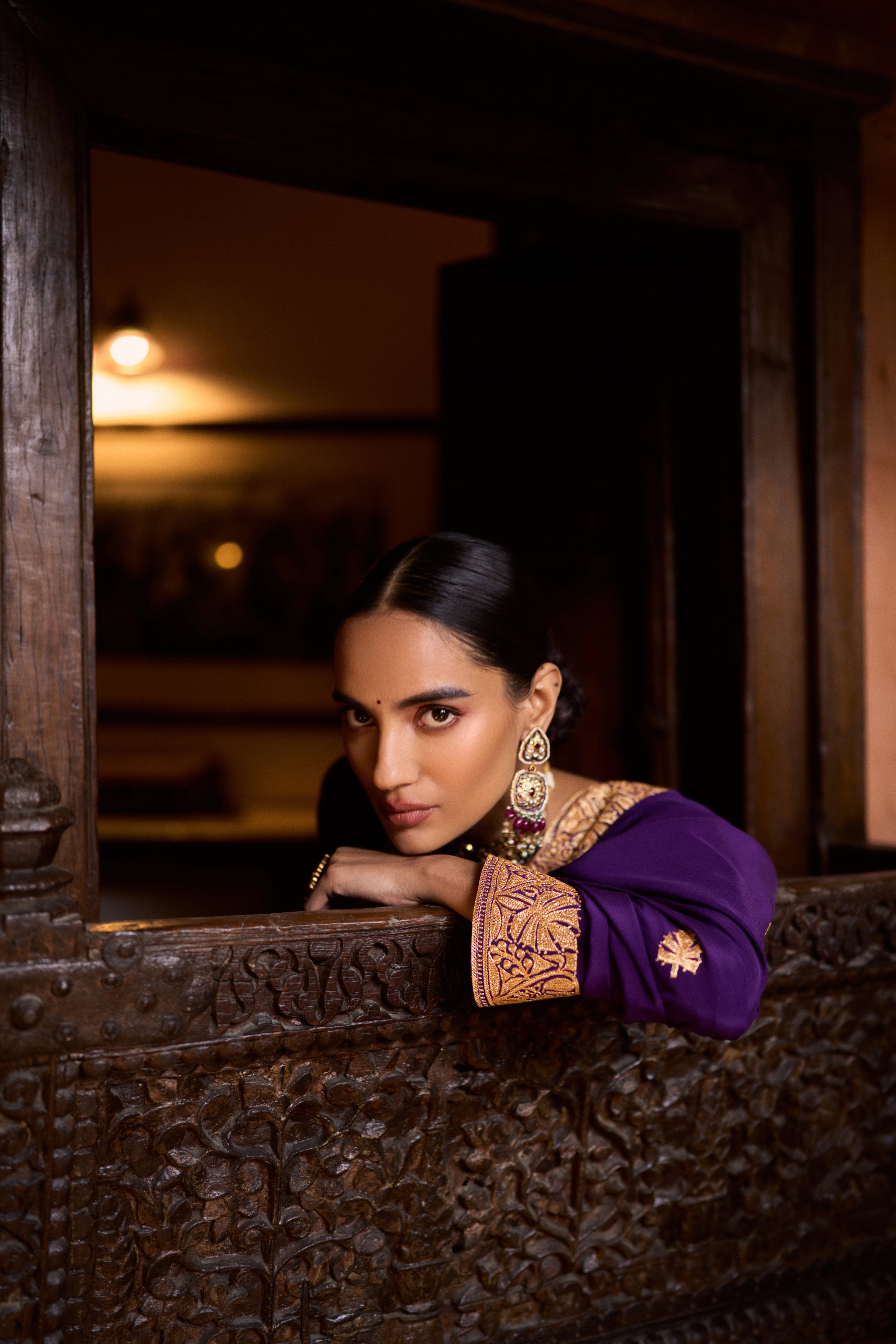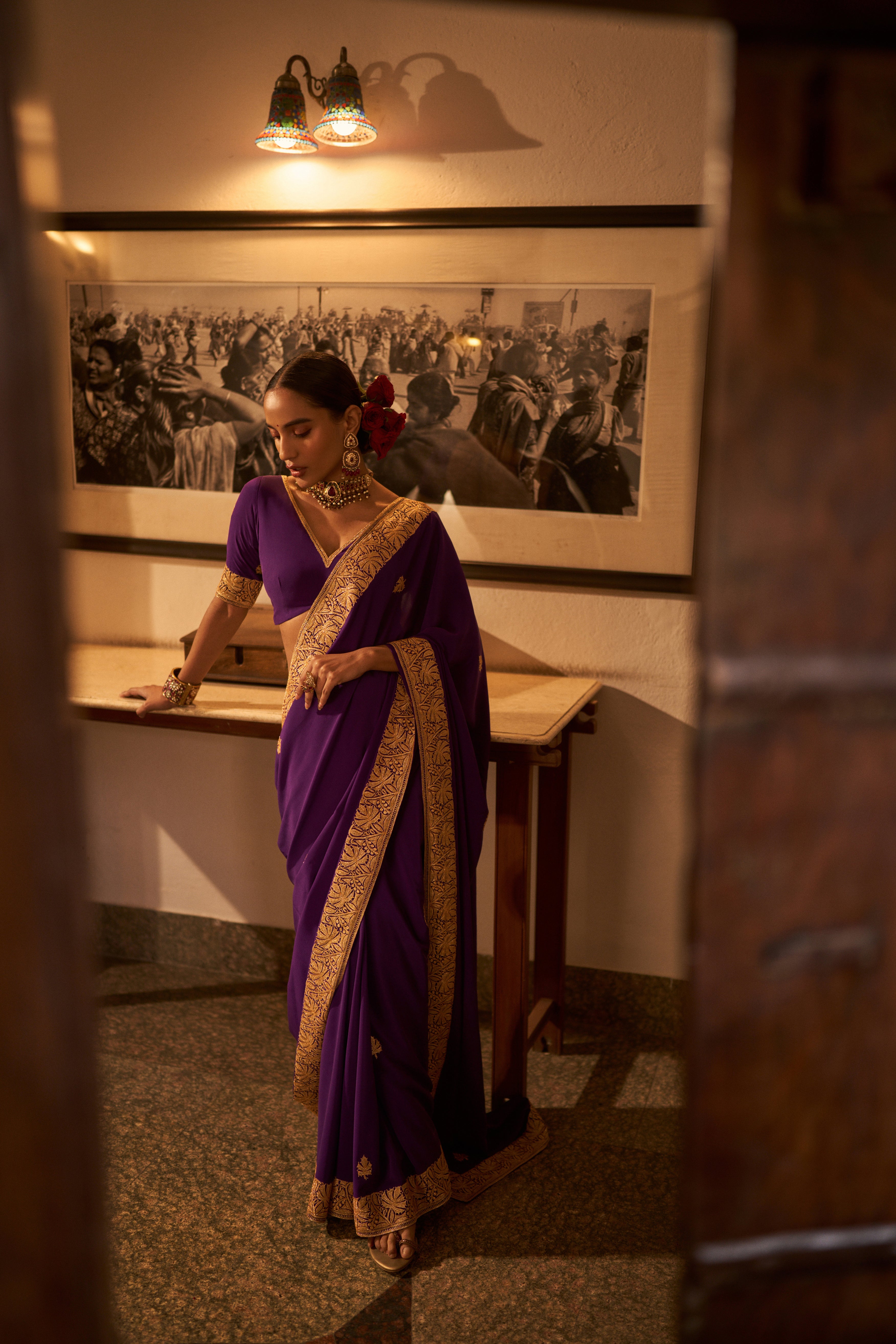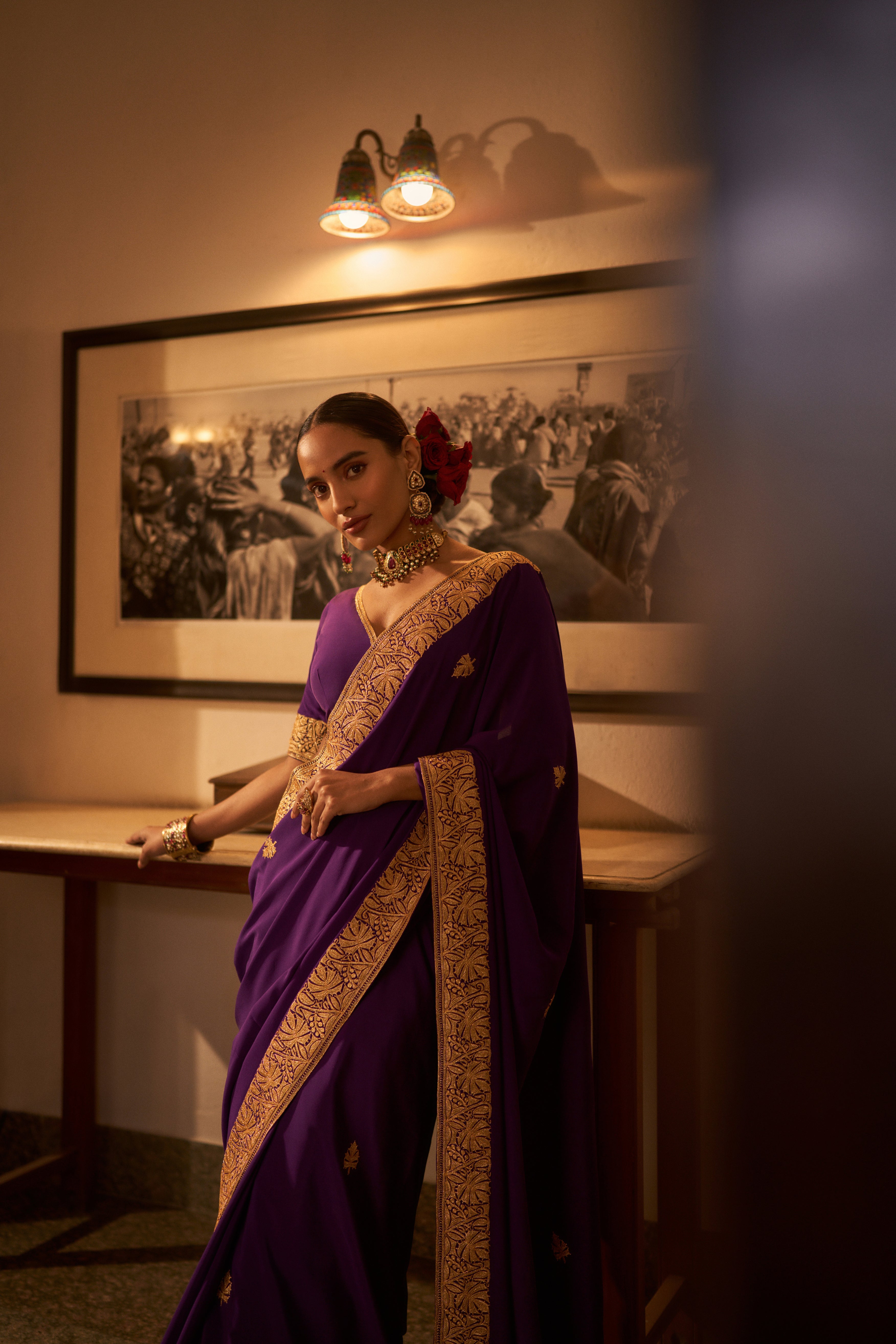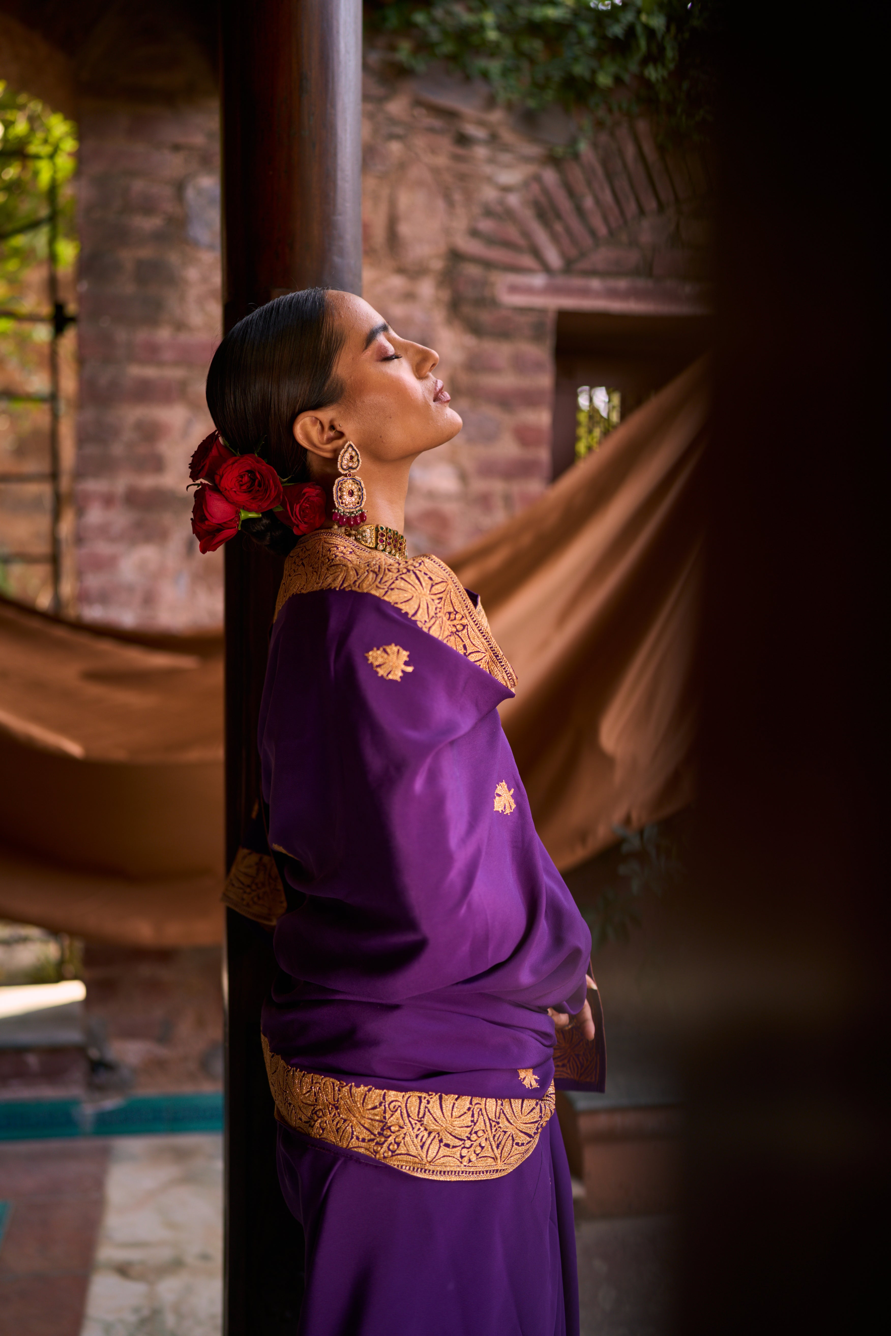 'Banafsha' Grape purple Hand Embroidered Kashmiri tilla work saree features majestic chinar leaf border along with chinar leaf butis all over.It is paired with a matching hand embroidered crepe silk blouse.