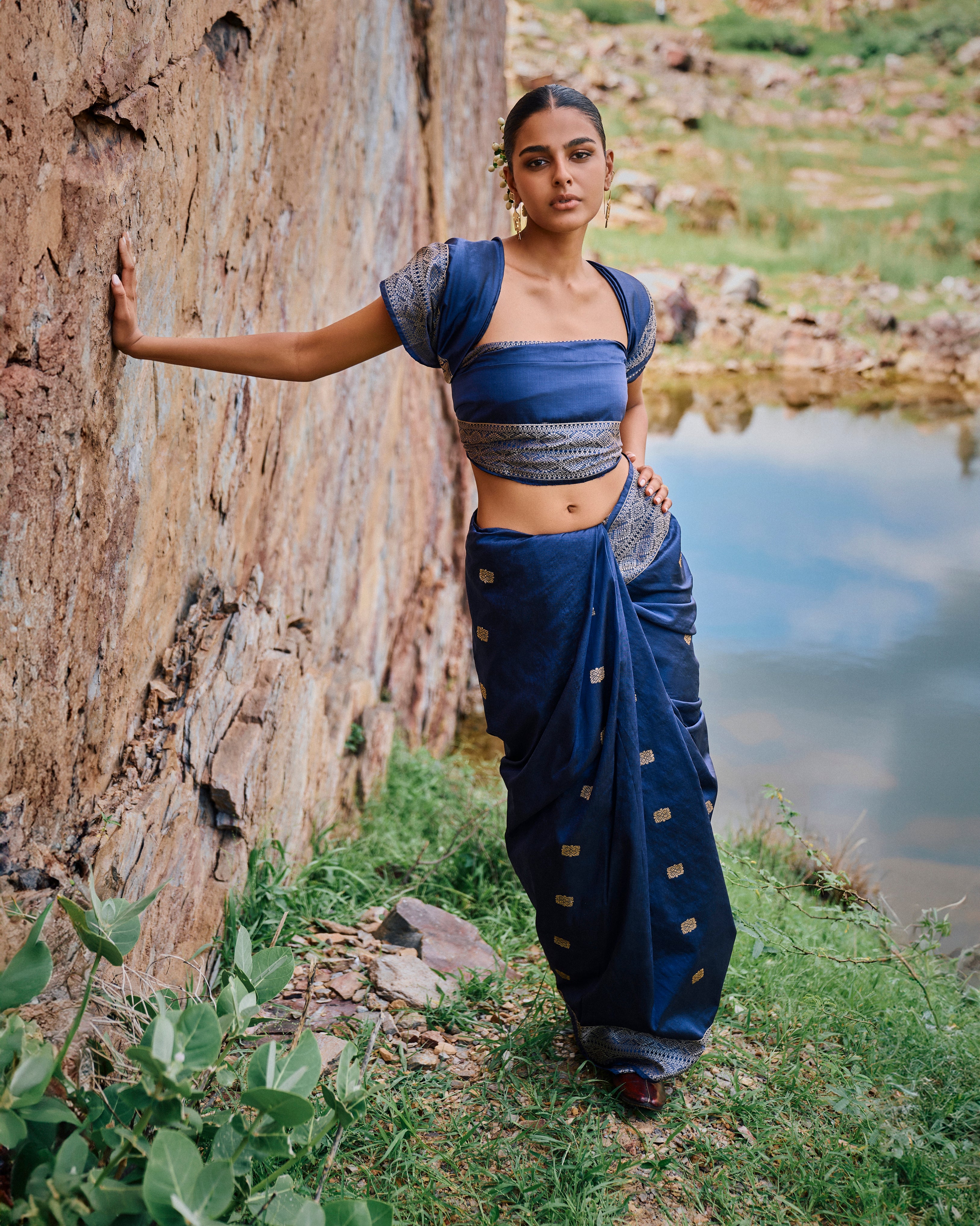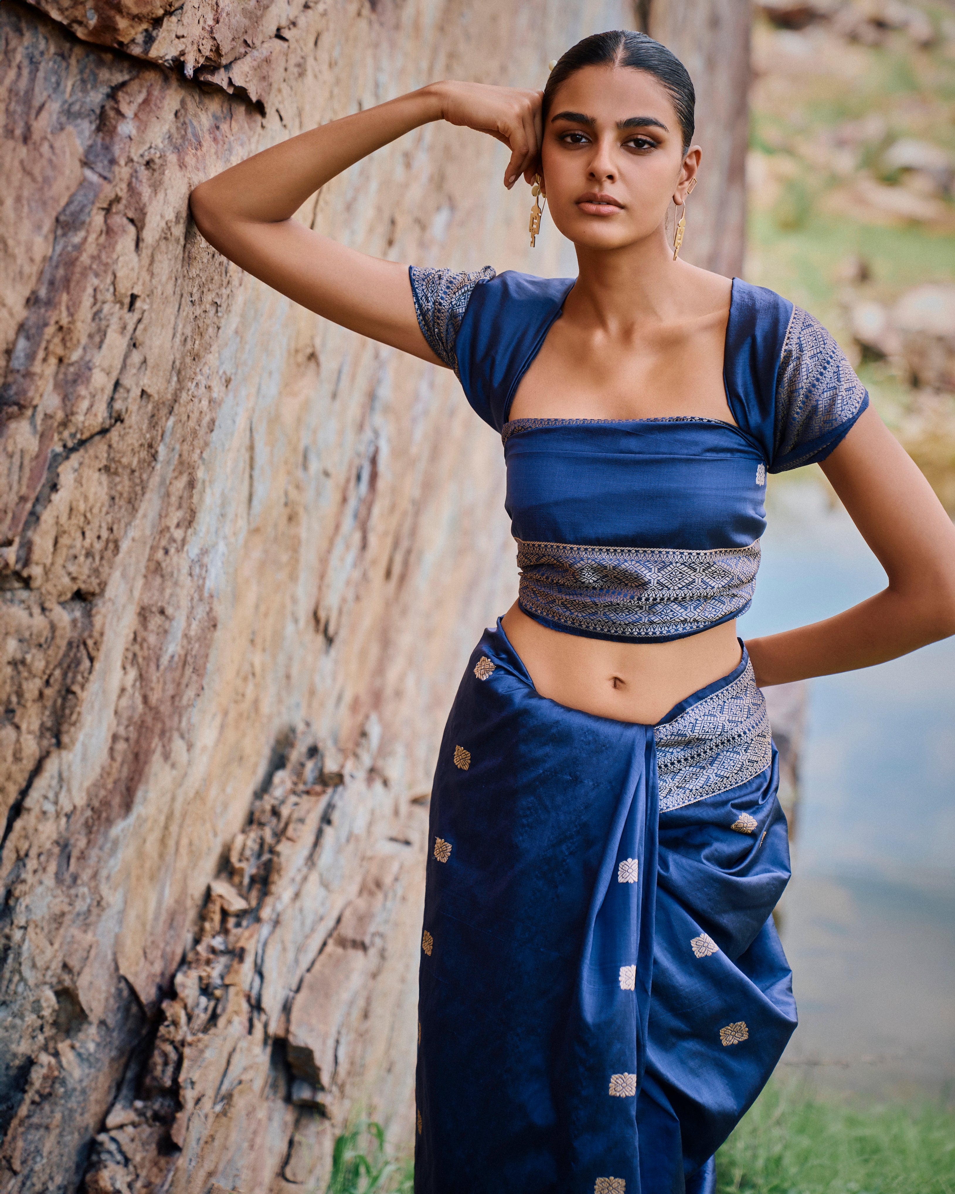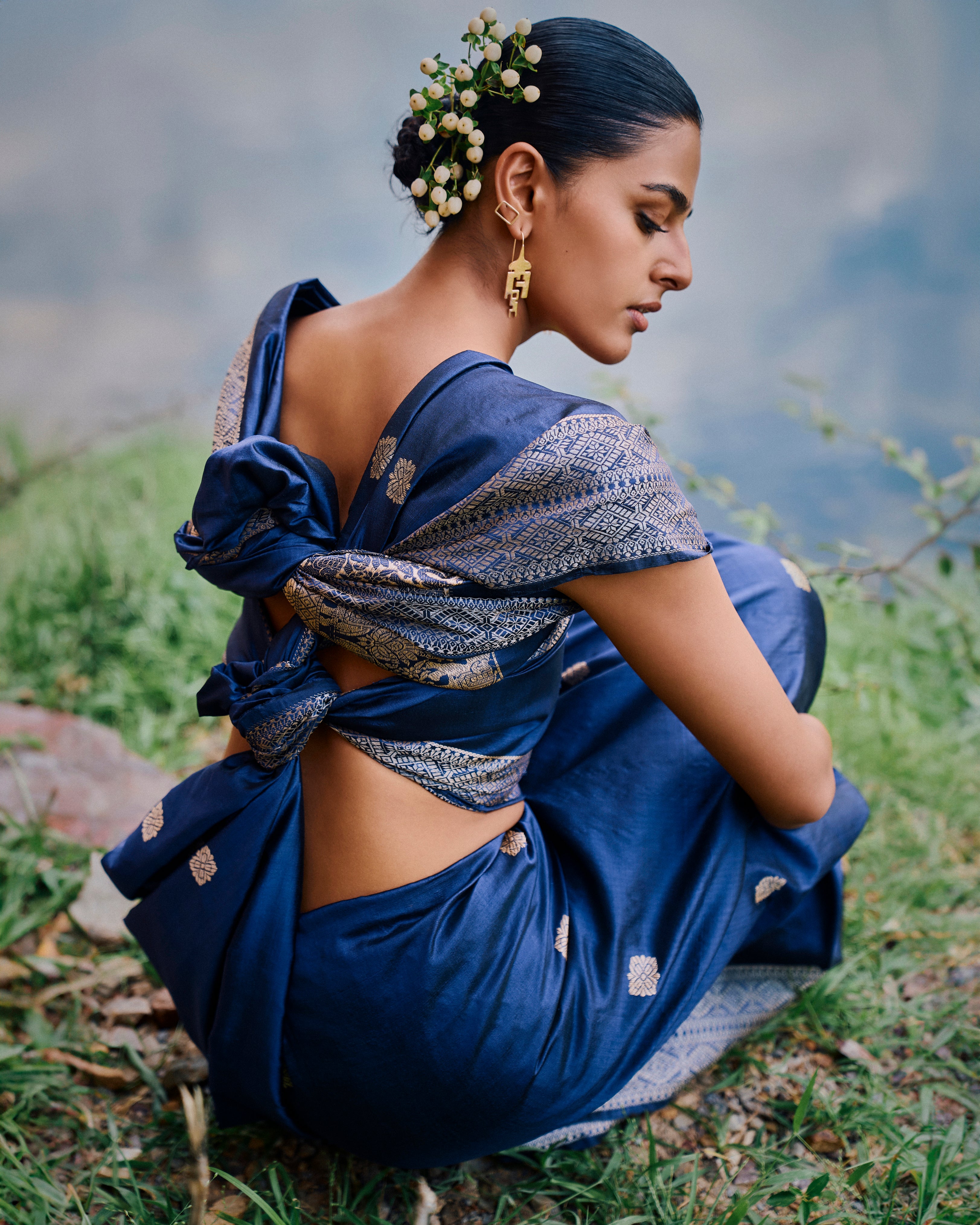 'Sarasvat' Blue handwoven mulberry silk saree features Floral inspired Border and butis all over and comes with matching unstitched blouse piece.
