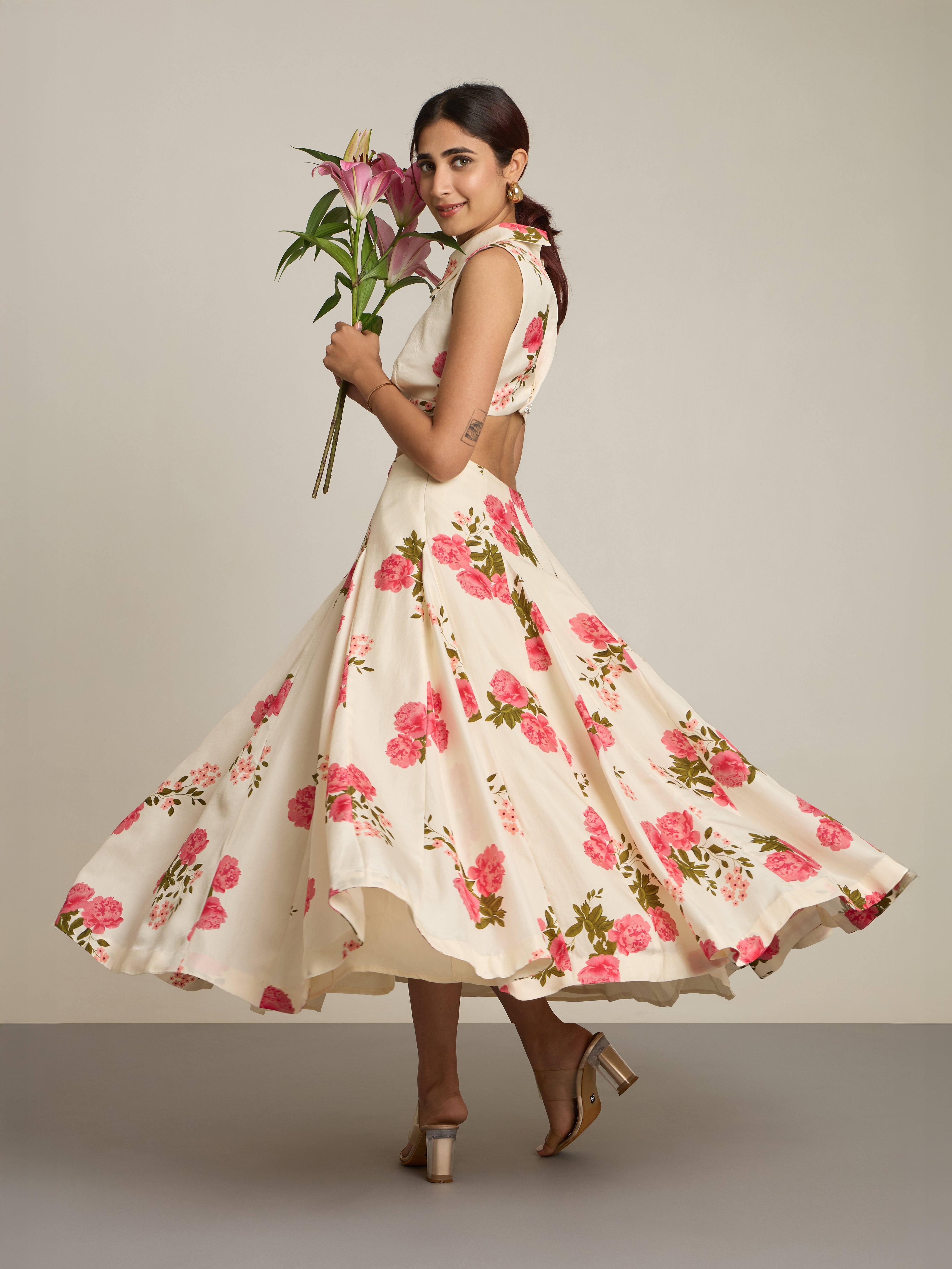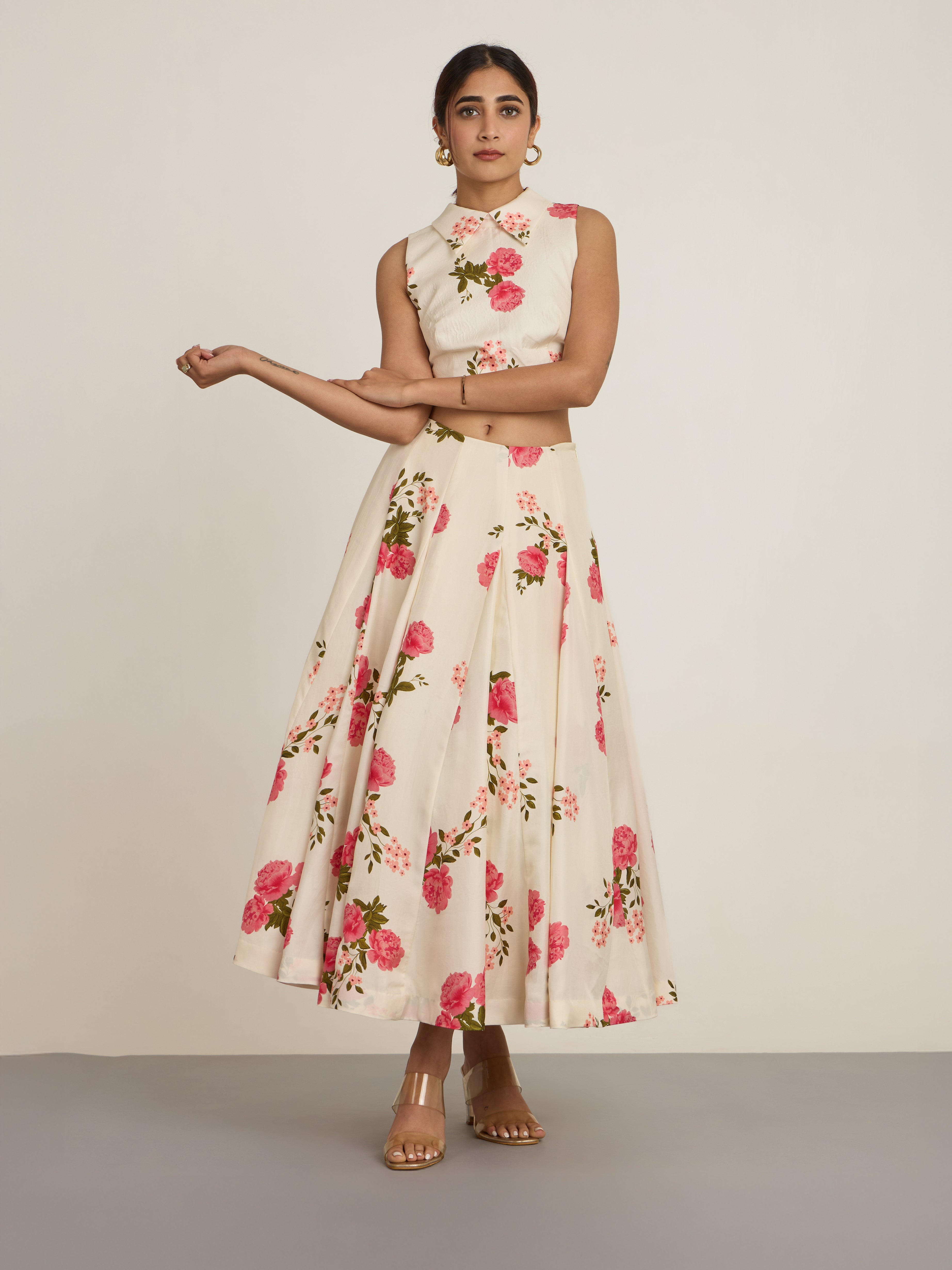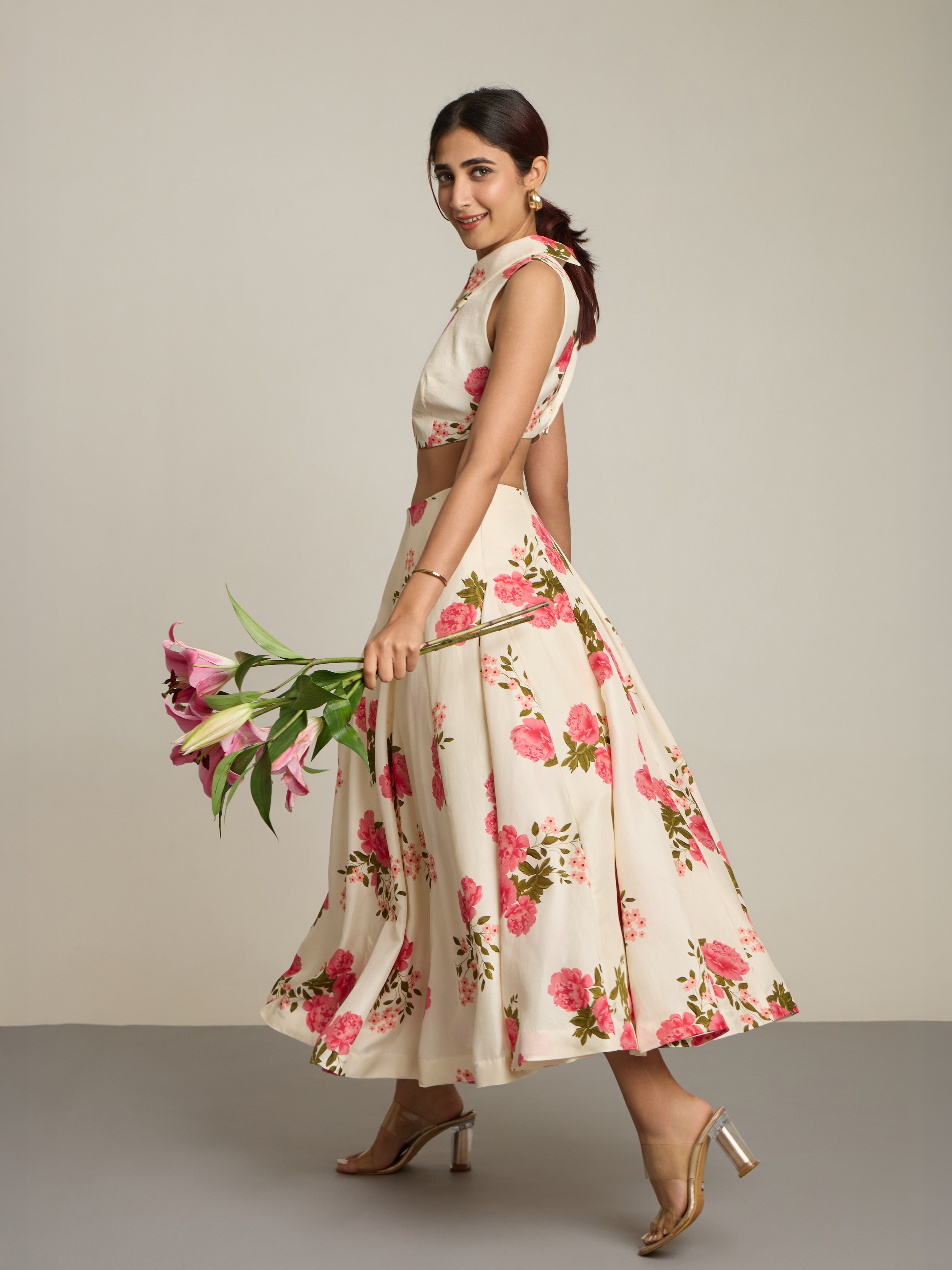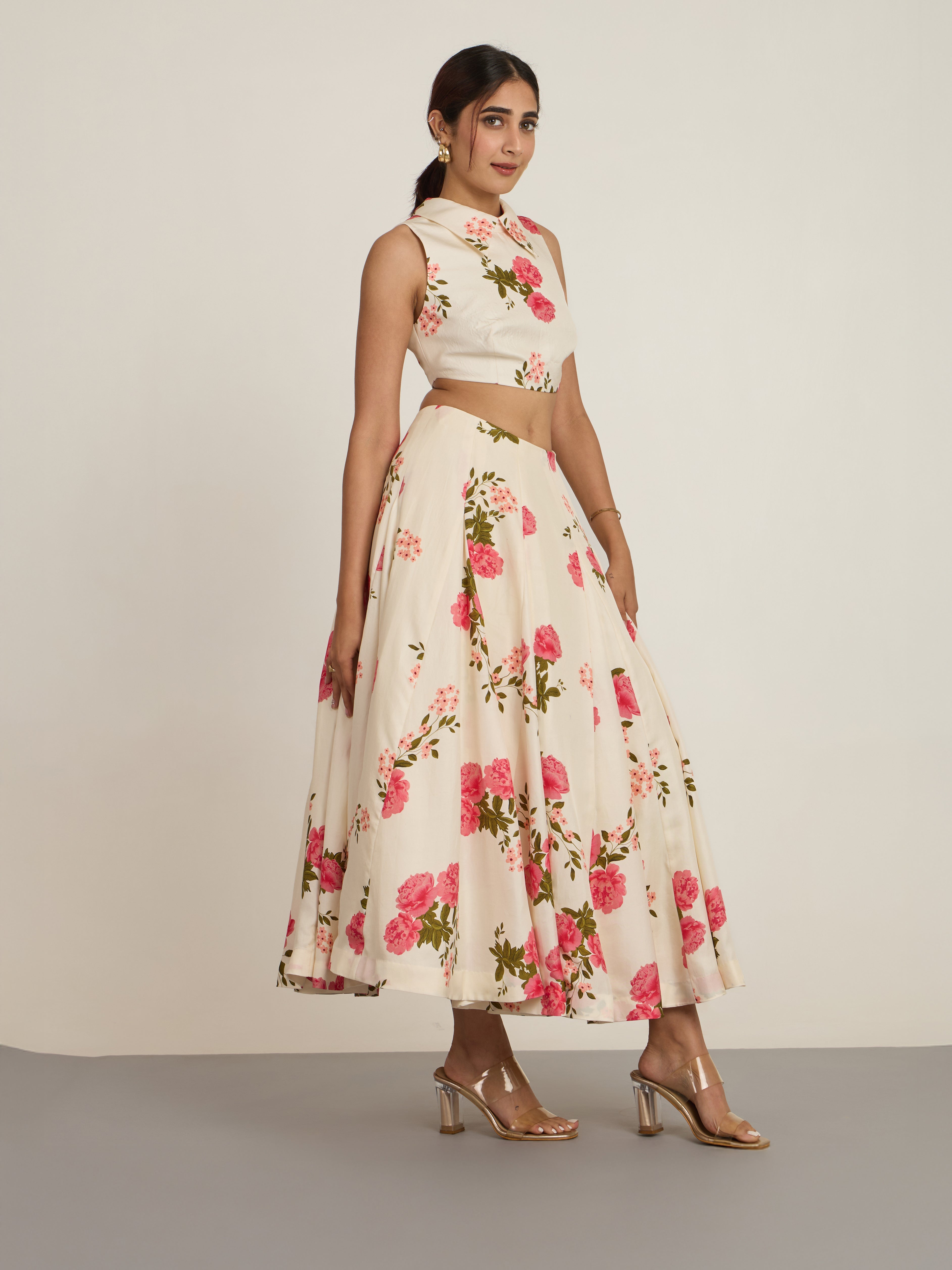 'Calista' ivory collared crop floral printed top with matching floral printed ivory maxi length skirt.