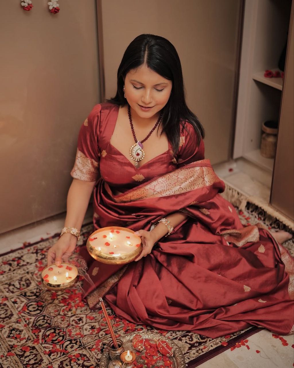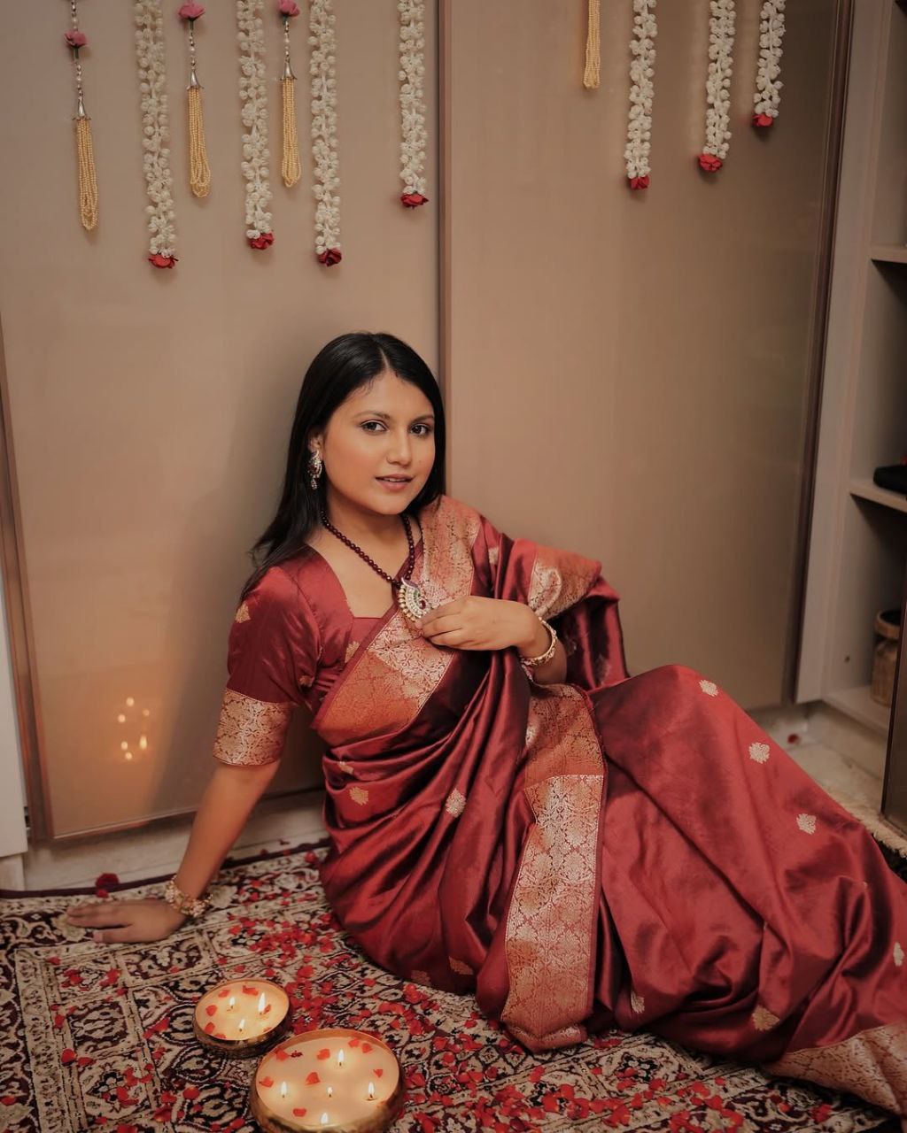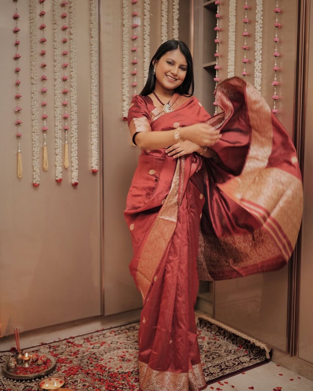 'Unnati' Red handwoven Mulberry silk saree features Floral inspired border and butis all over and comes with matching unstitched blouse piece.