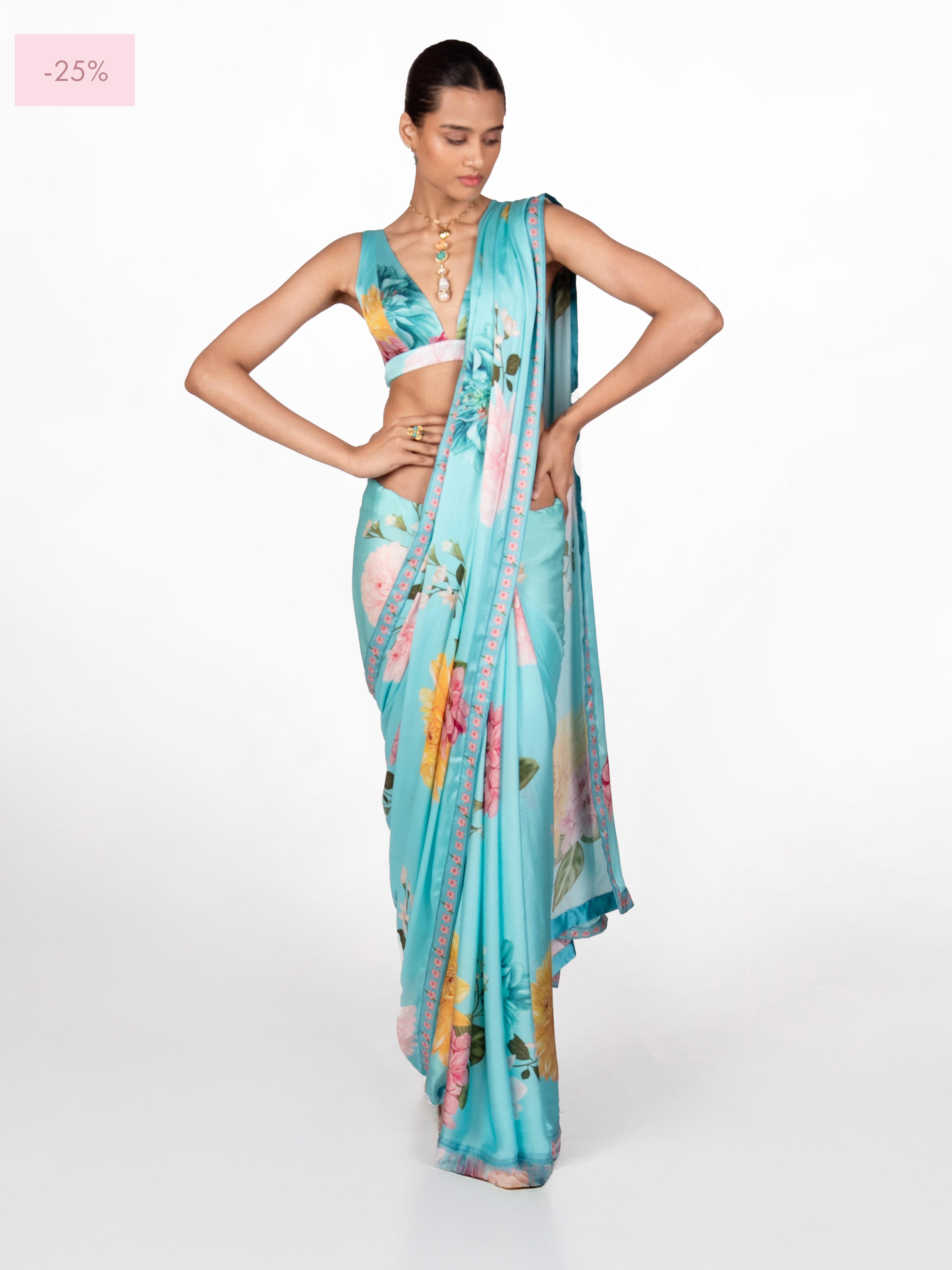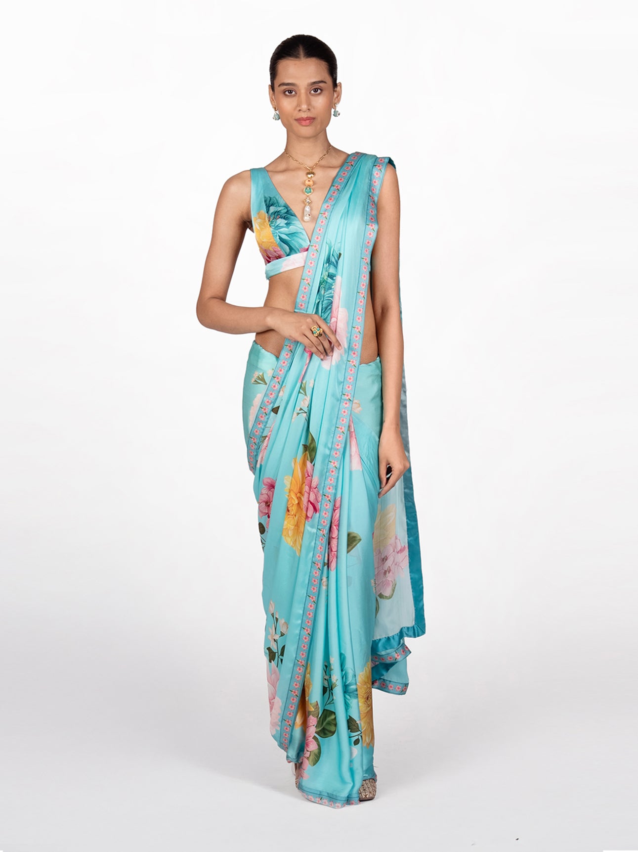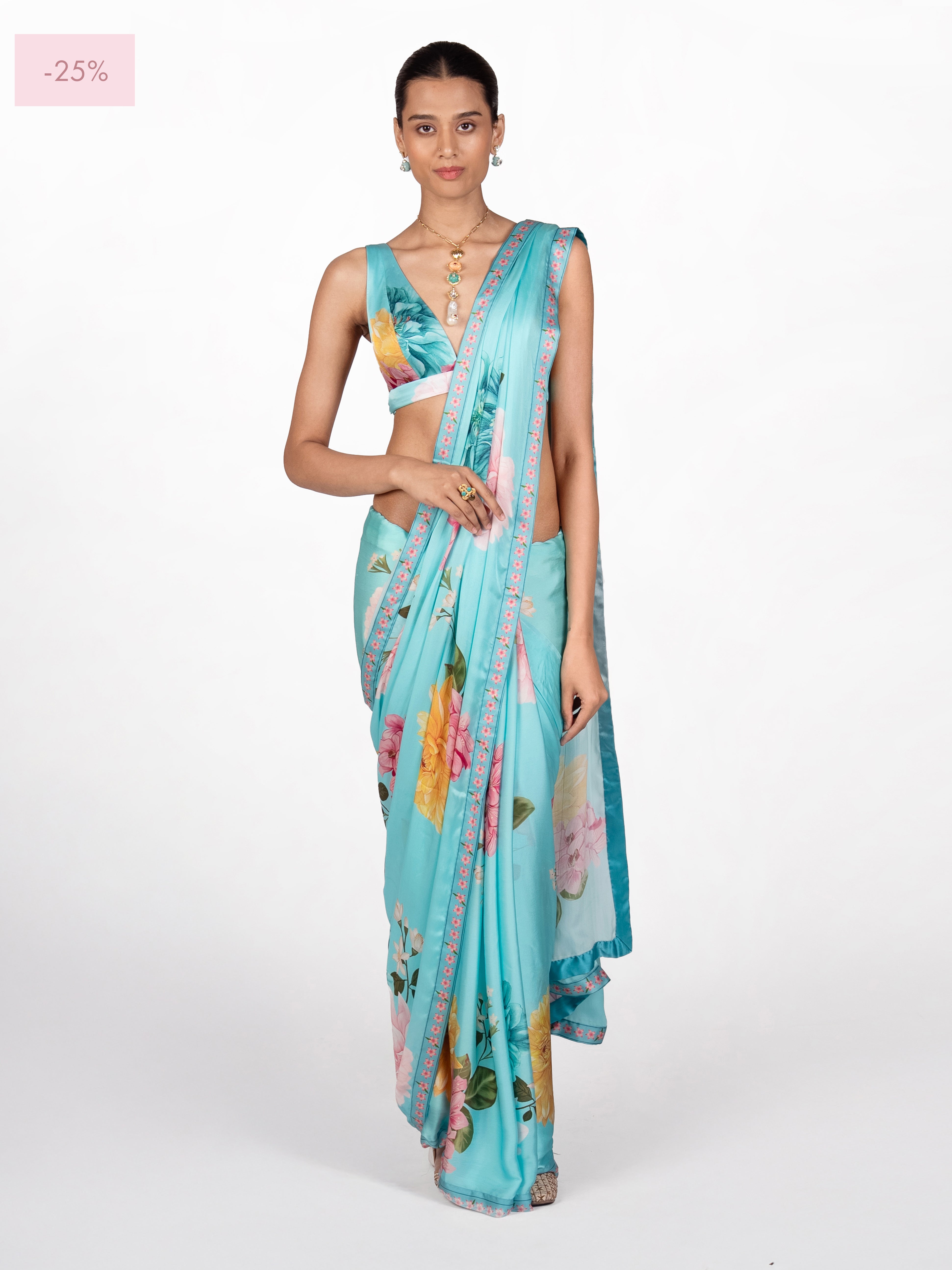 'Veya' teal blue satin silk saree featuring big floral placement and it is paired with a matching floral printed sleeveless blouse featuring plunging V-neckline.