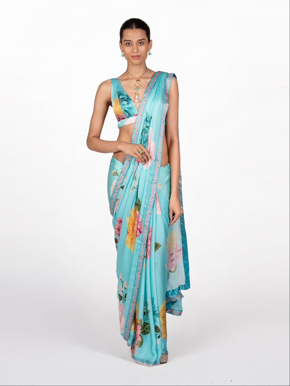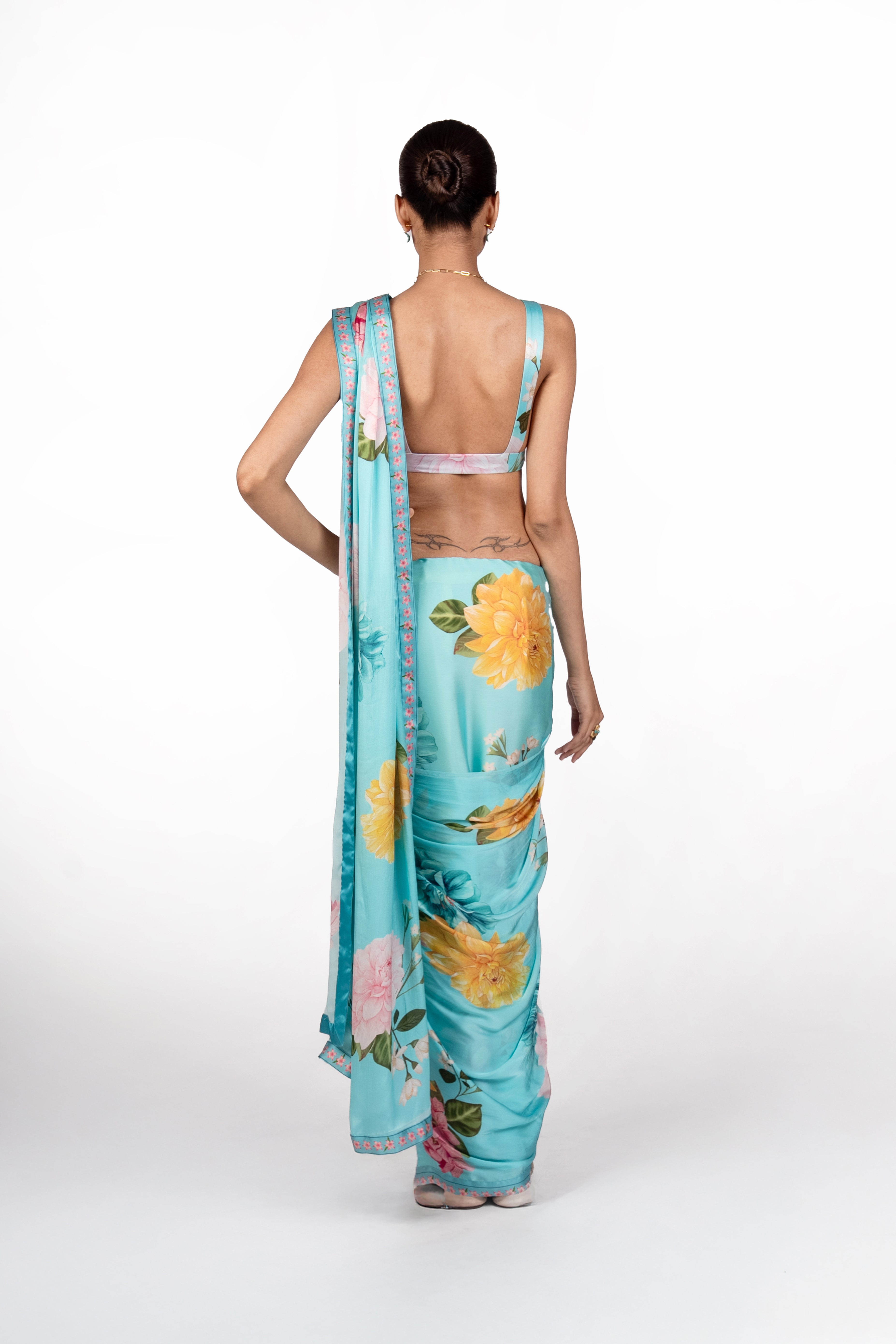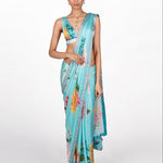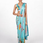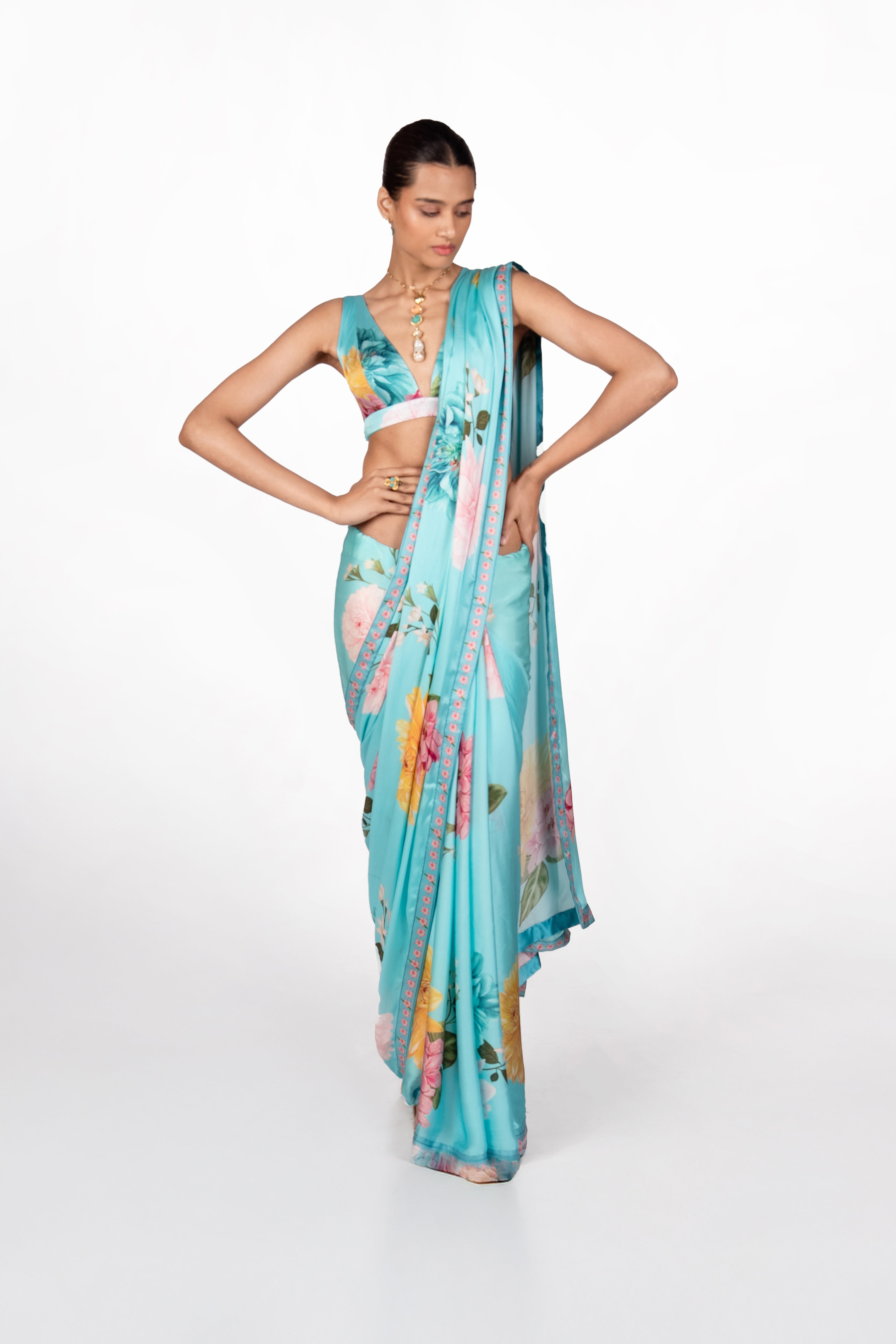 'Veya' teal blue satin silk saree featuring big floral placement and it is paired with a matching floral printed sleeveless blouse featuring plunging V-neckline.