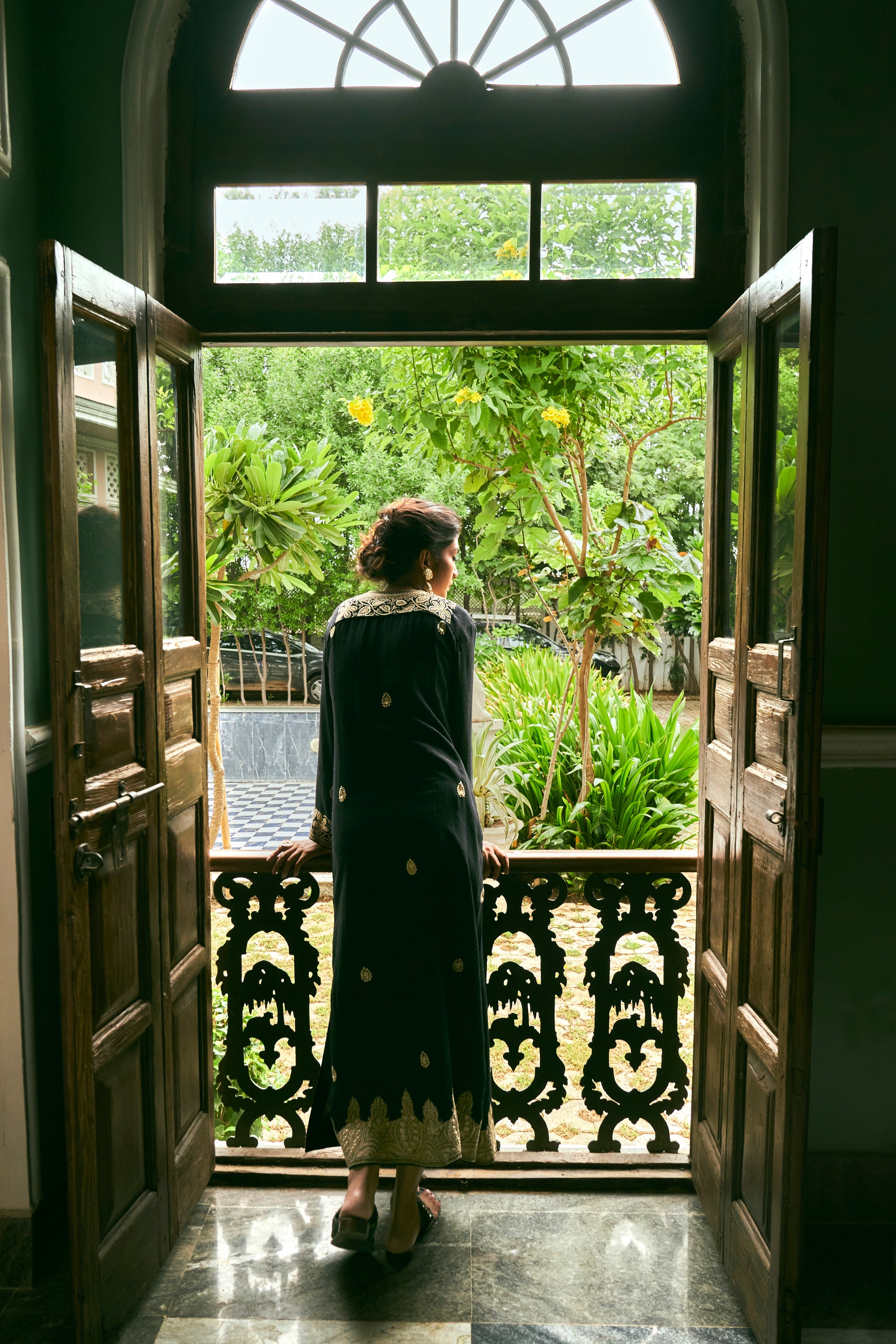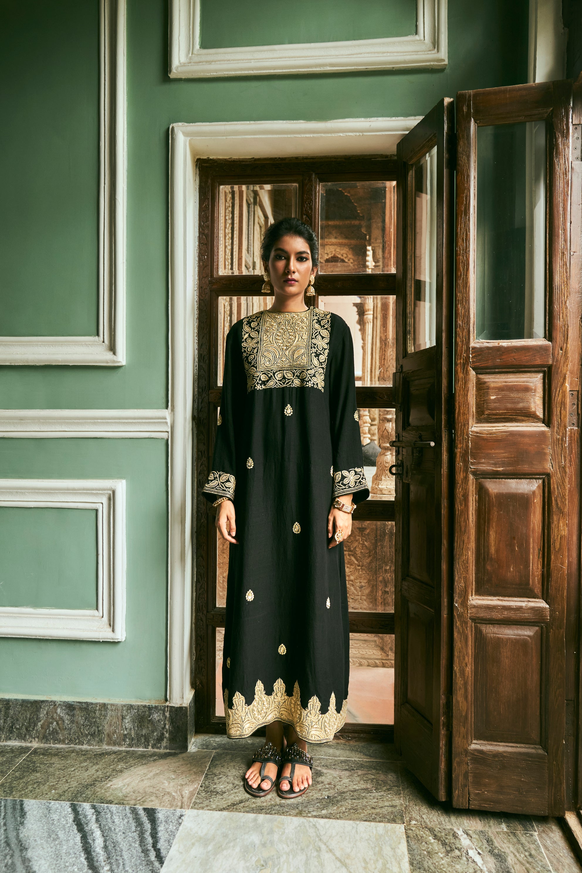 ‘Darya’ Black Kaftan crafted from luxurious Matka Silk features hand embroidered floral detailing at the neckline and Ambi motifs all over, complemented by the exquisite artistry of Kashmiri tilla work at both the border and sleeves.
