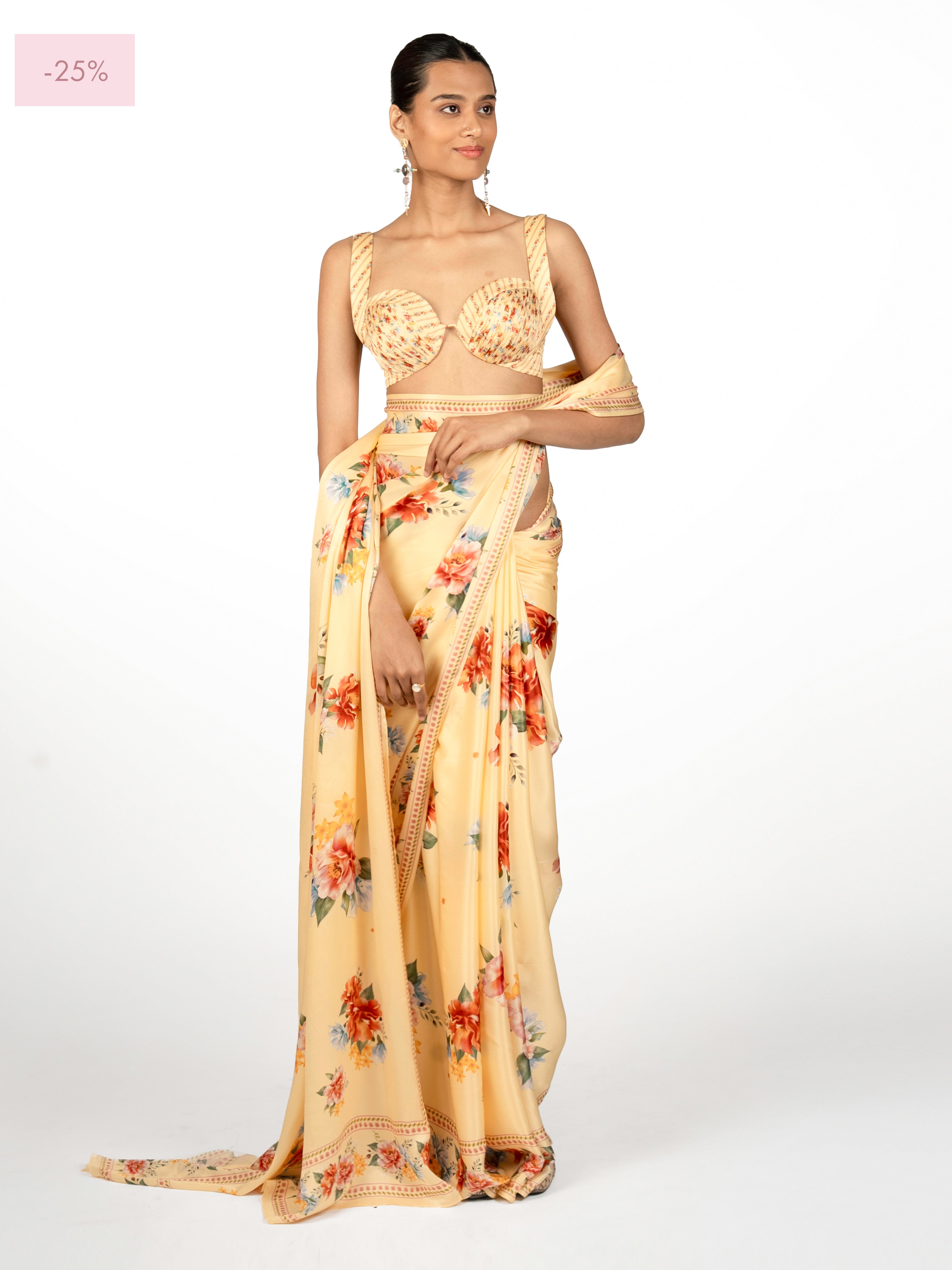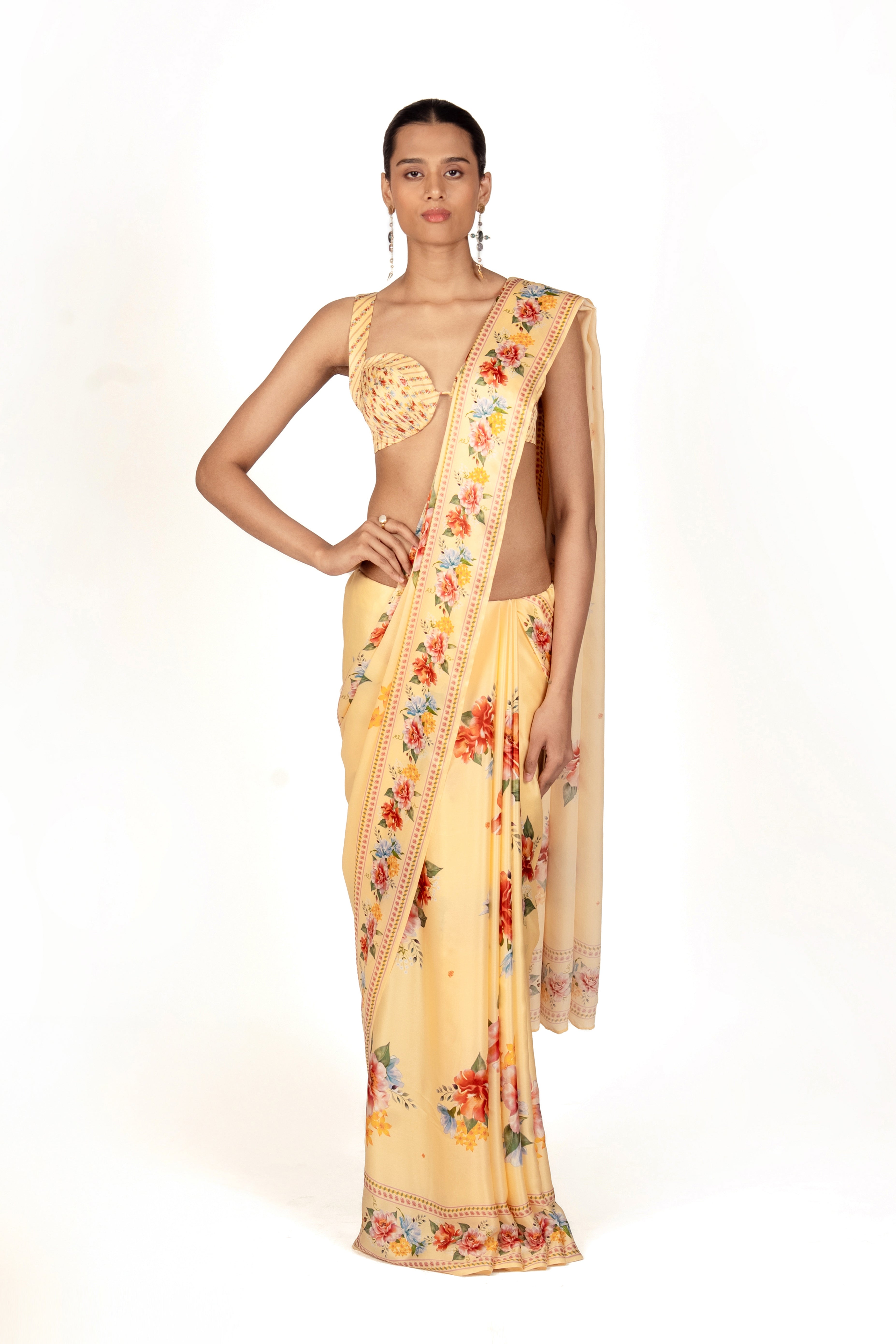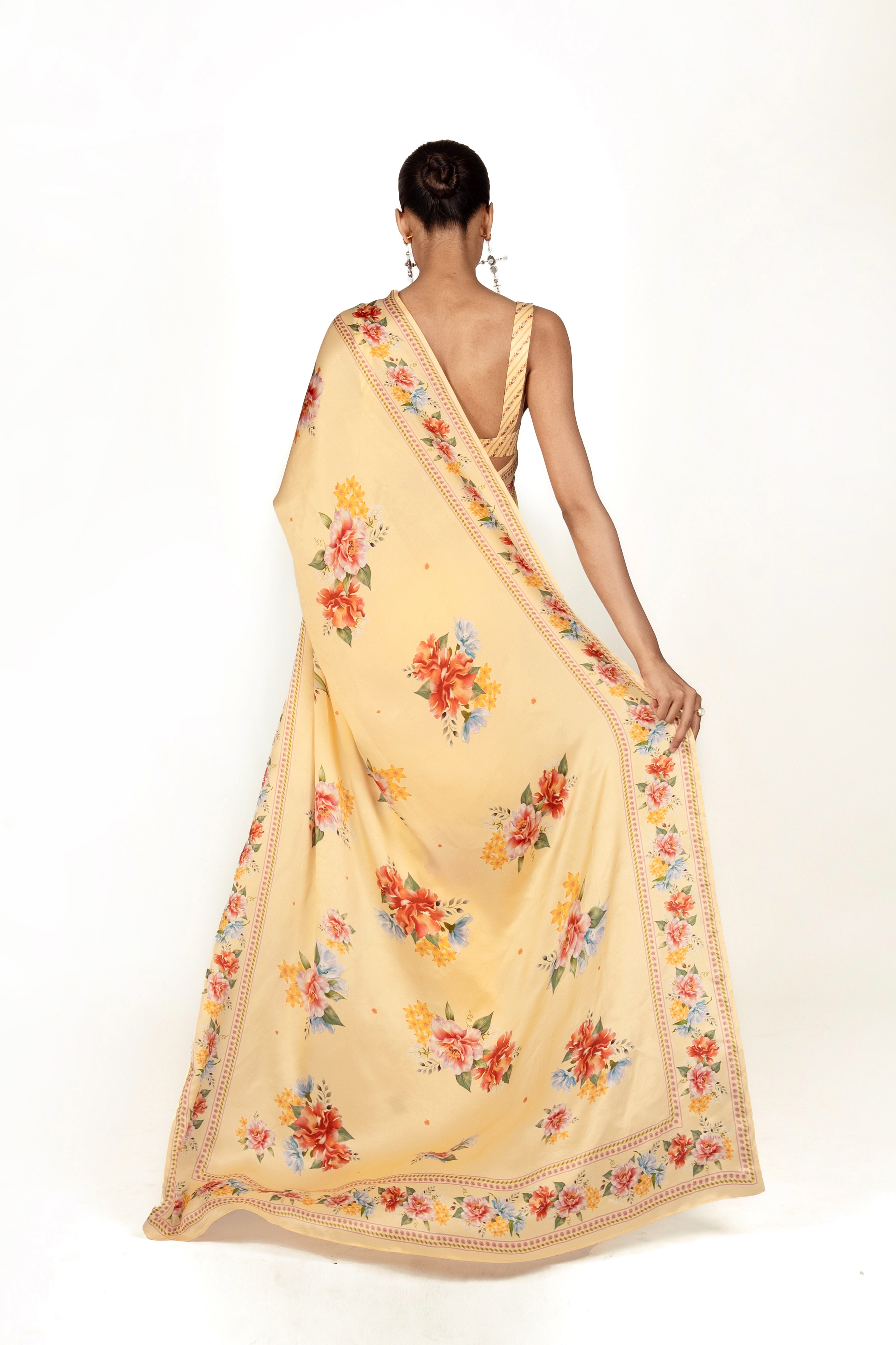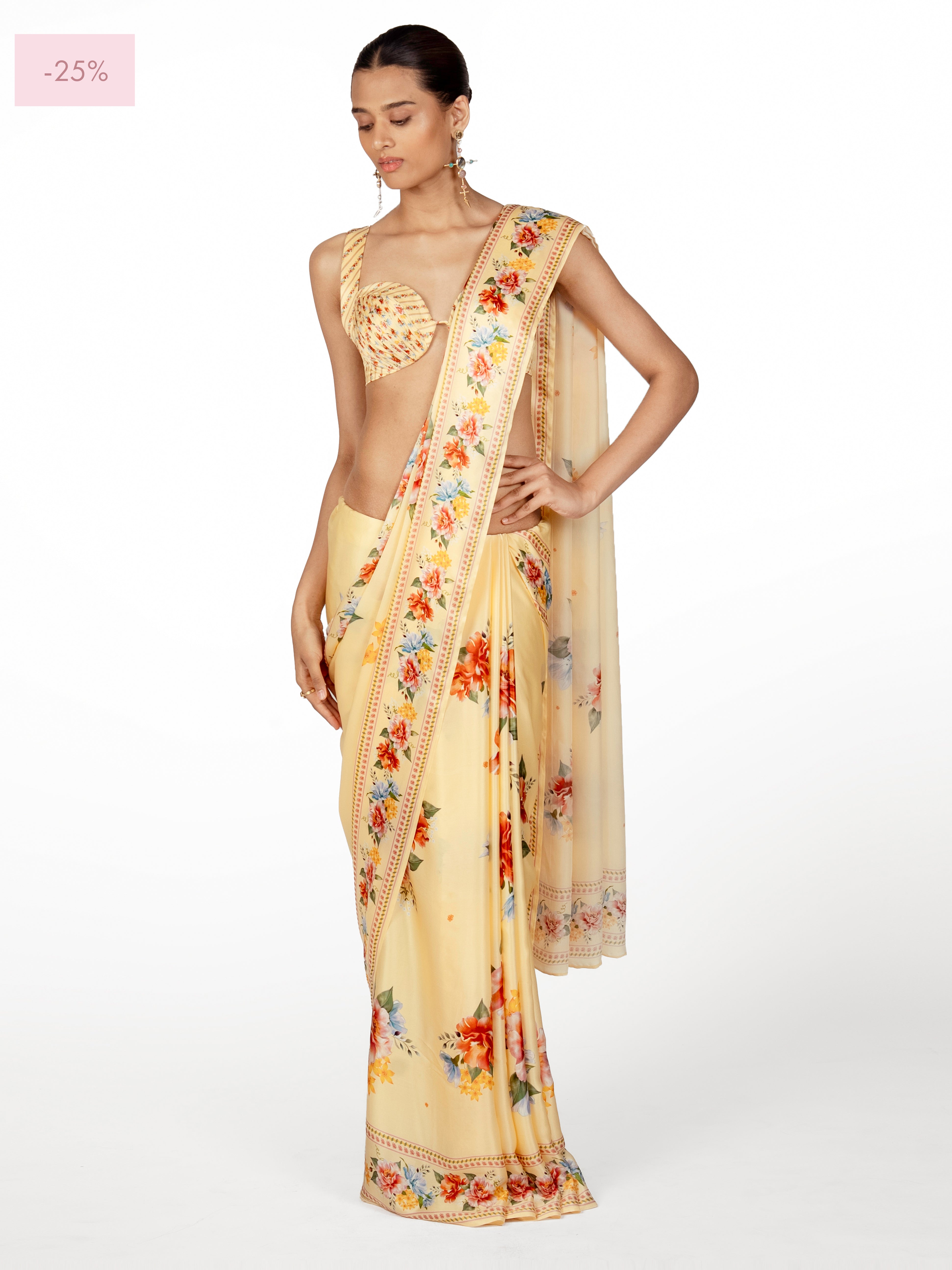 ‘Zinnia’ Butter yellow satin silk saree featuring floral butis placement with floral border and comes with underwire micro pleated blouse.