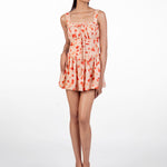 'Eirlys' Peach rose printed flared mini dress features a sleeveless corset with pleating on bust
