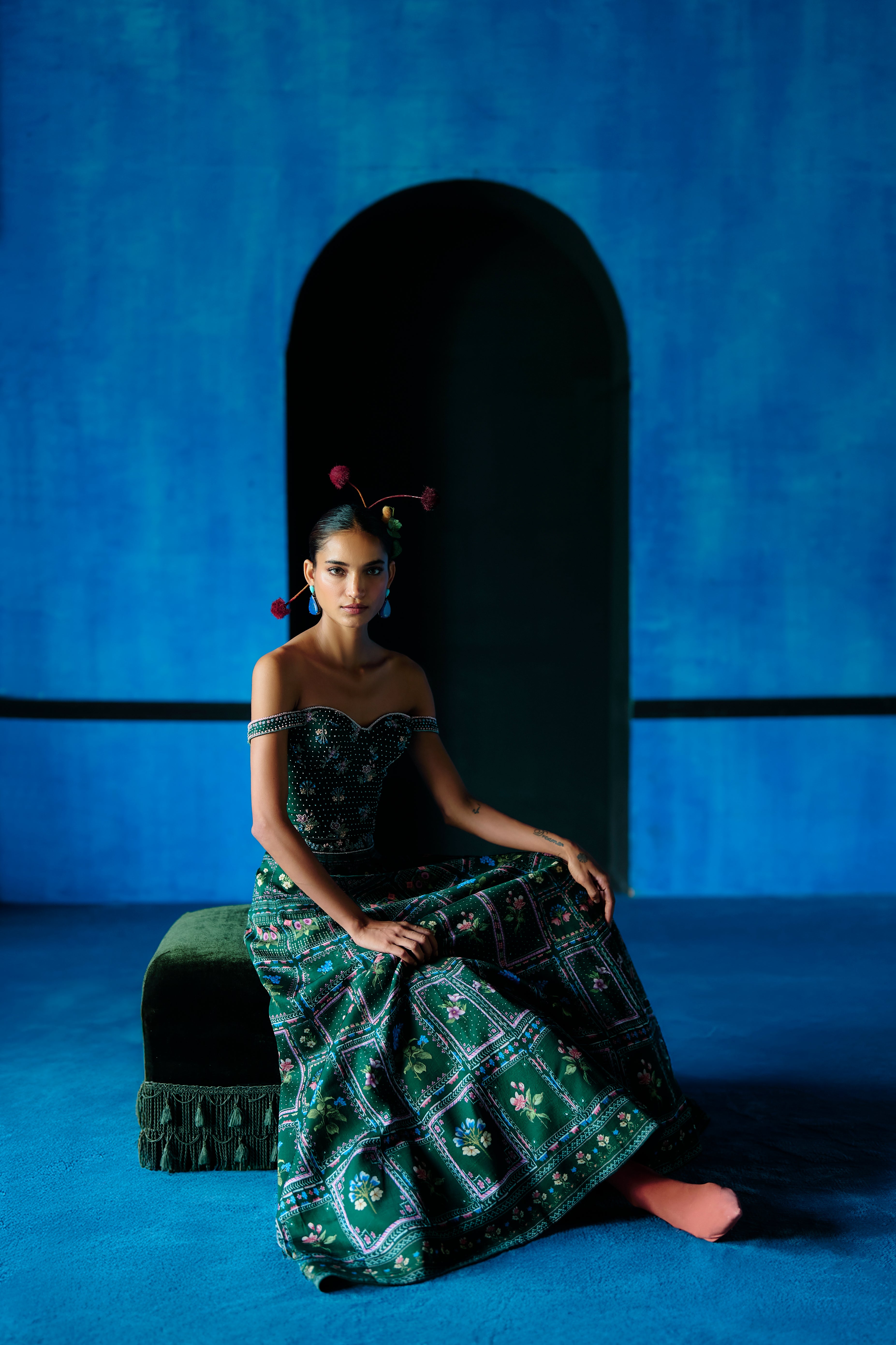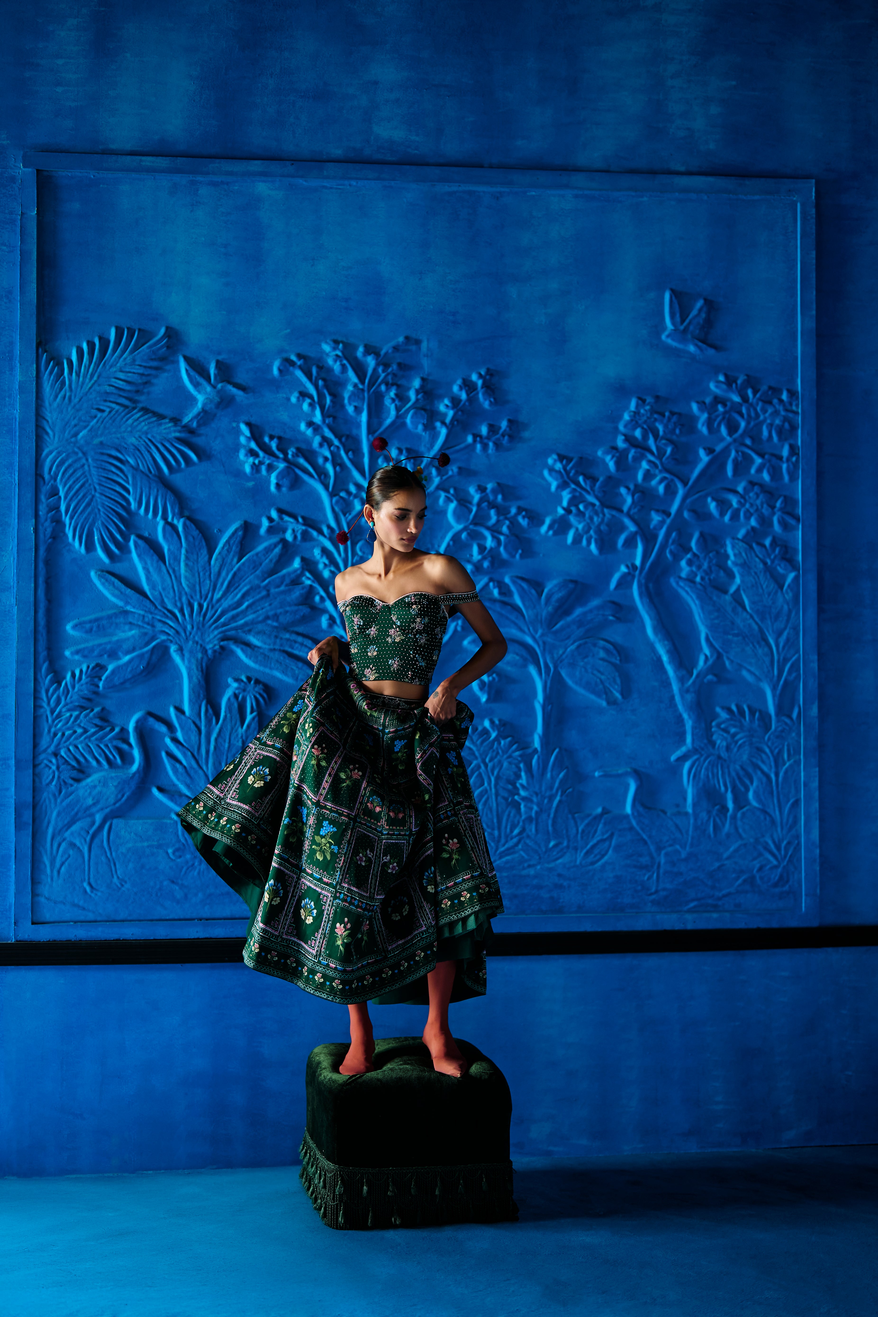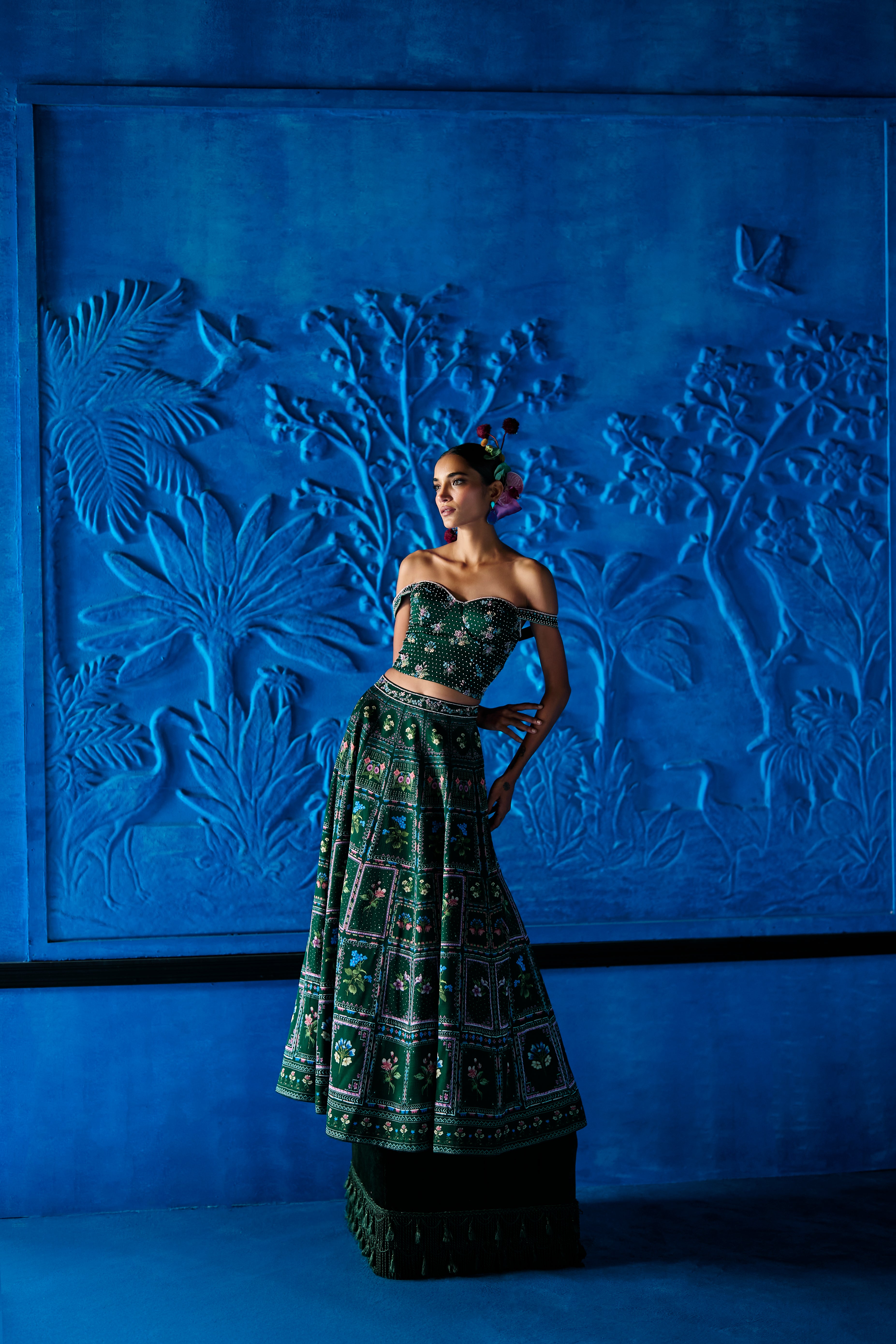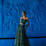 Emerald green floral printed satin dupion lehenga perfectly paired with a matching embroidered off-shoulder strap corset.