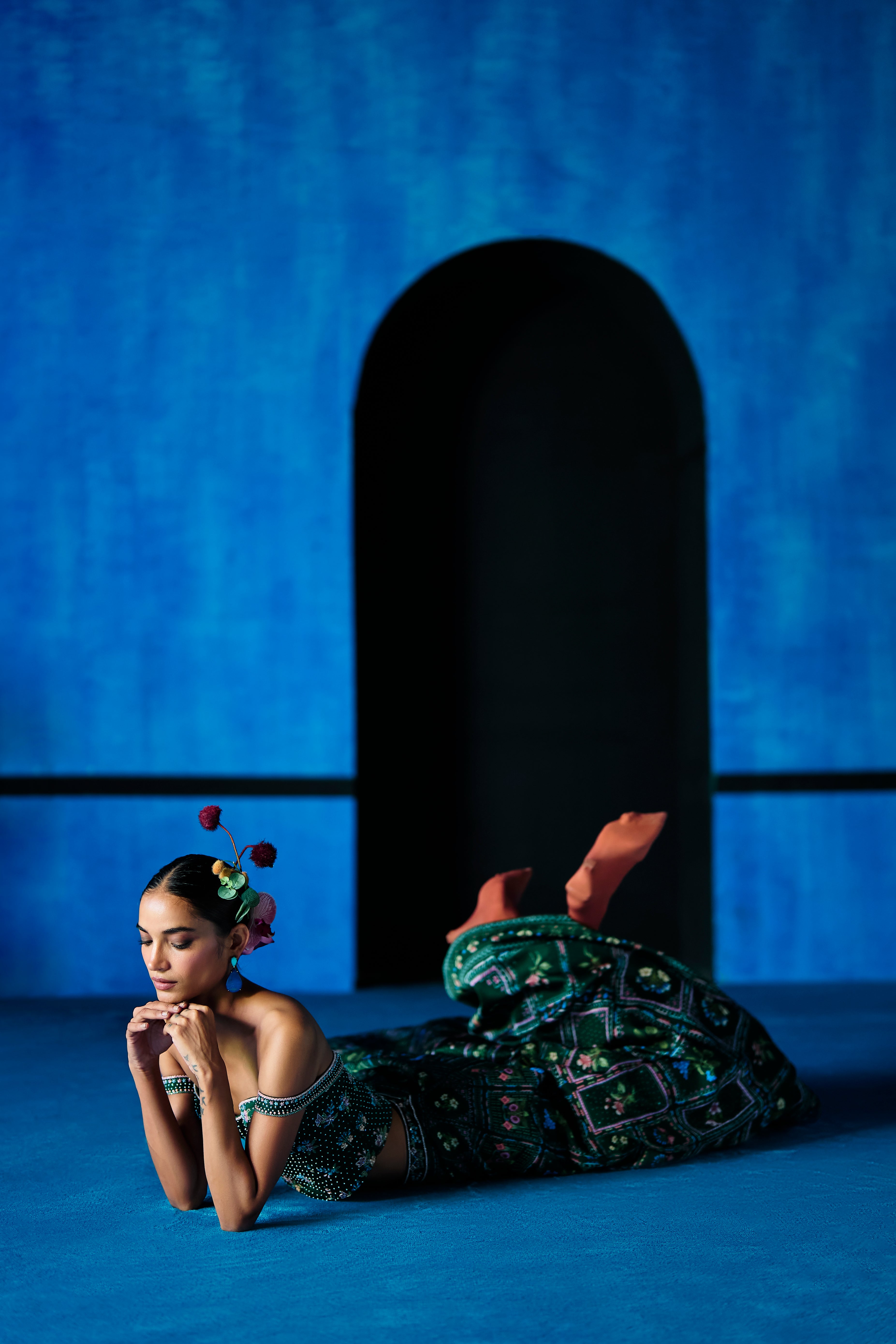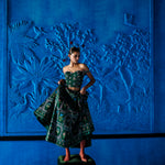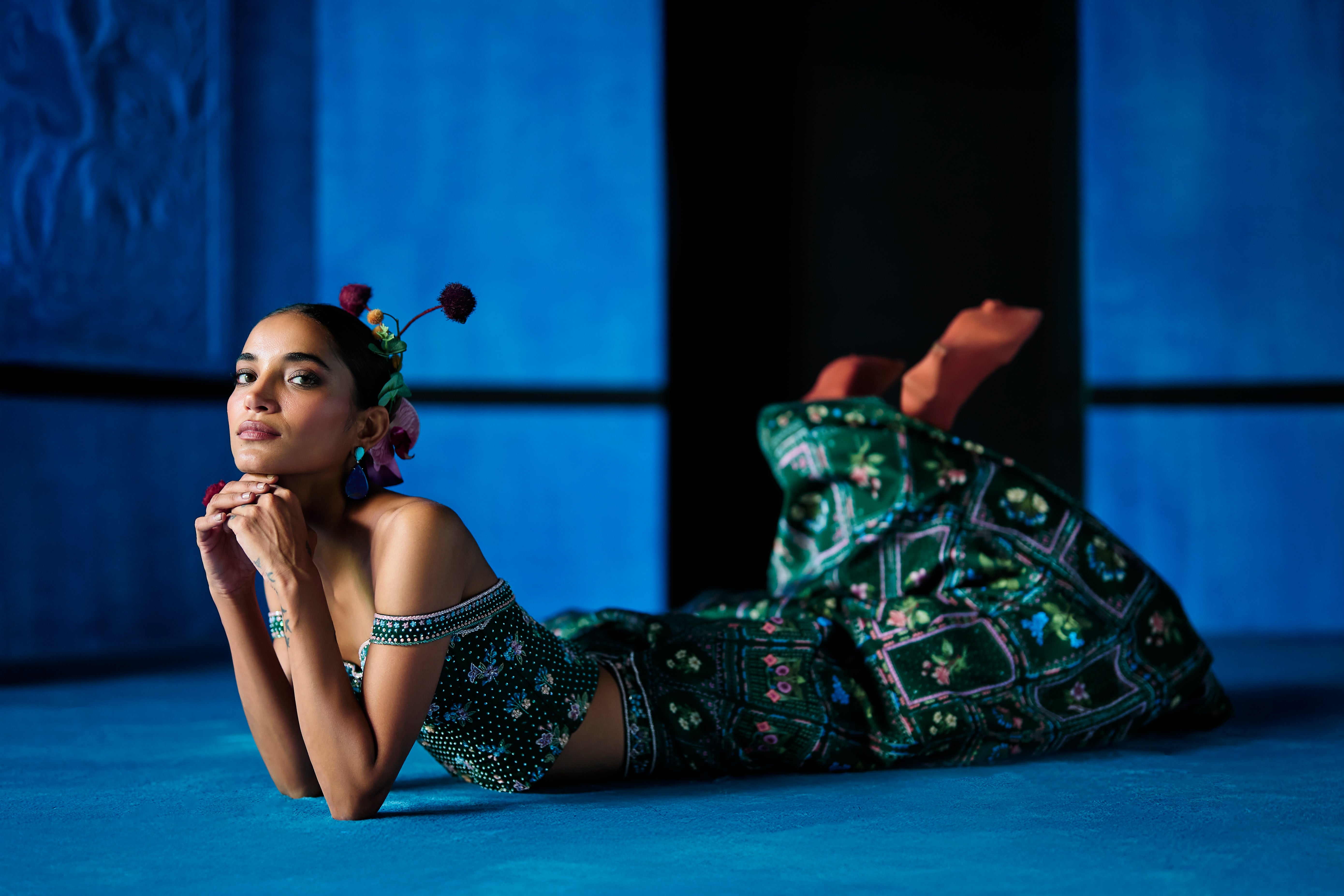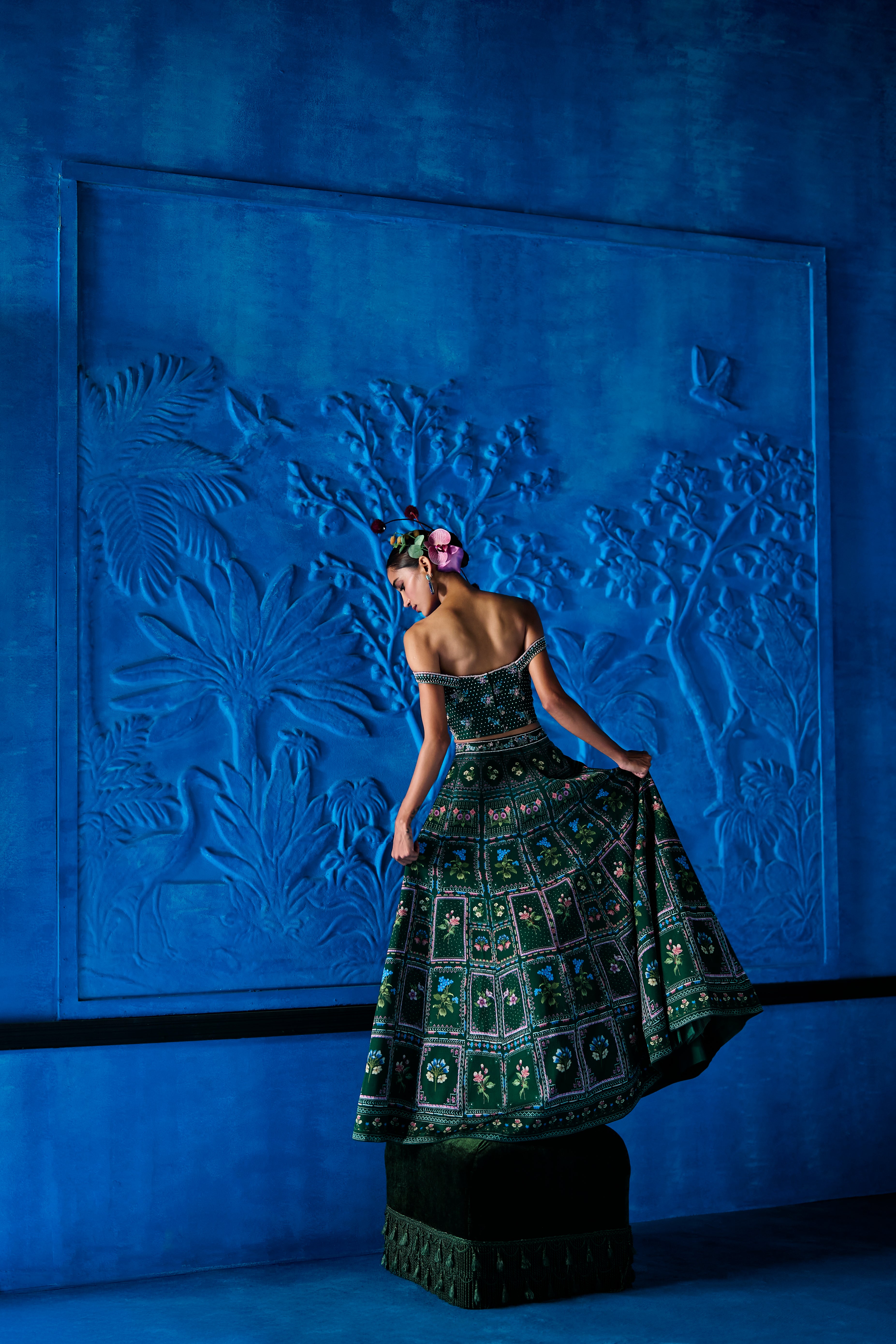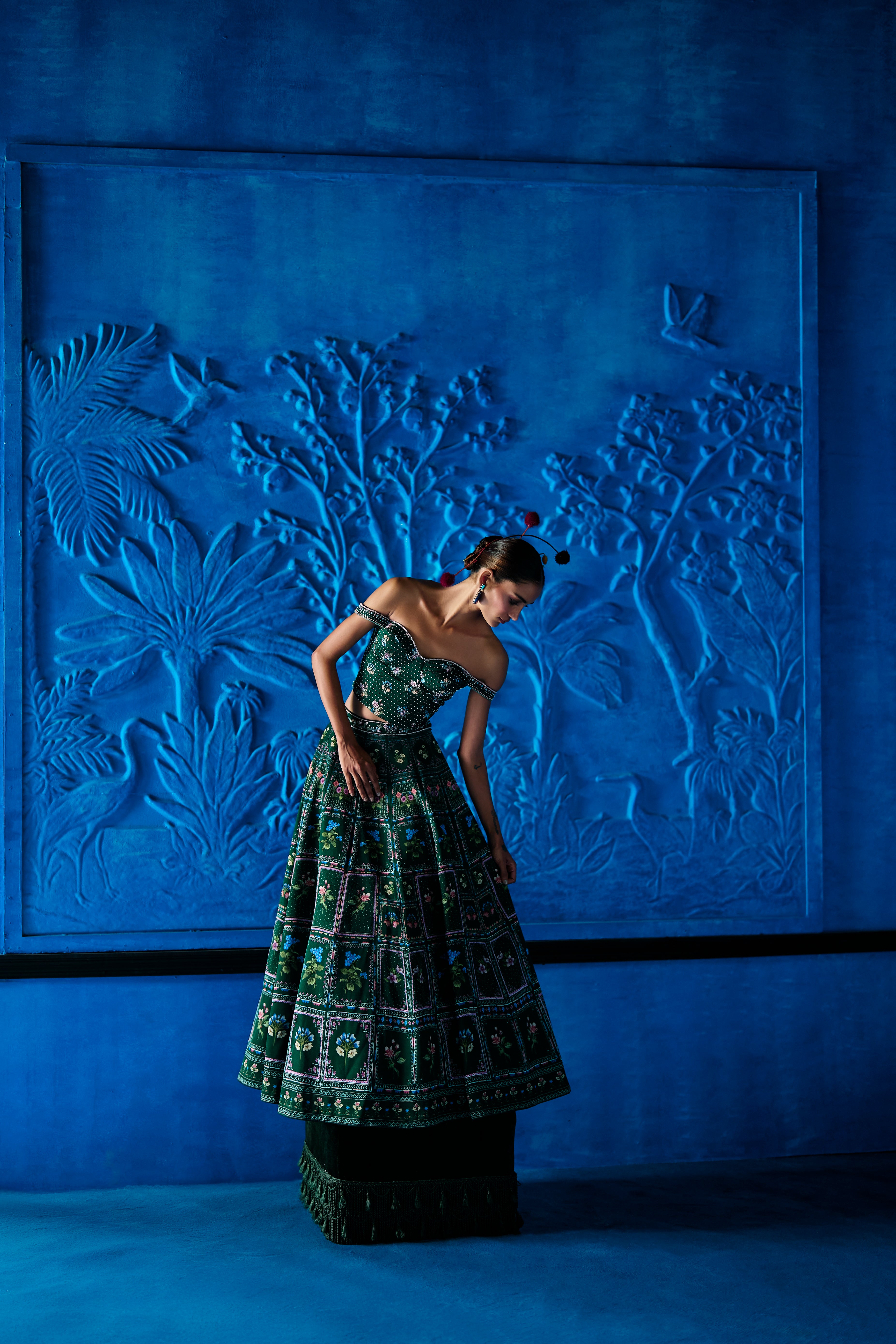 Emerald green floral printed satin dupion lehenga perfectly paired with a matching embroidered off-shoulder strap corset.