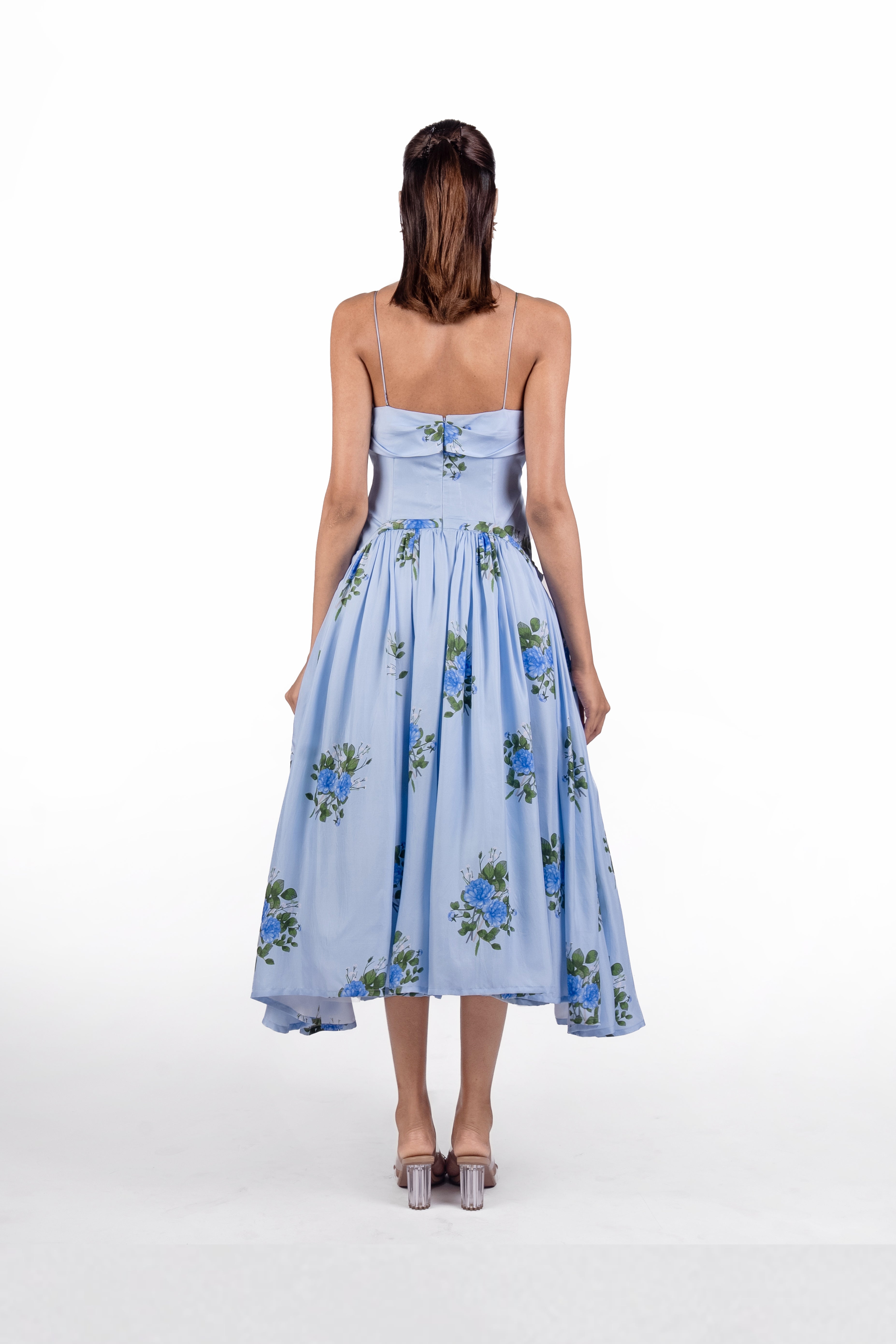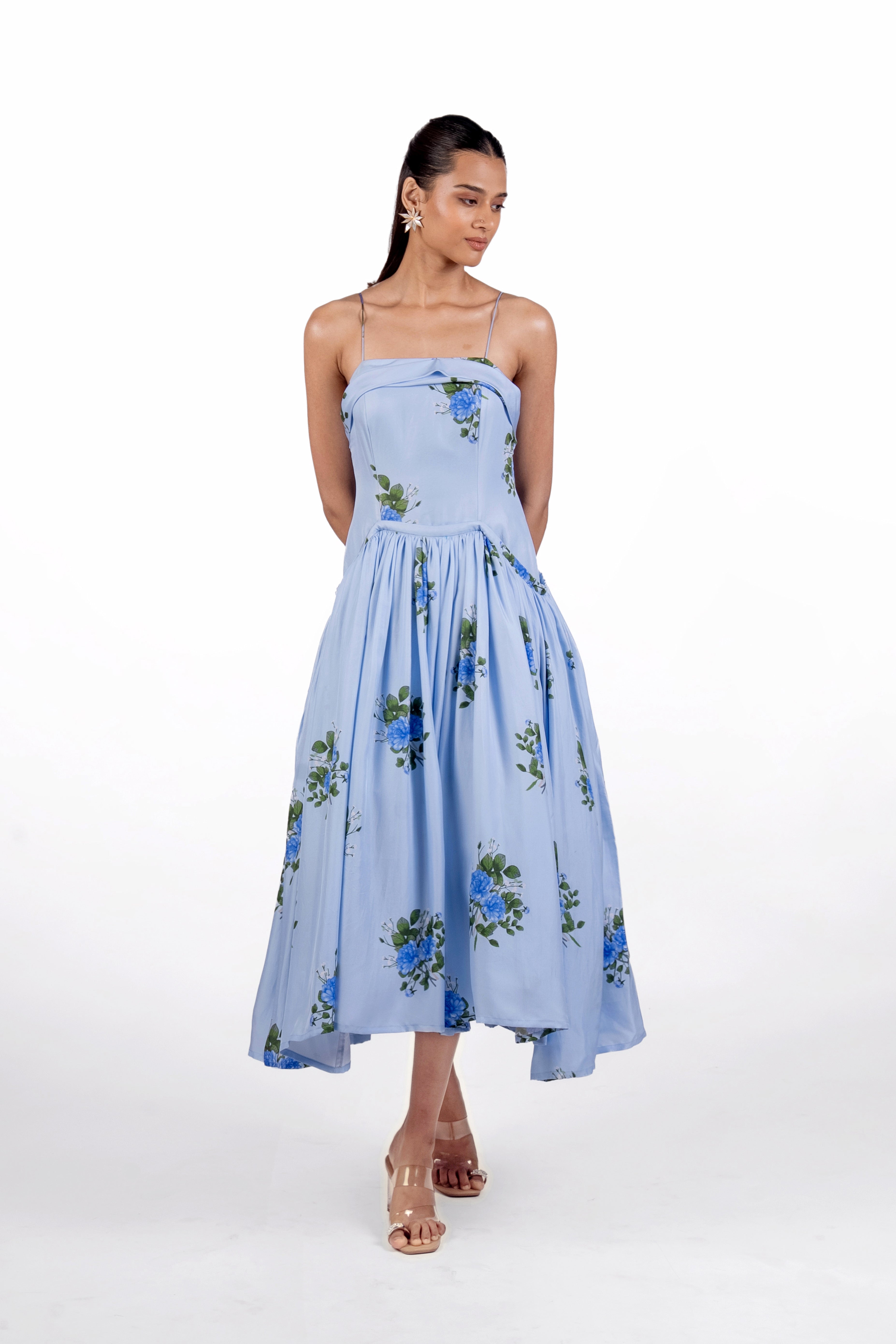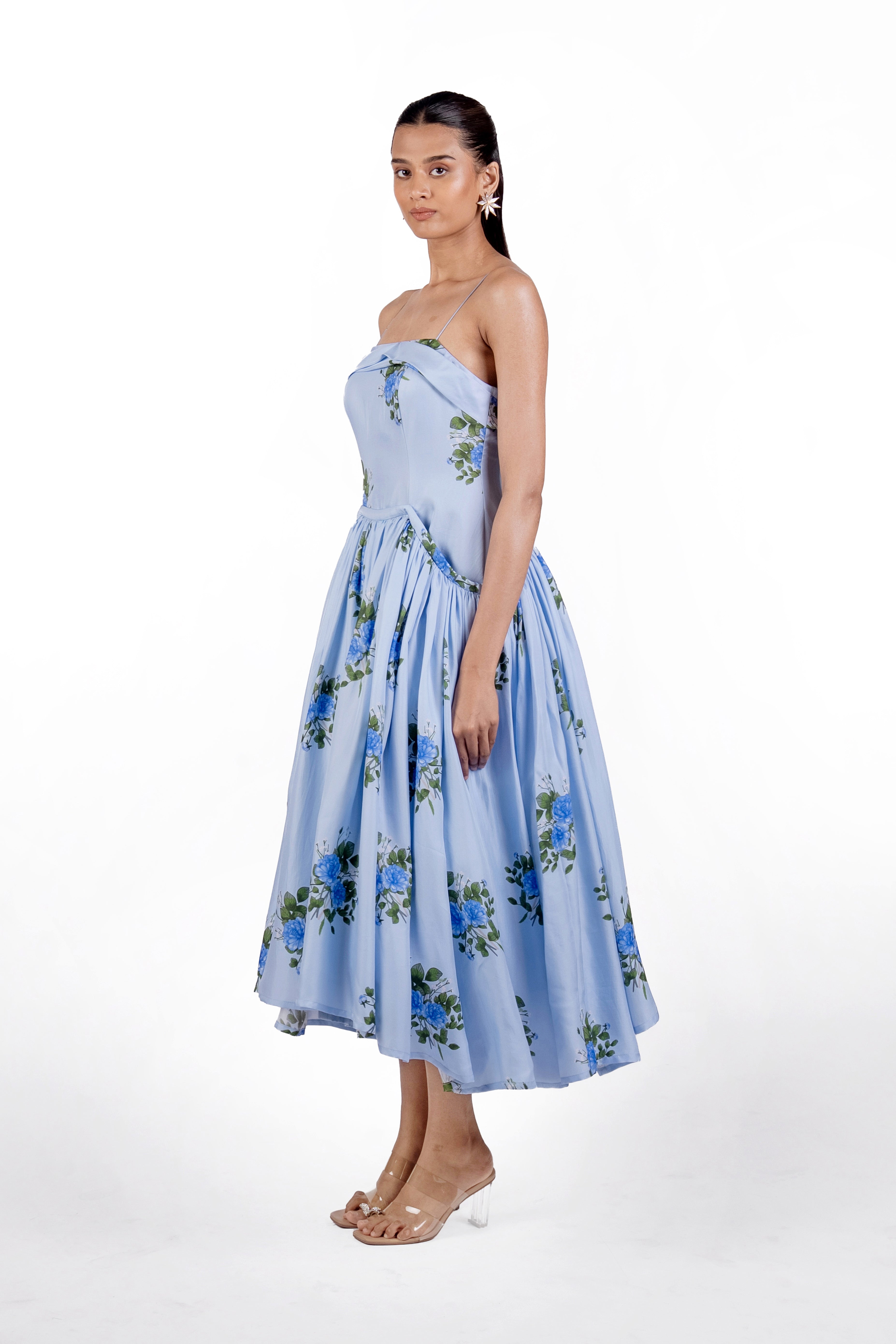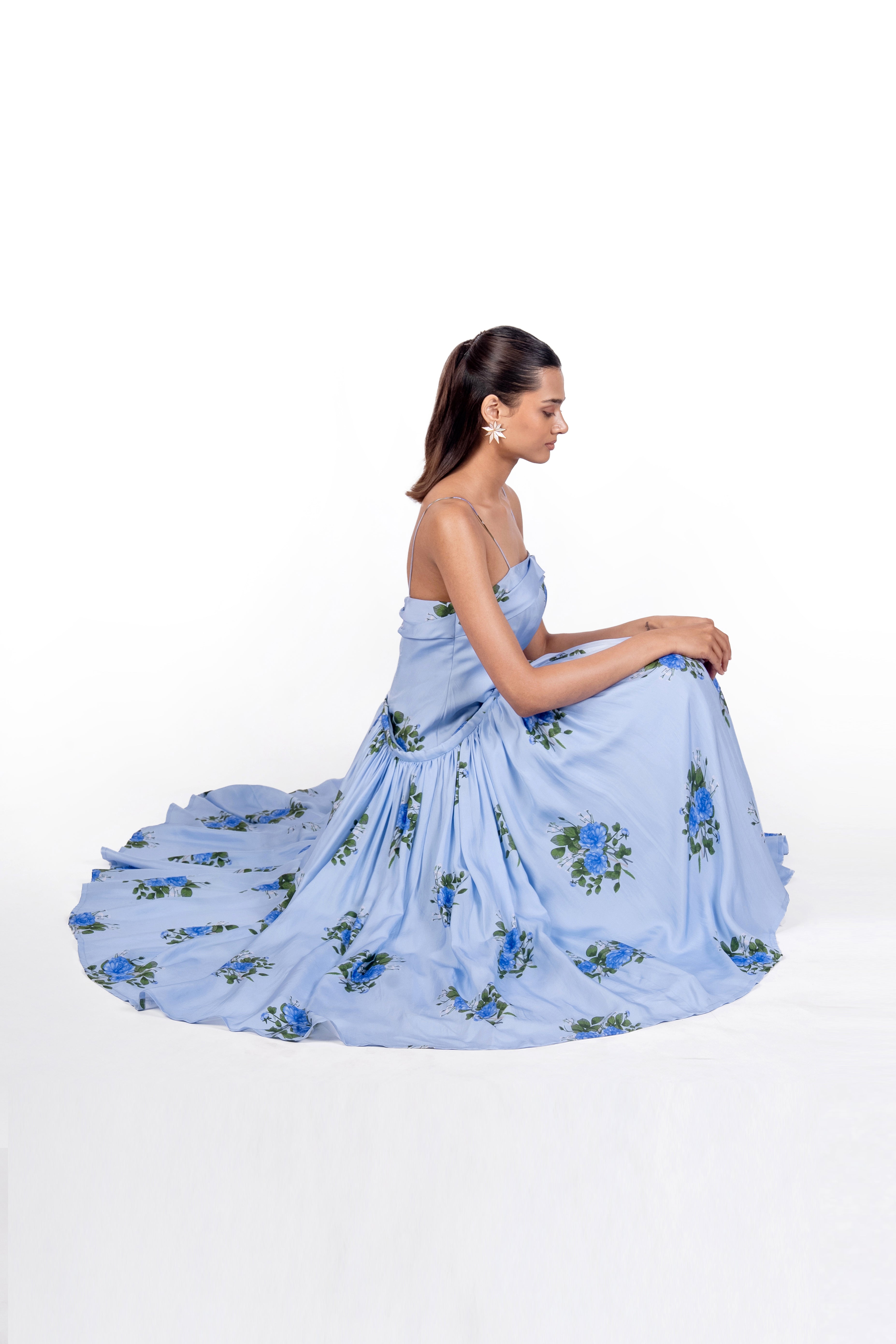 'Bellona' light blue floral printed maxi dress features spaghetti shoulder straps.