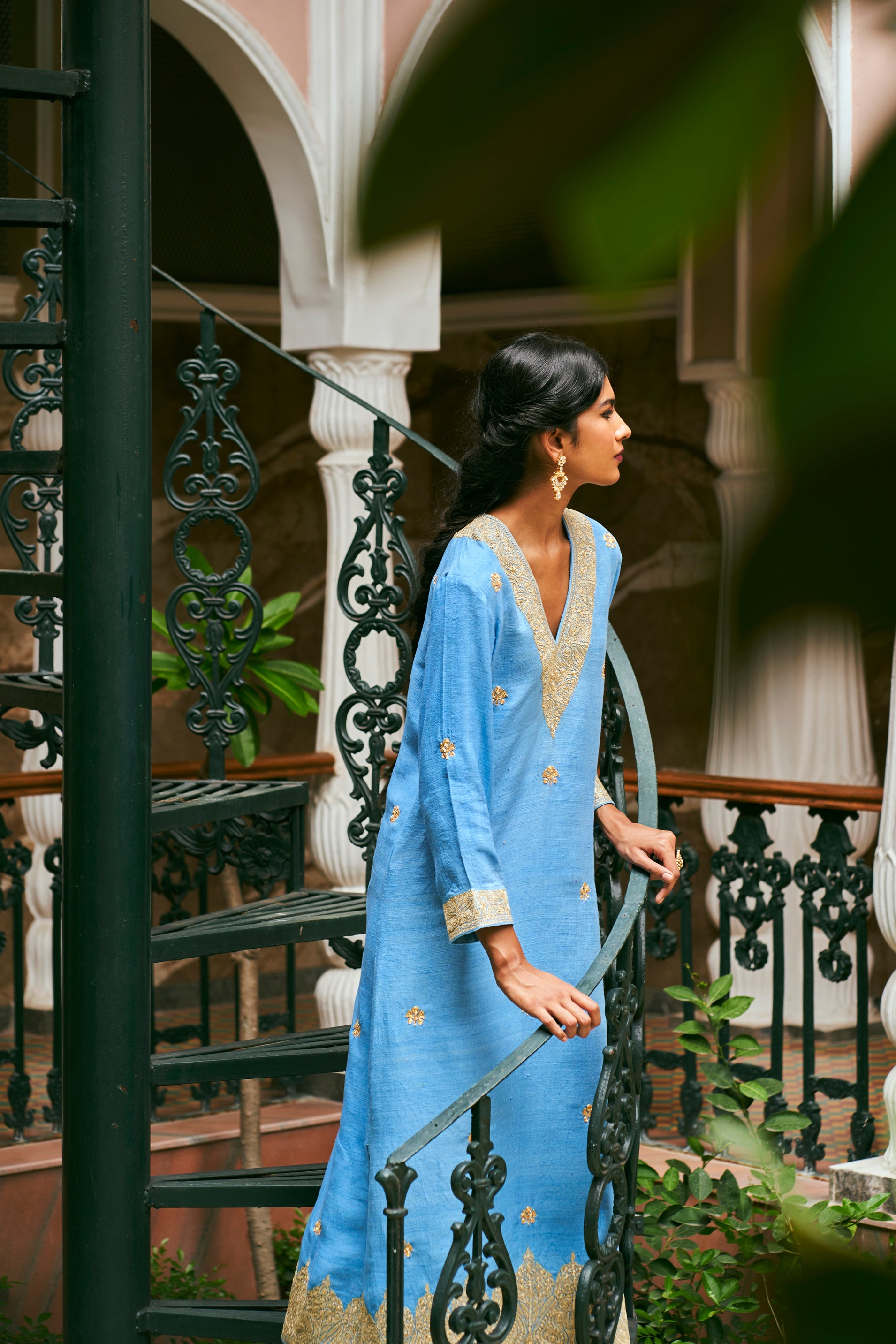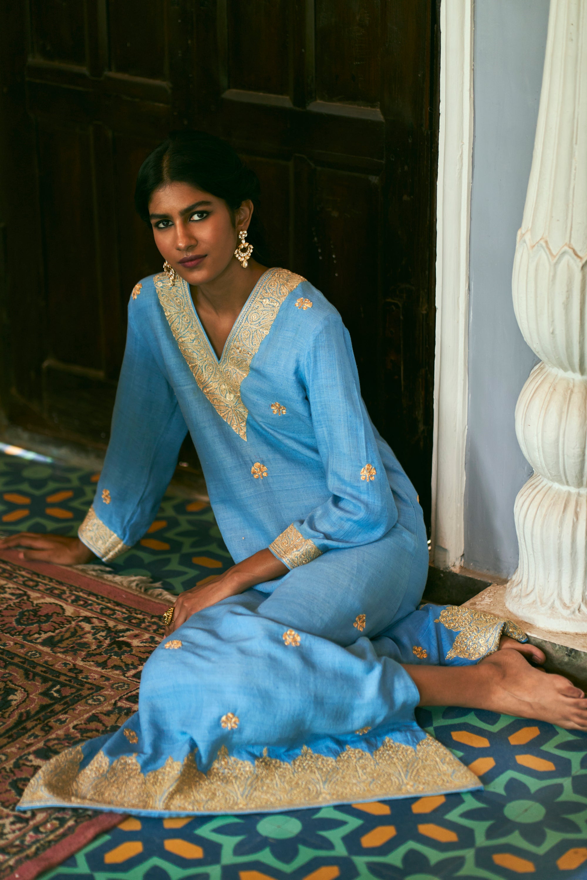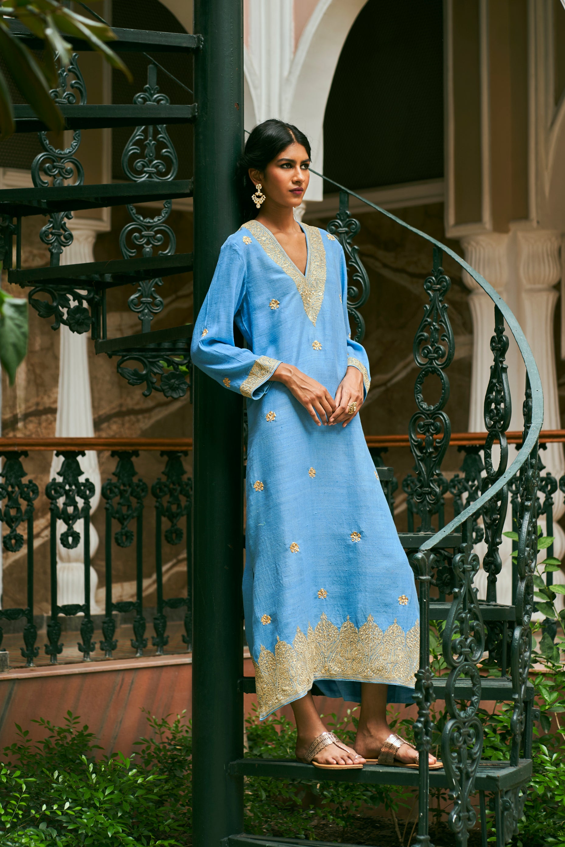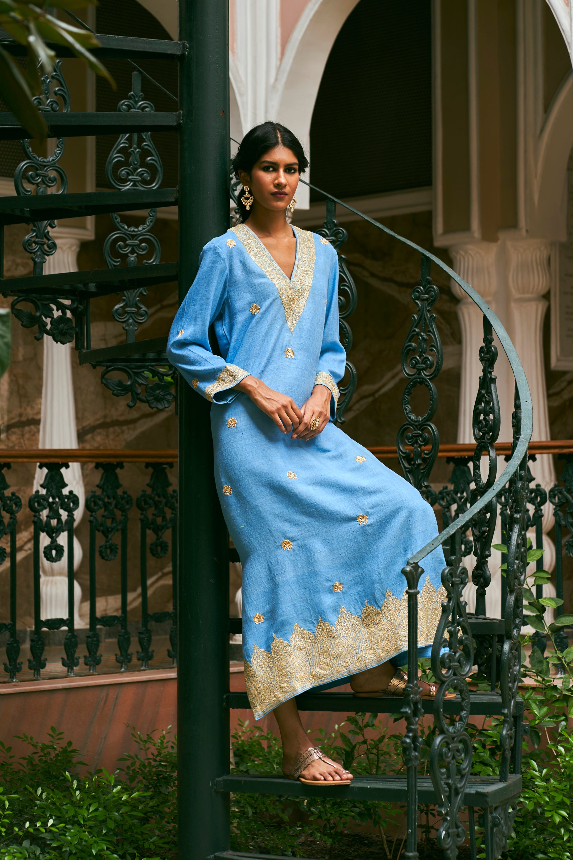 ‘Firoza’ Azure Blue Kaftan crafted from luxurious Matka Silk is hand embroidered with Kashmiri tilla work and features motifs seen on Kashmiri Pashmina shawl, complemented by similar floral motifs all over.