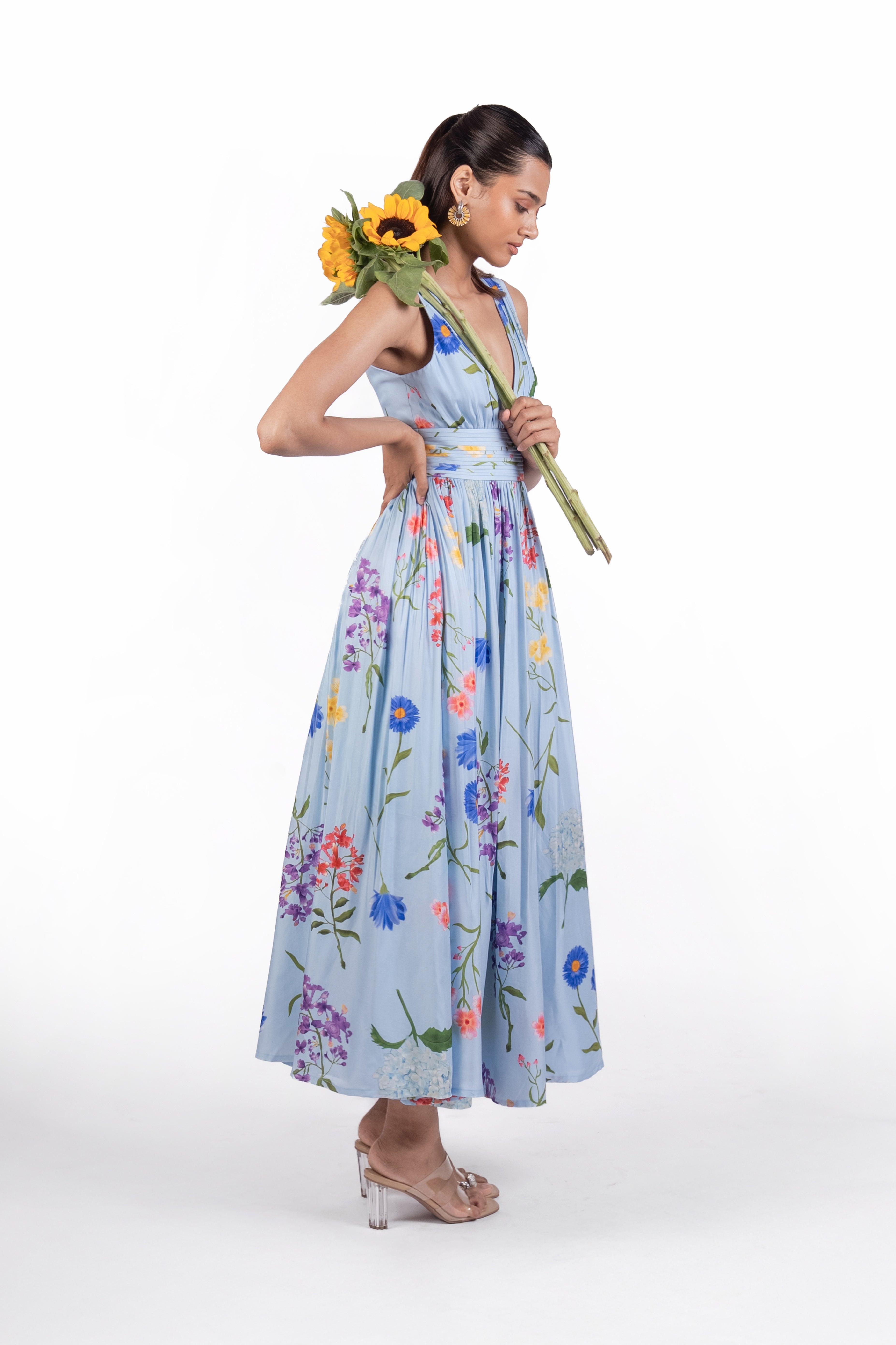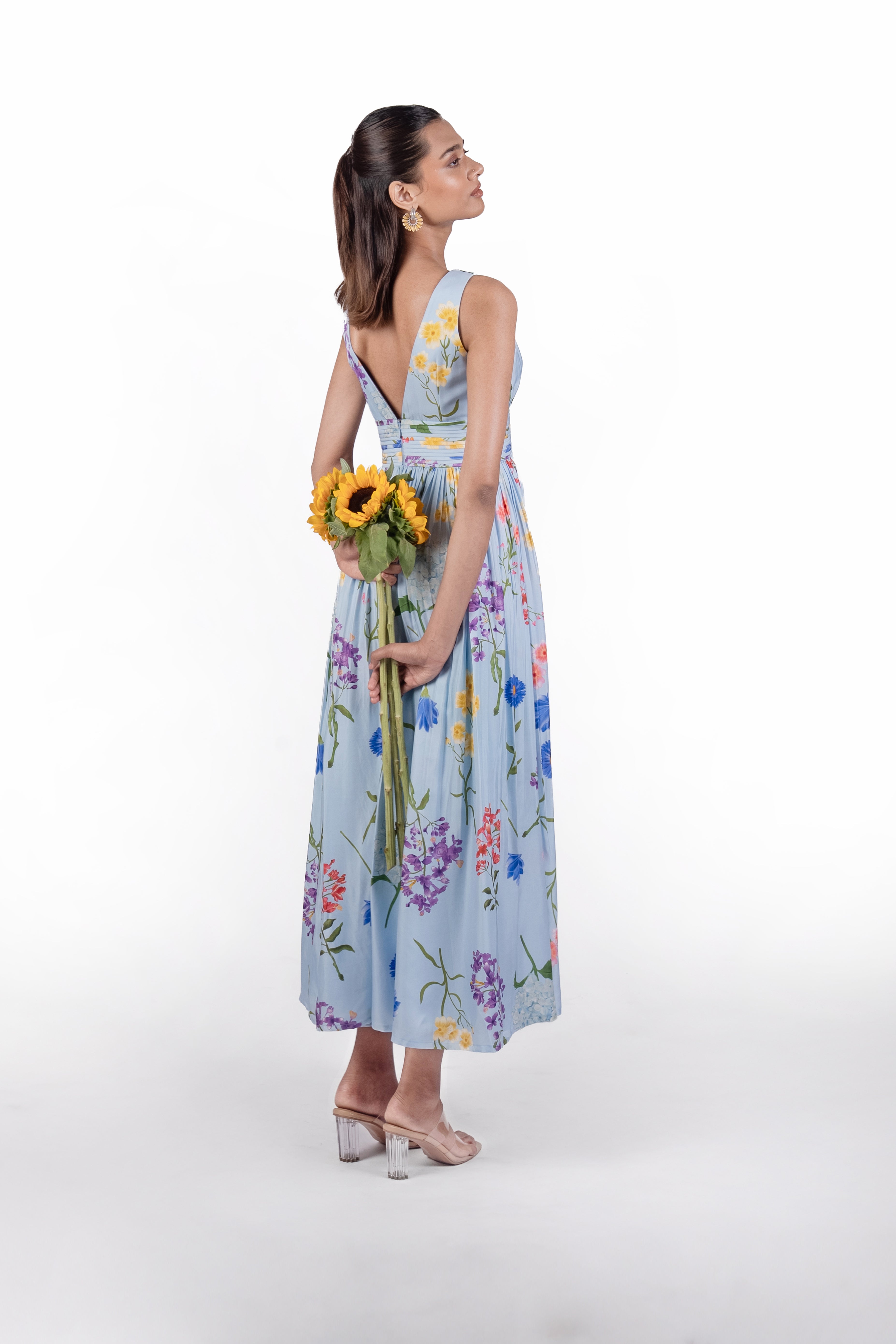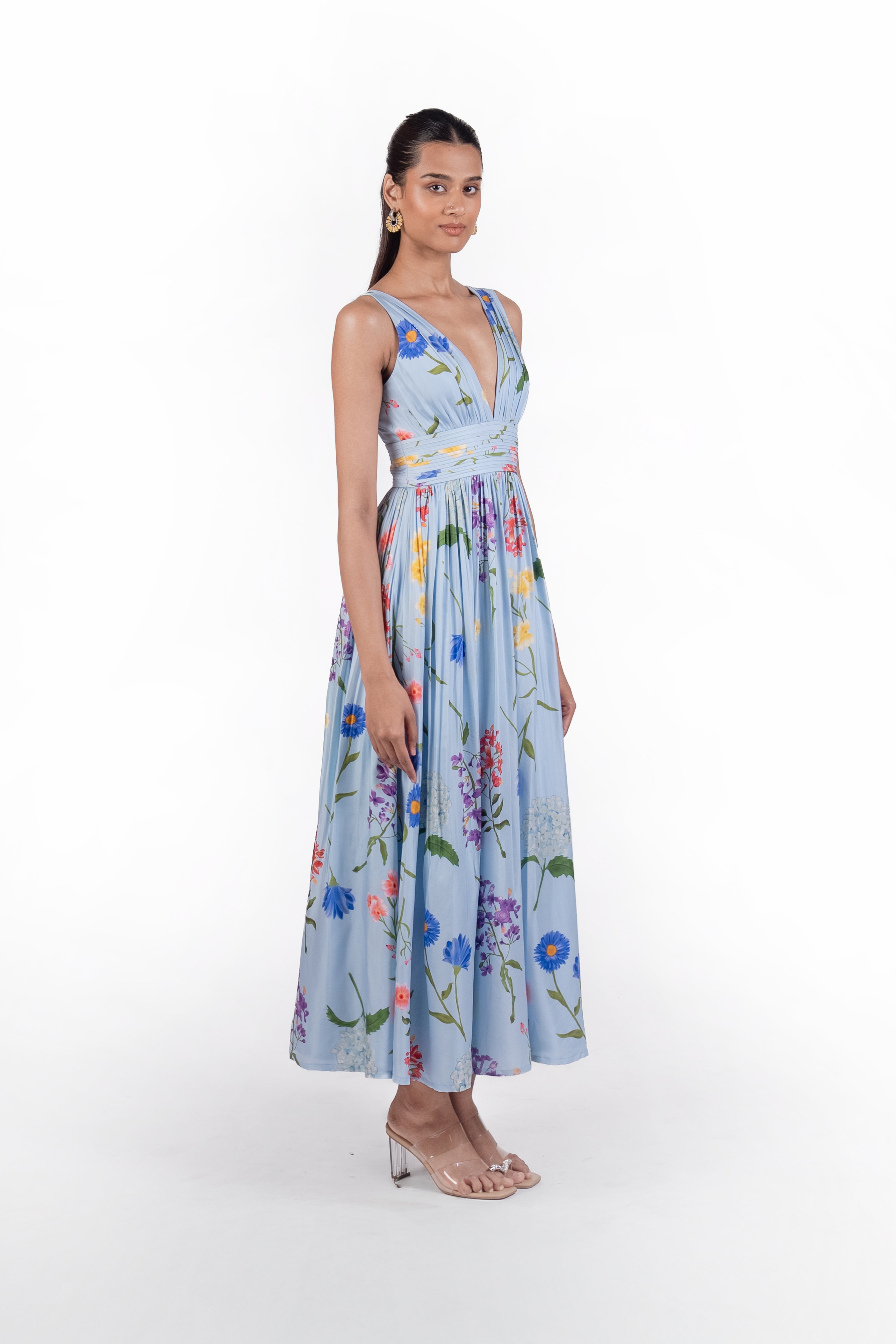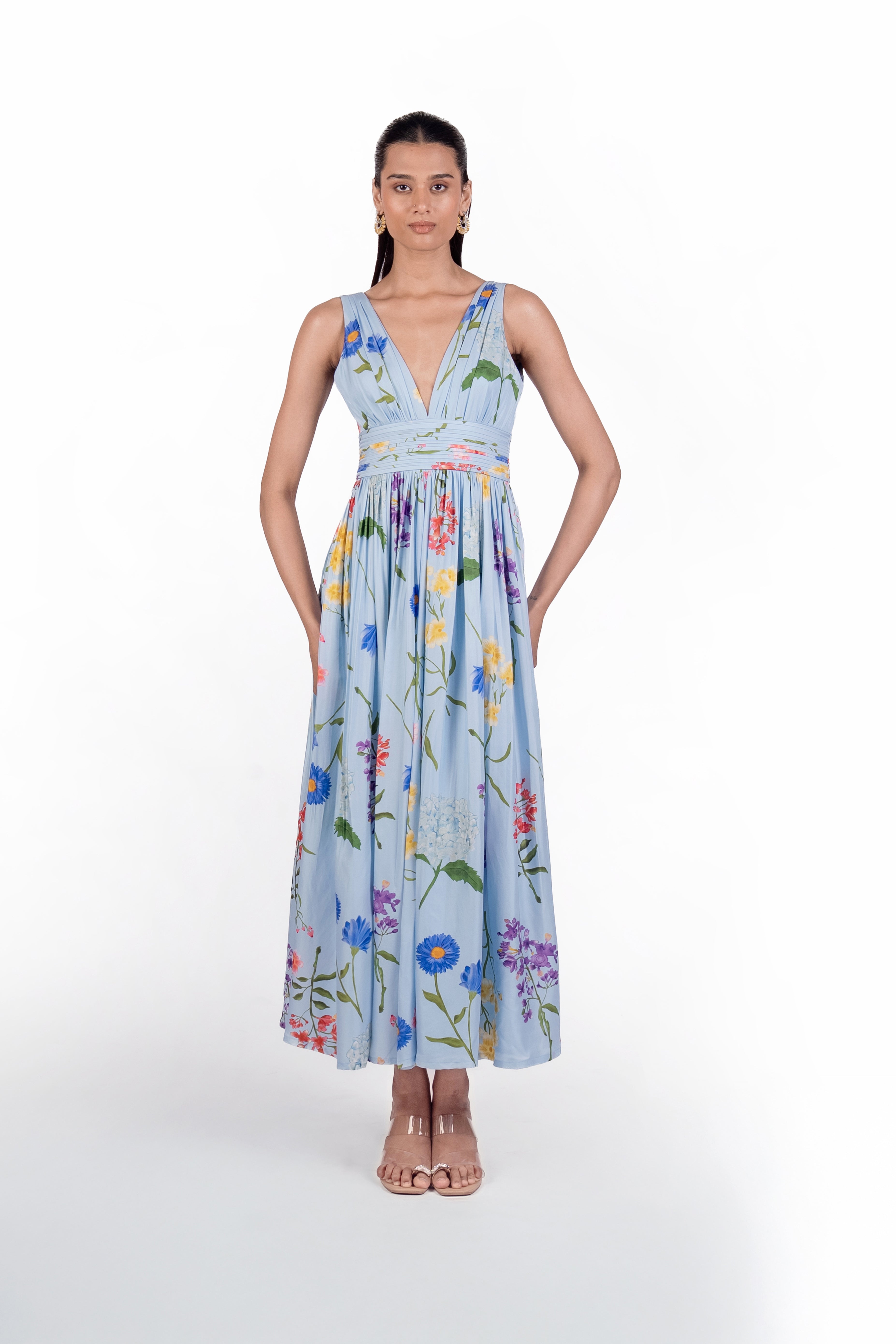 'Luma' a sleeveless, light blue maxi dress featuring a floral print, pleated design, and a V-neckline.