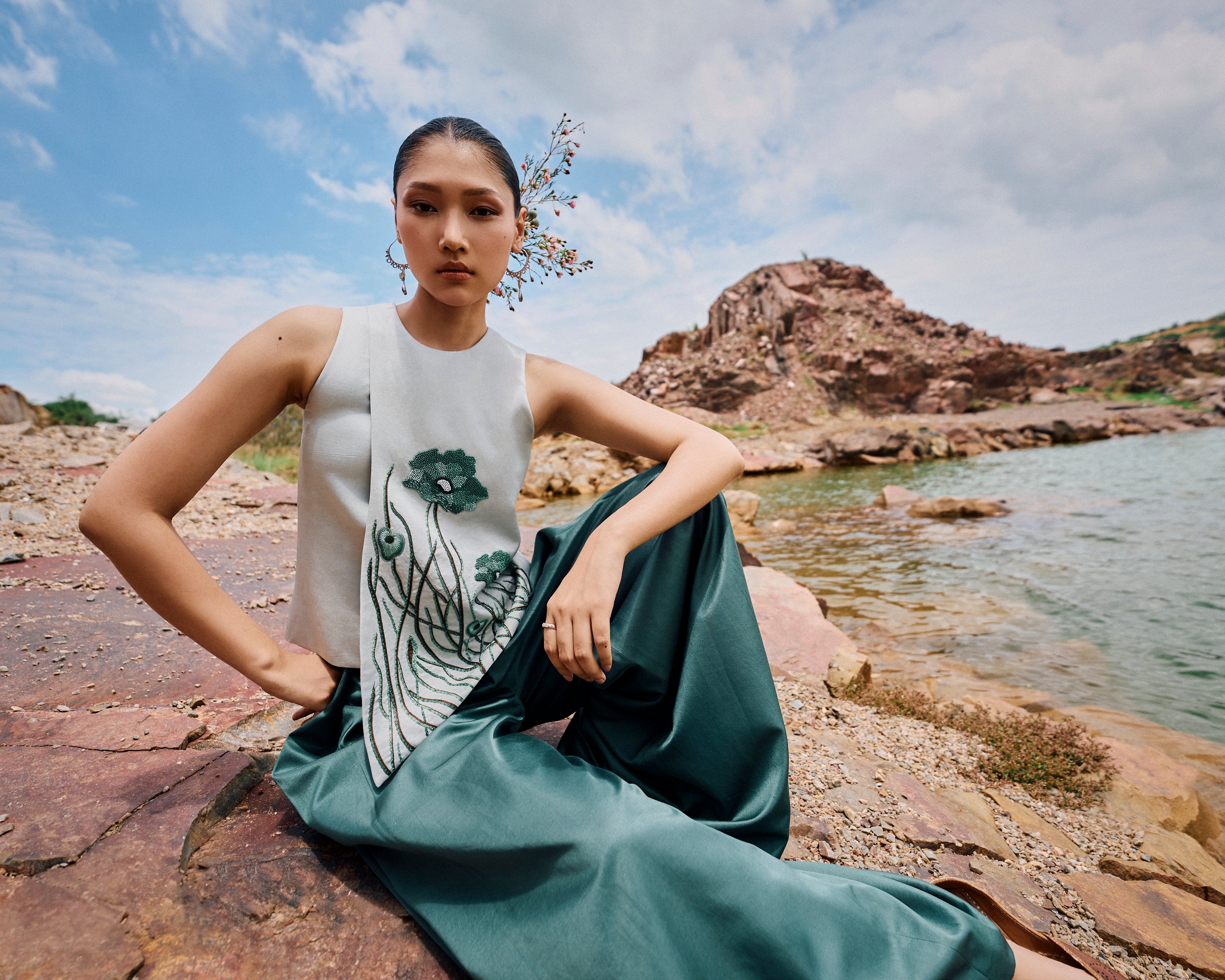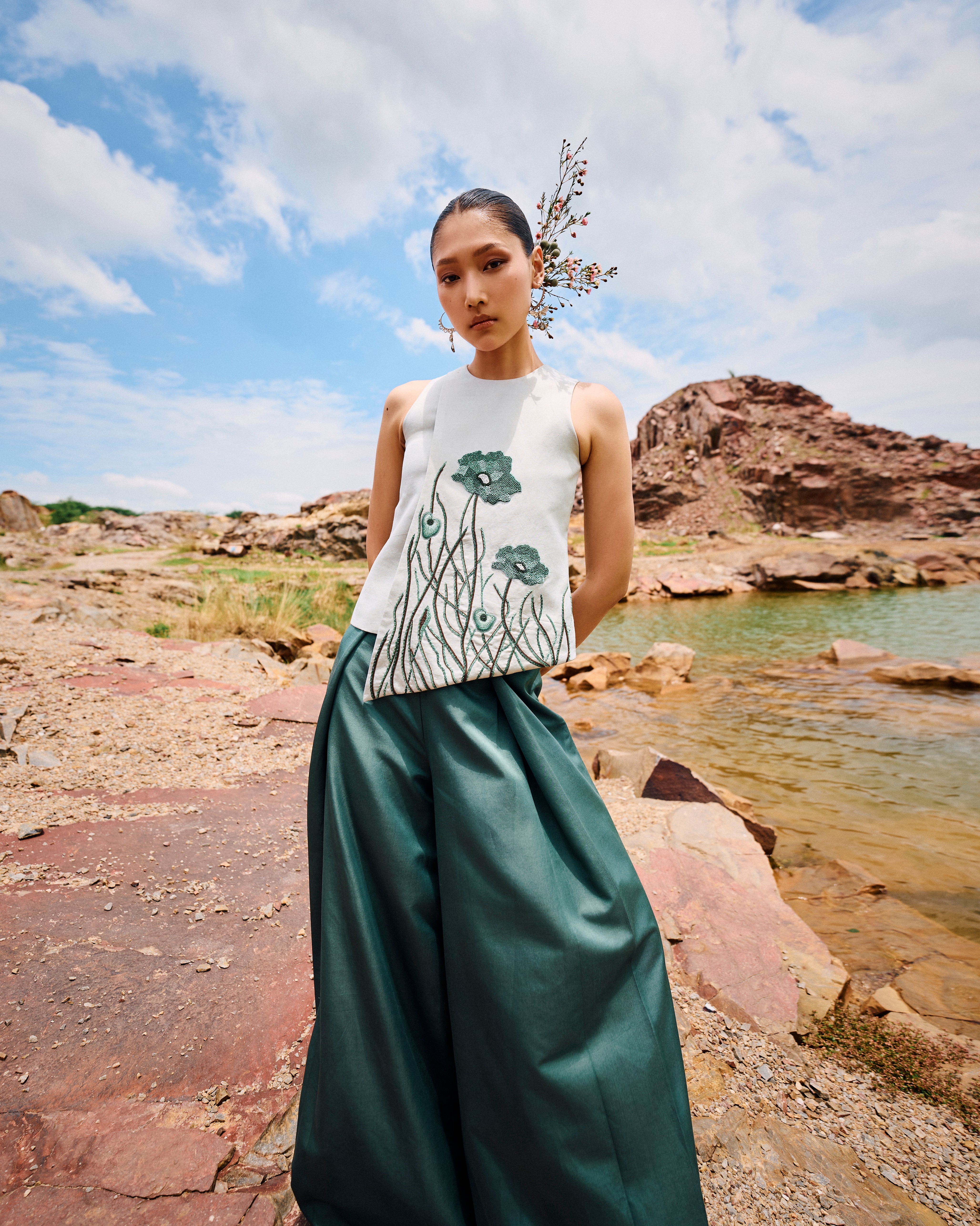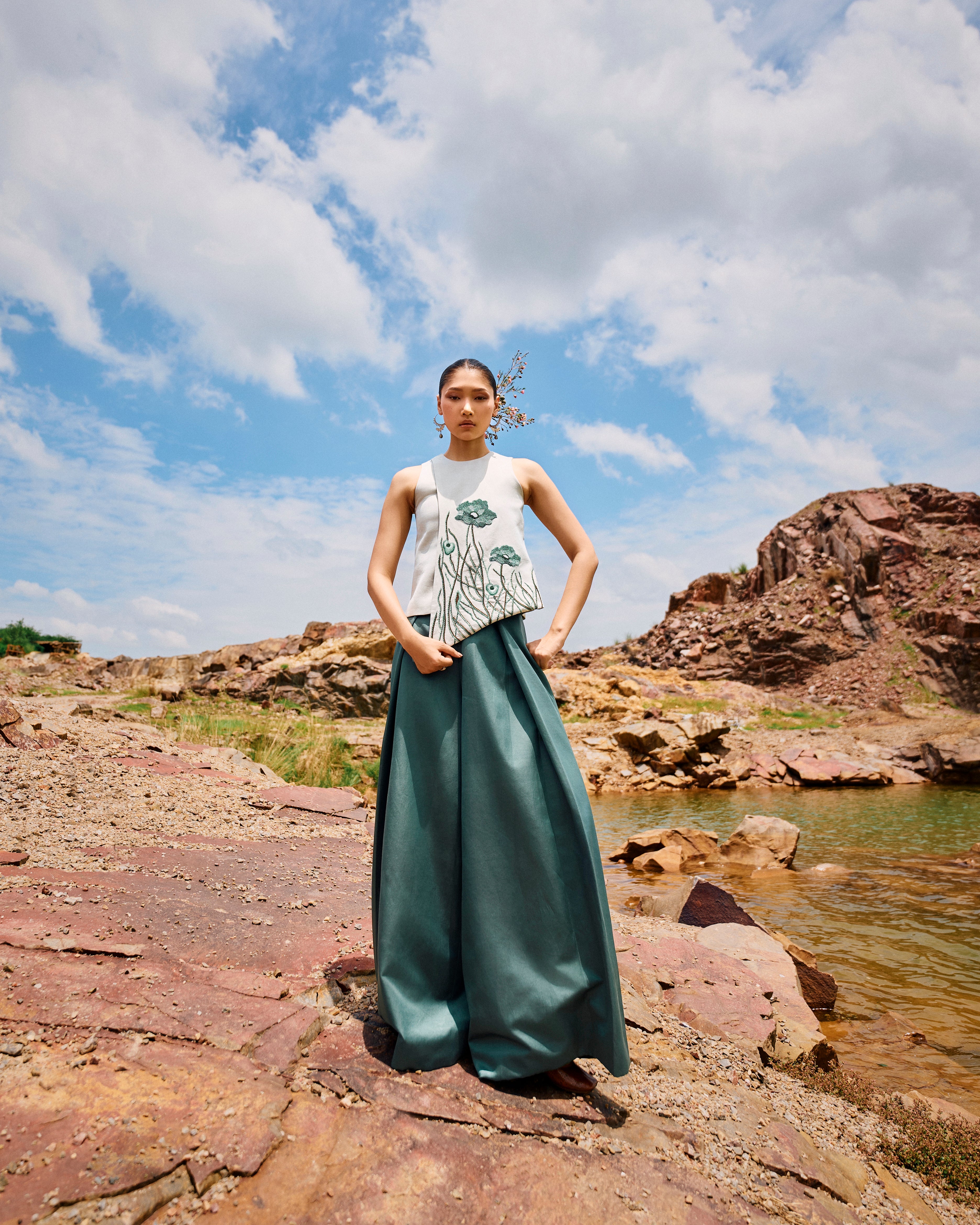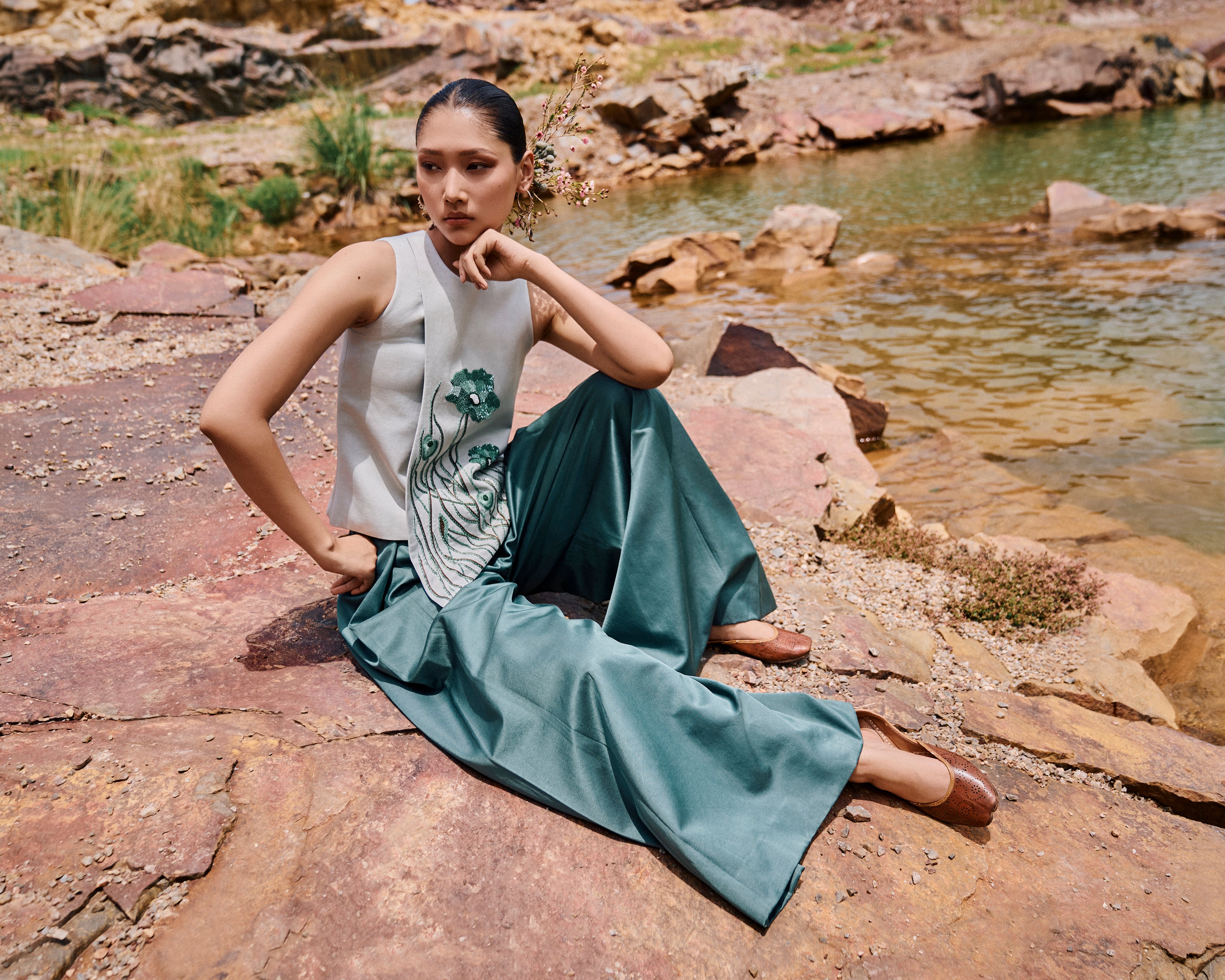 Panneled Katan Silk 'Hana' Top features hand embroidered Grass design and is paired with matching Dark Green 'Gadh' pants.