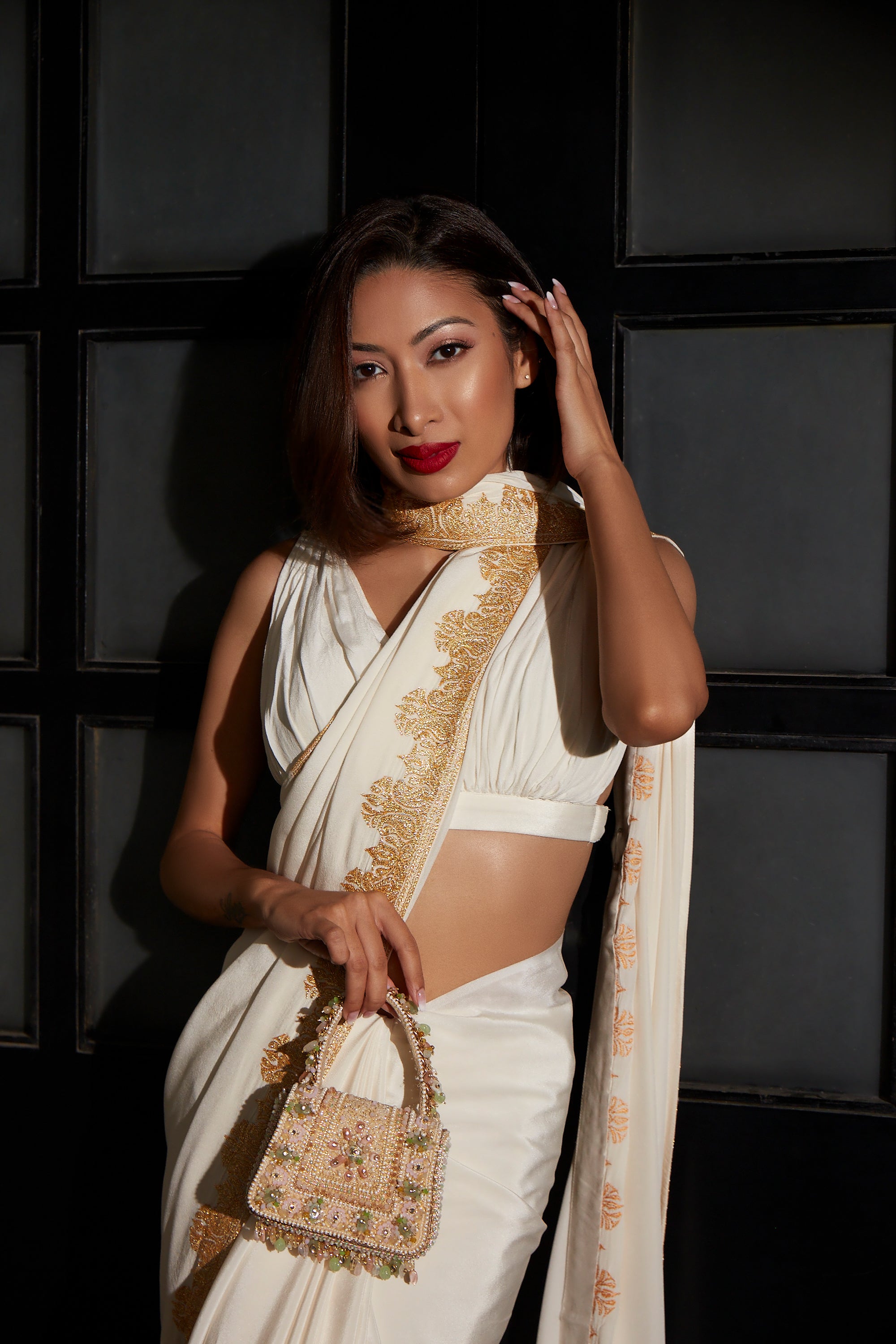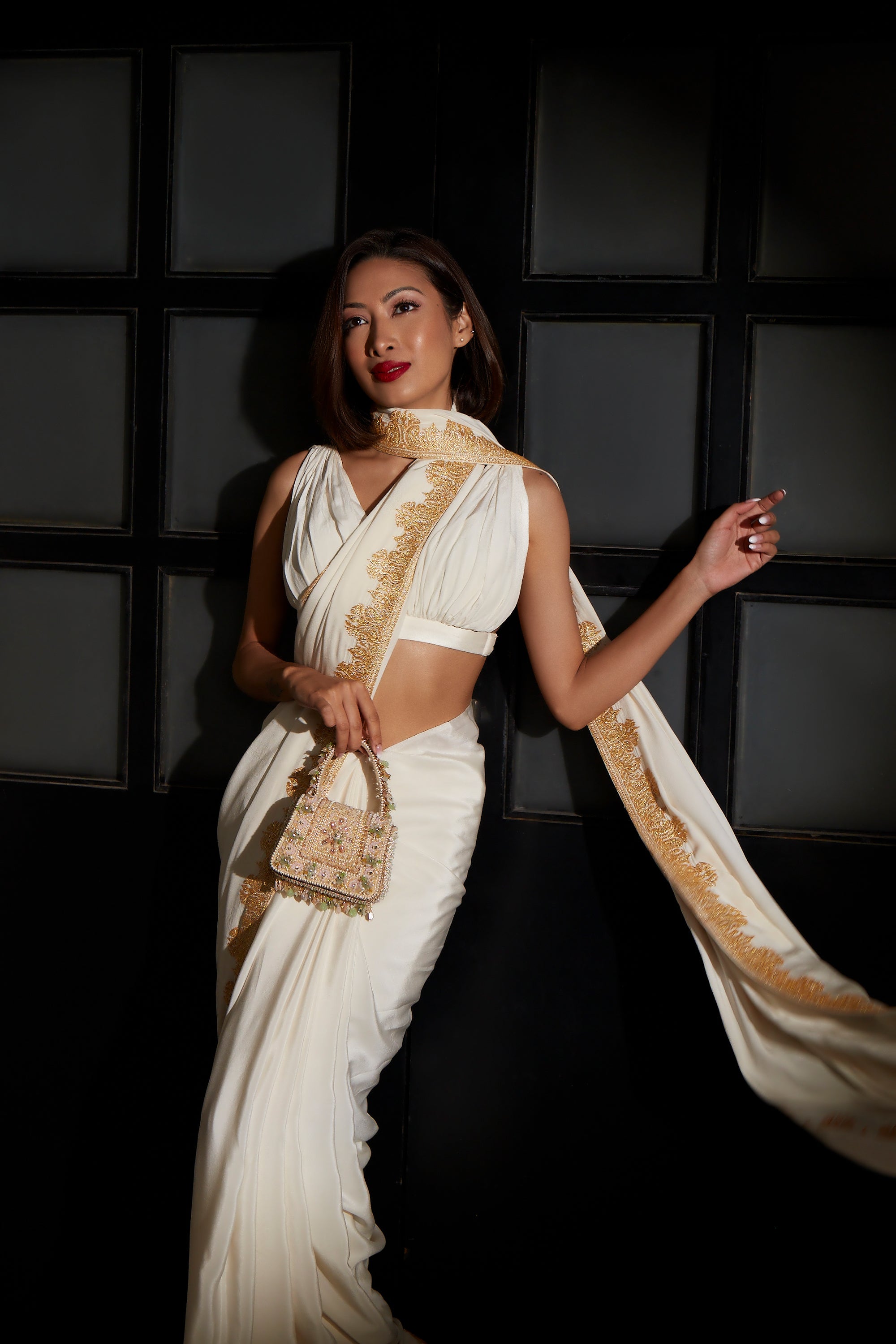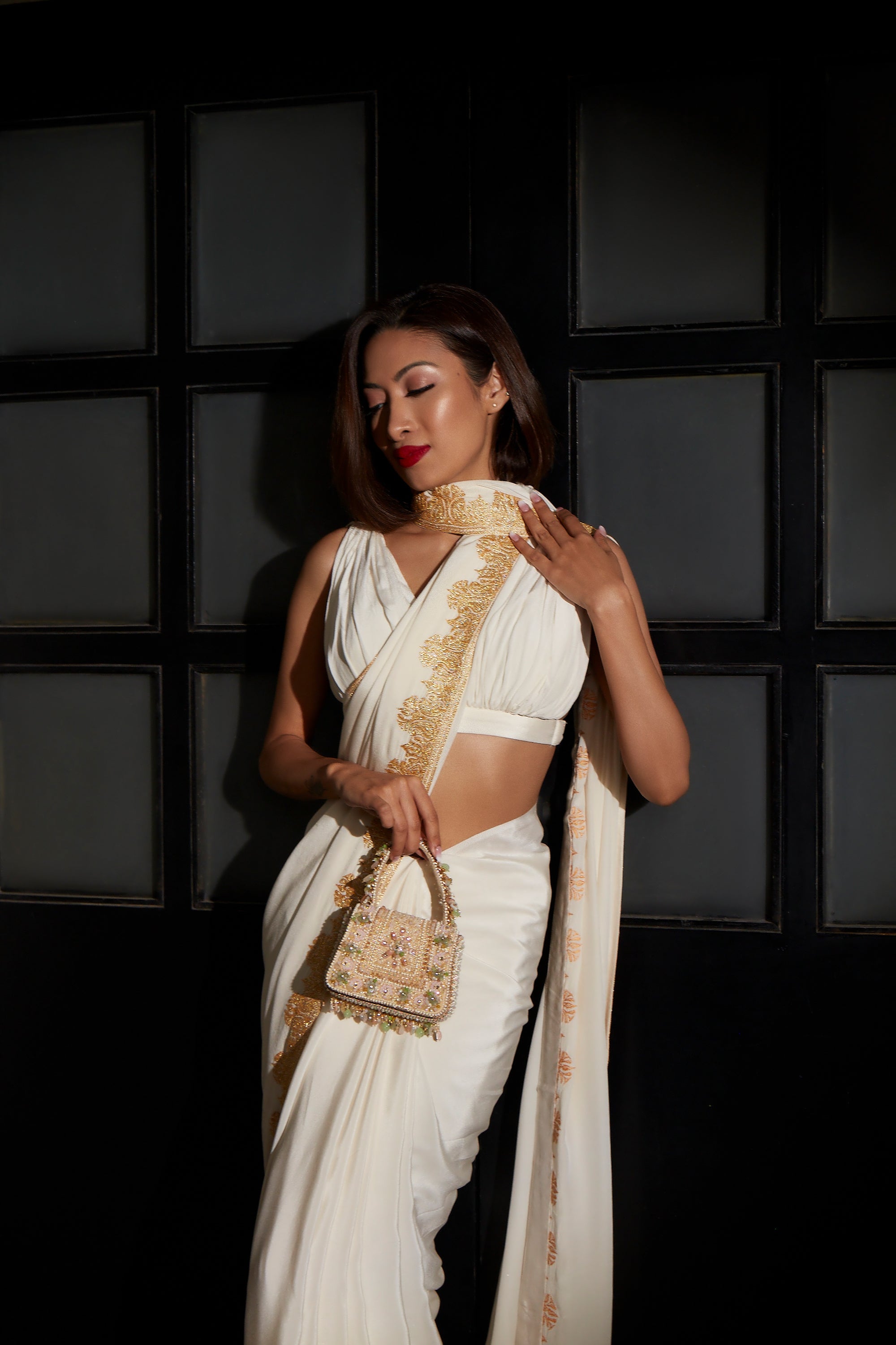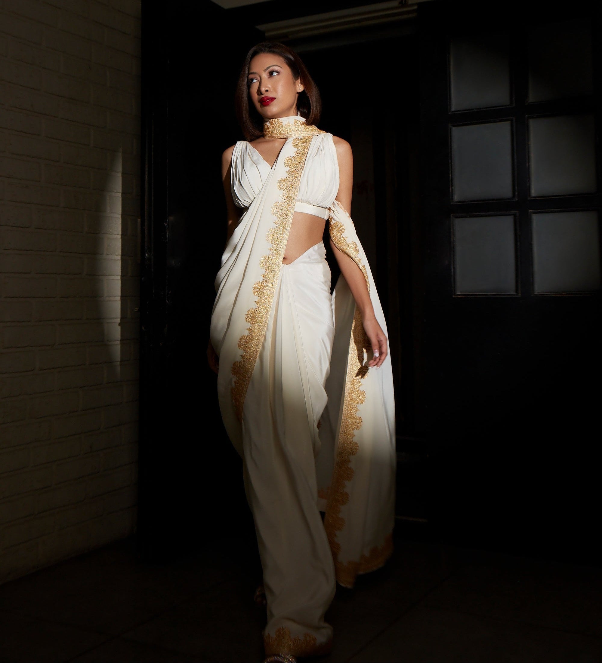 'Mastani' Ivory saree features luminous Hand Embroidered Kashmiri tilla work and is paired with a modern pleated crepe silk blouse.