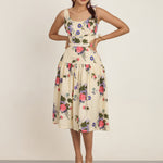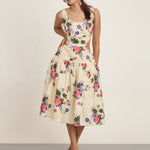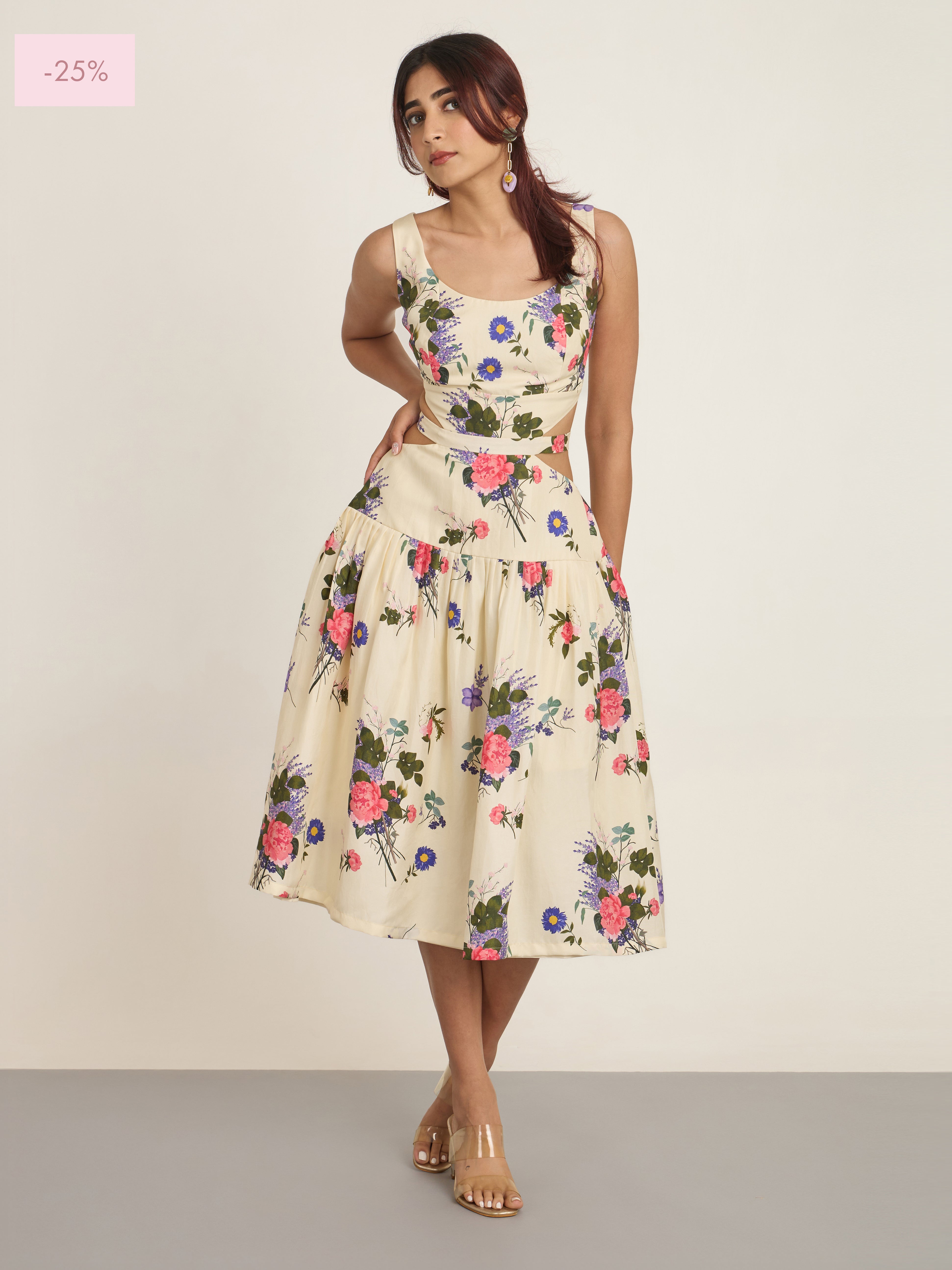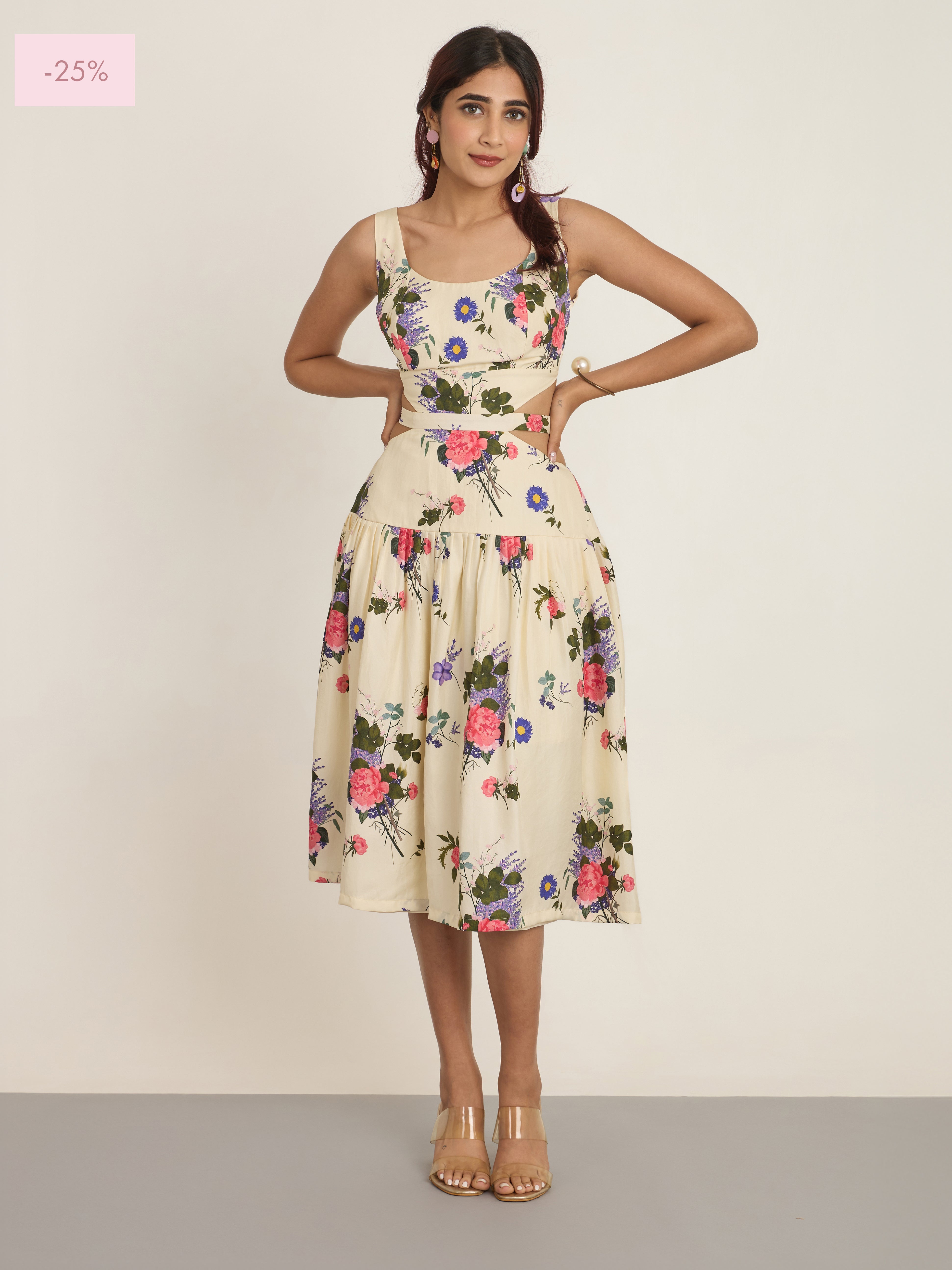'Izel' white waist cut-out and scoop neck floral printed midi dress