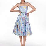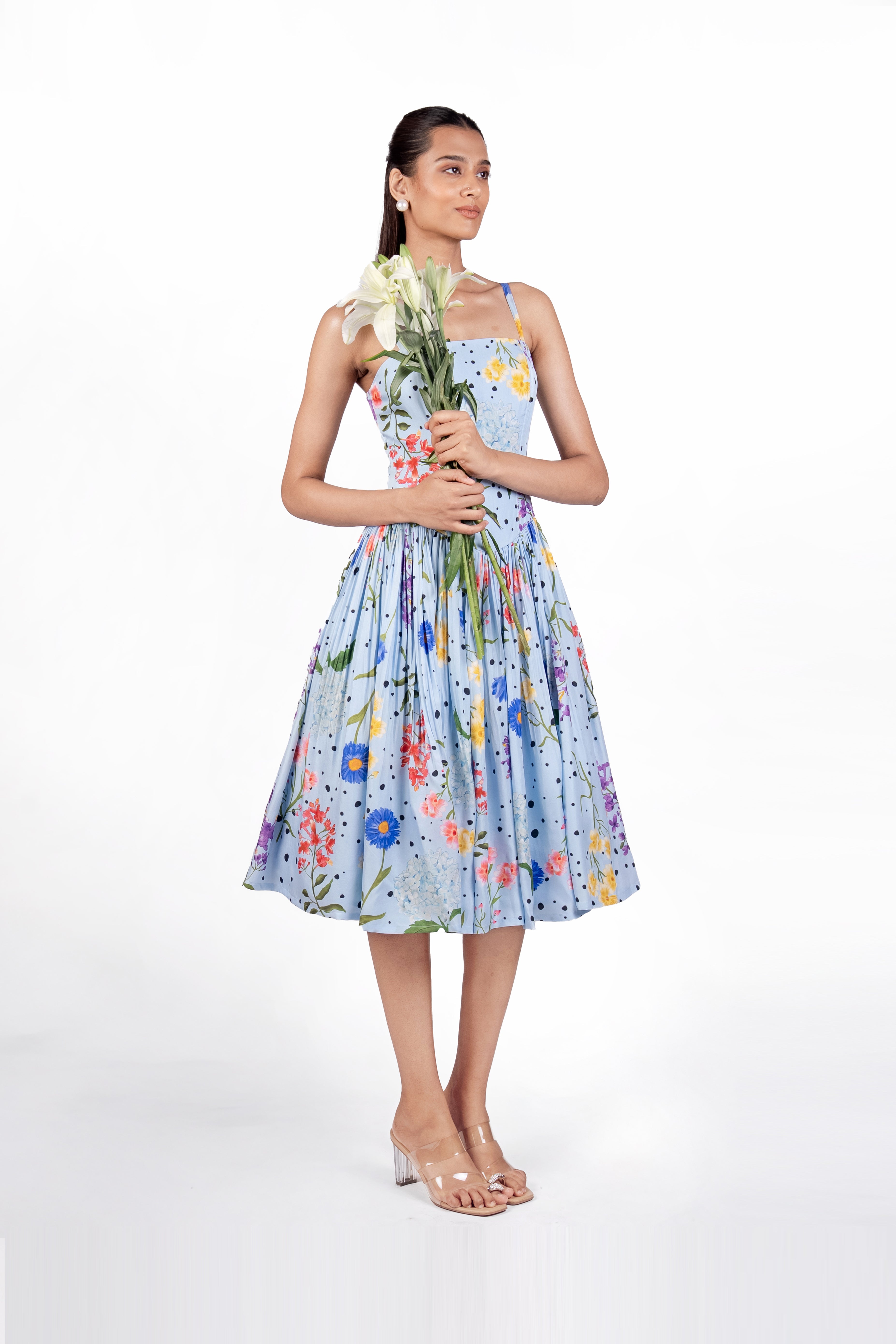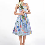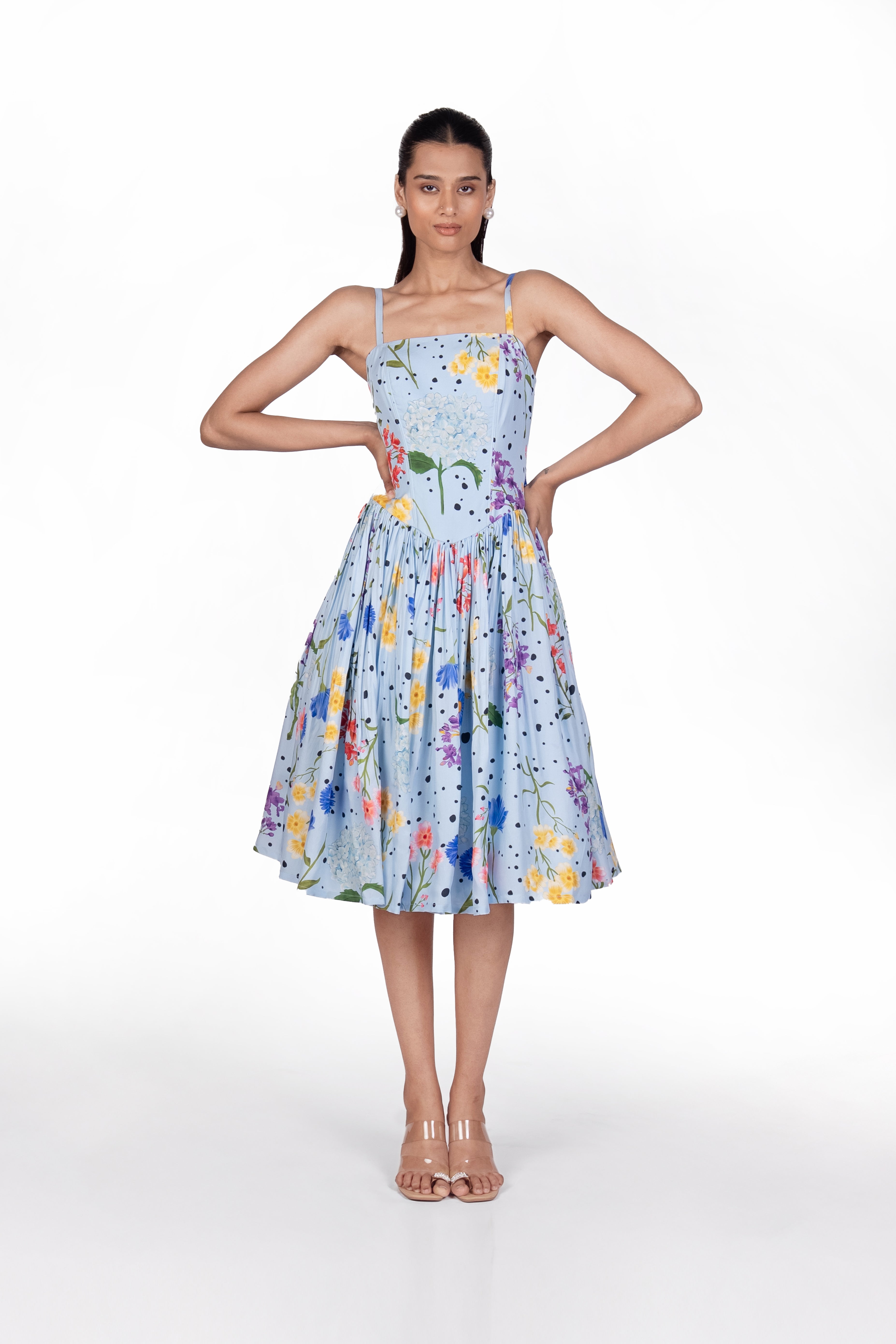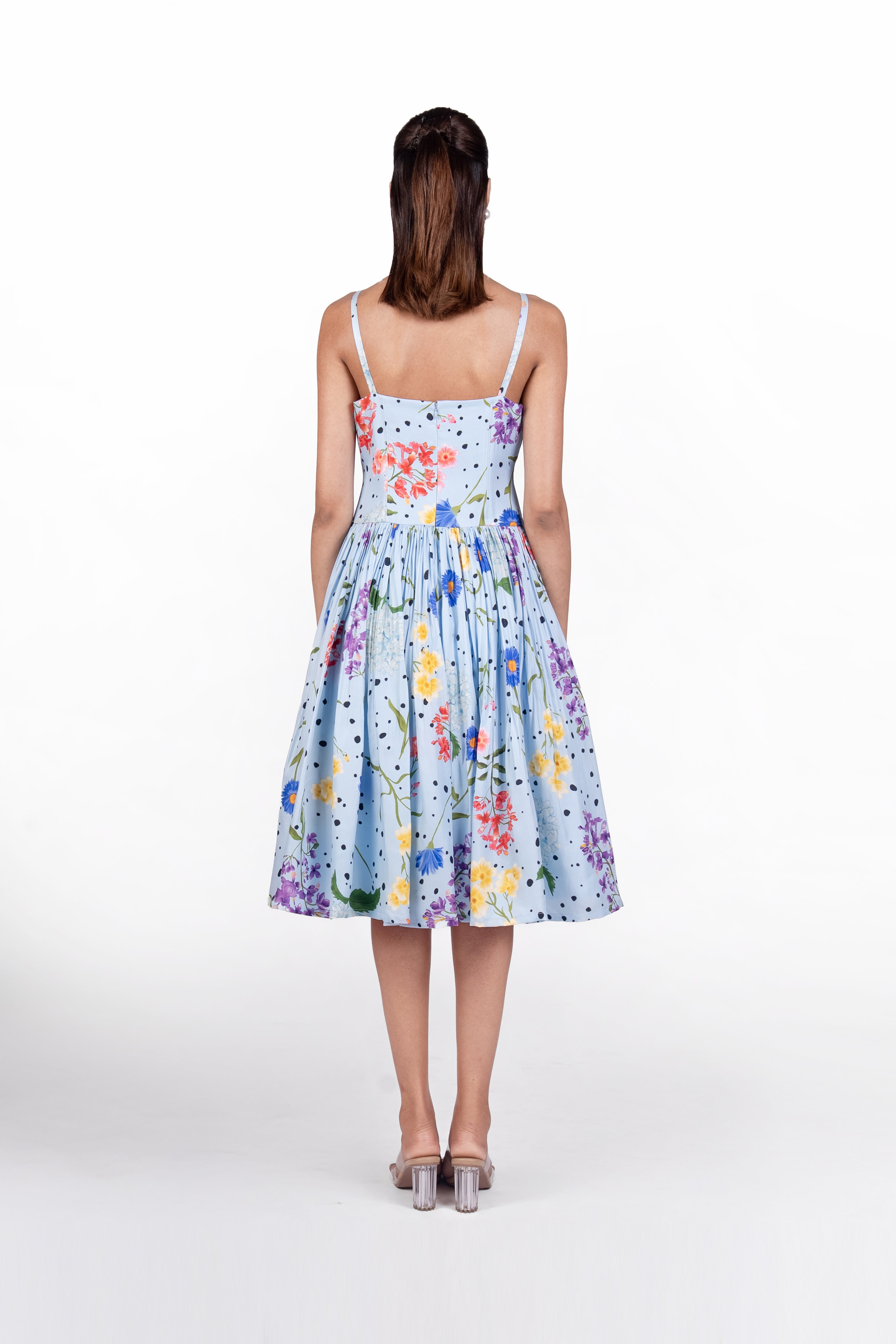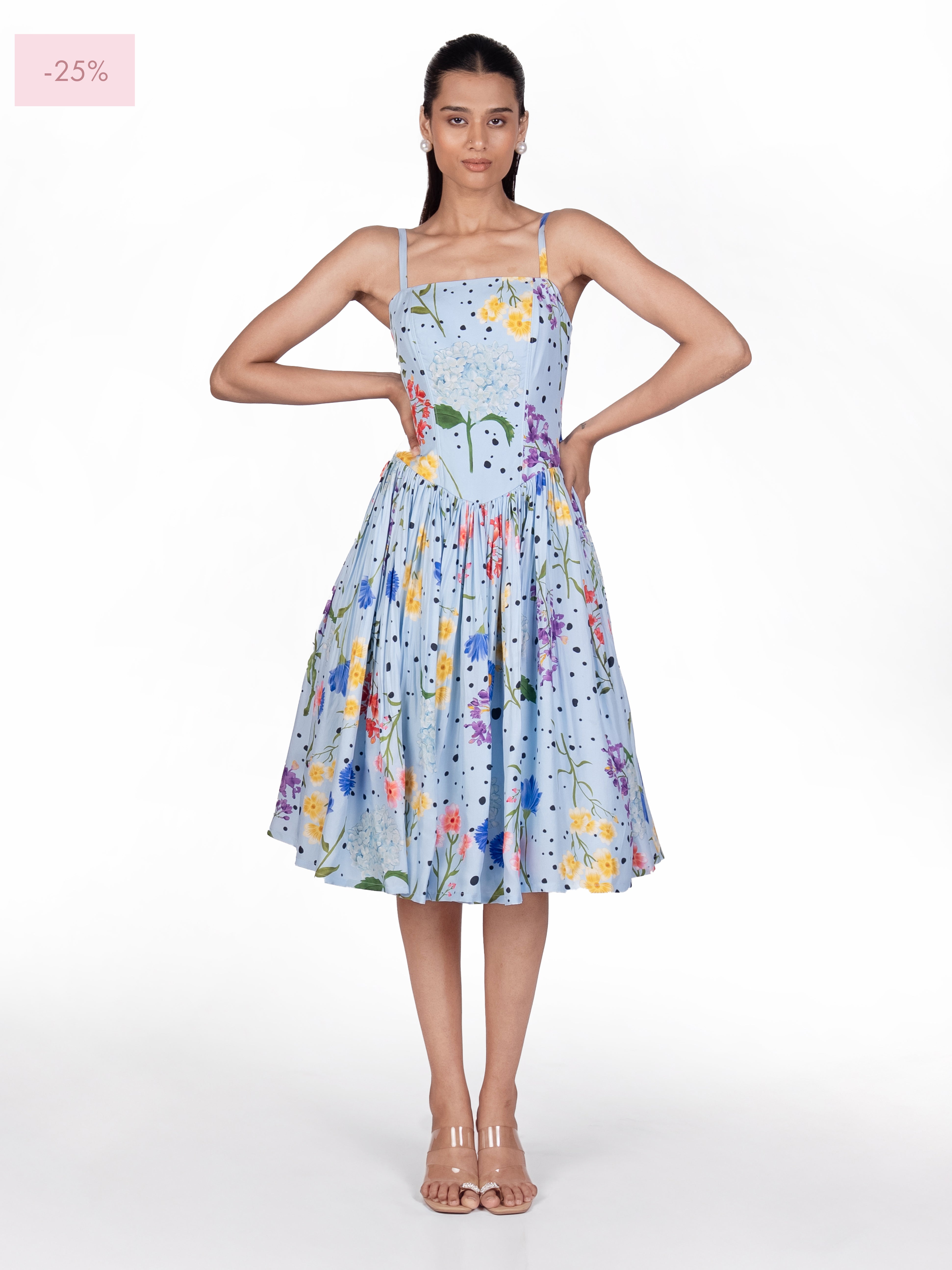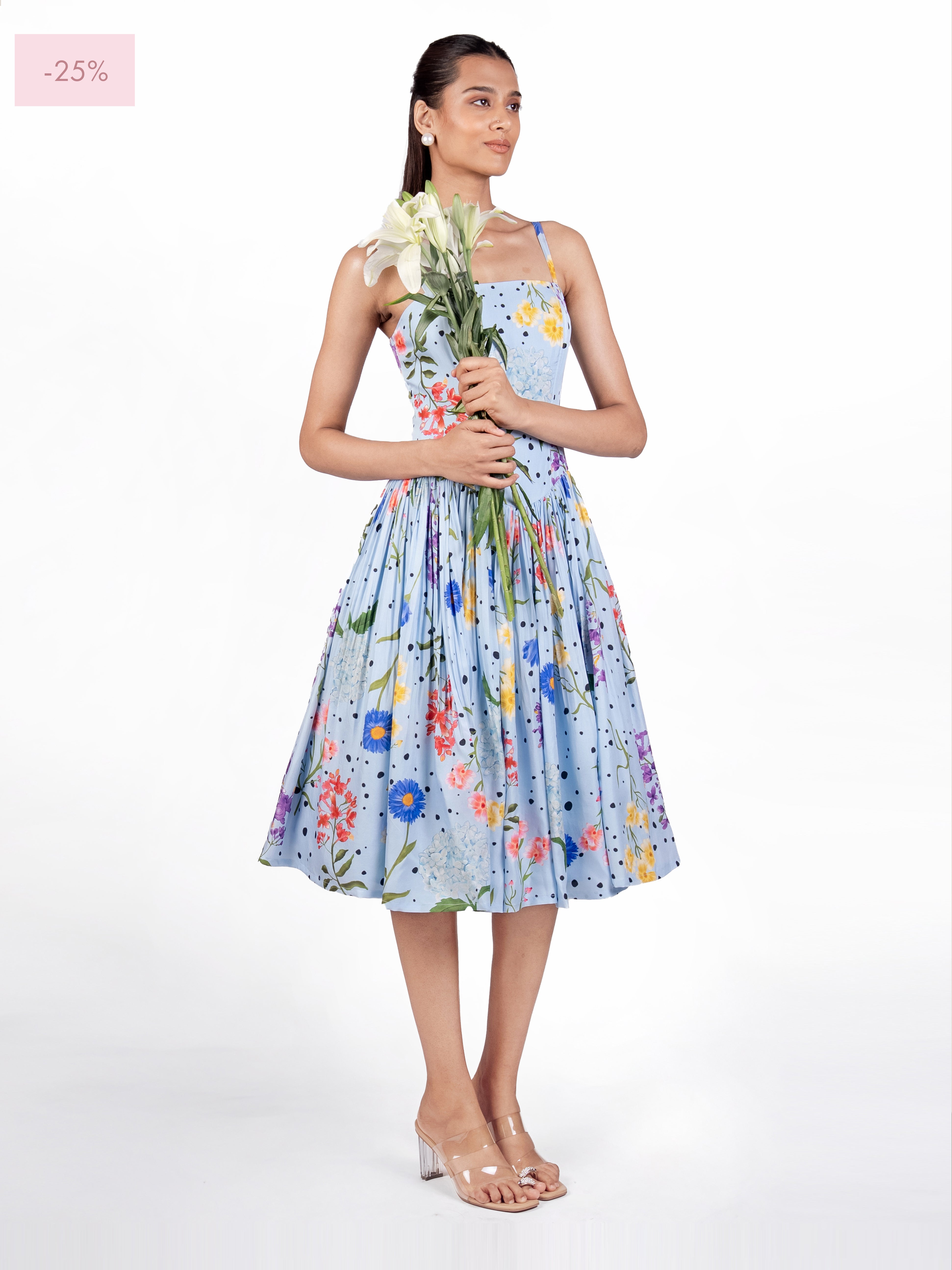 'Aira' light blue floral printed midi dress features delicate spaghetti straps, a softly gathered waist, and a structured bodice with an invisible back zip