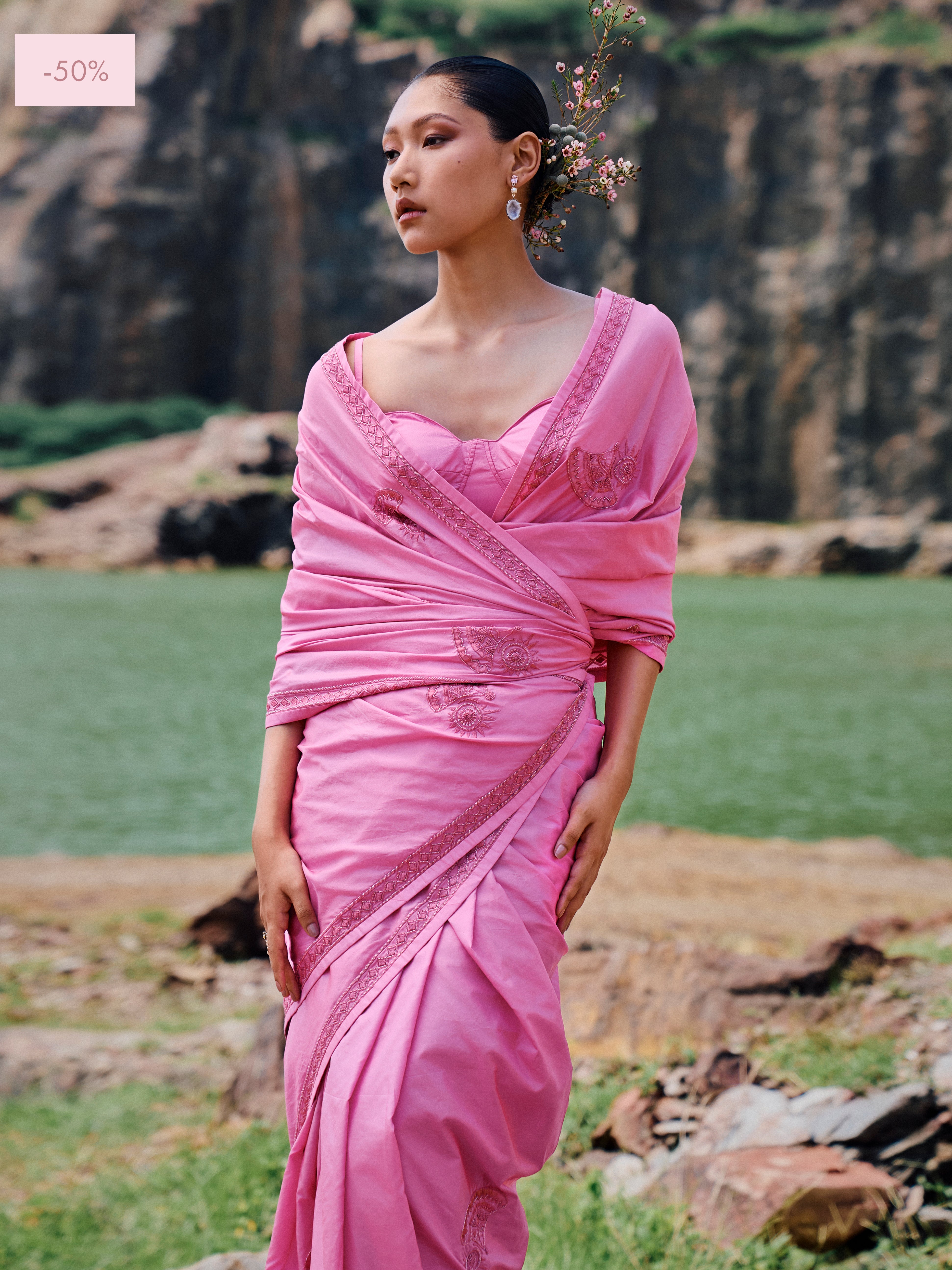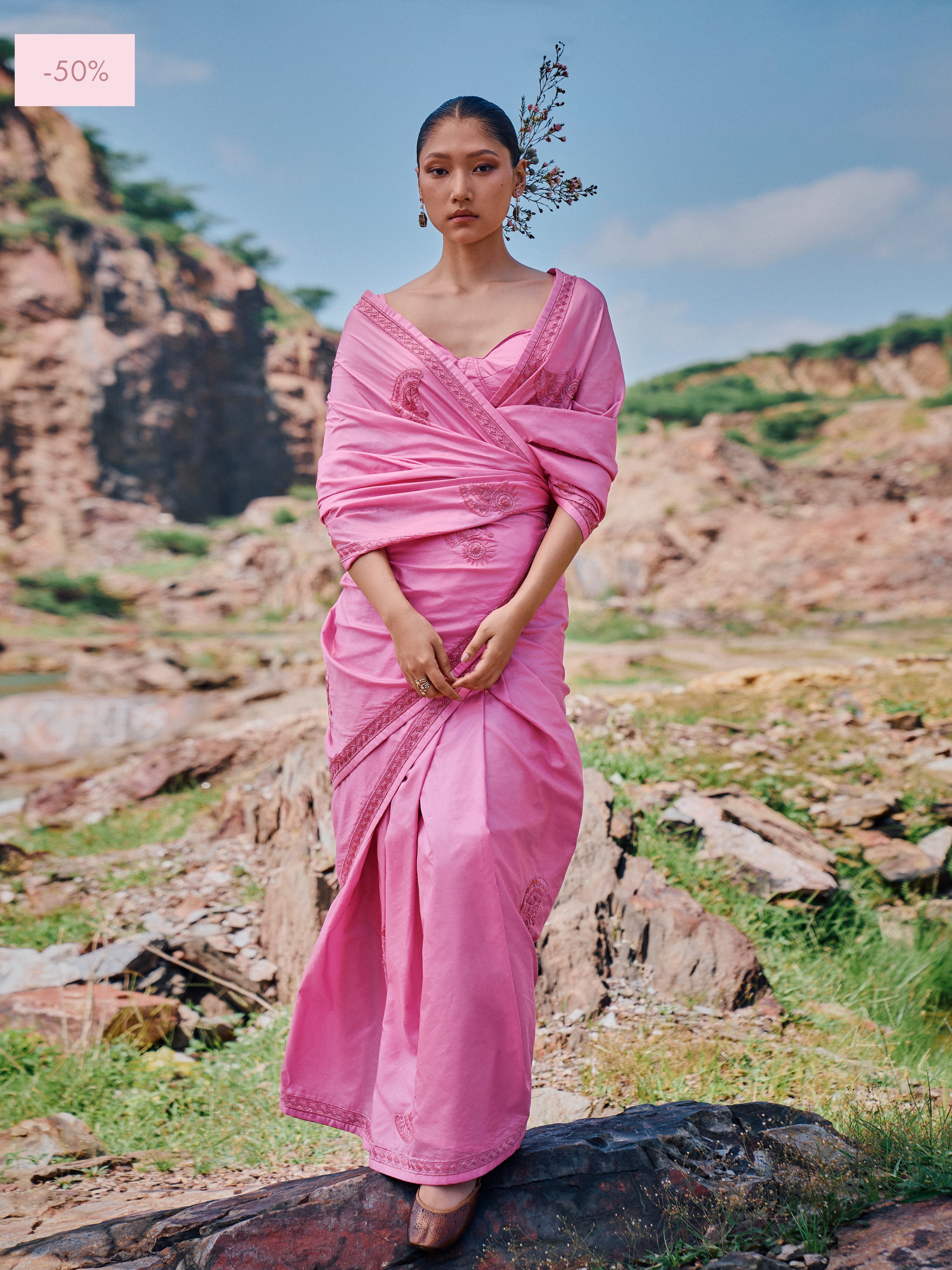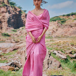 'Jaapi' Pink Sari features Hand Embroidered Border with the traditional Assamese Hat motifs all over and is paired with pure silk blouse.