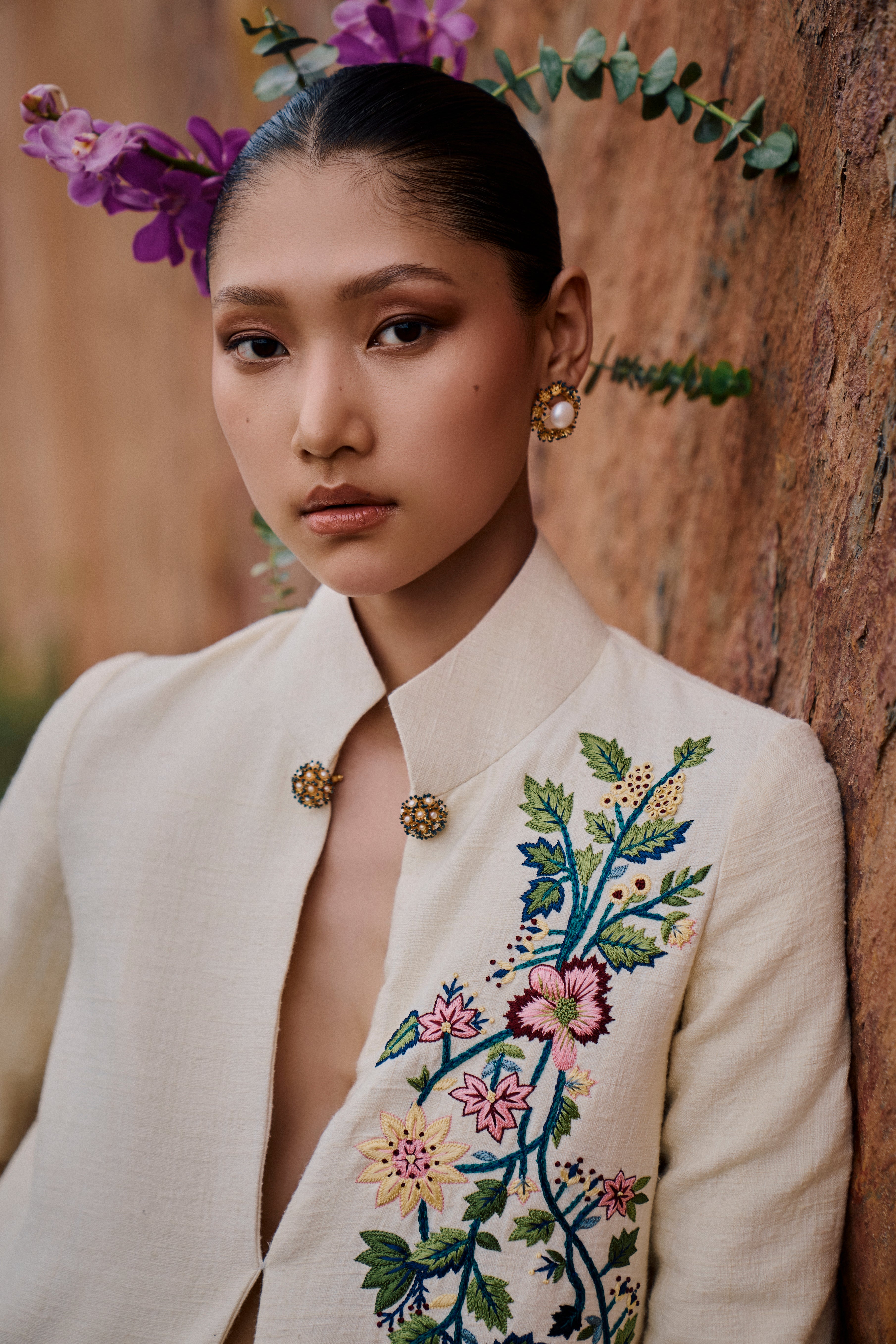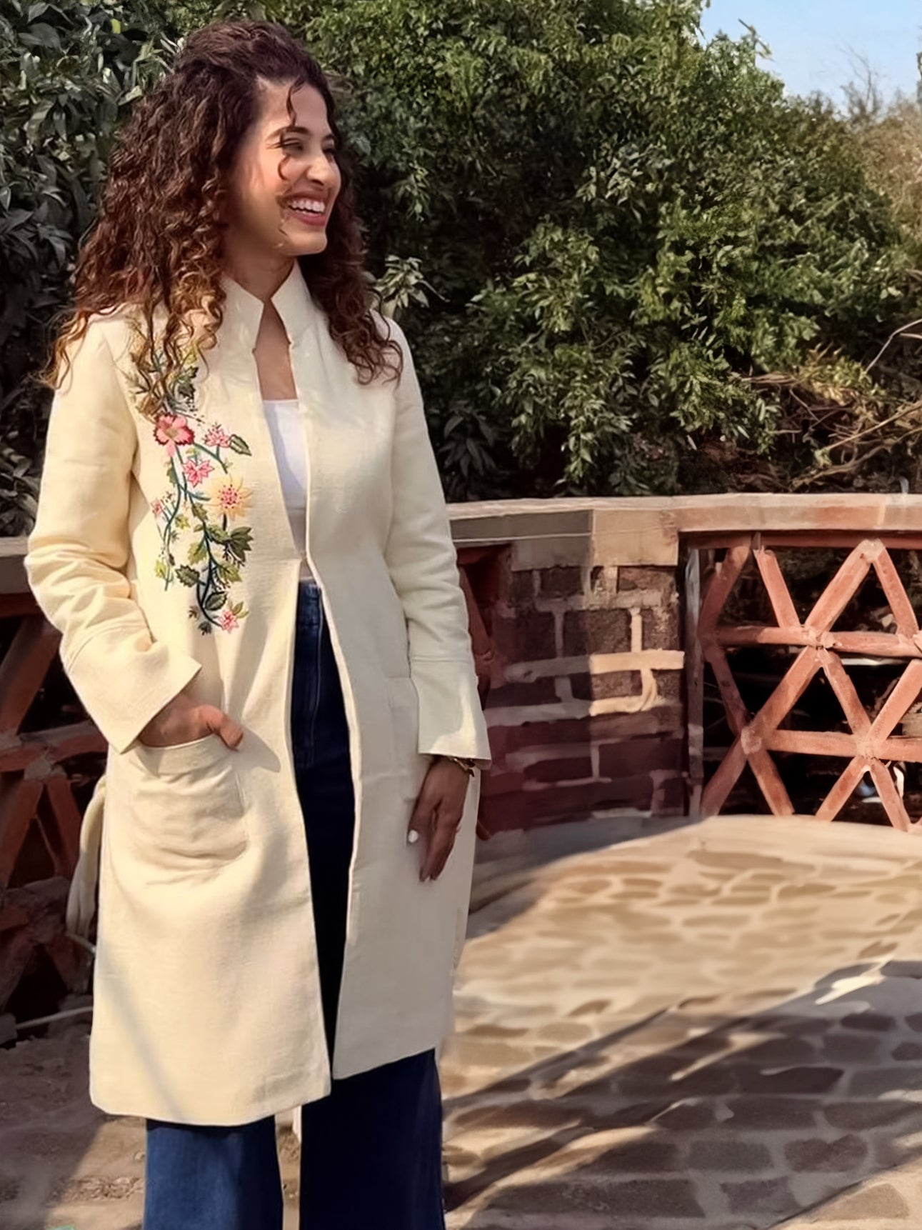 'Zuci' Eri (Vegan) naturally dyed Silk off white jacket features Hand Embroidered Floral motif.