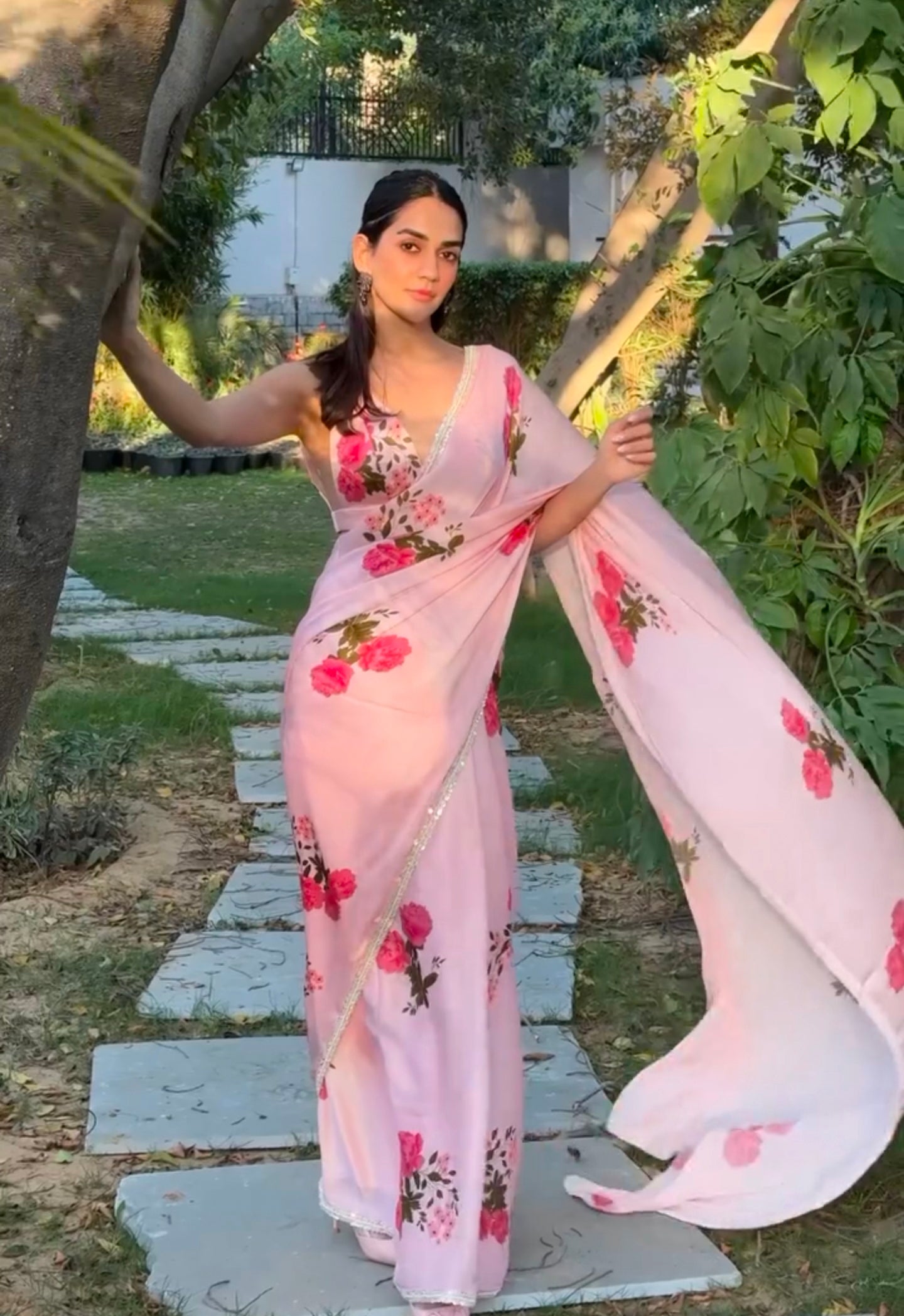 'SELENE' Pink floral satin silk saree features floral butis all over and comes with matching stitched floral printed sleeveless blouse.
