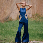Navy Blue katan silk 'Kaza' kurta features Hand Embroidered Silver Floral motif and is paired with matching Katan Silk 'Ziva' pants.