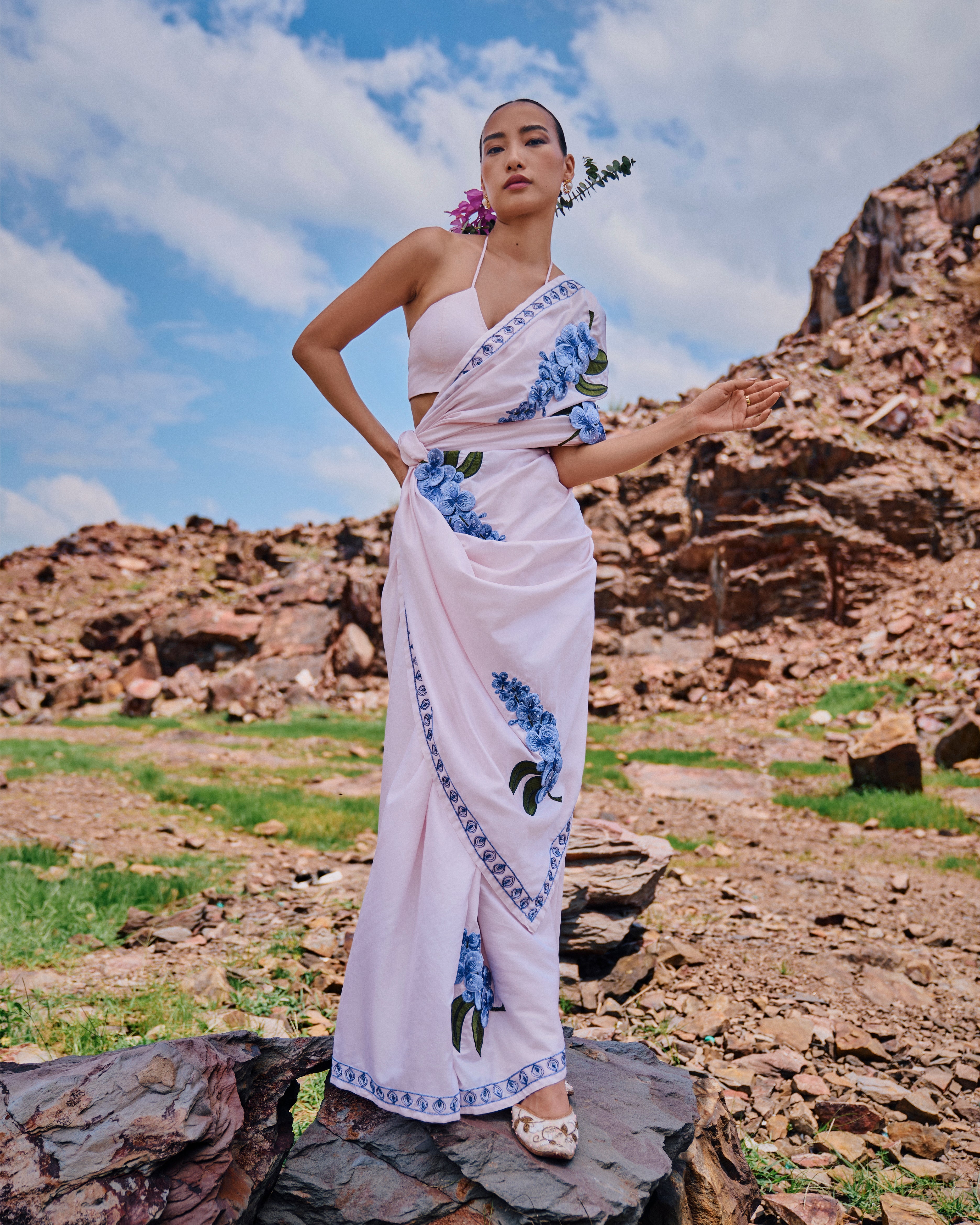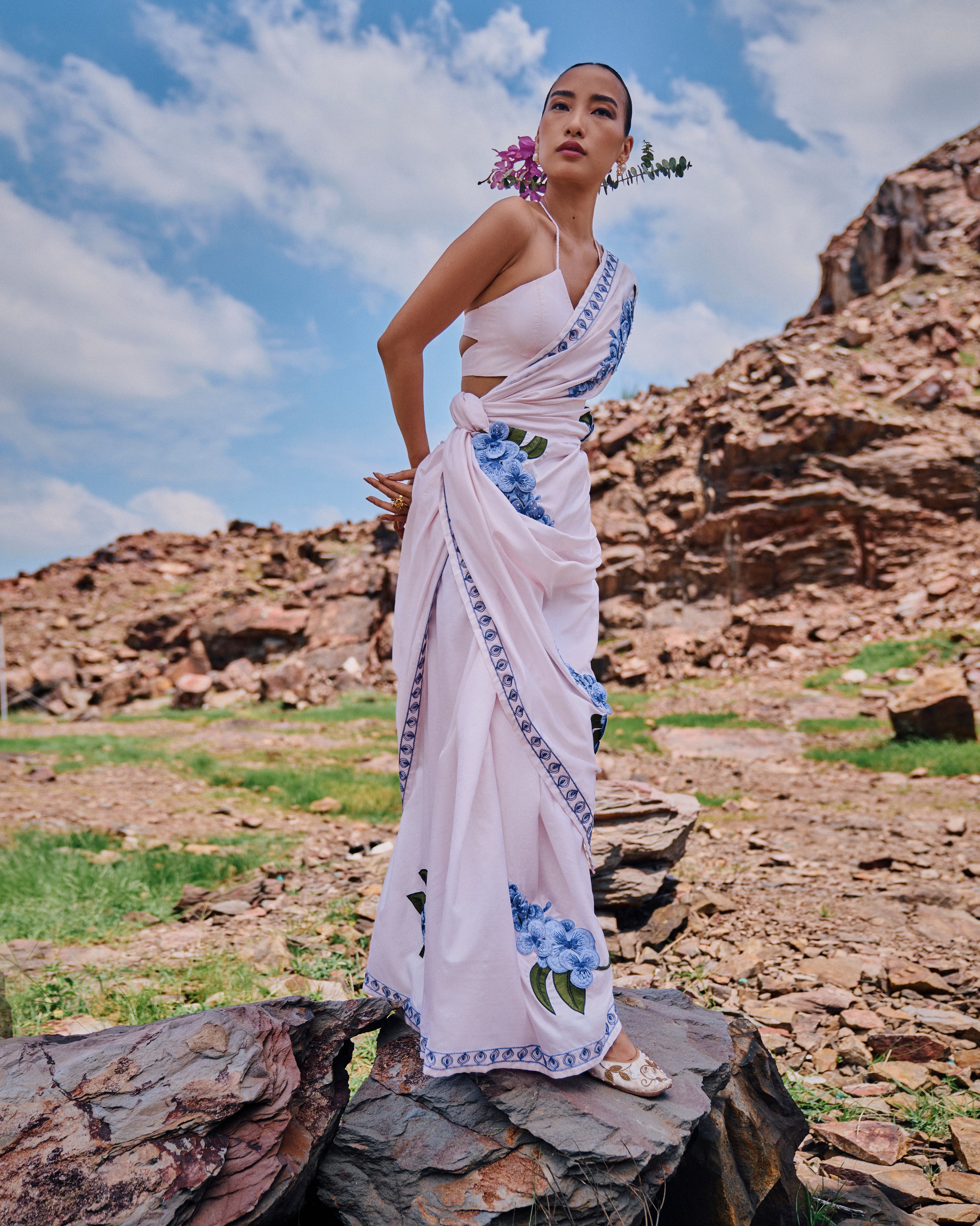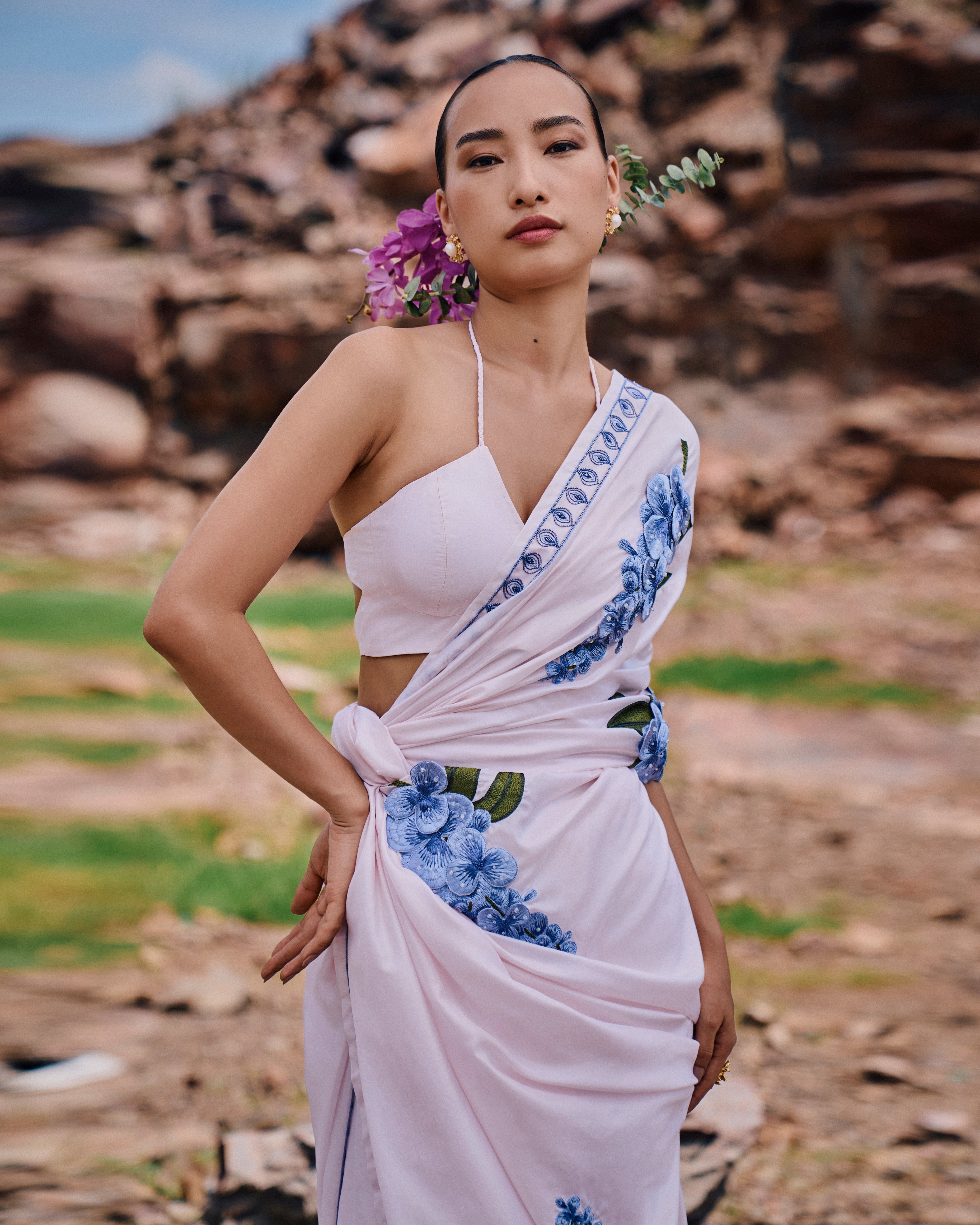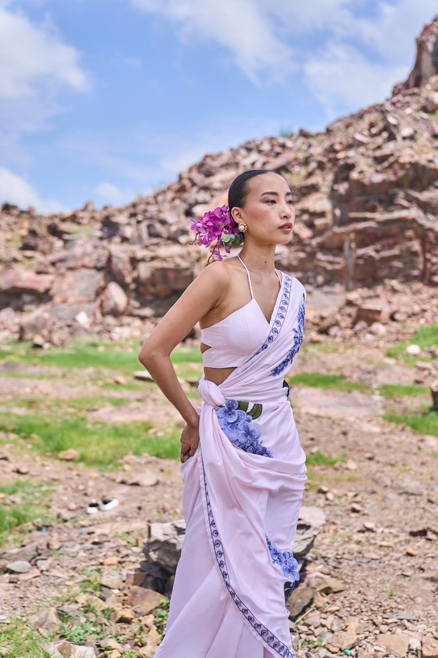'Kopou' light pink sari features Hand Embroidered Lavender Orchid 3D floral motif placement all over and is paired with pure silk blouse.