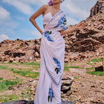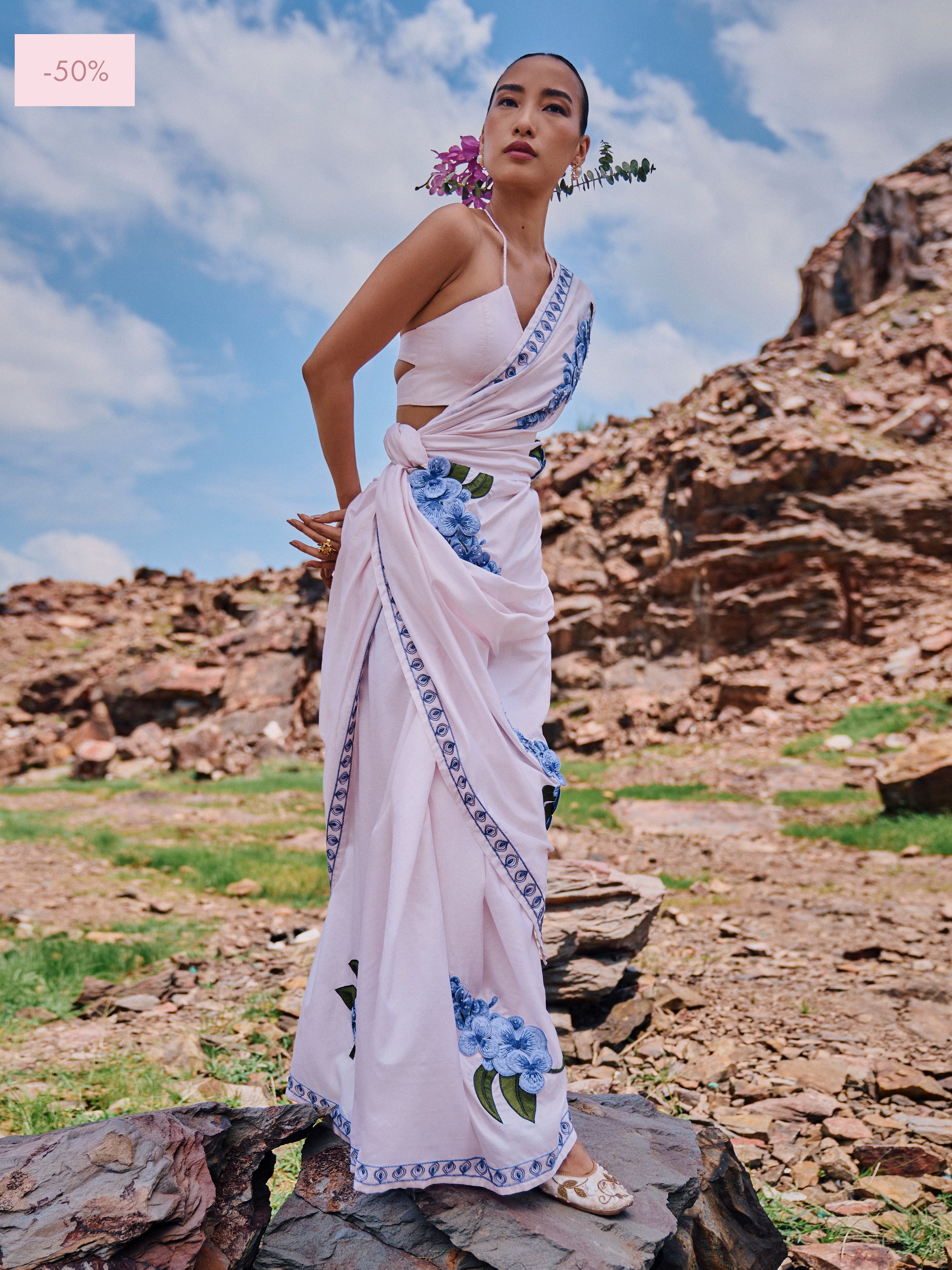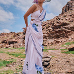 'Kopou' light pink sari features Hand Embroidered Lavender Orchid 3D floral motif placement all over and is paired with pure silk blouse.