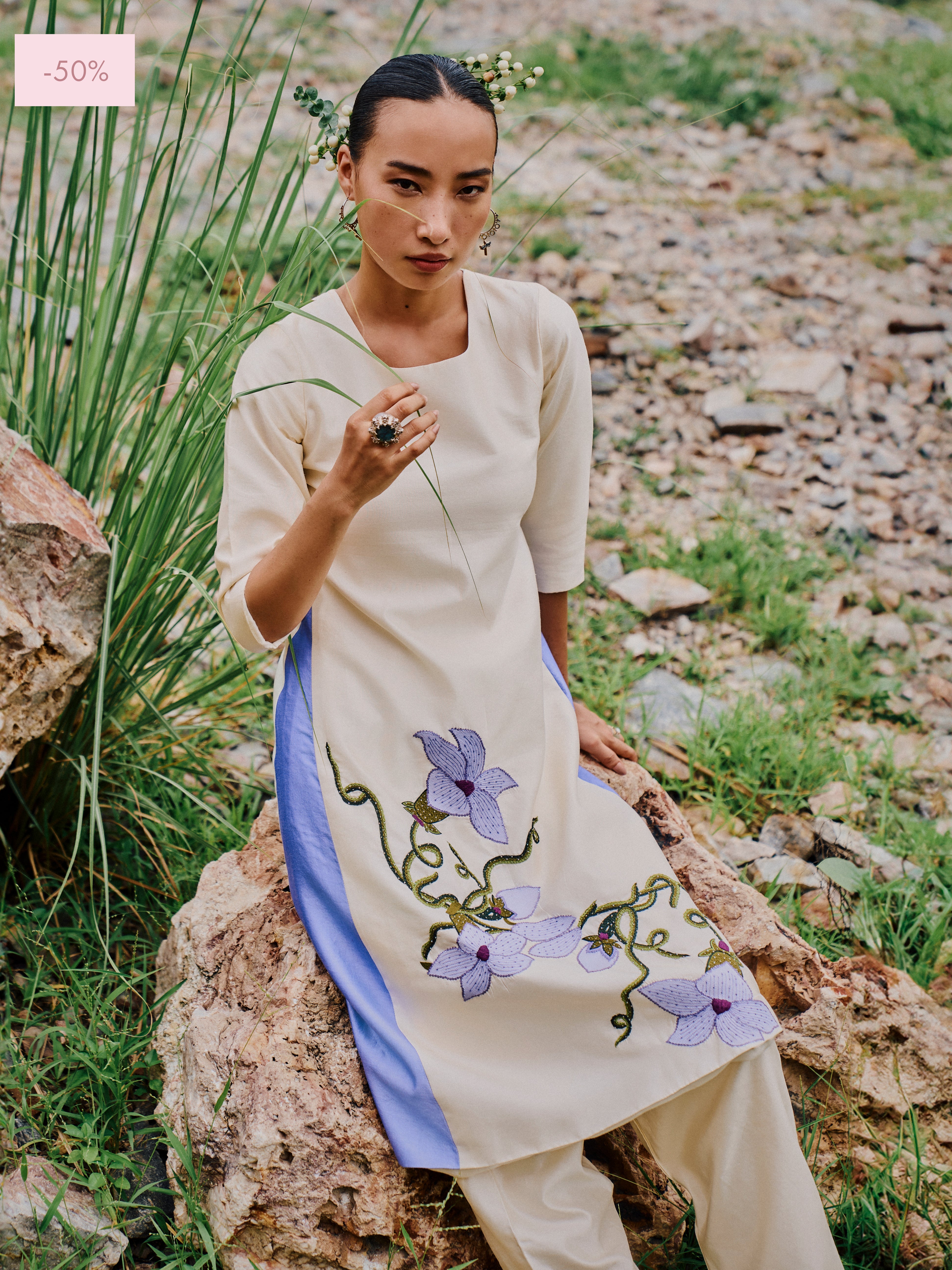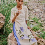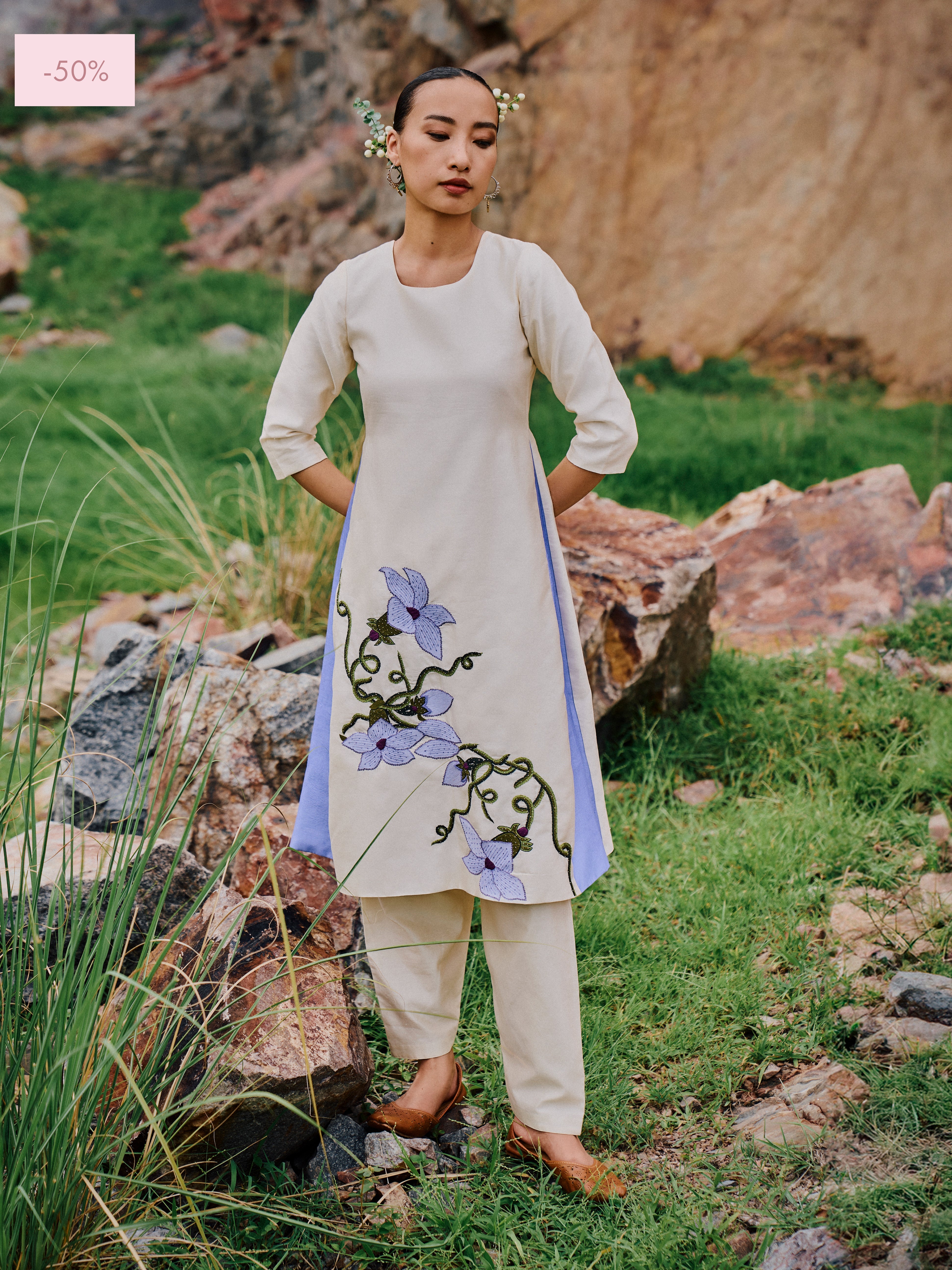Godet Chiniya Silk 'Kusuma' Kurta features hand embroidered Wild Flower design and is paired with matching 'Luit' Pants.
