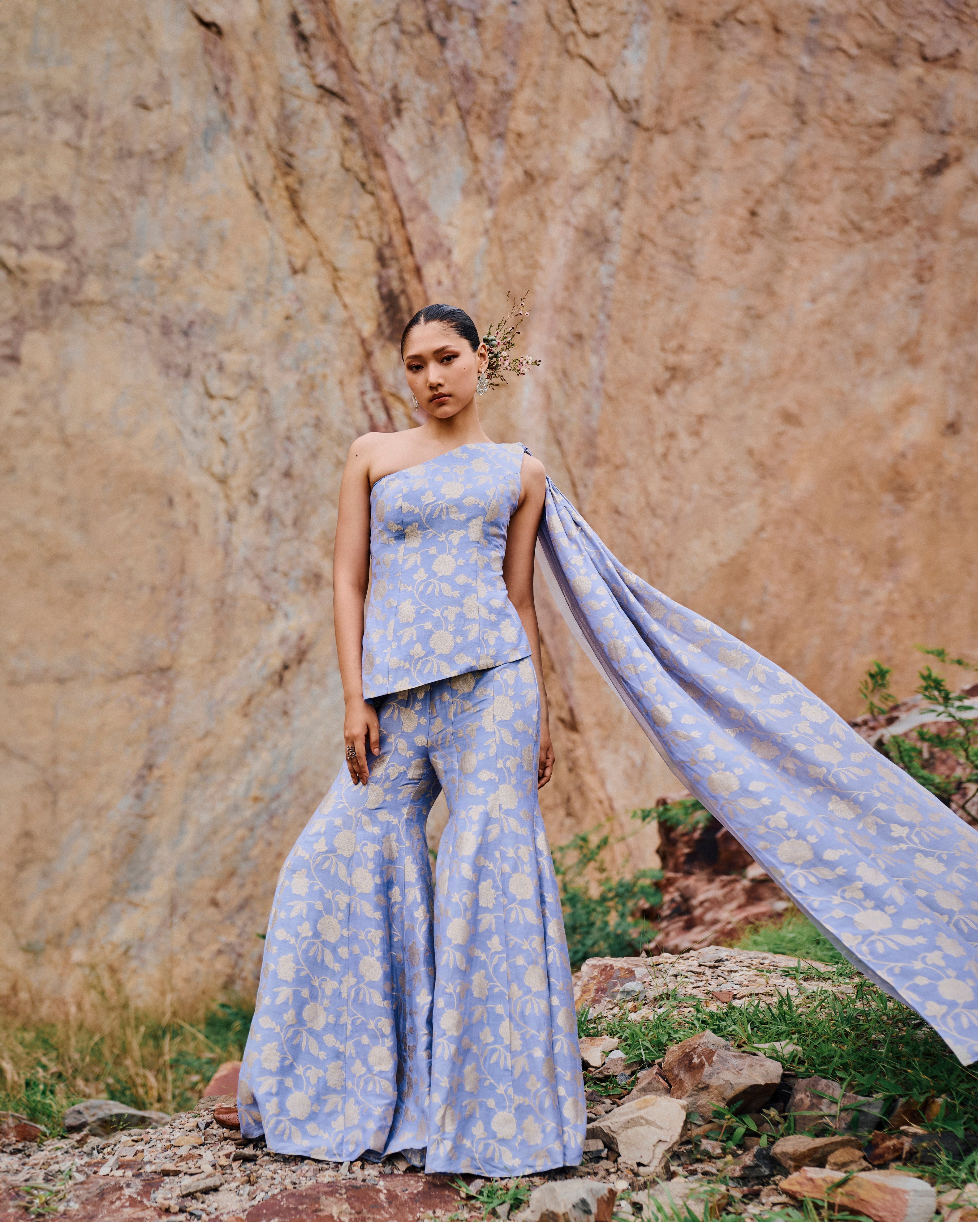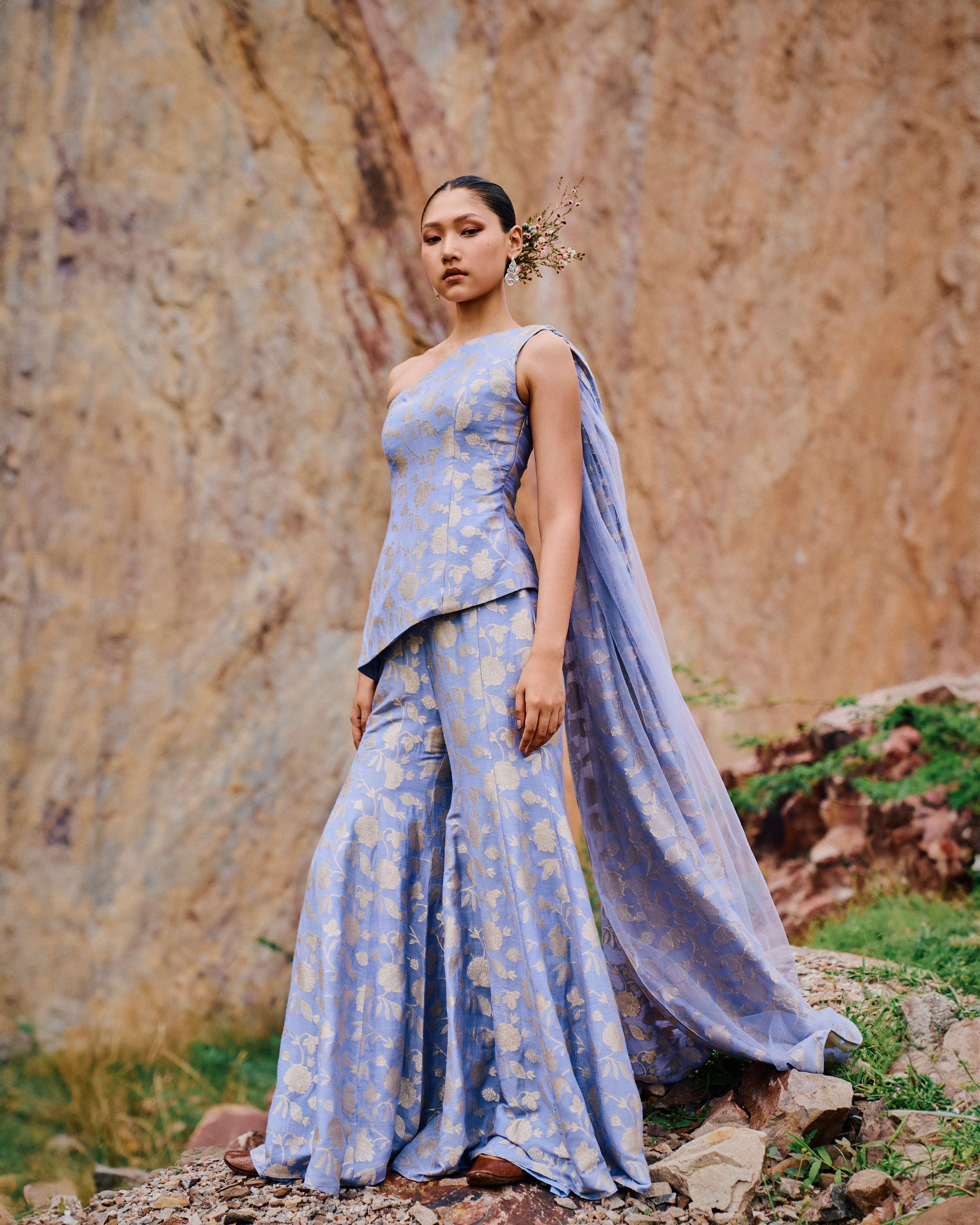 One shoulder Lavender 'Avani' Kurta with attached Veil and matching sharara pants.
