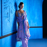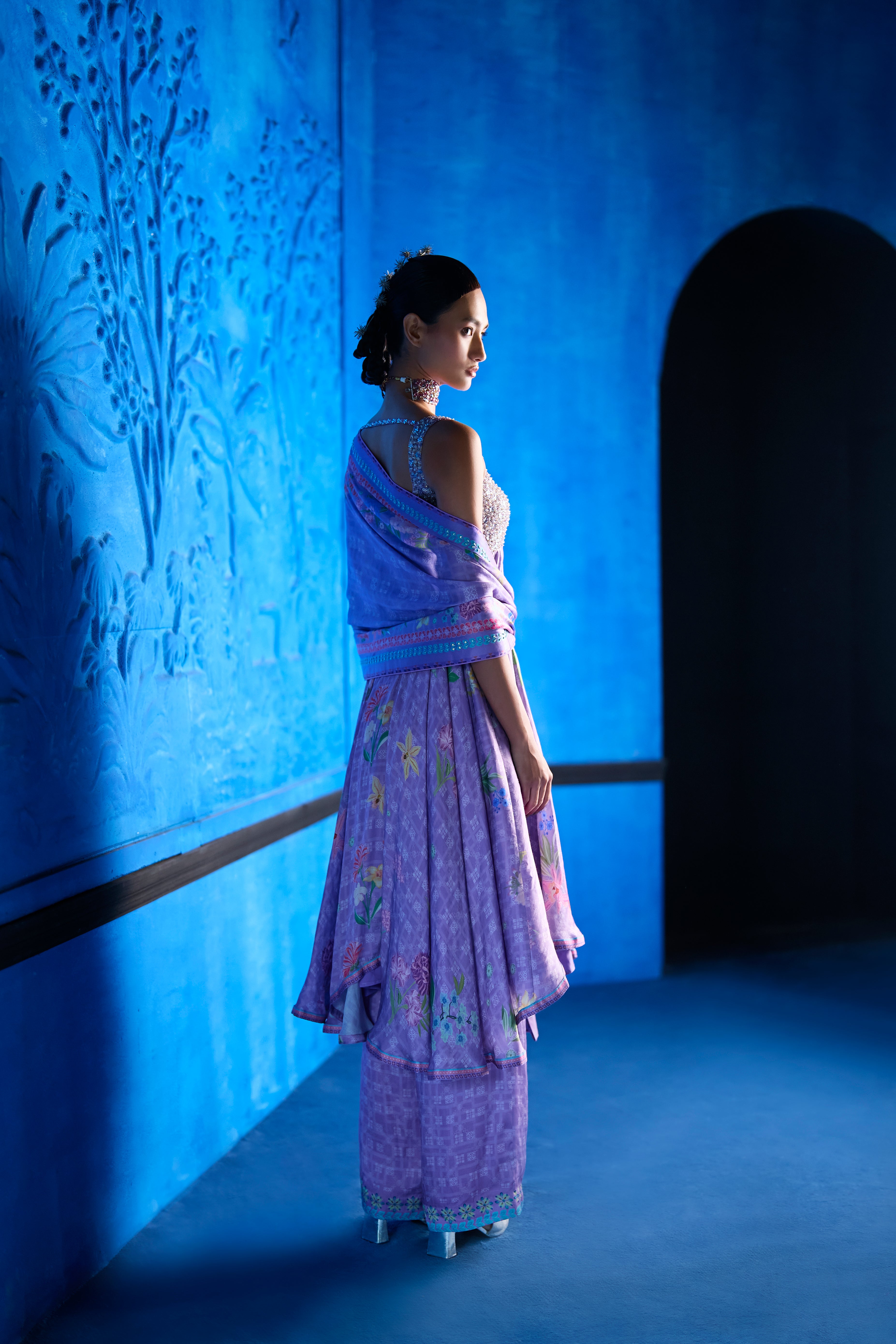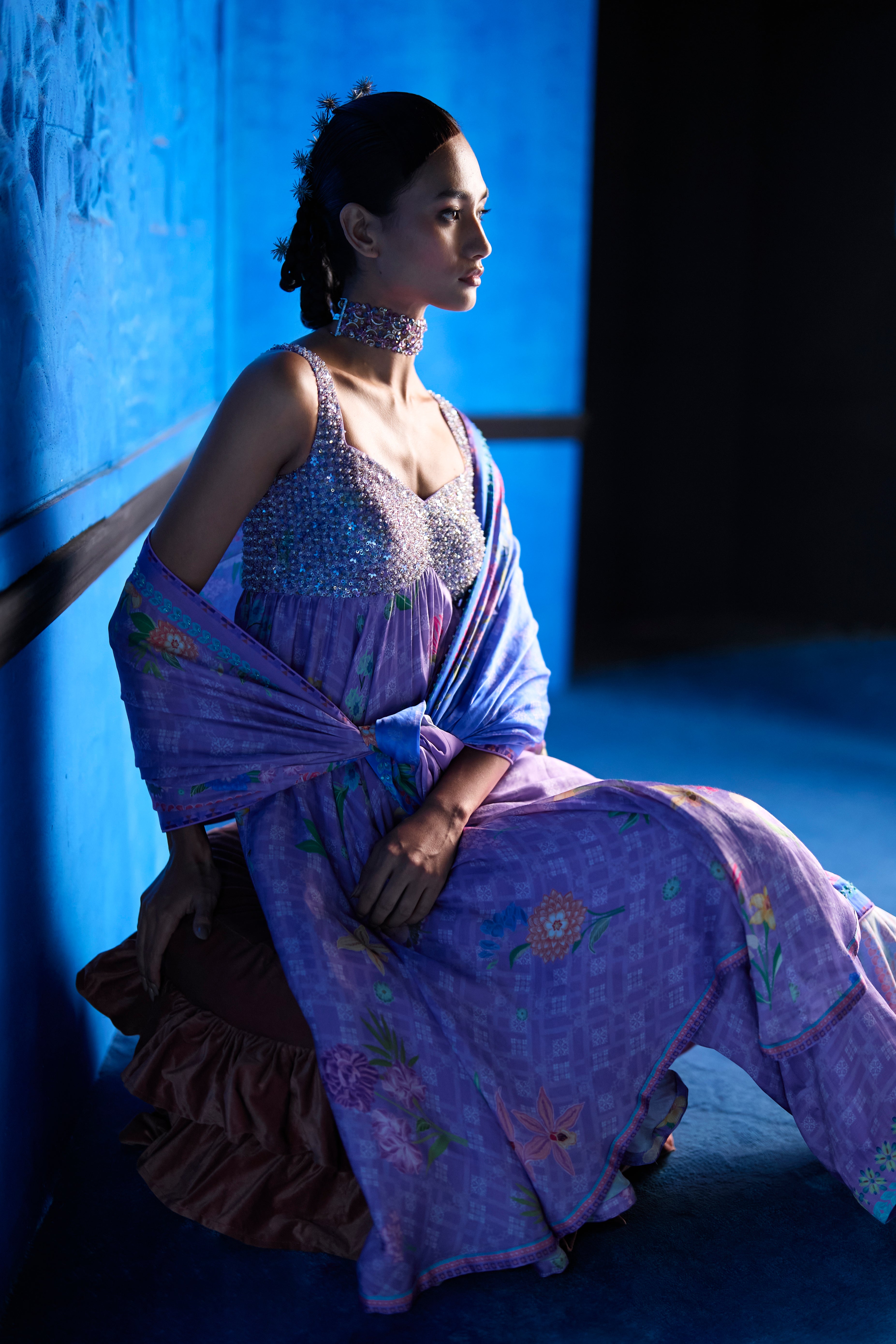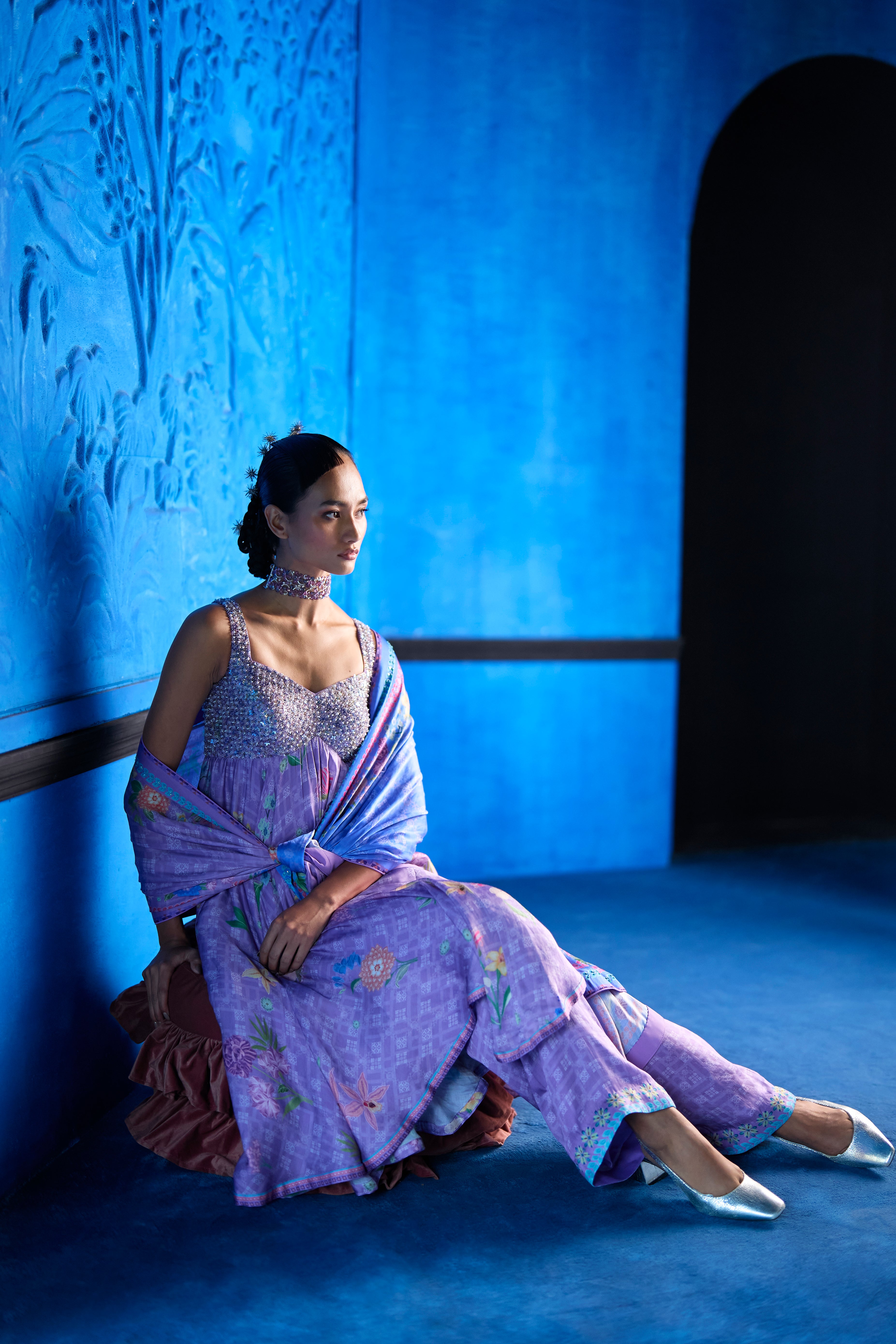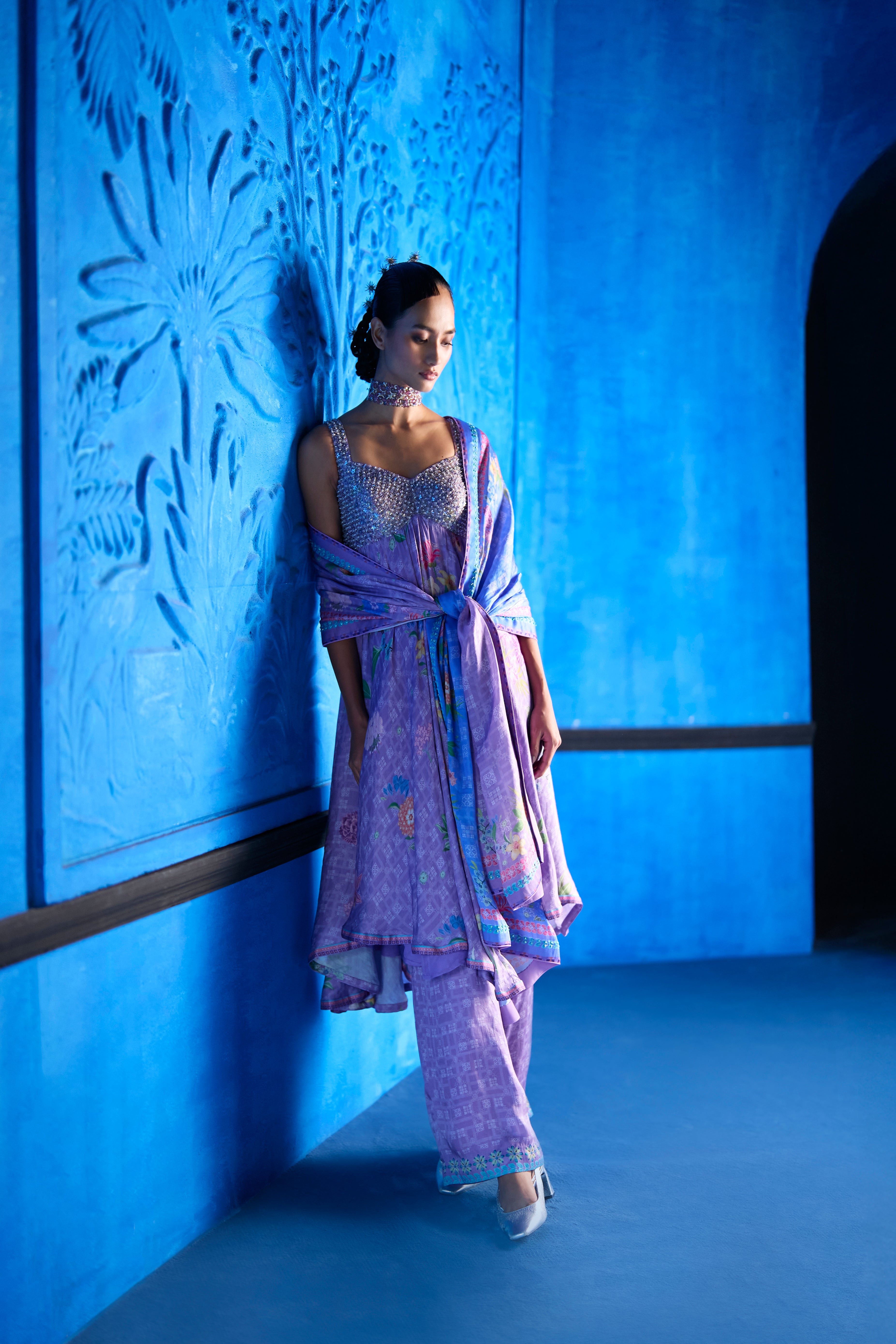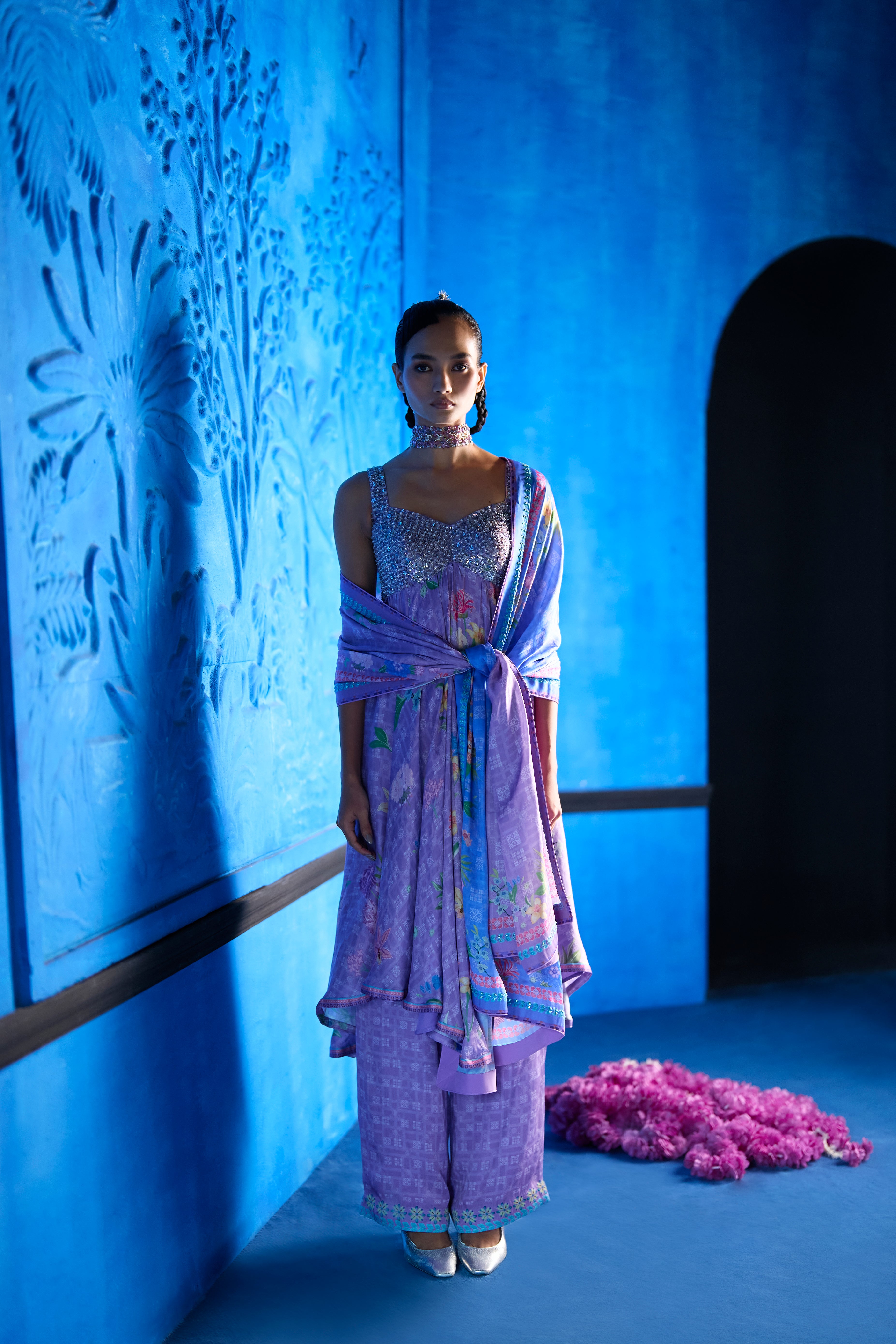Lilac floral printed Bemberg satin kurta with heavily embellished bustier-style bodice and sweetheart-neckline. Kurta Flows over floral printed wide-leg pants and a coordinating floral printed ombre dupatta.