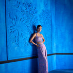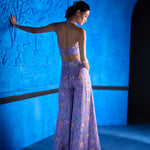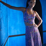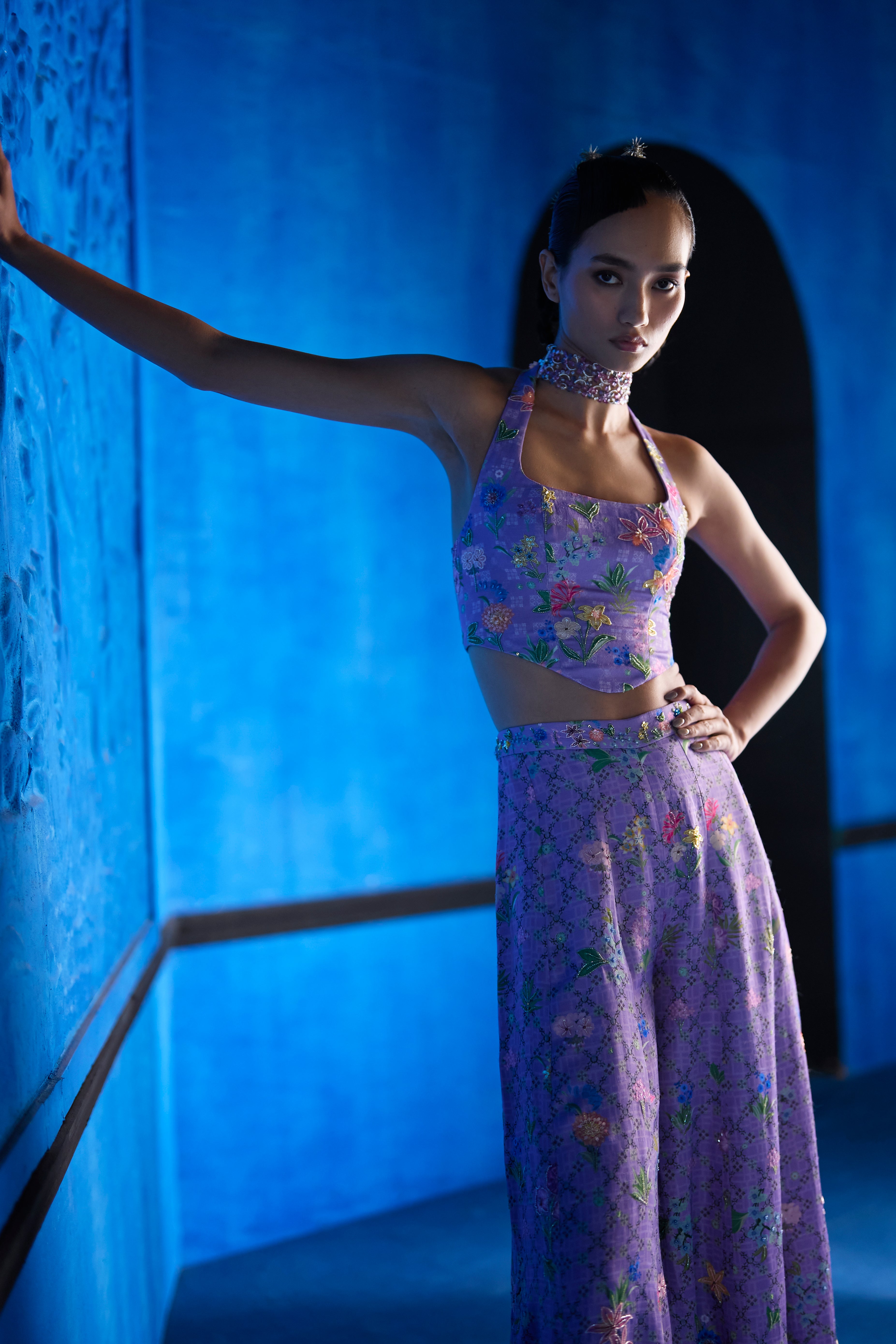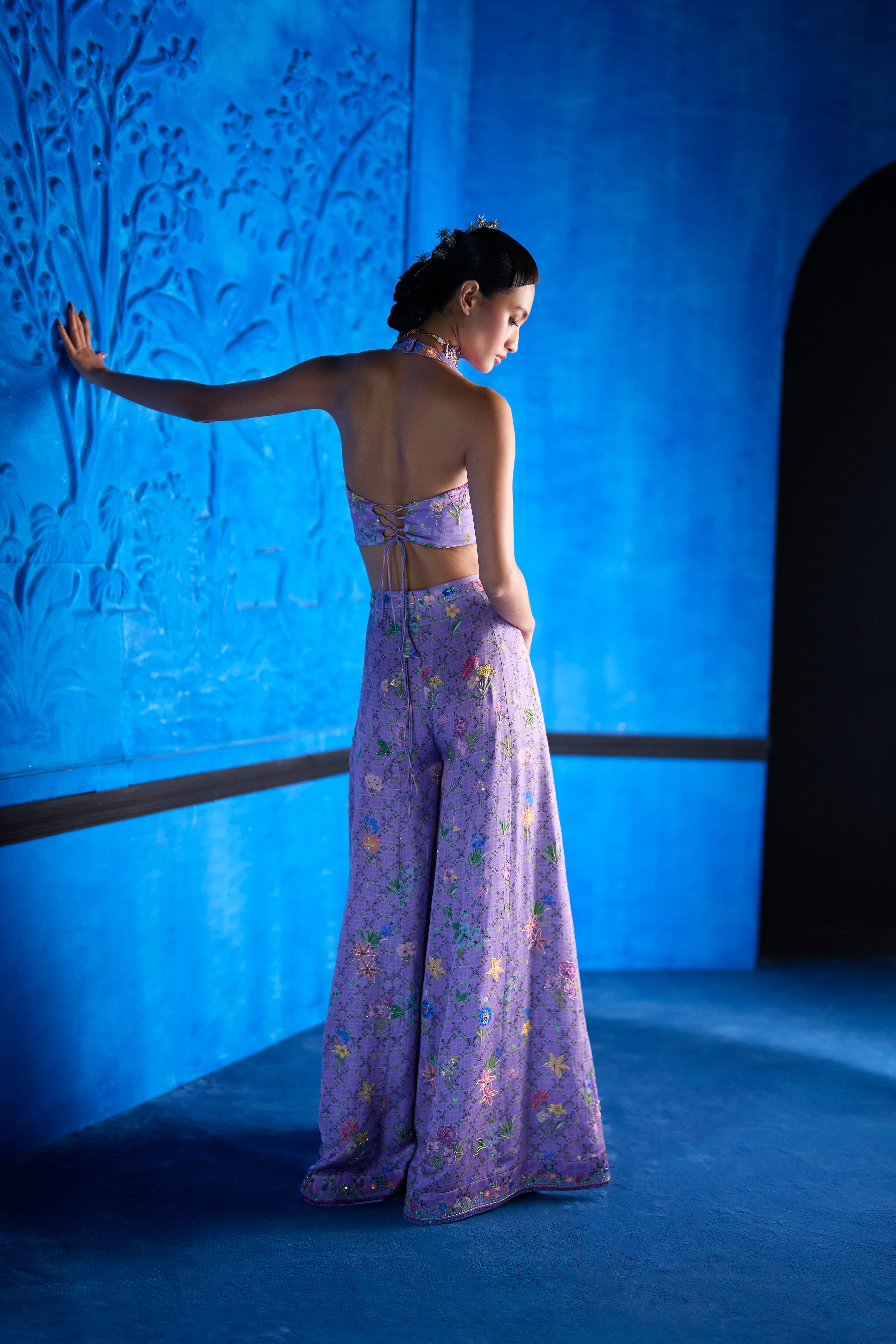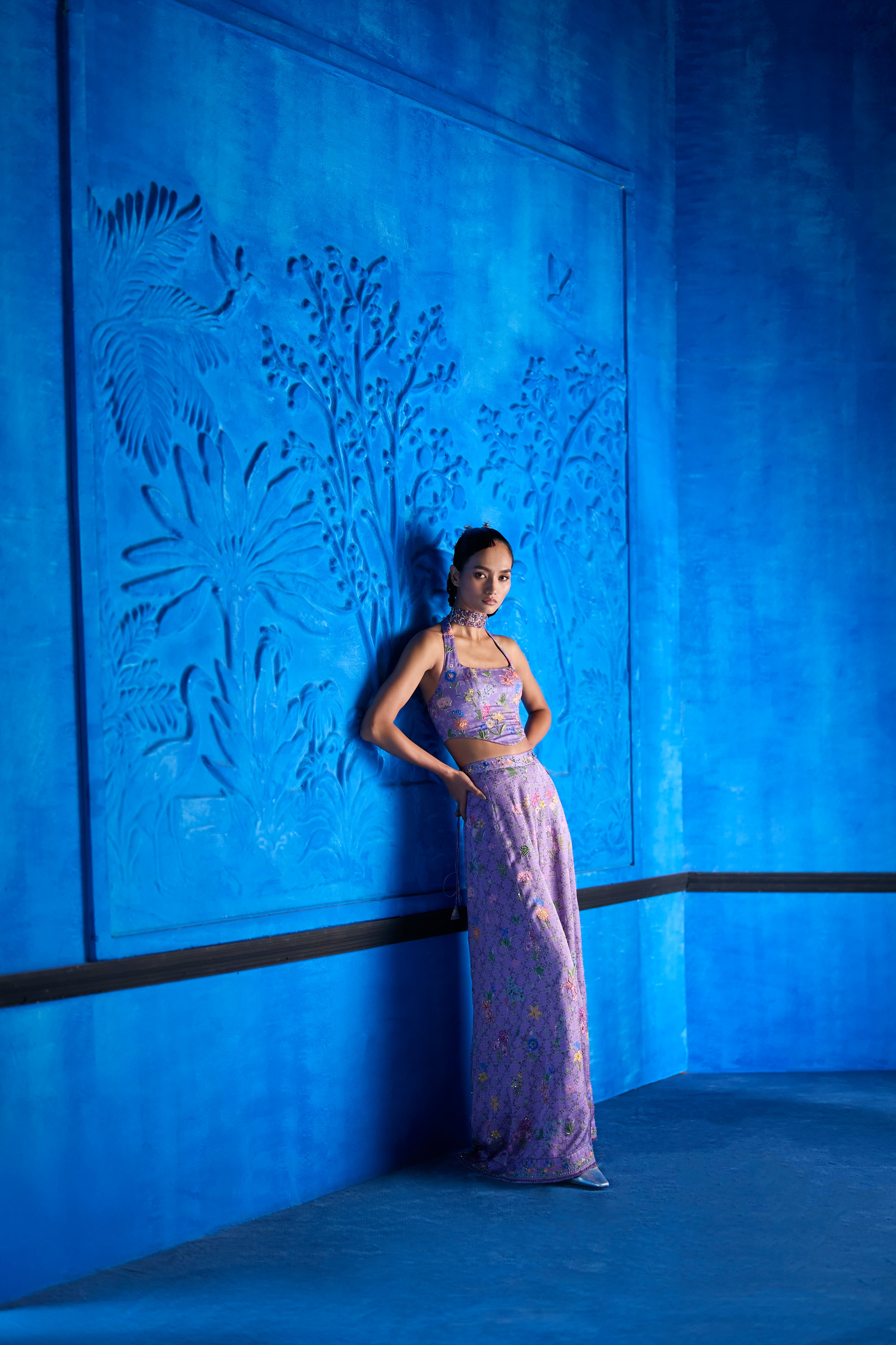 Lilac floral printed embroidered satin dupion sharara. Perfectly complemented by a matching embroidered halter neck corset top