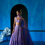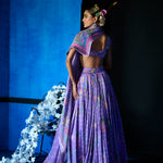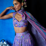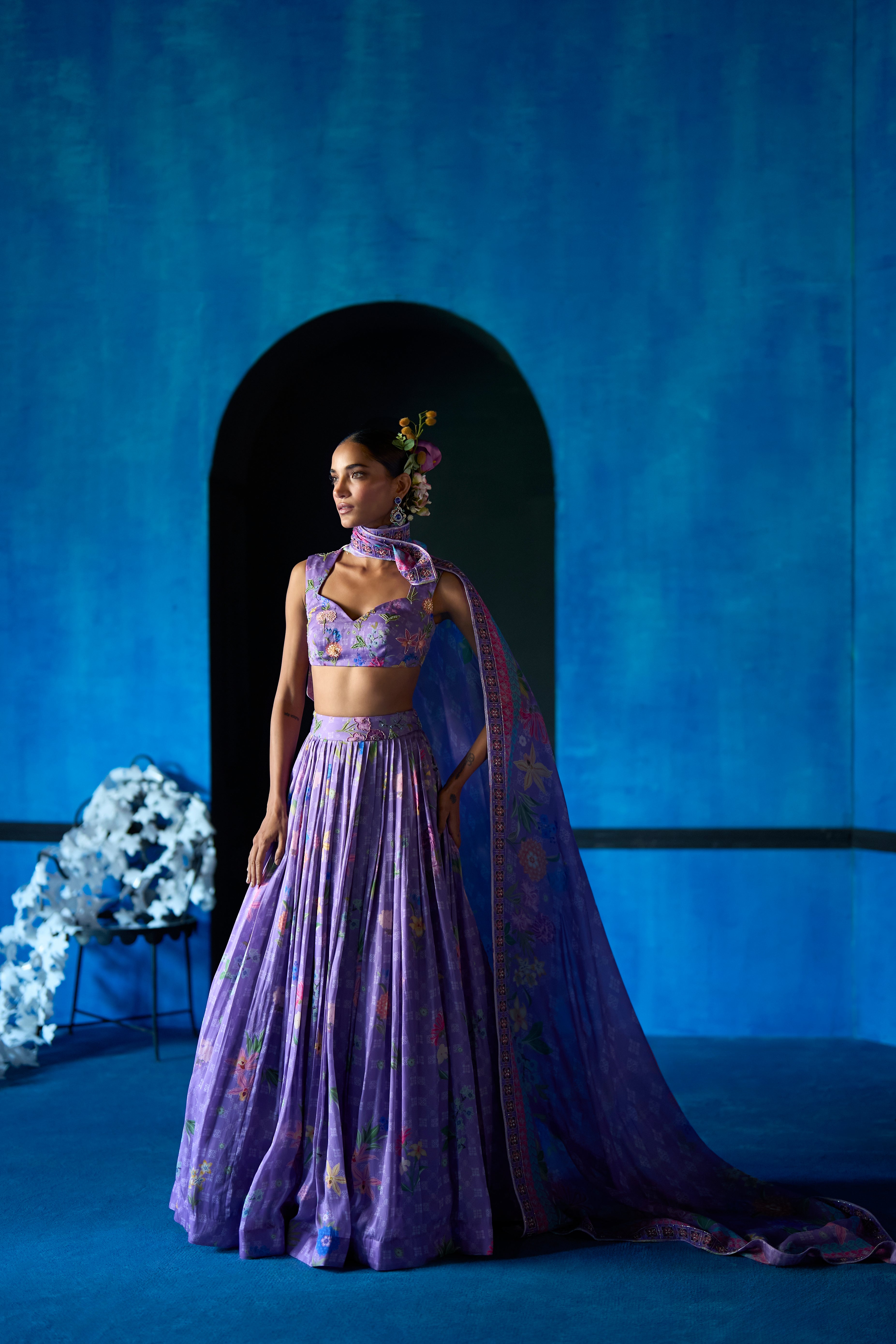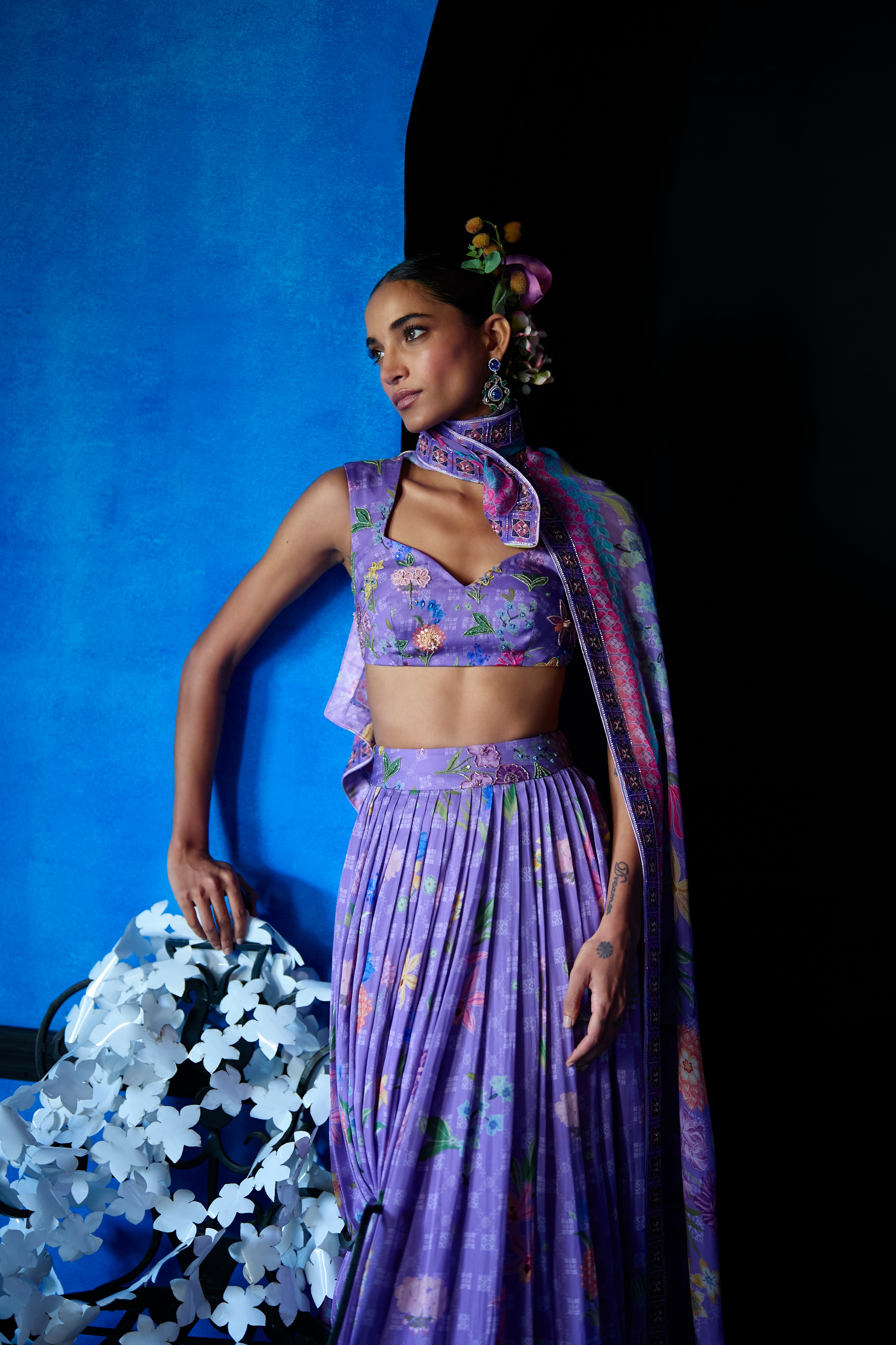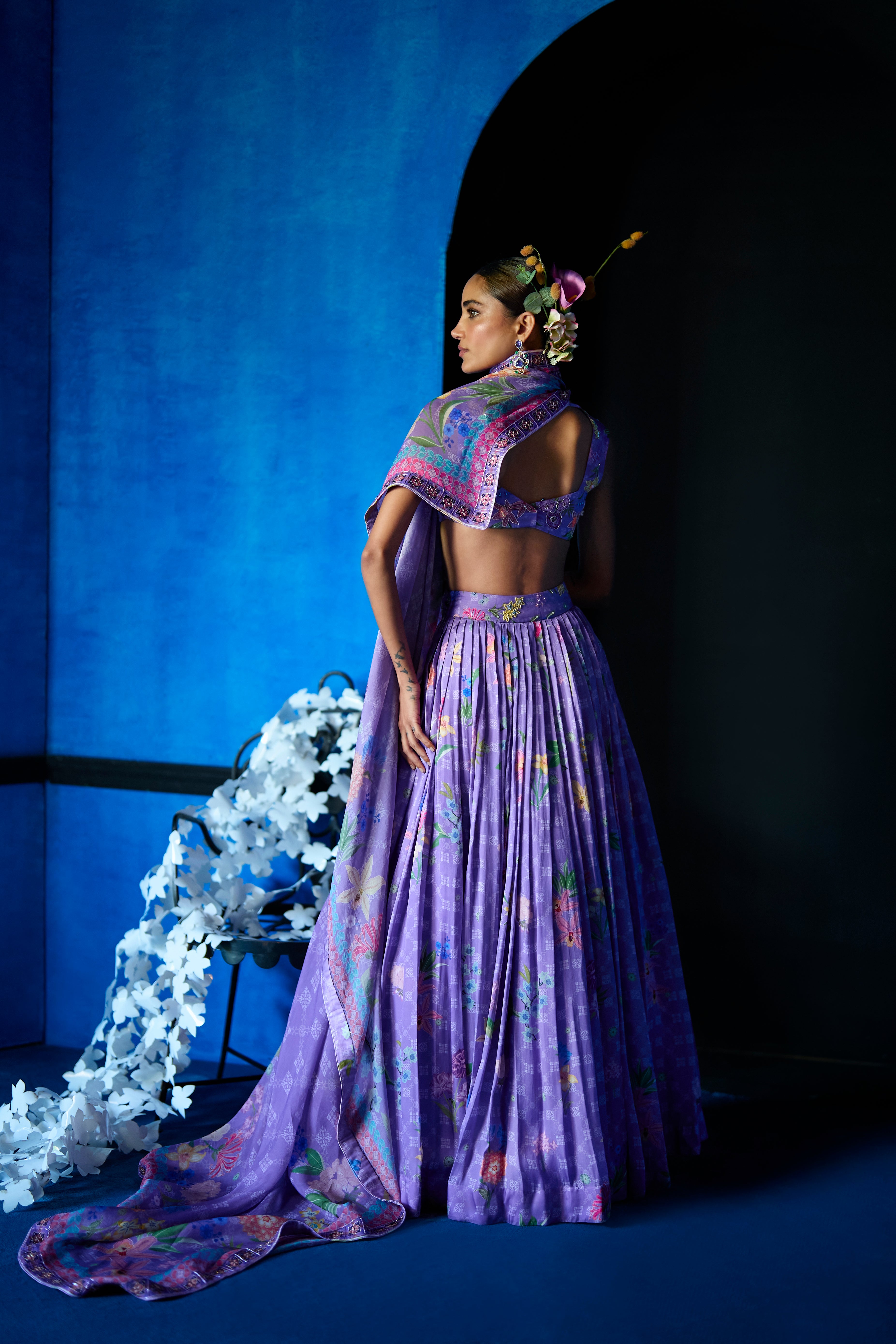 Lilac floral printed knife pleated satin organza lehenga. Paired with matching lilac embroidered sleeveless blouse and floral printed dupatta edged with embroidery.
