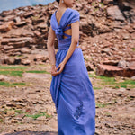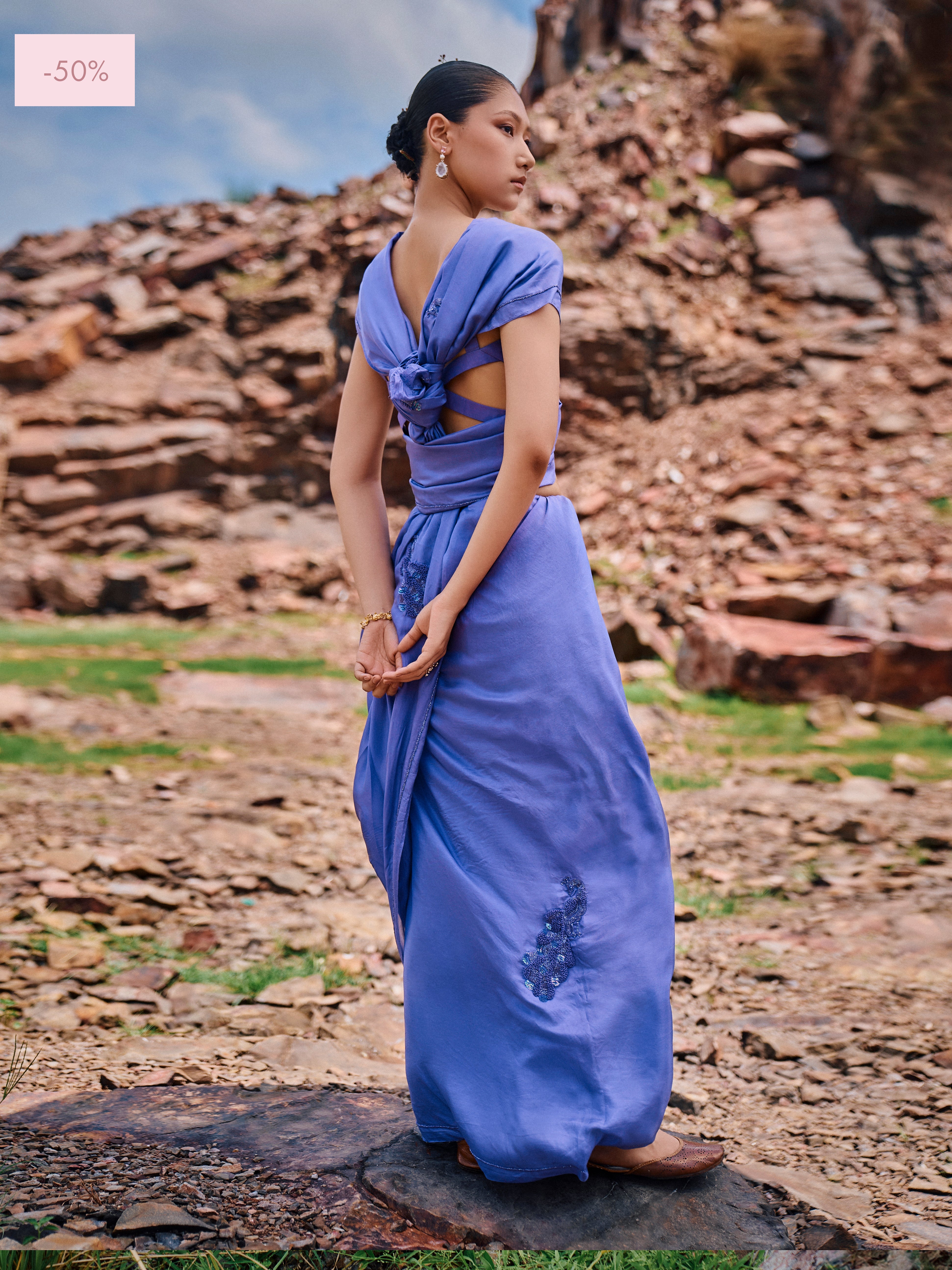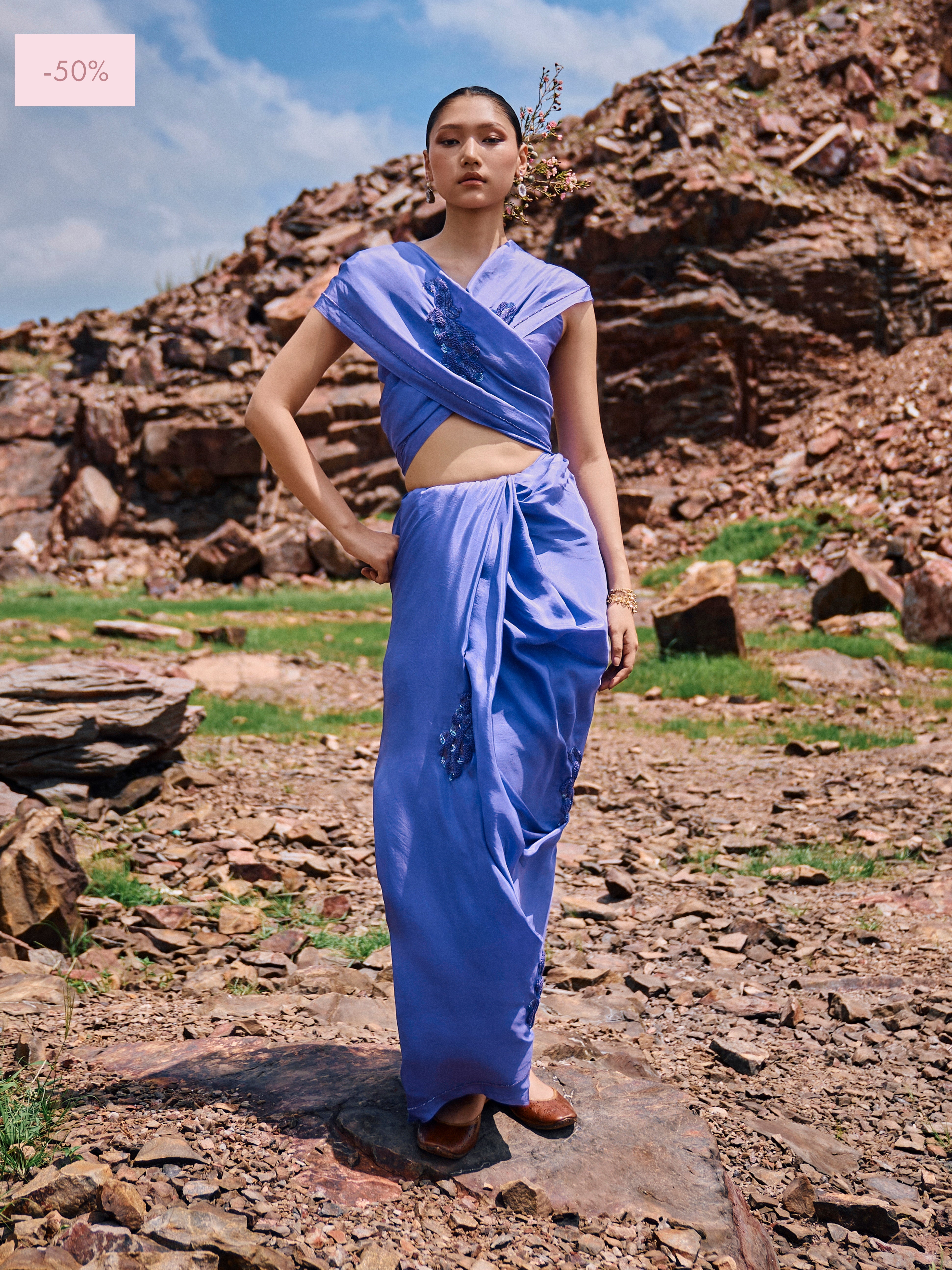 'Maruka' Violet Sari features Hand Embroidered thin border with Purple Peacock Butis all over and is paired with pure silk blouse.