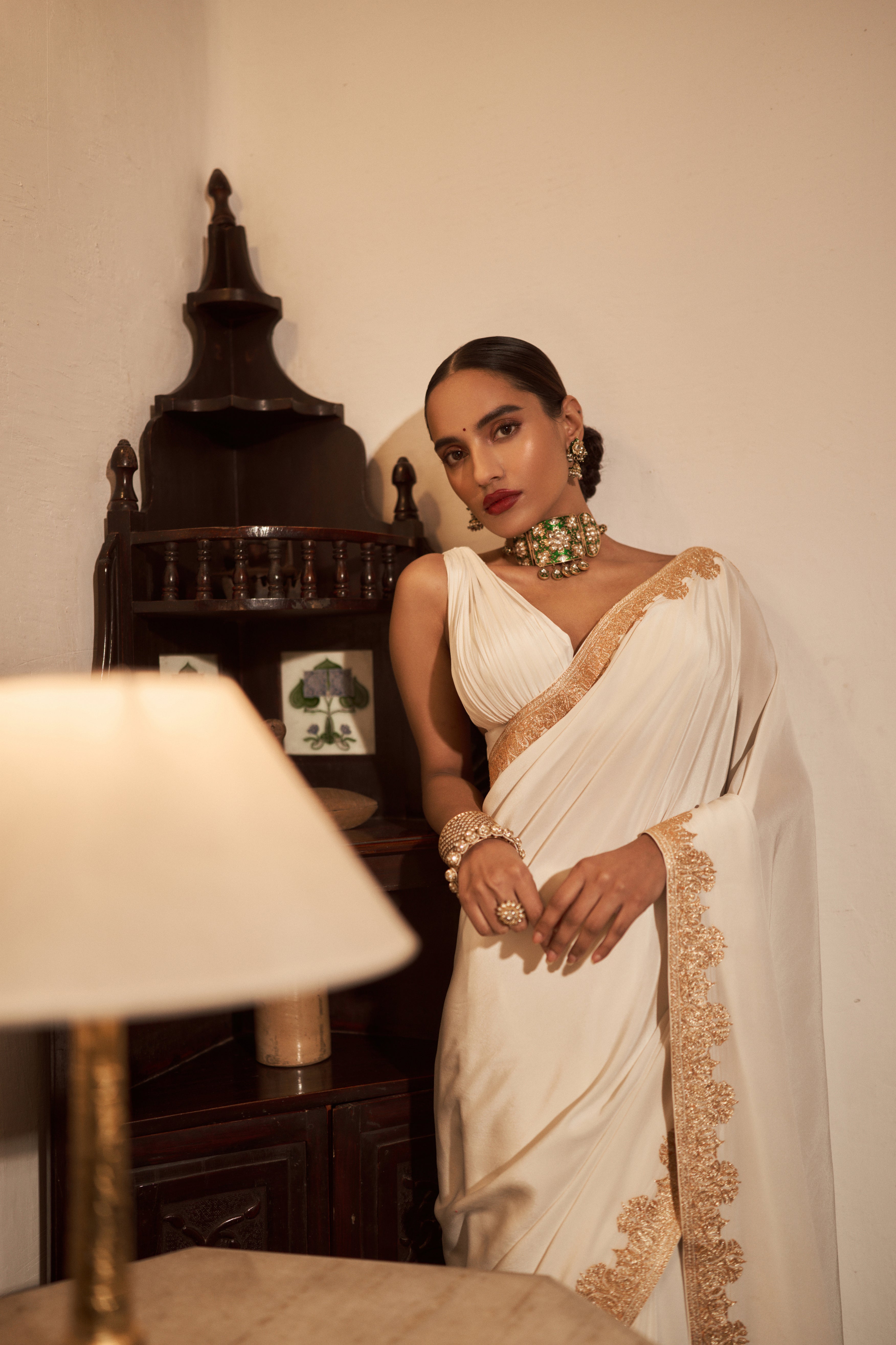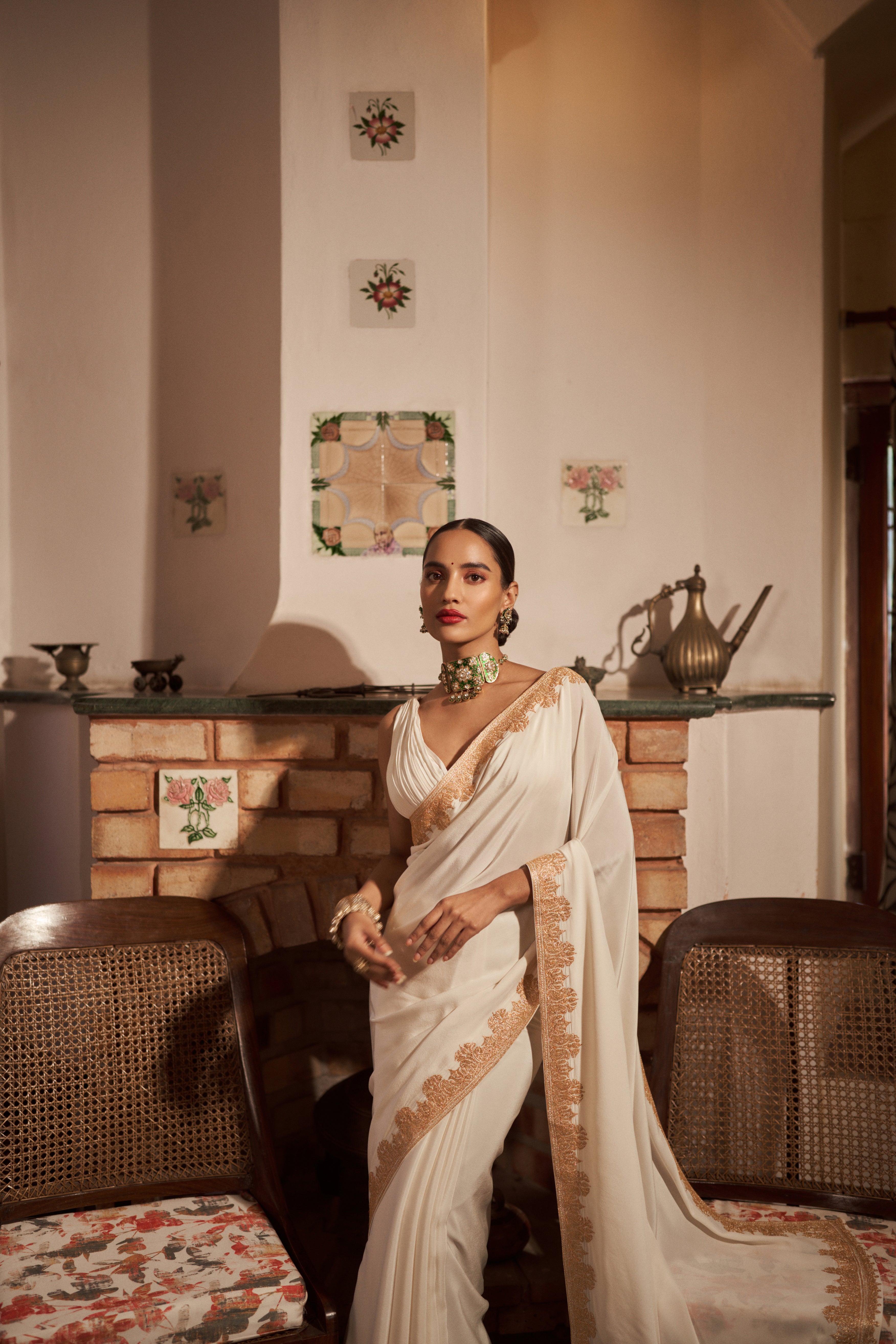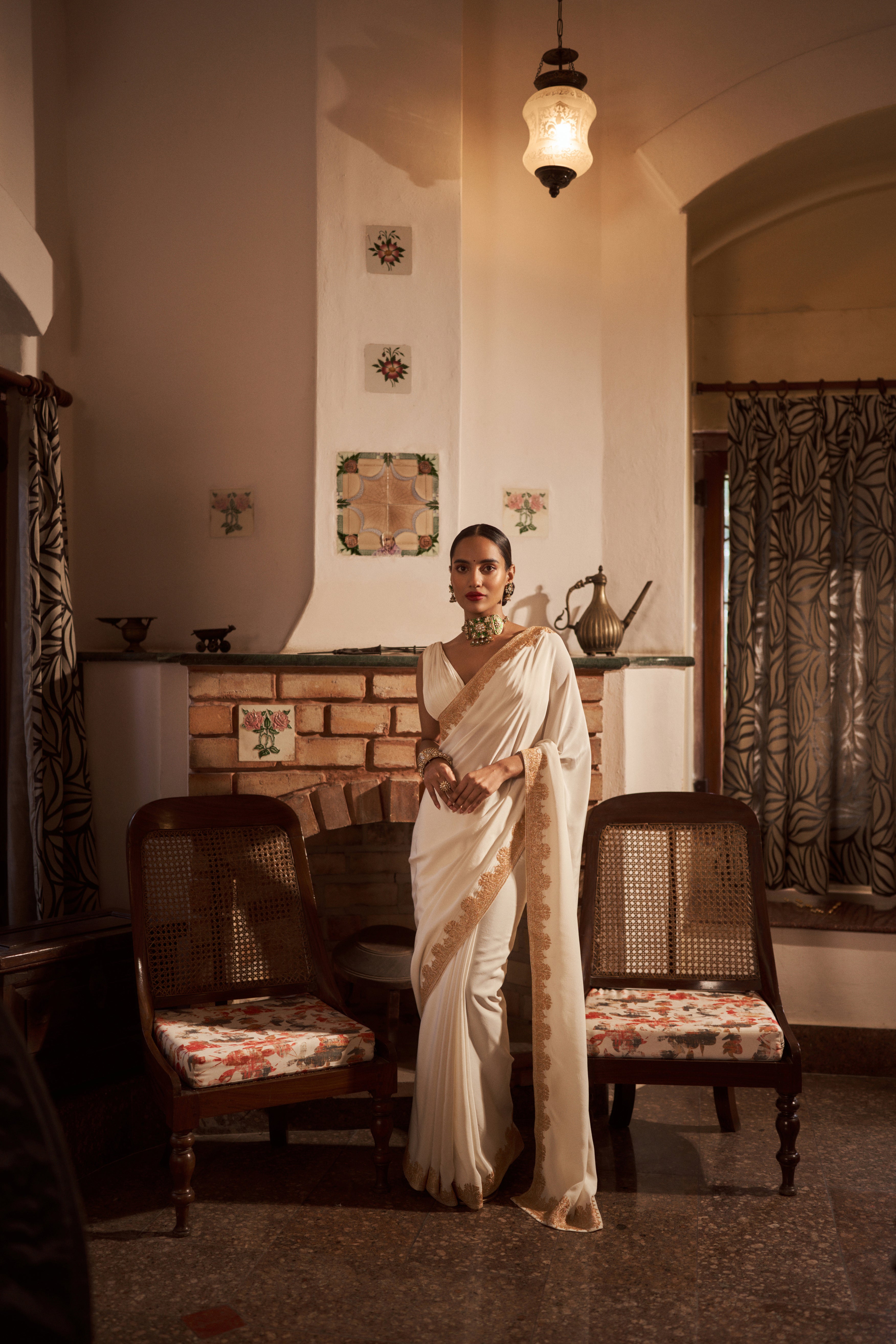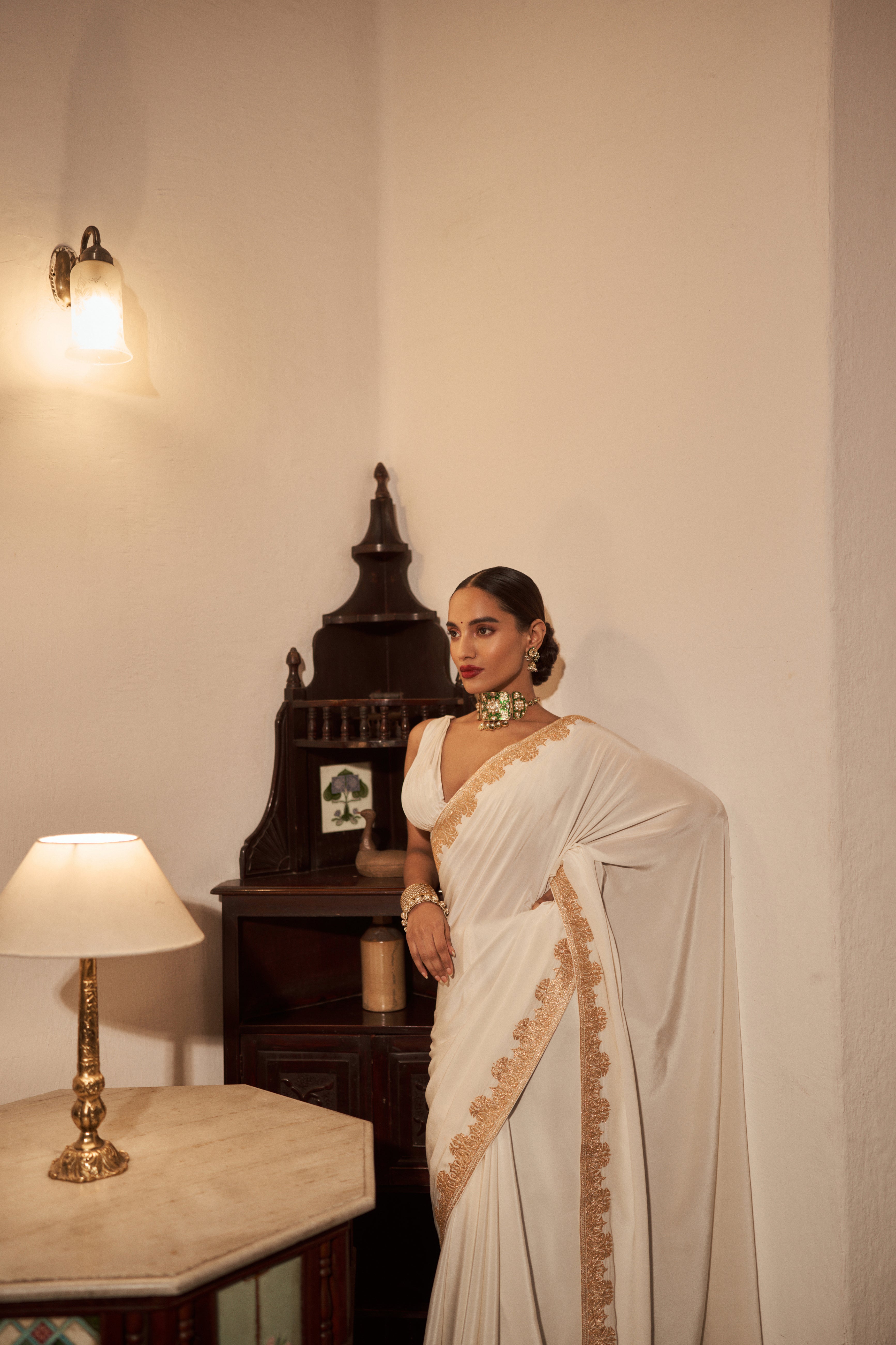 'Mastani' Ivory saree features luminous Hand Embroidered Kashmiri tilla work and is paired with a modern pleated crepe silk blouse.