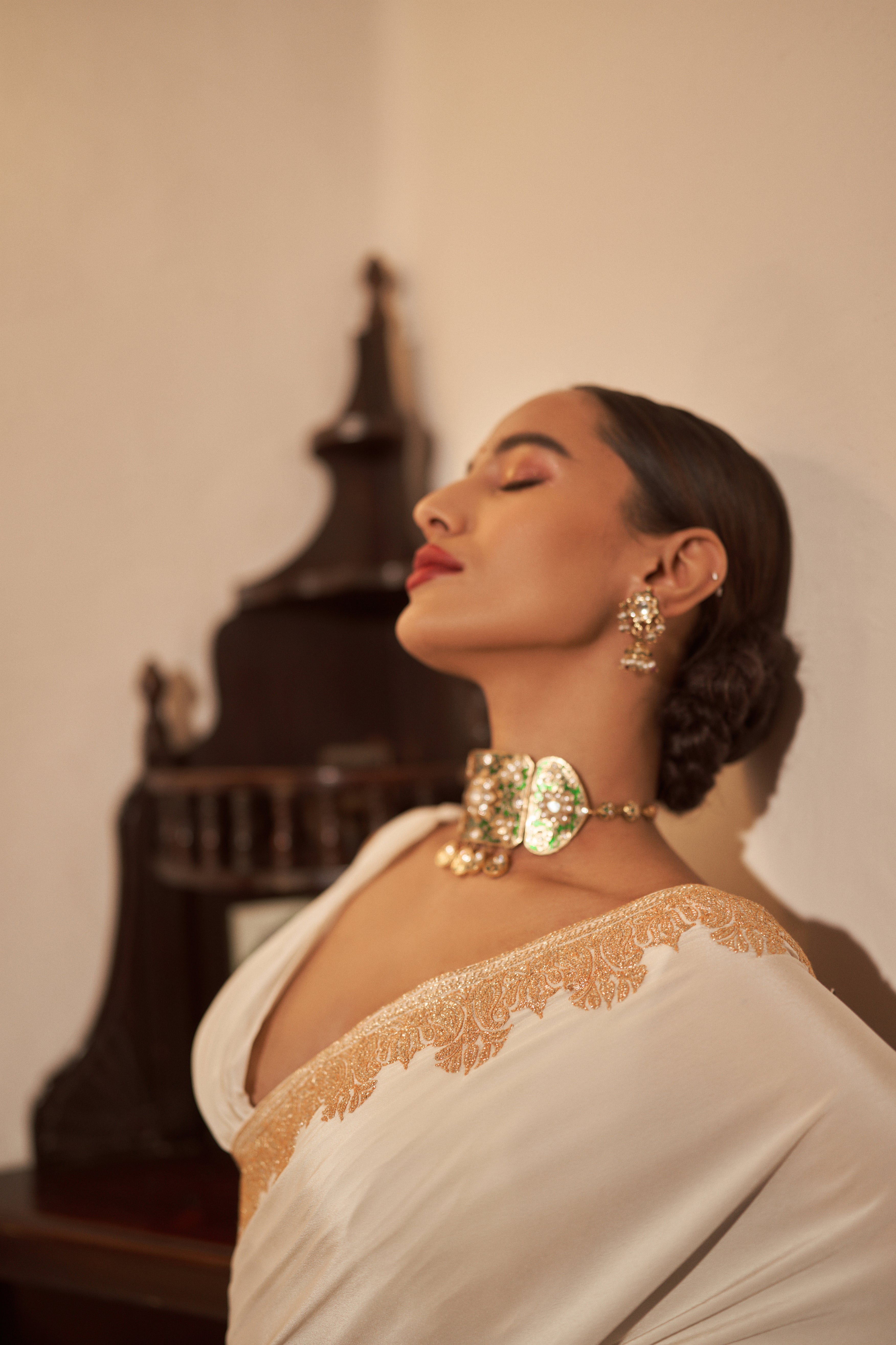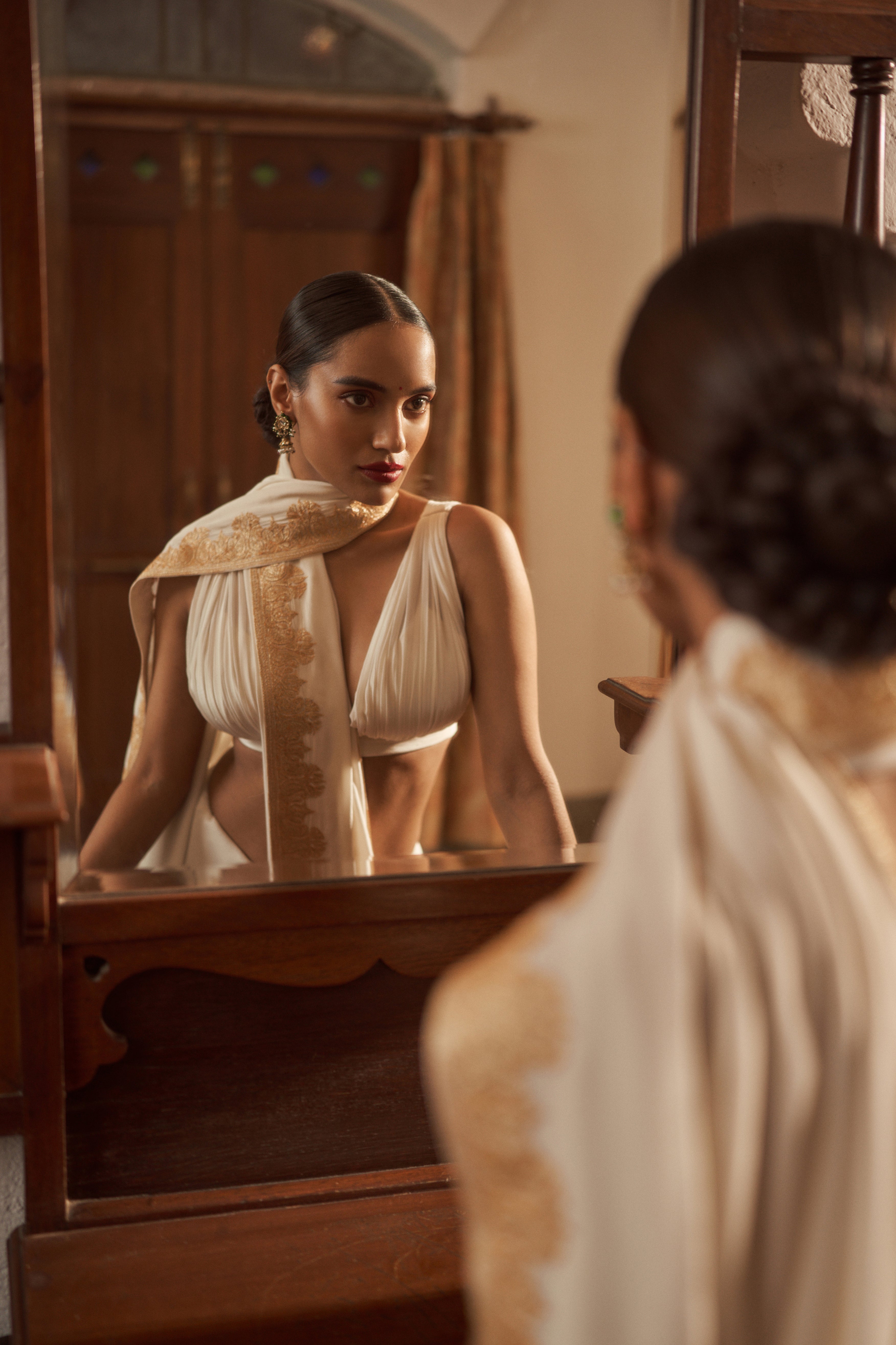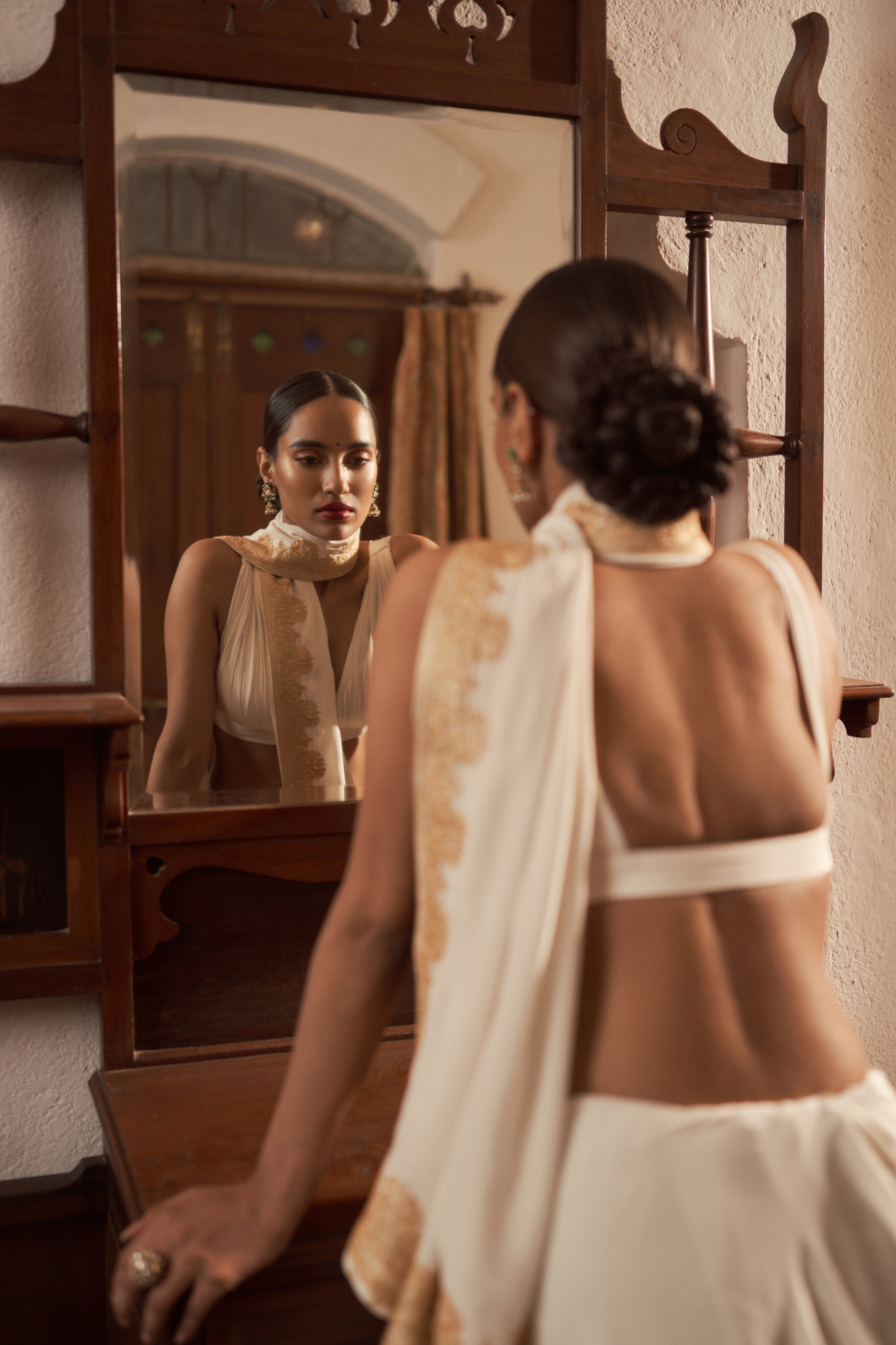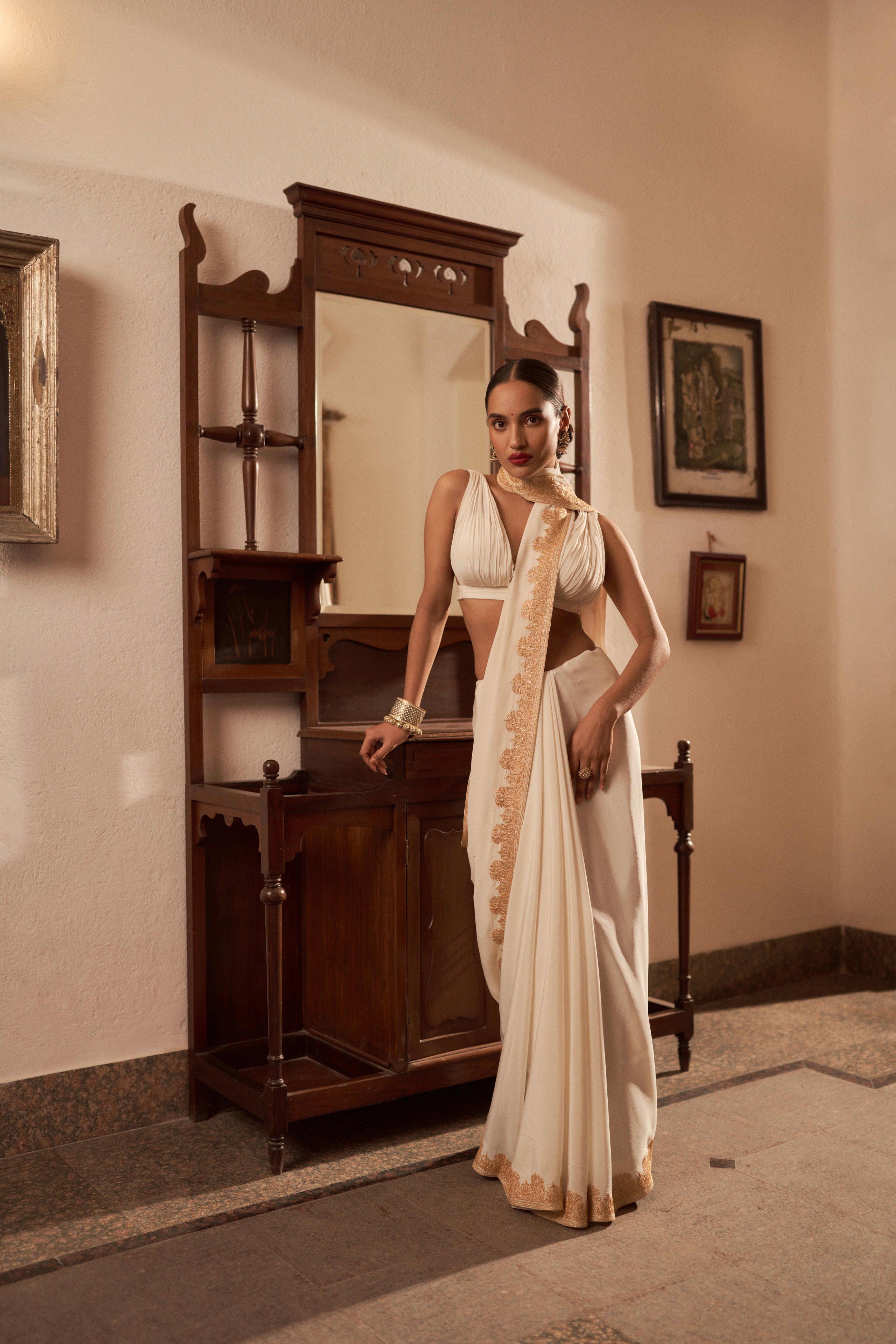 'Mastani' Ivory saree features luminous Hand Embroidered Kashmiri tilla work and is paired with a modern pleated crepe silk blouse.
