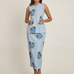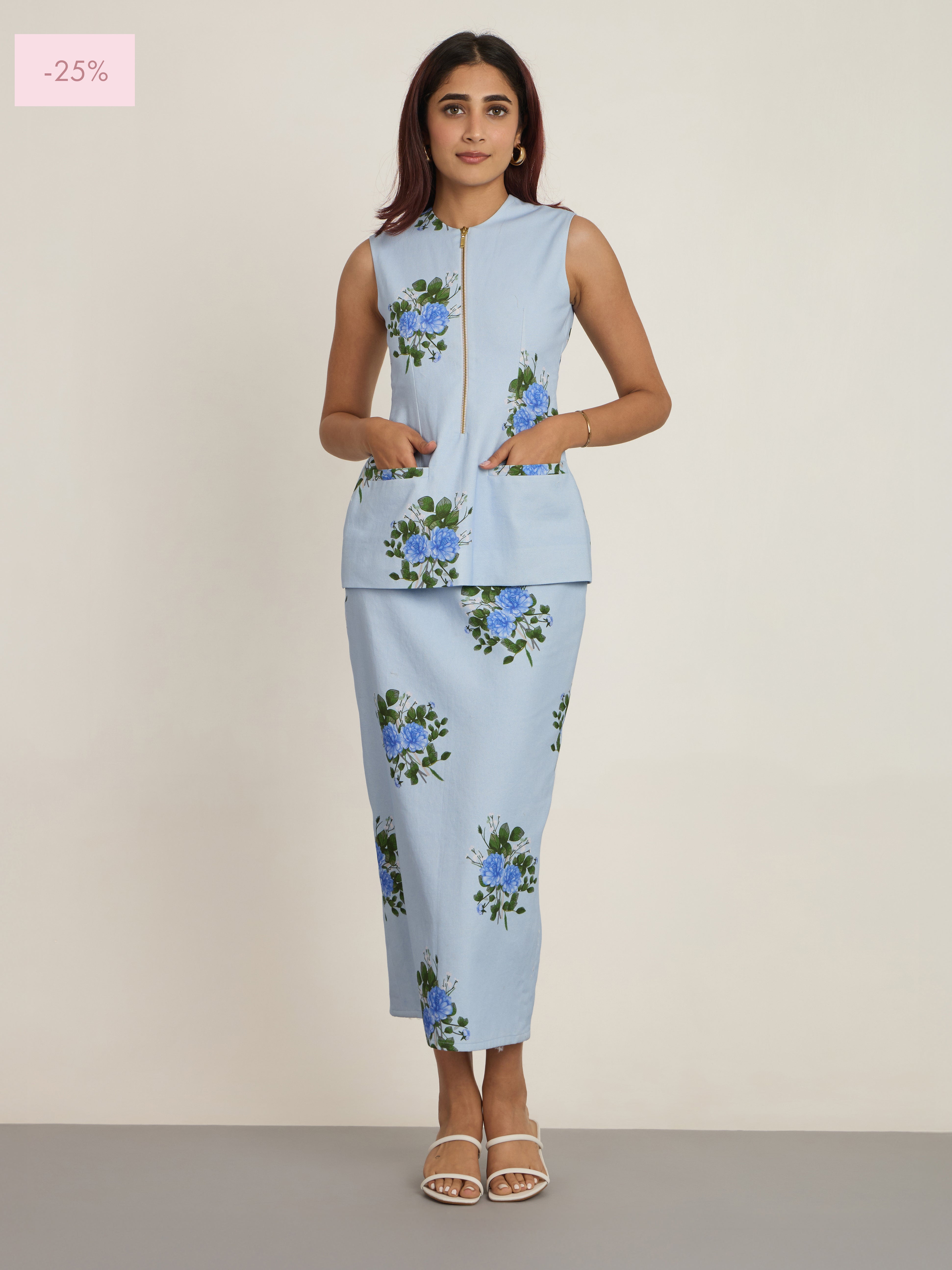 'Mavi' light blue half zip-up front and flares slightly below the waist floral printed top with matching floral printed pencil skirt