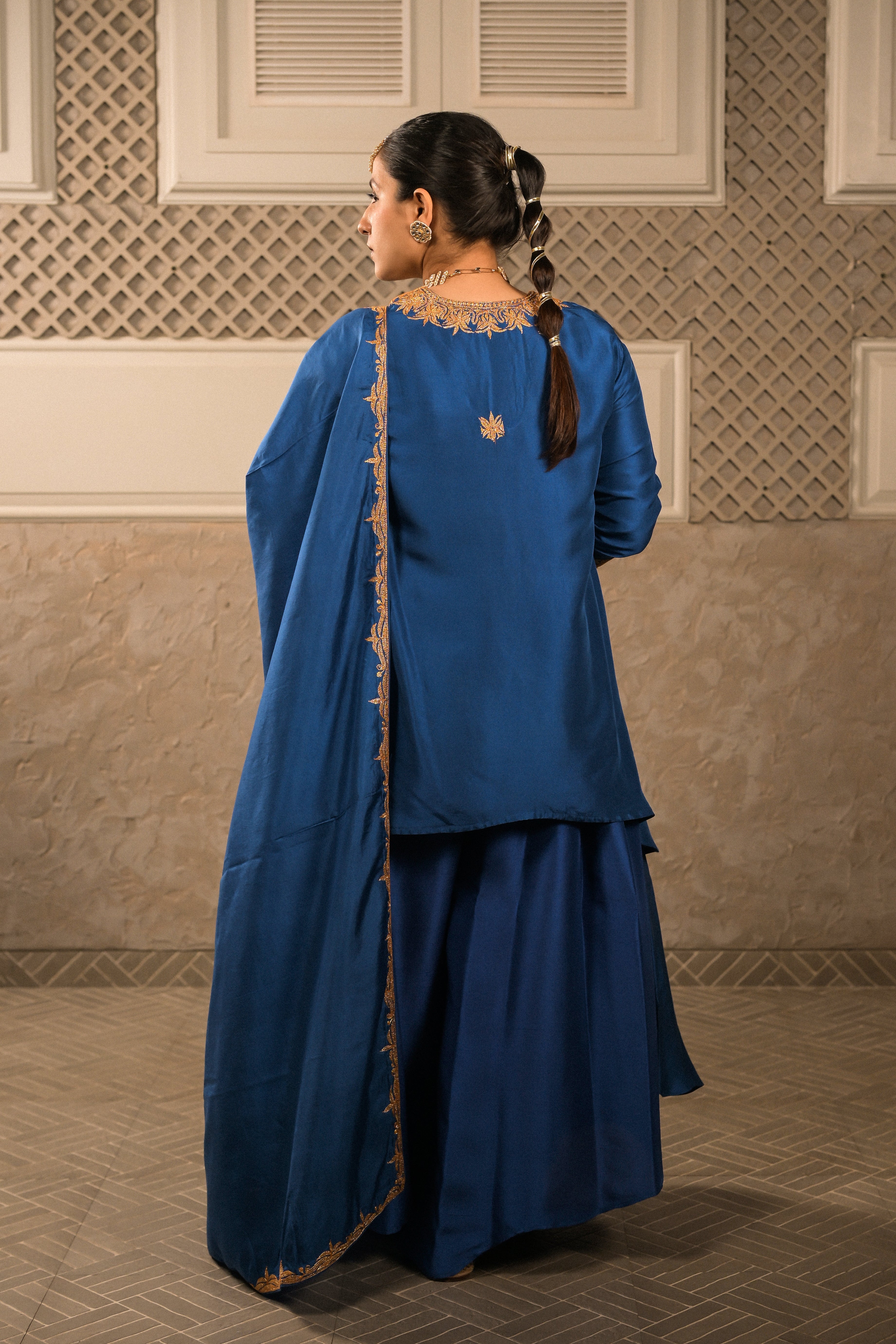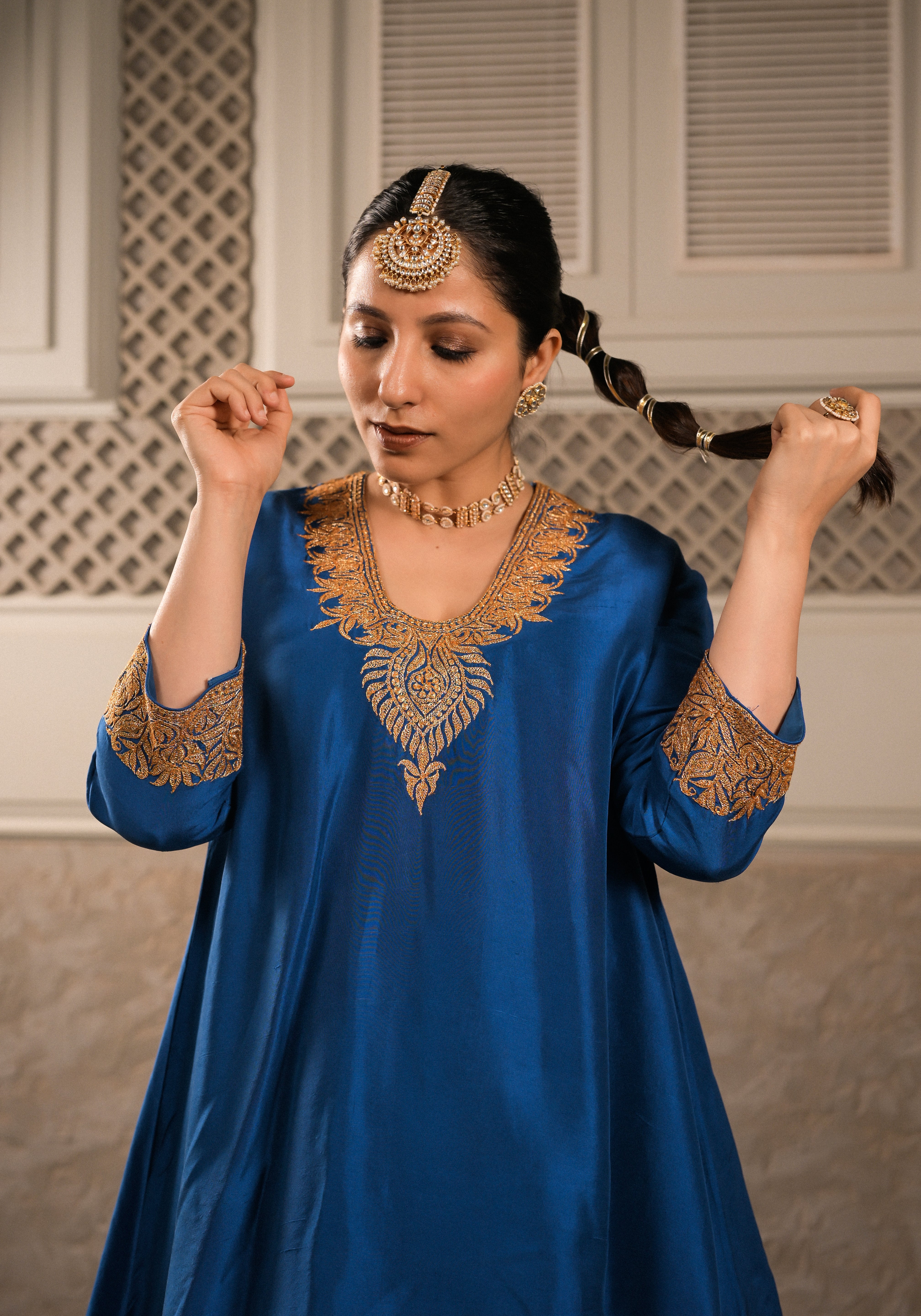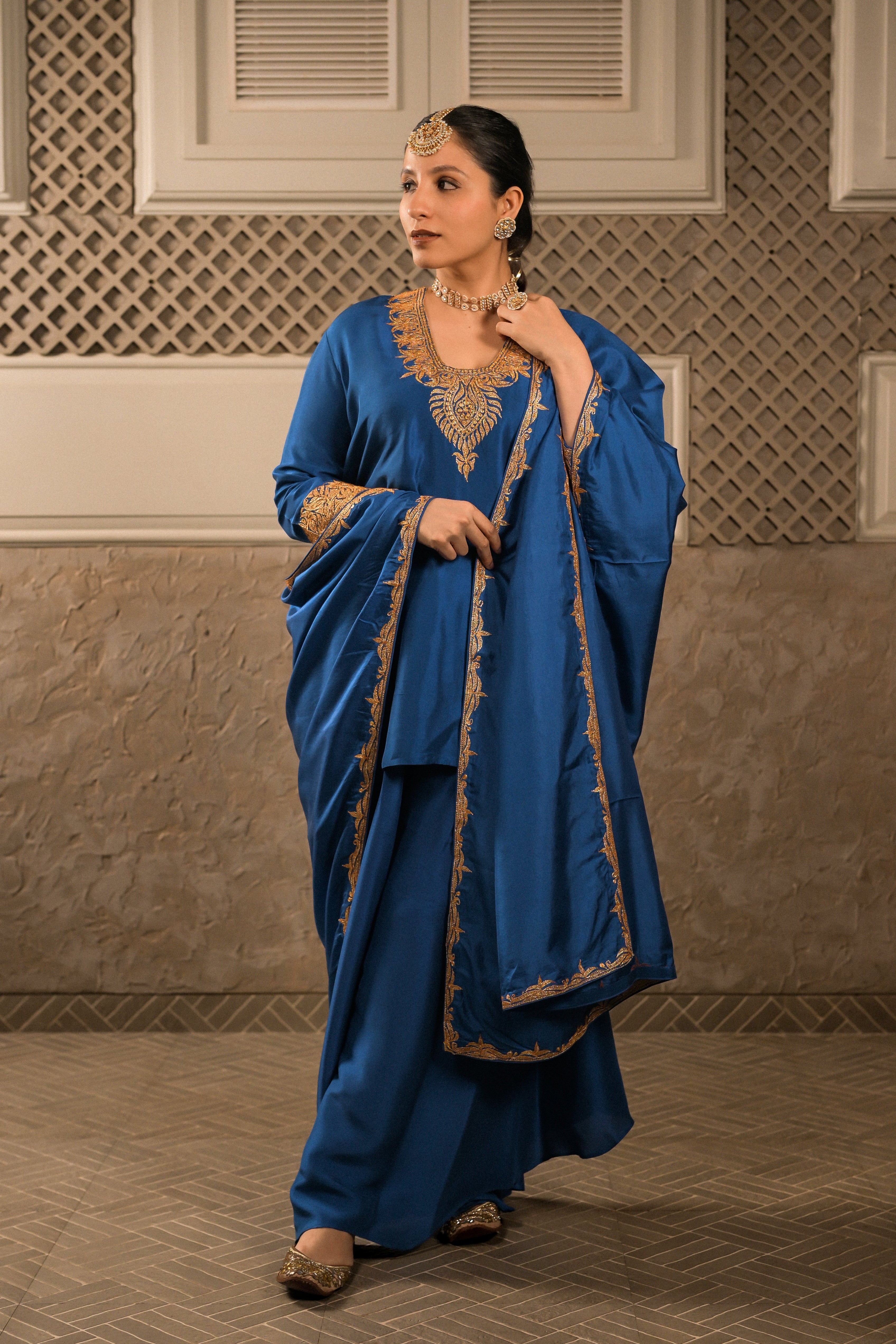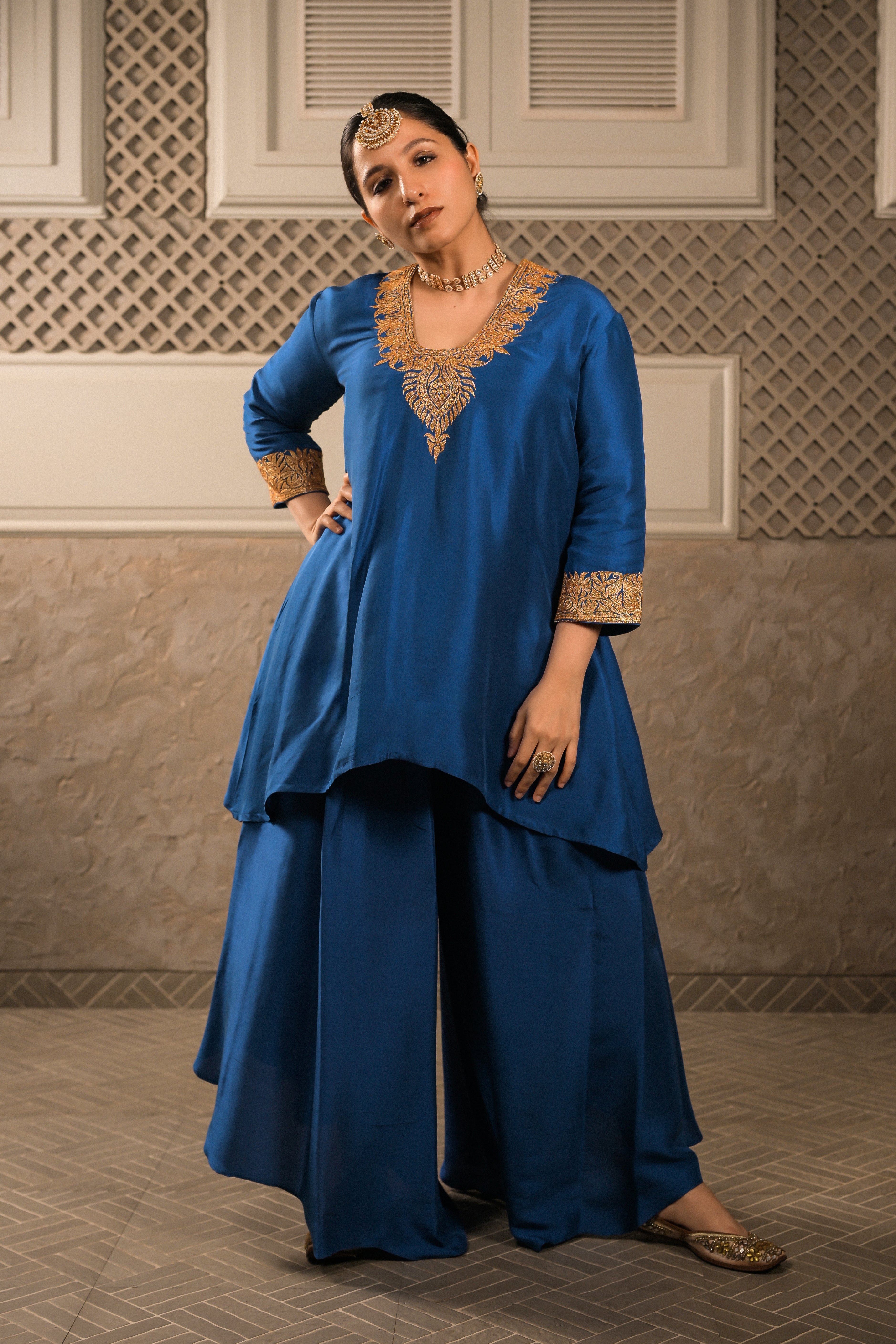 ‘Smera' Royal Blue kurta with high low palazzo pants crafted from Dupion Silk features intricate hand embroidered Kashmiri tilla embroidery. It is paired with matching silk royal blue dupatta.