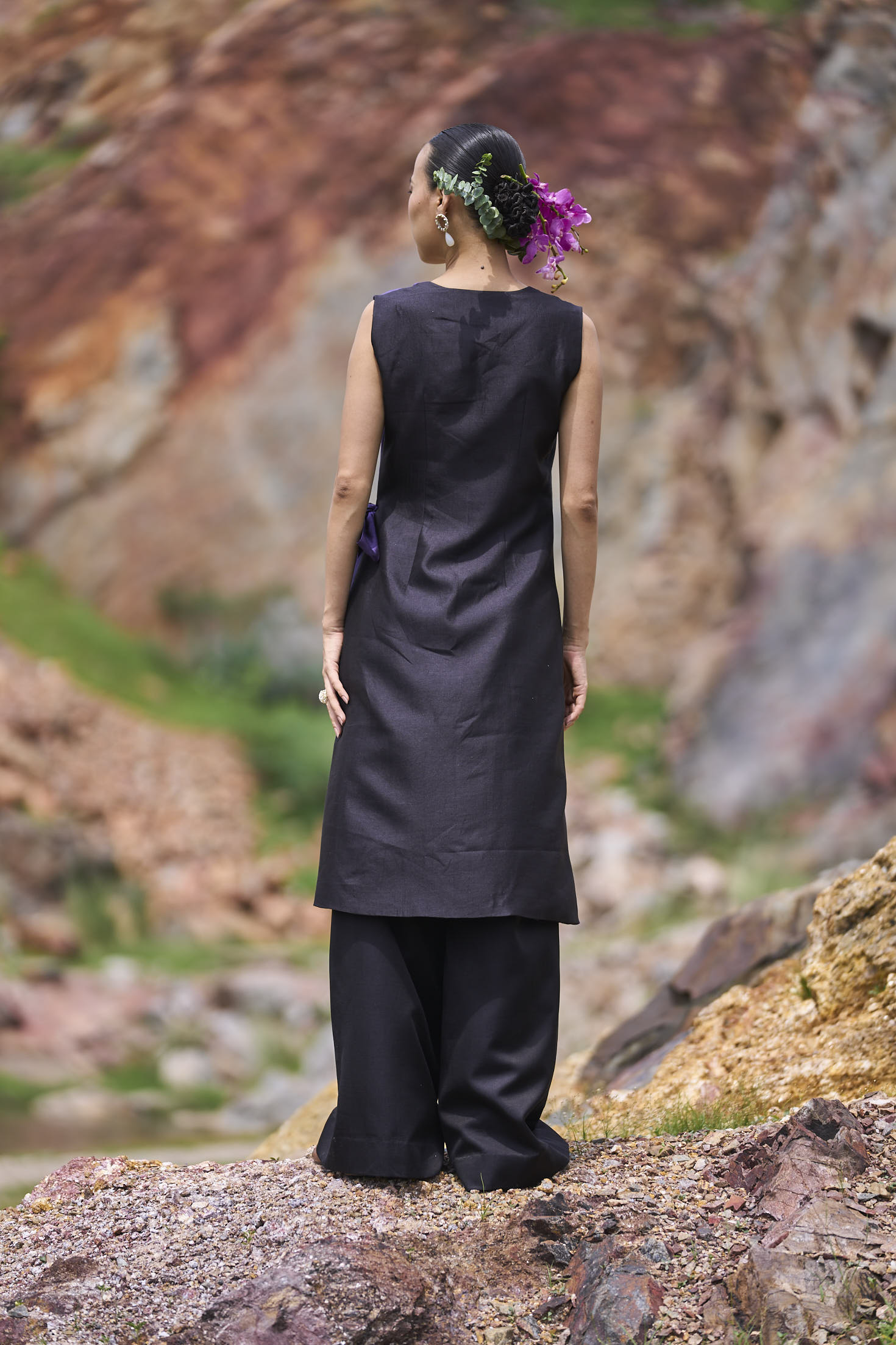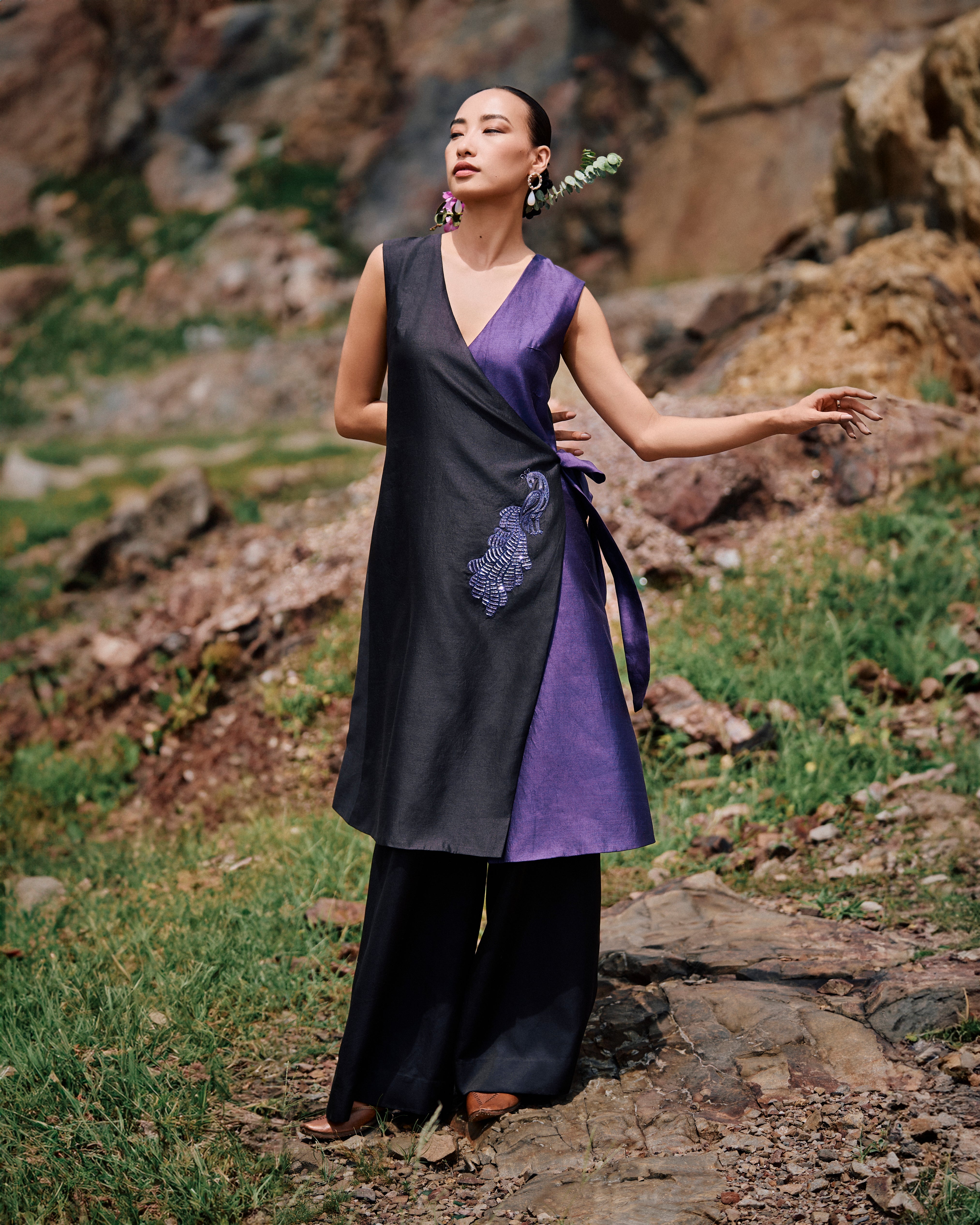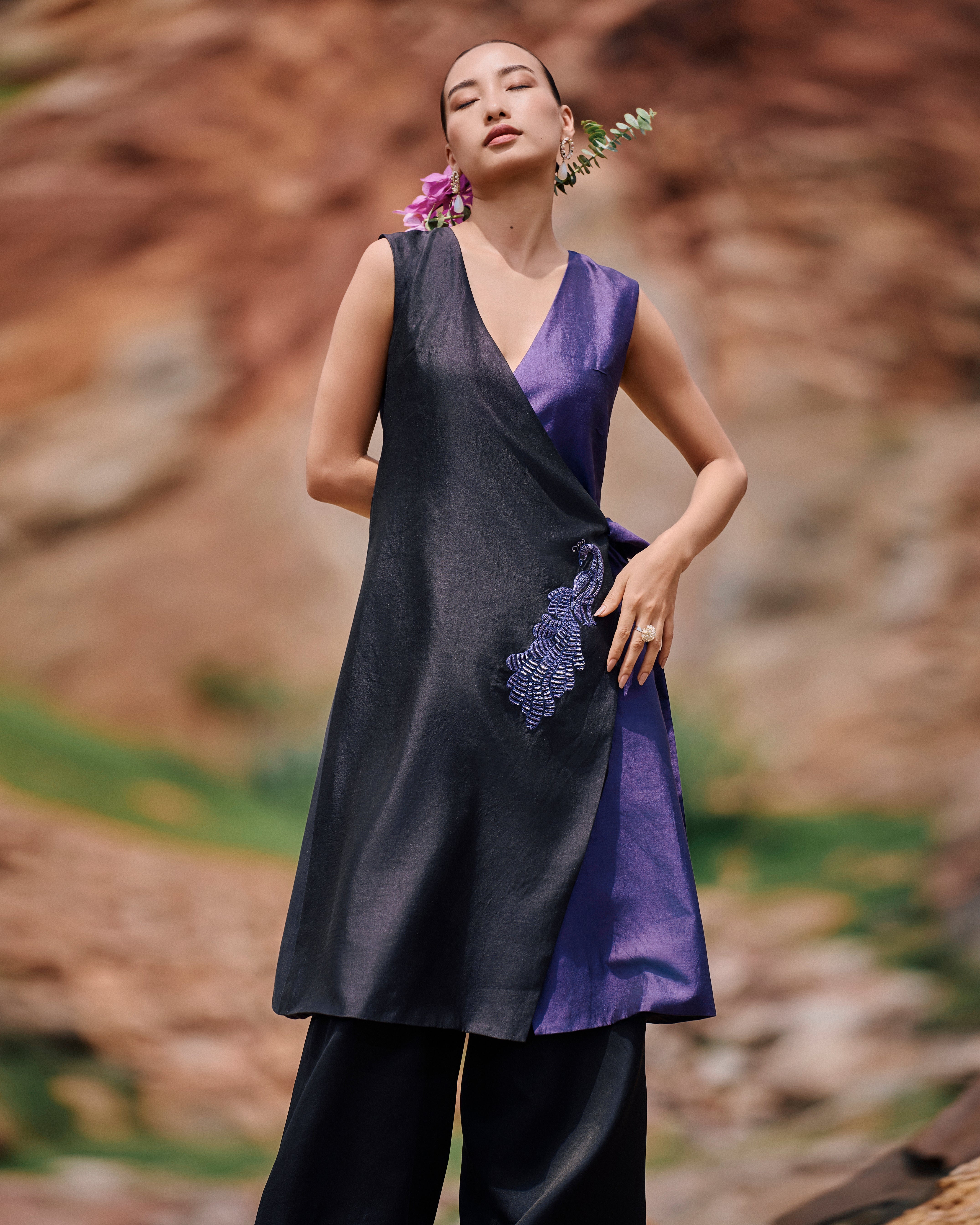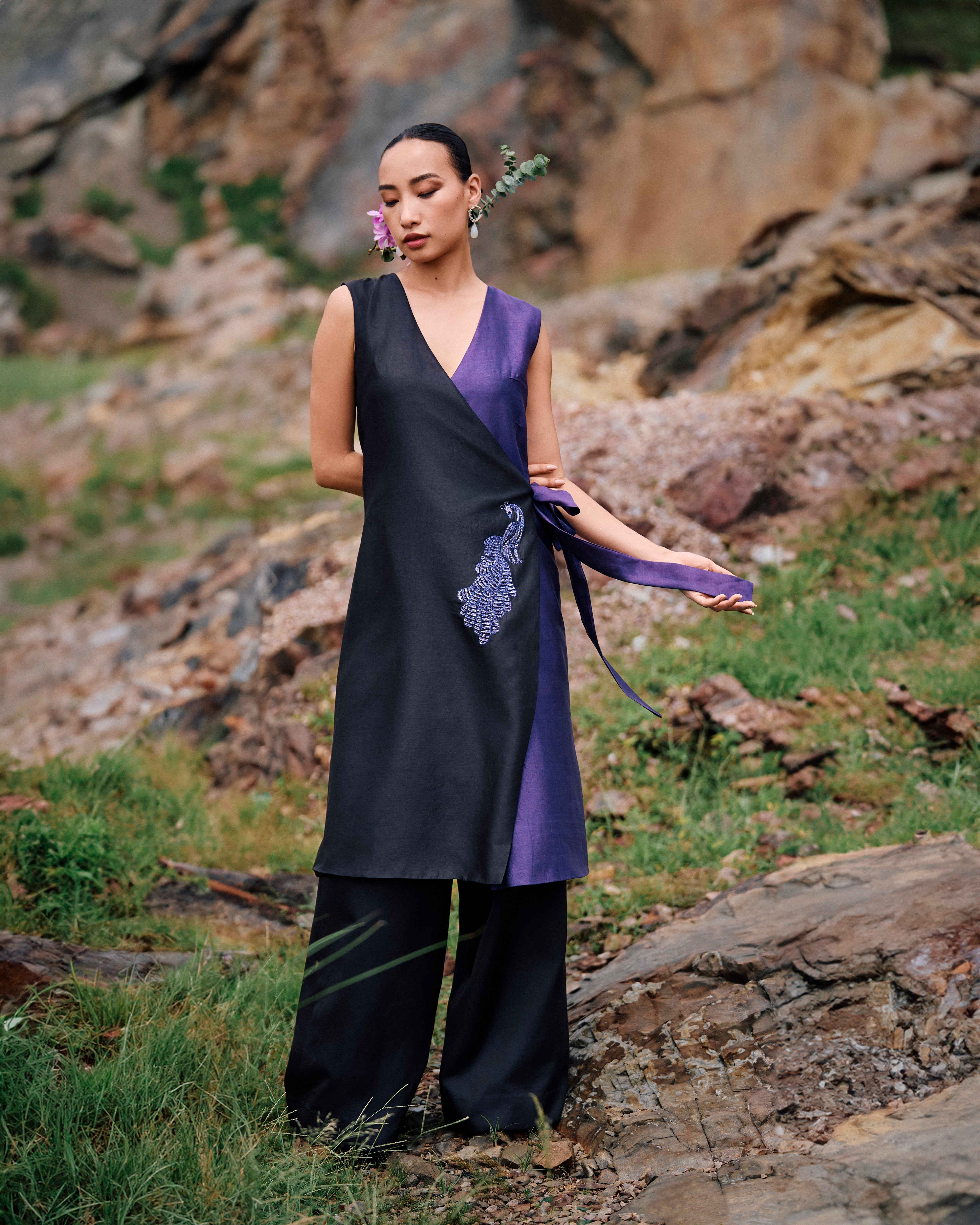 Tie up Katan silk 'Moira' Purple and black kurta features hand embroidered Purple Peacock motif and is paired with matching Black Katan Silk 'Vibha' pants.