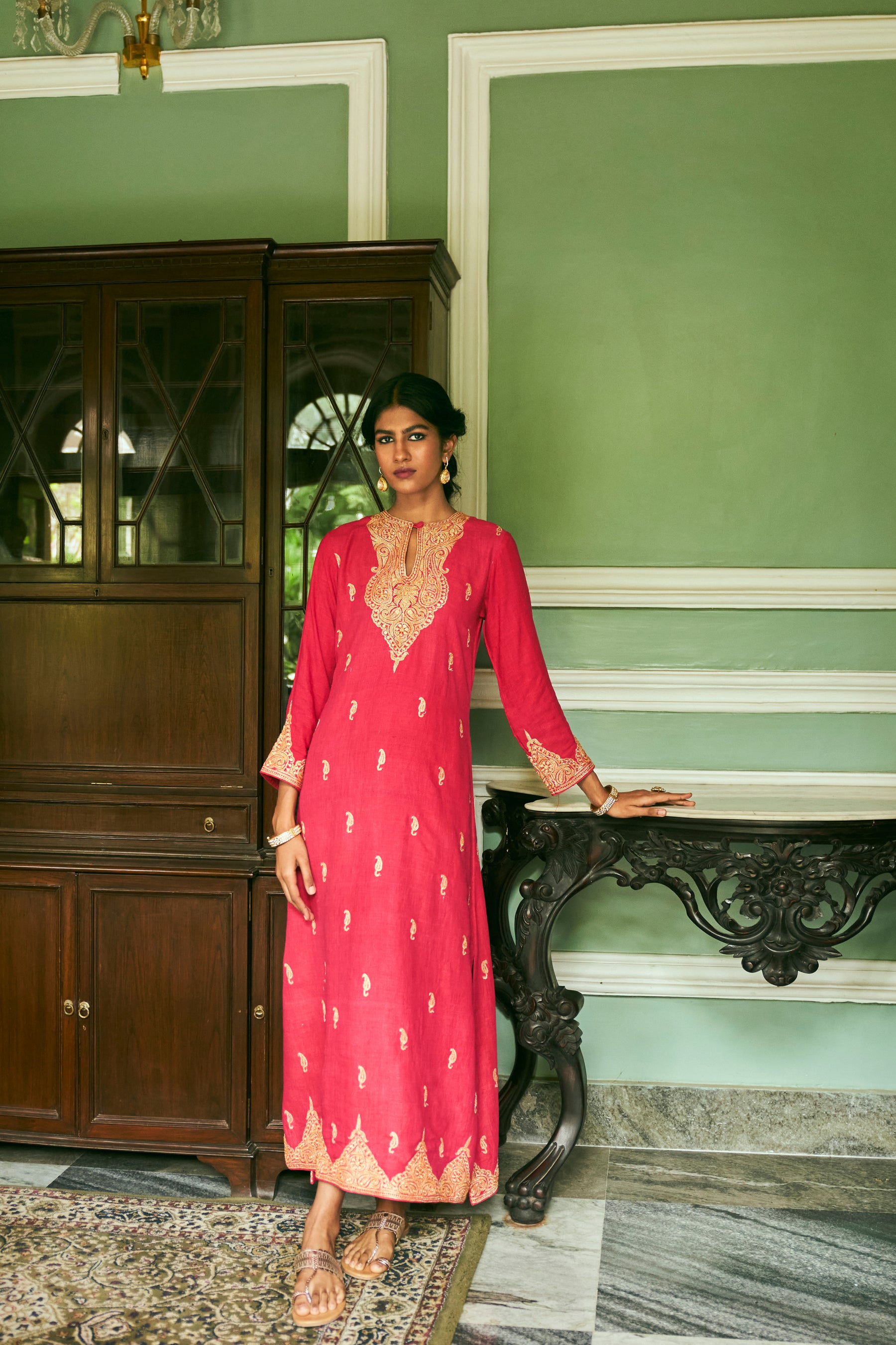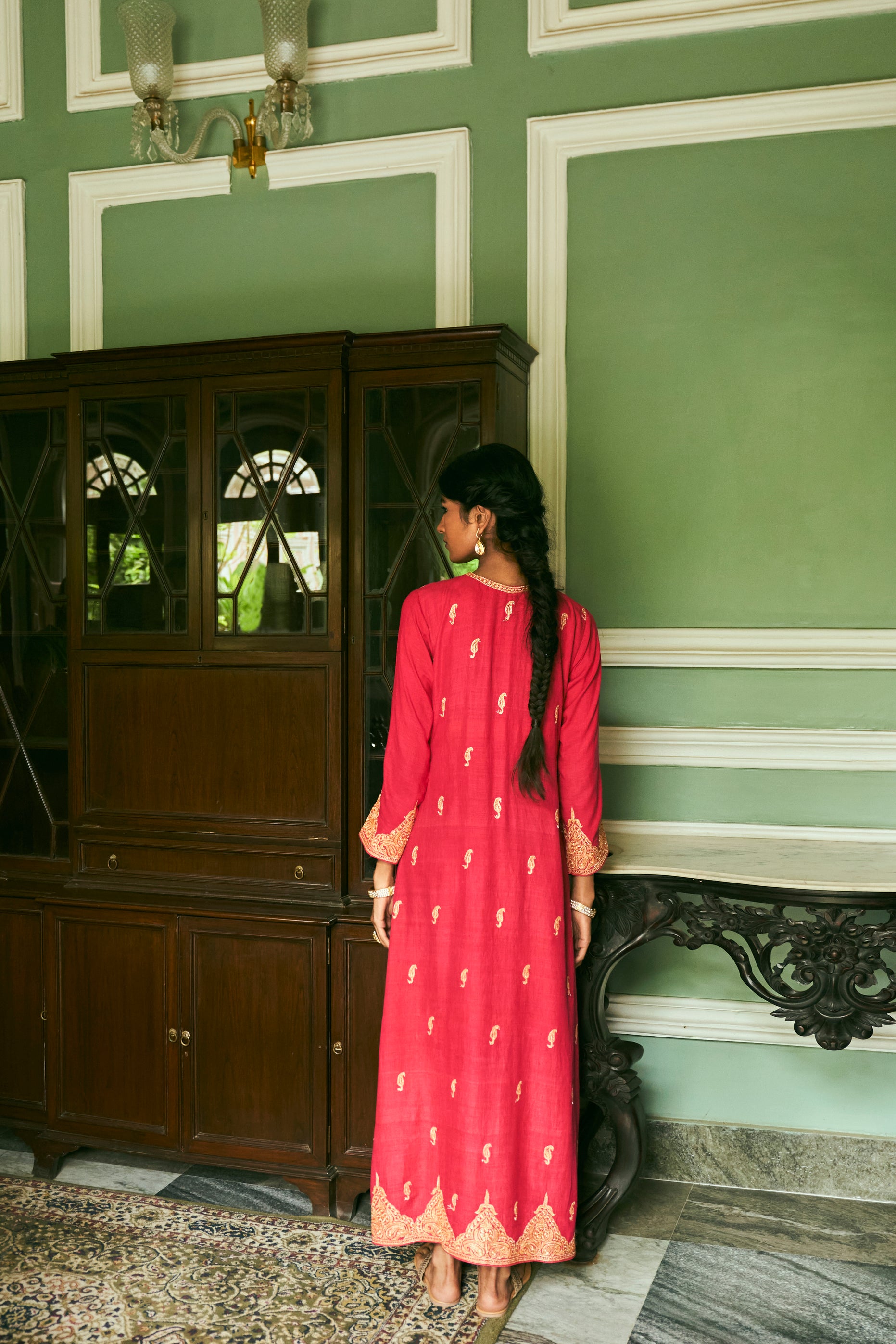 ‘Naaz’ Crimson Red Kaftan crafted from luxurious Matka Silk features traditional mango motifs all-over, complemented by exquisite artistry of Kashmiri tilla work at the neck, border and sleeves.