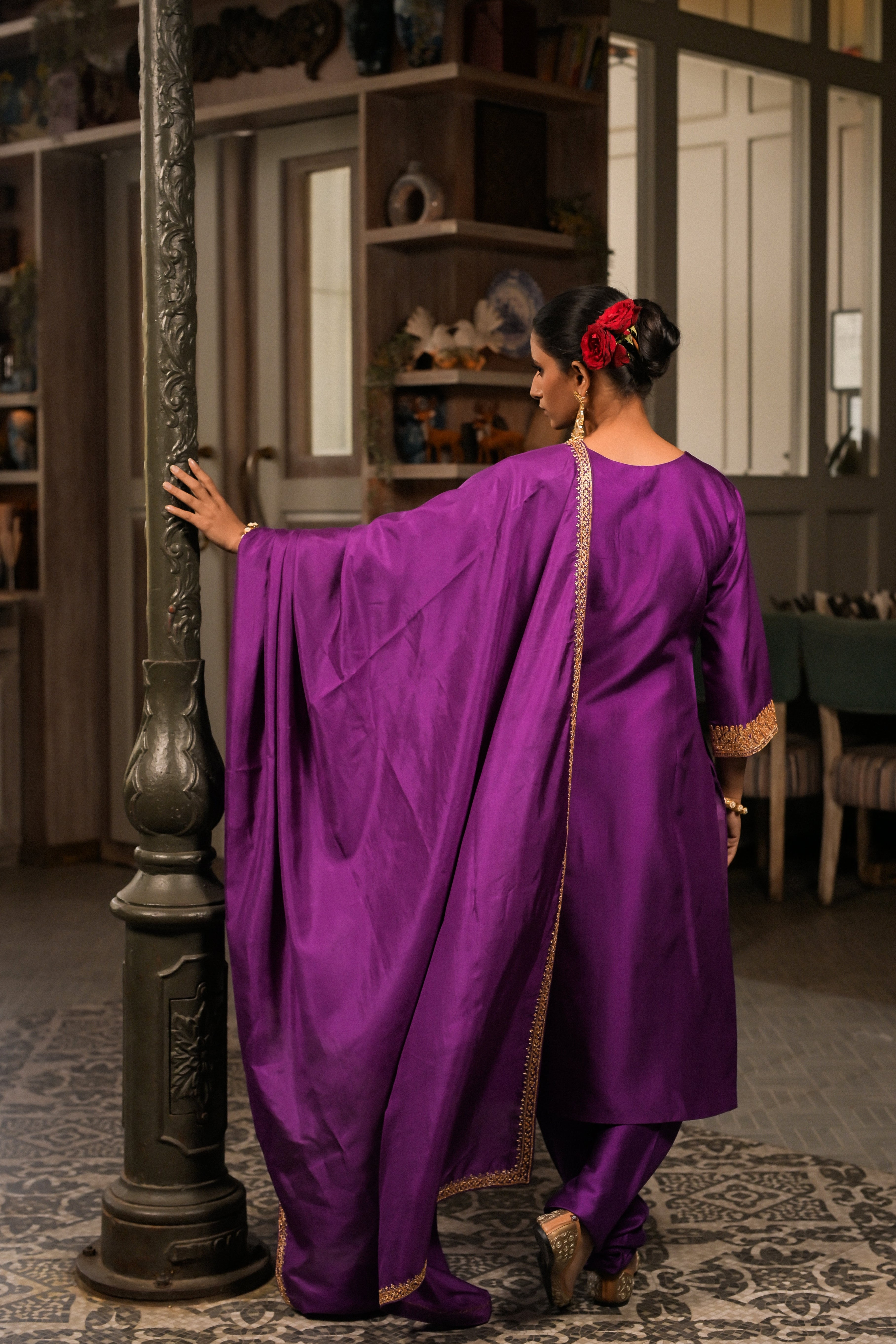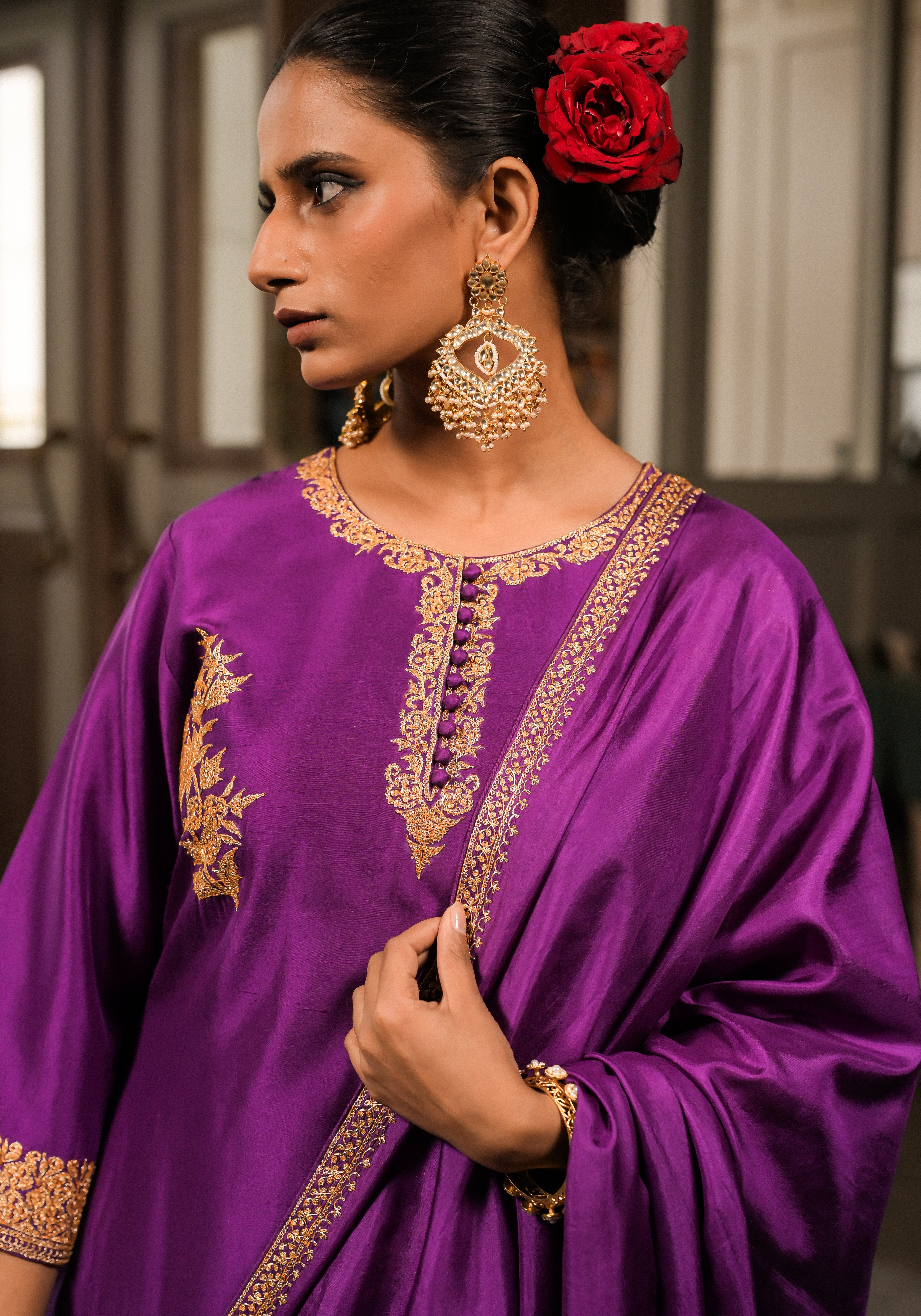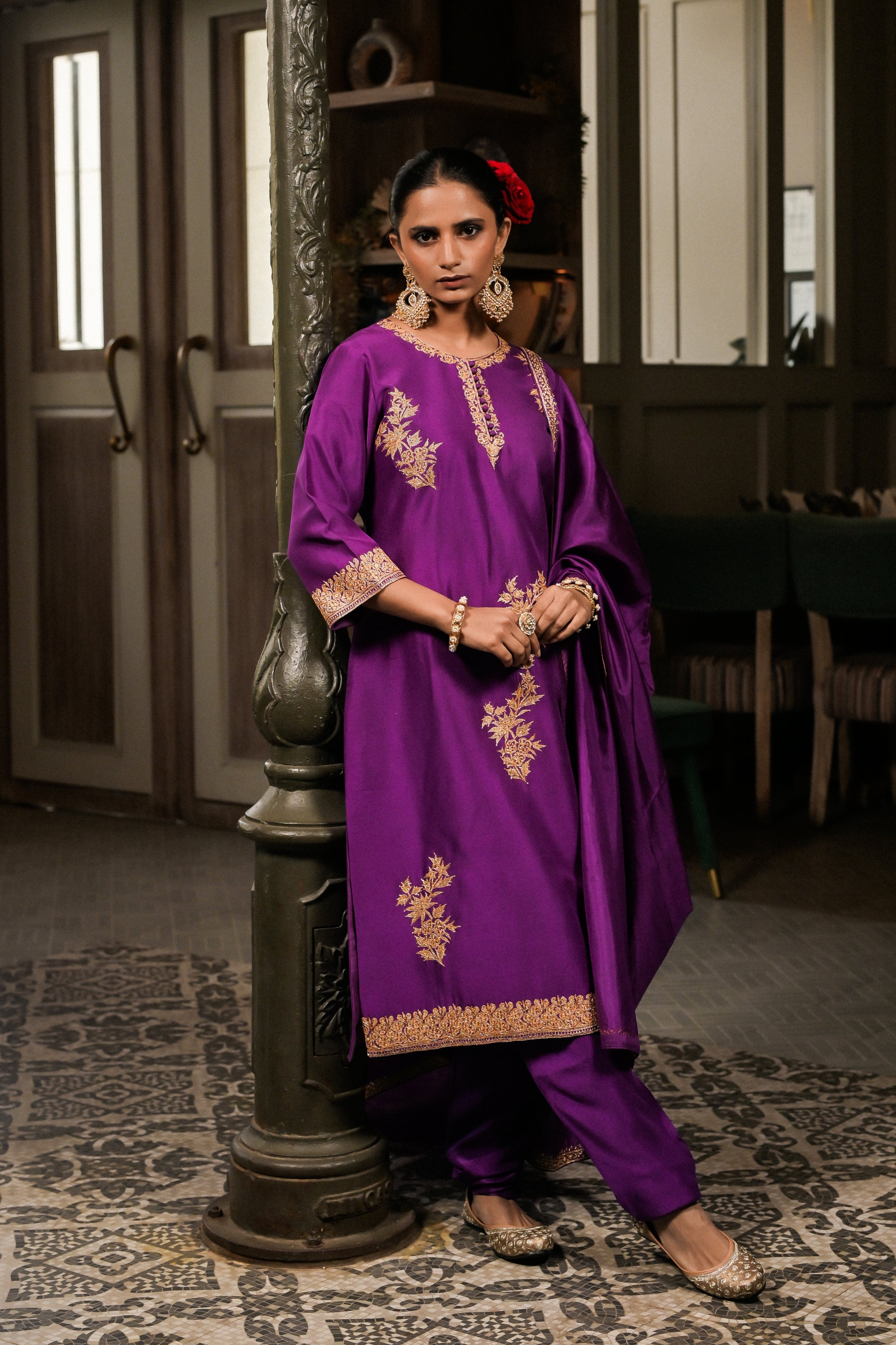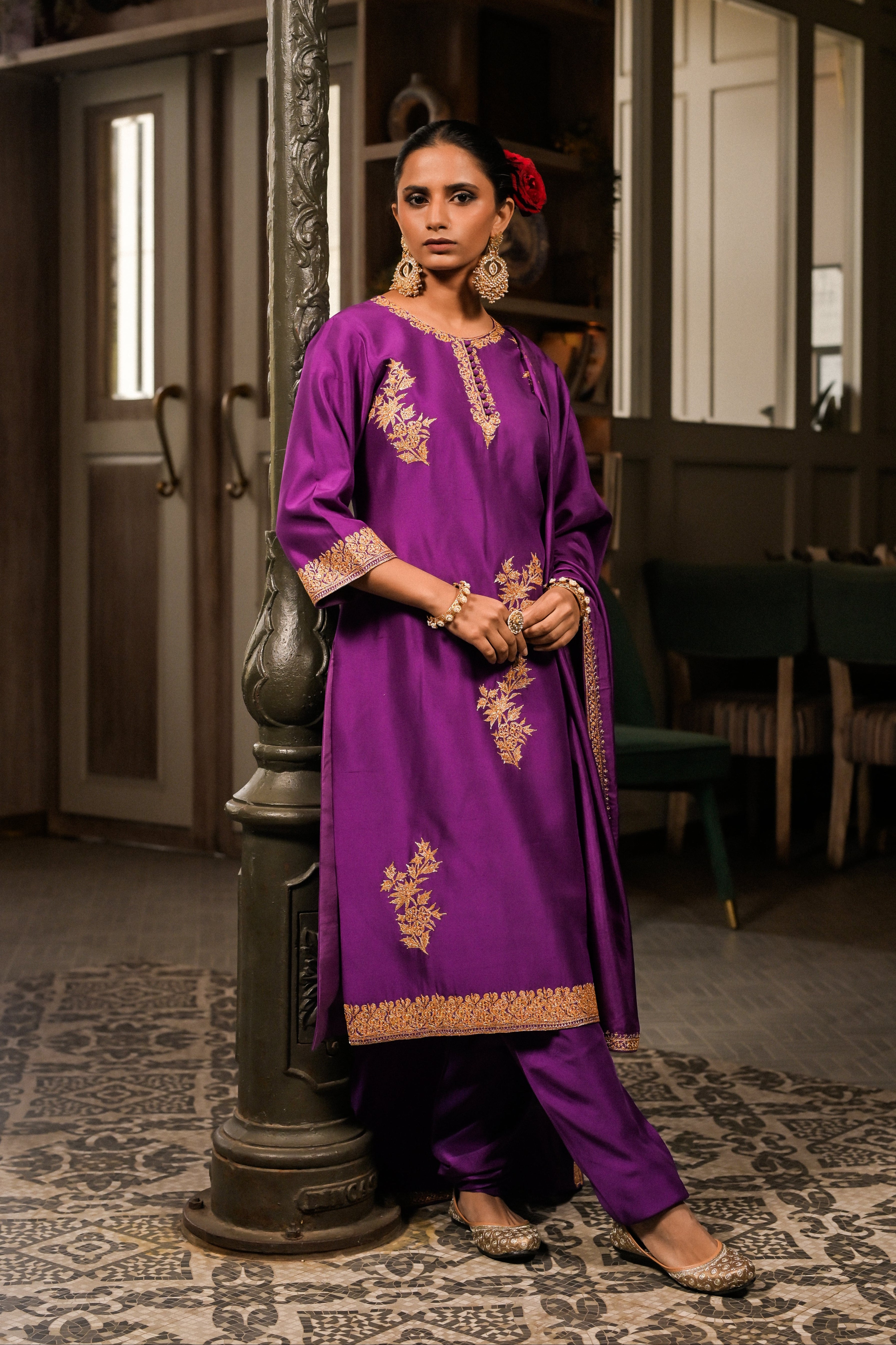 ‘Namika’ Violet Kurta set crafted from Dupion Silk features intricate hand embroidered Kashmiri tilla embroidery. It is paired with matching silk violet dupatta.