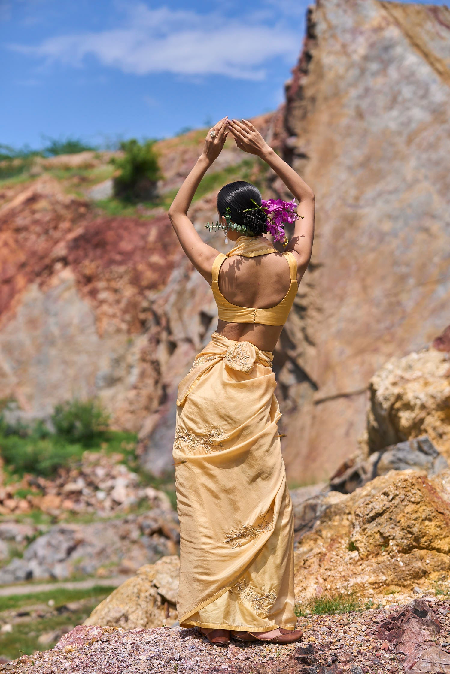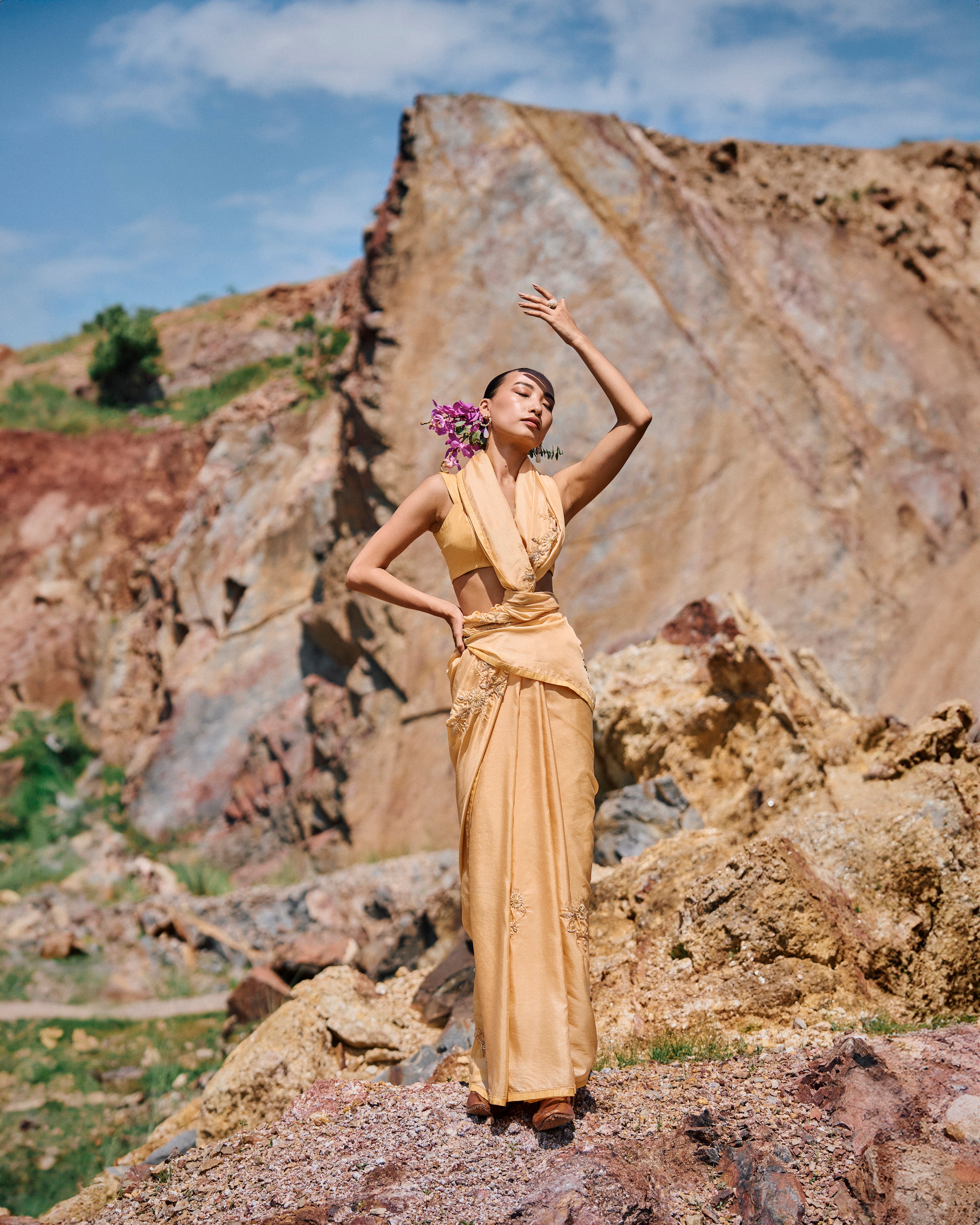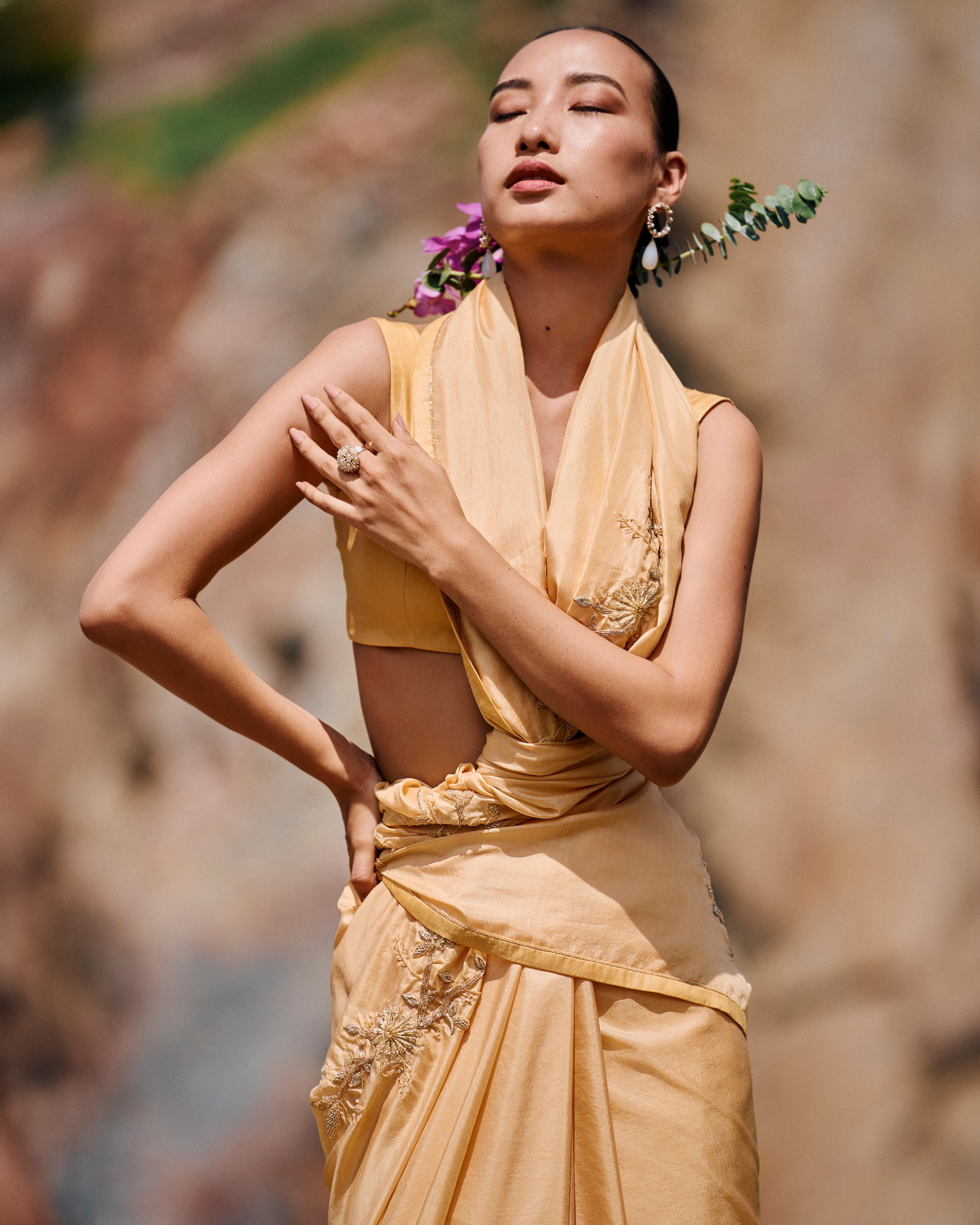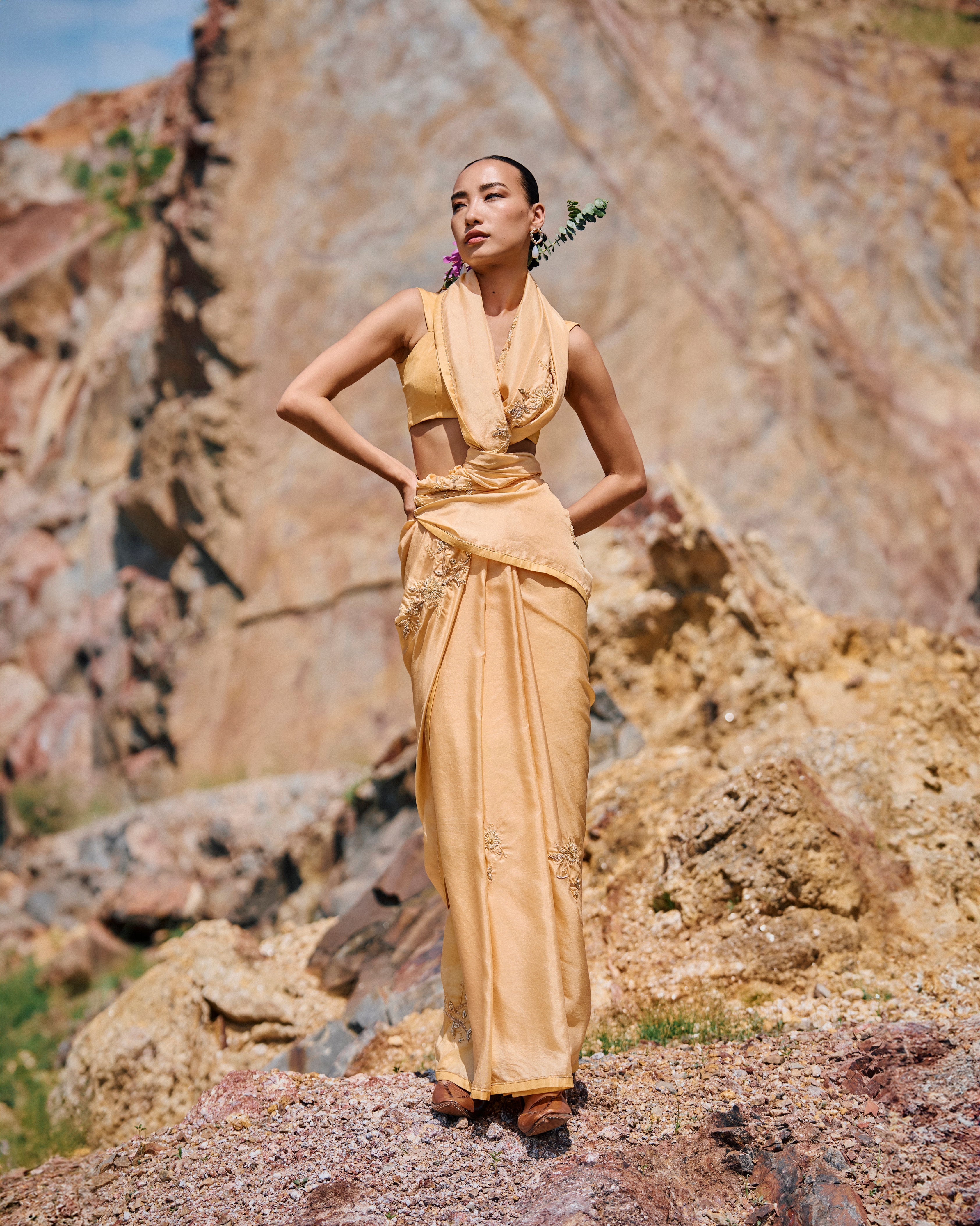 'Narji' yellow sari features Hand Embroidered border and Yellow Floral placement all over and is paired with pure silk blouse.