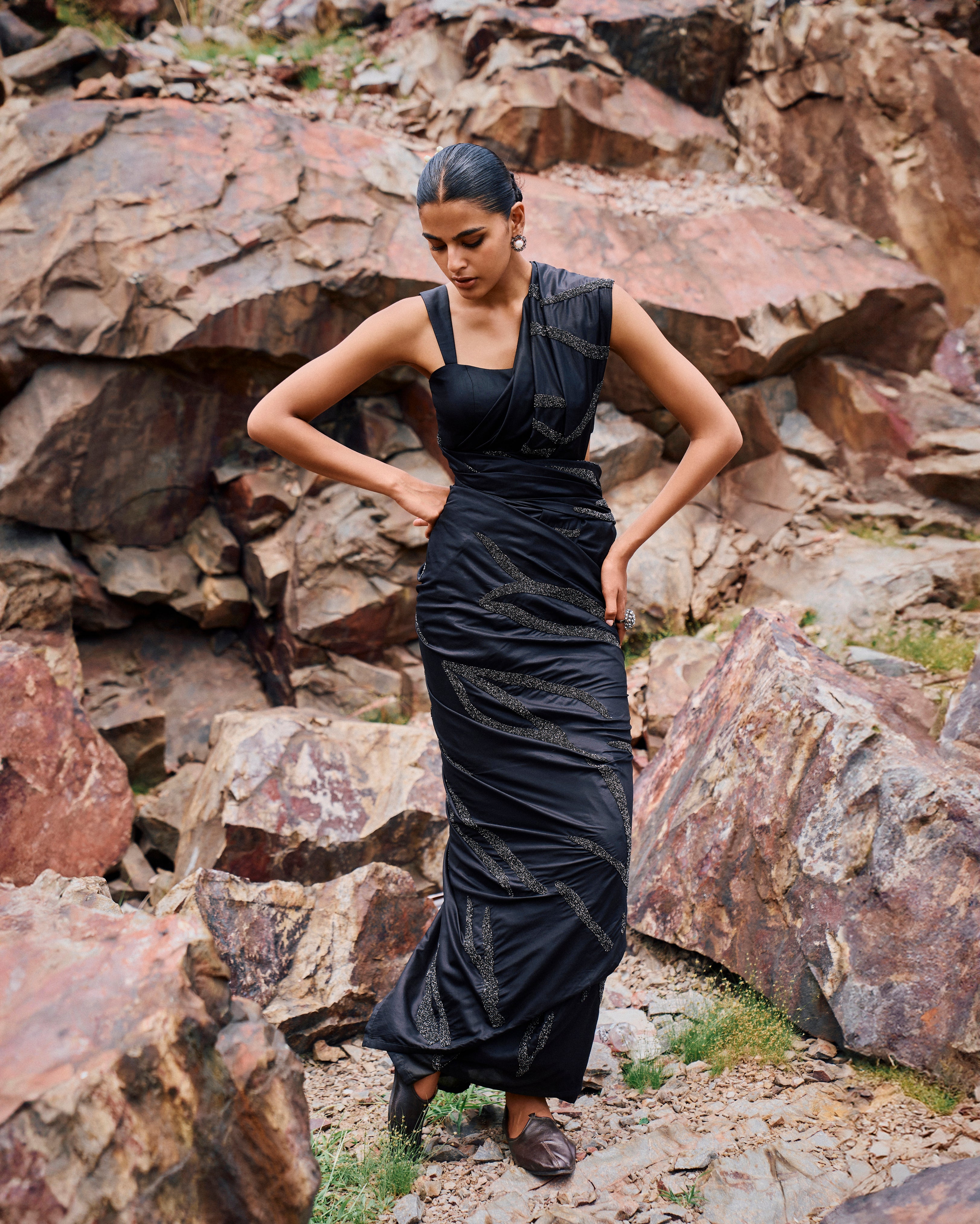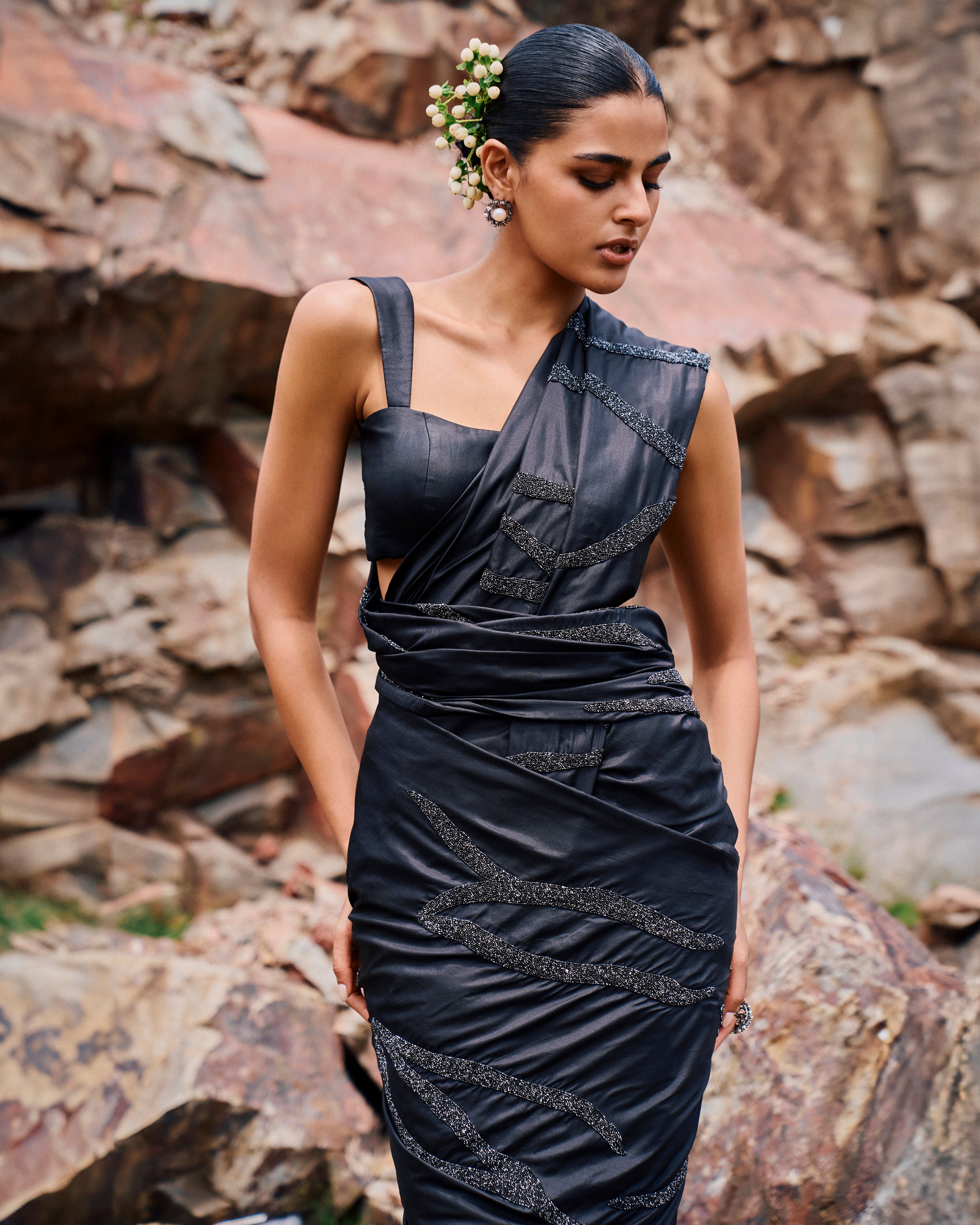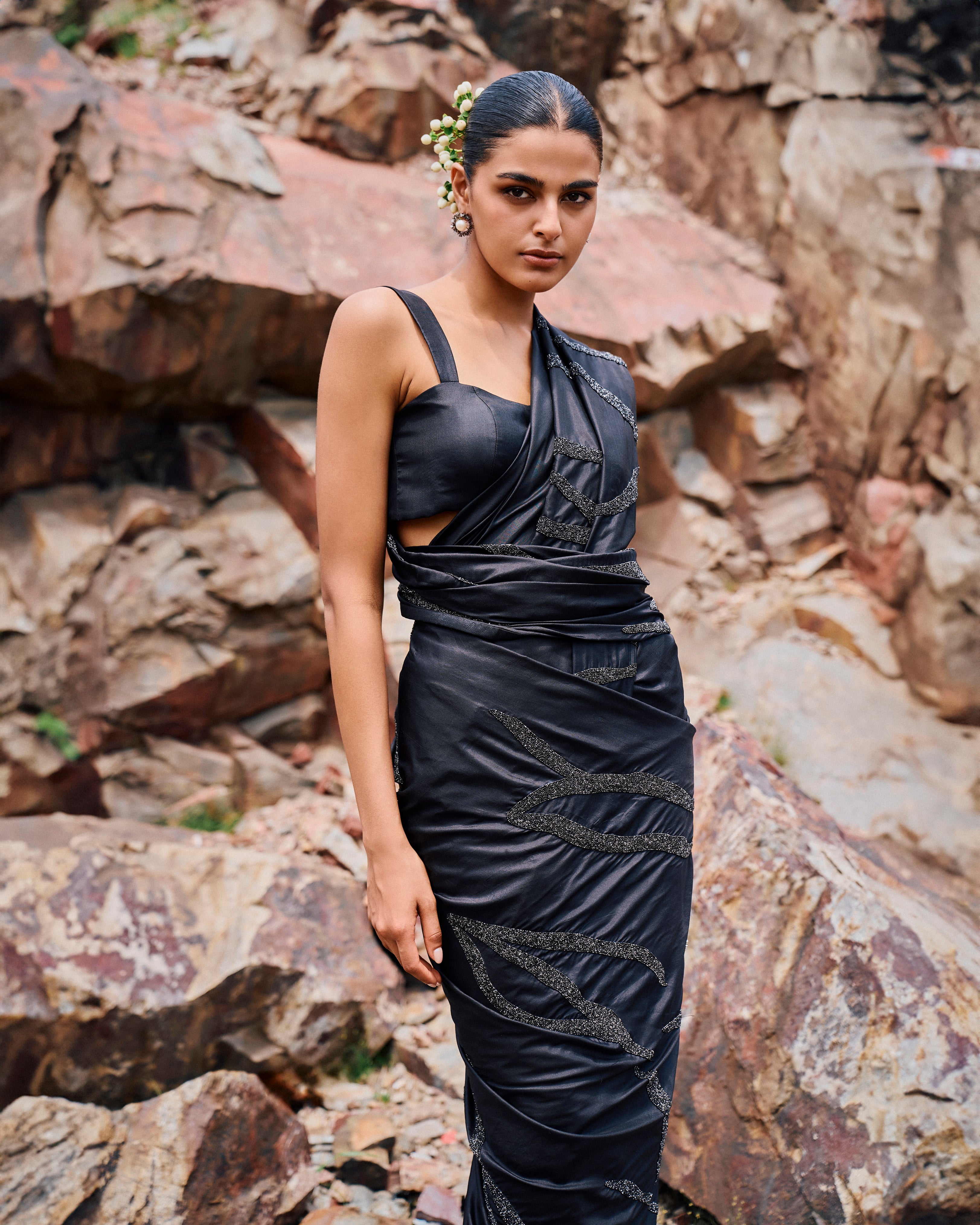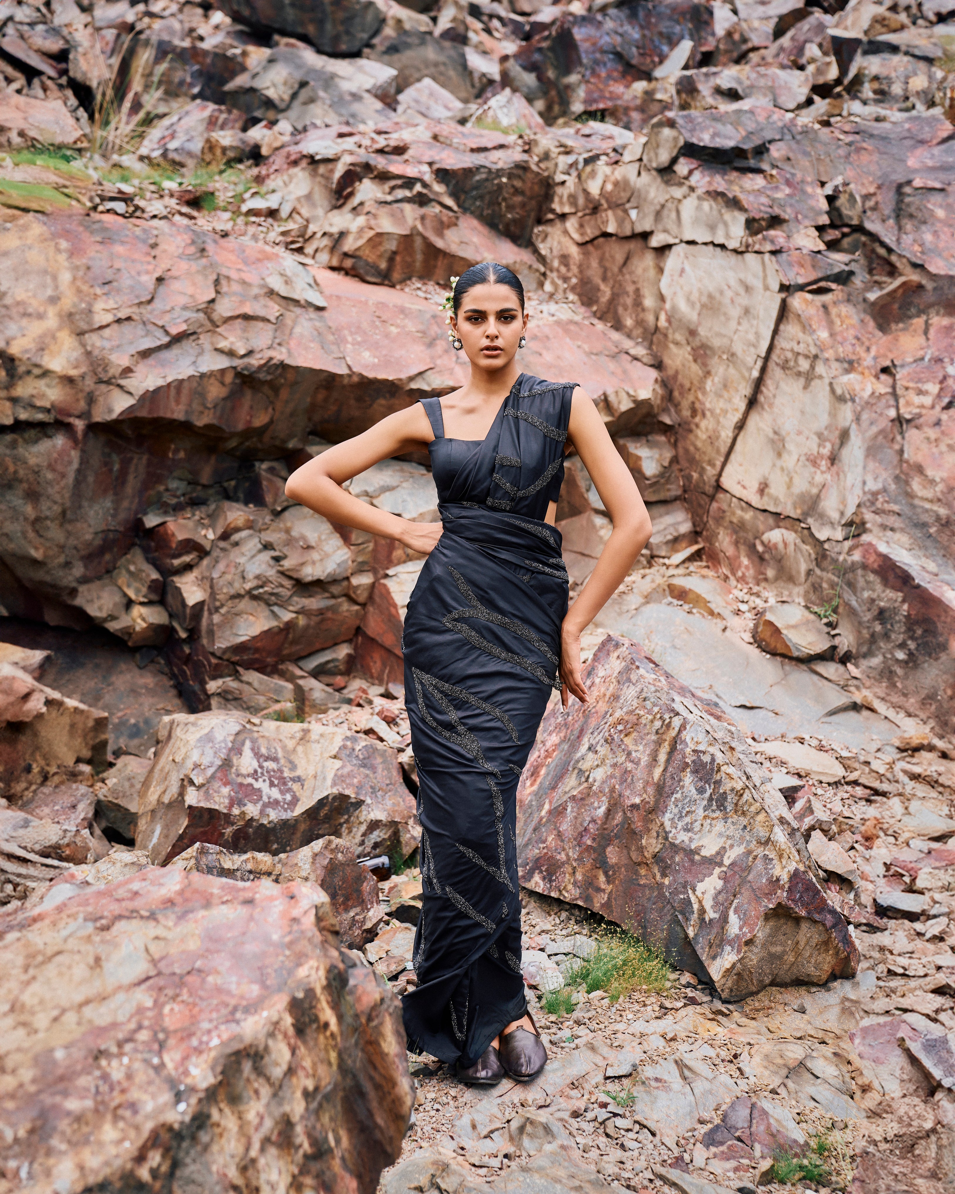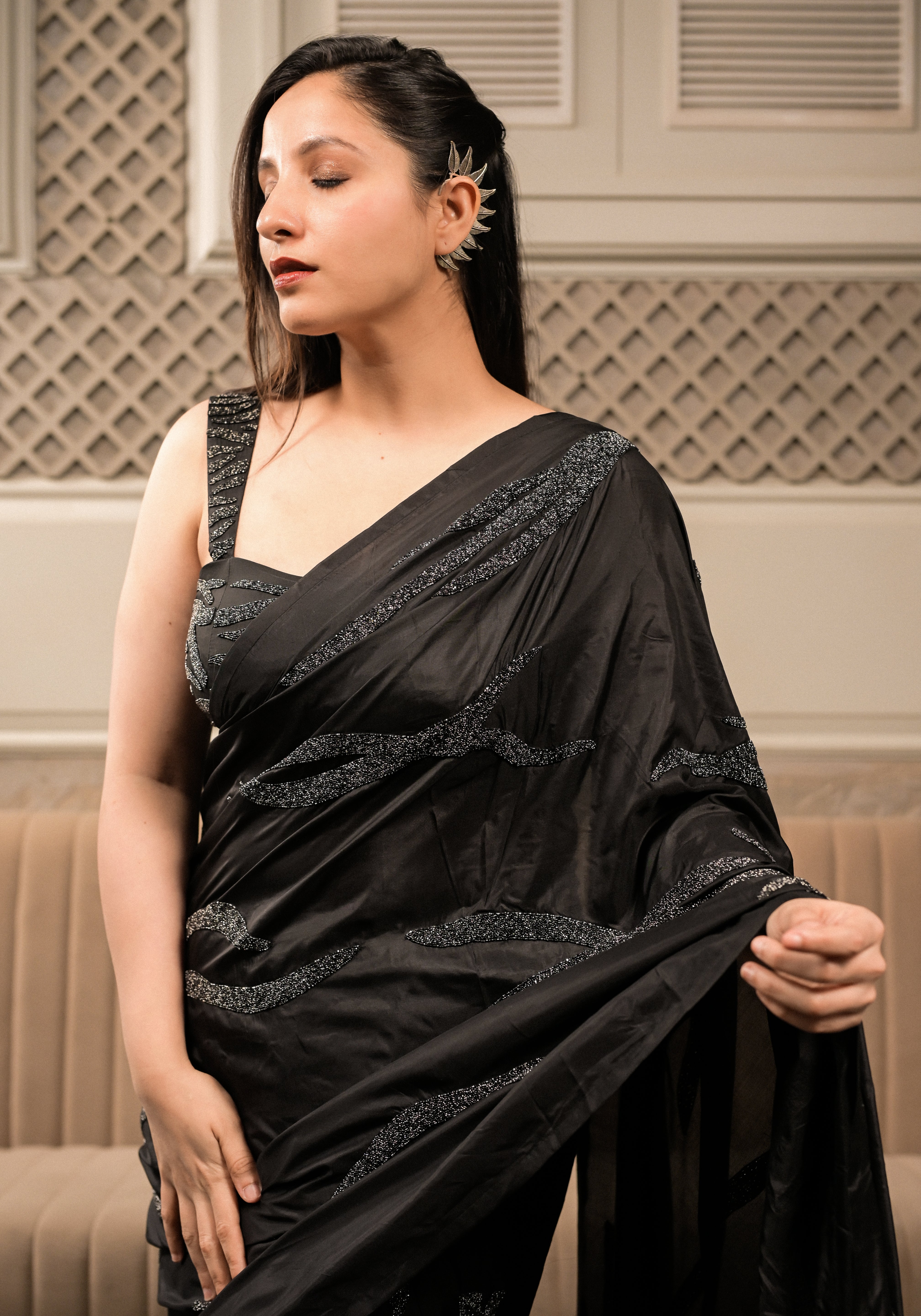 'Nisha' Black Sari features Hand Embroidered dual tone beaded Wave design placement all over and is paired with pure silk blouse.