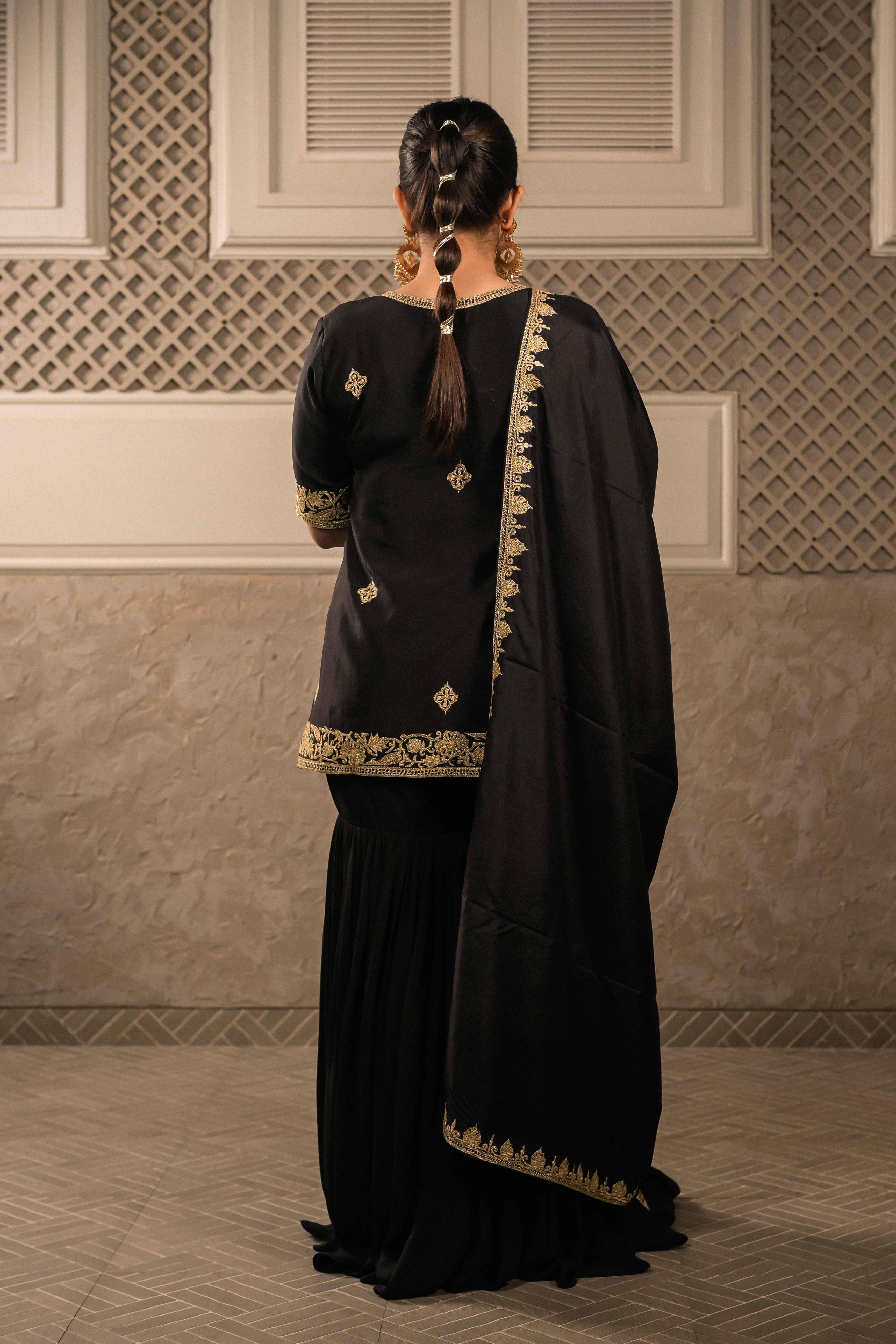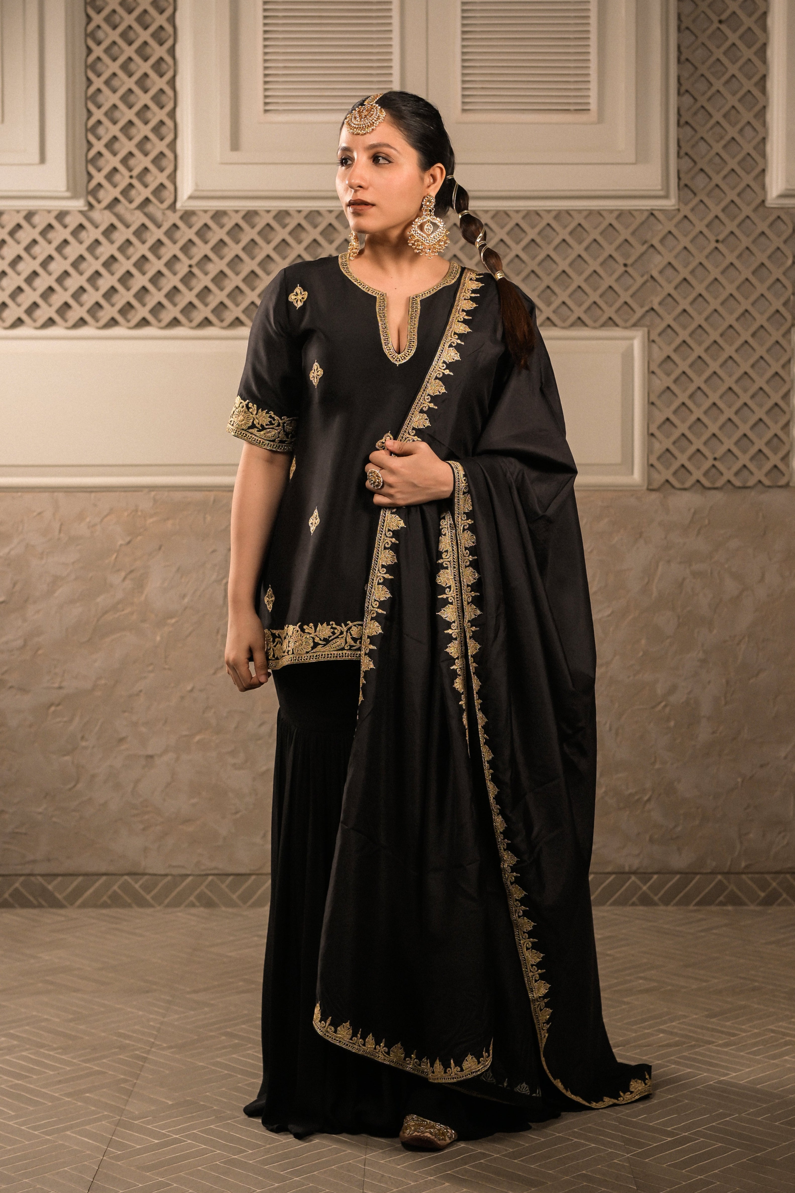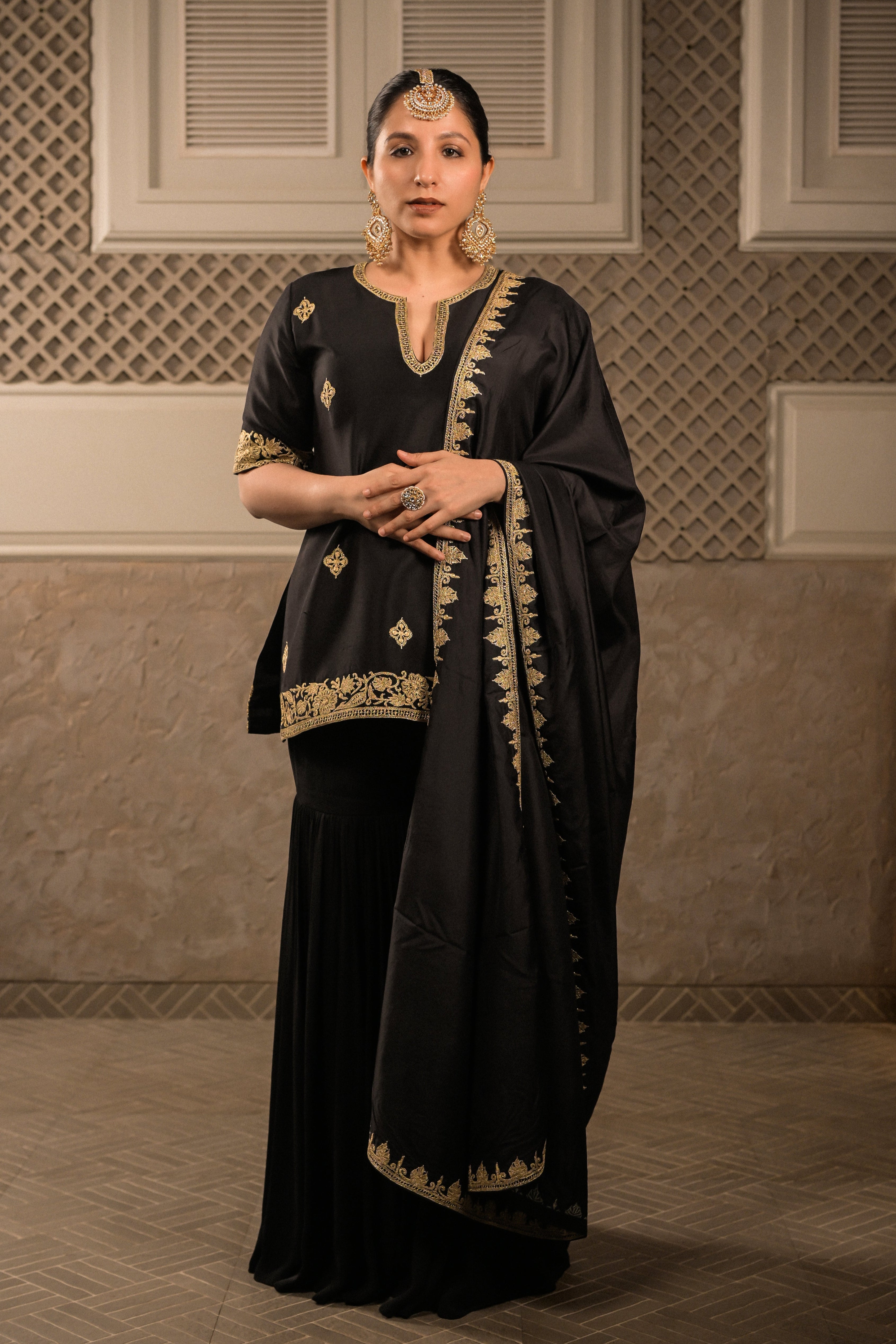 ‘Aloka’ Black kurta with sharara crafted from Dupion Silk features intricate hand embroidered Kashmiri tilla embroidery. It is paired with matching silk black dupatta.