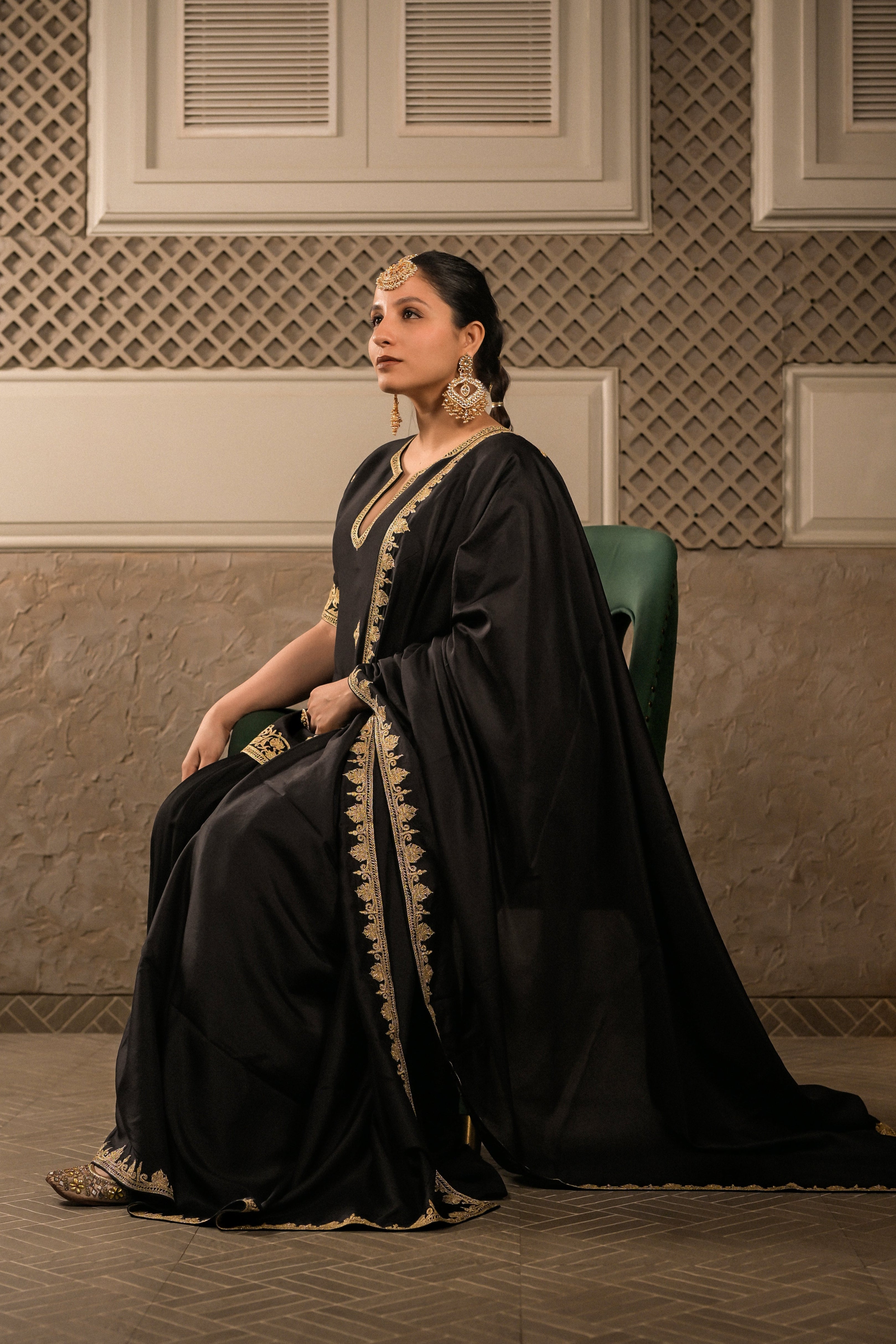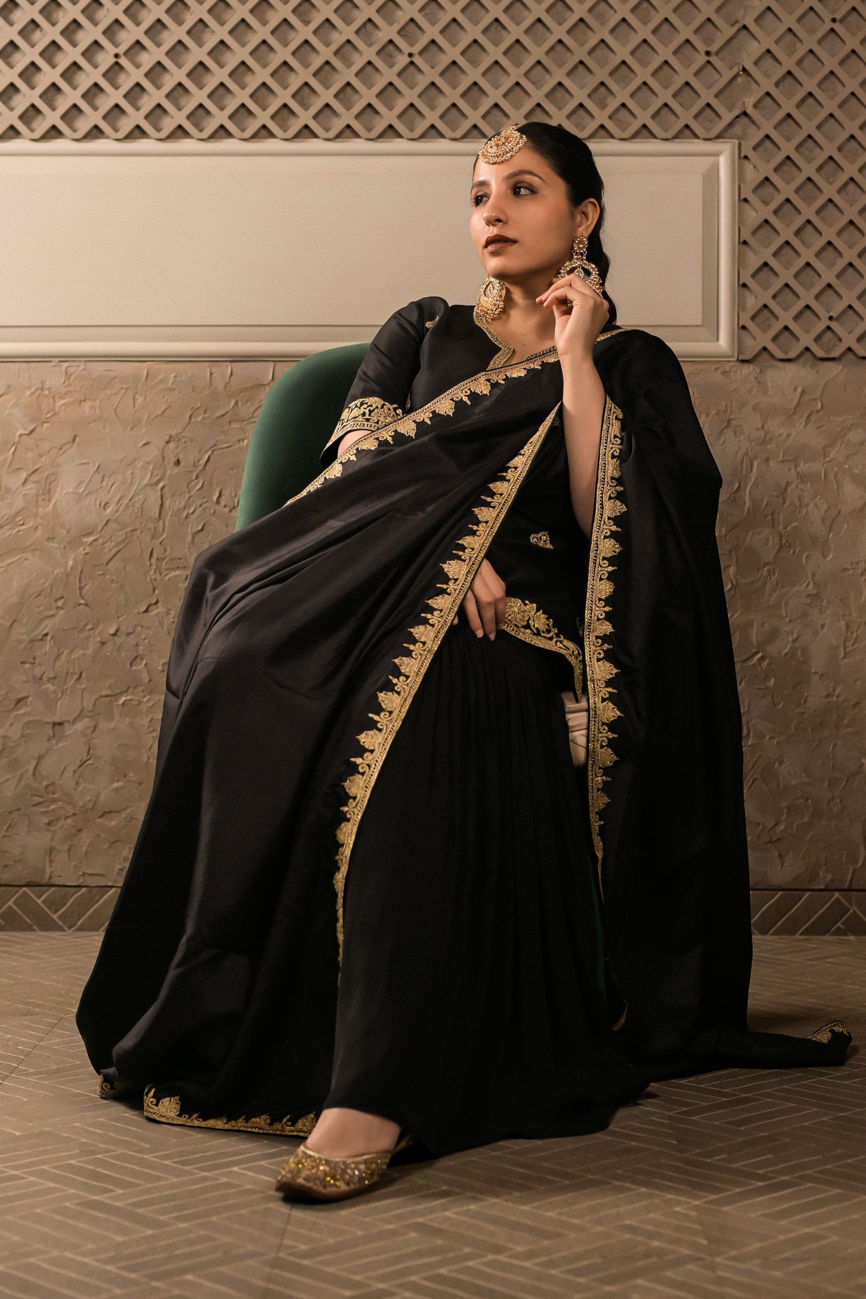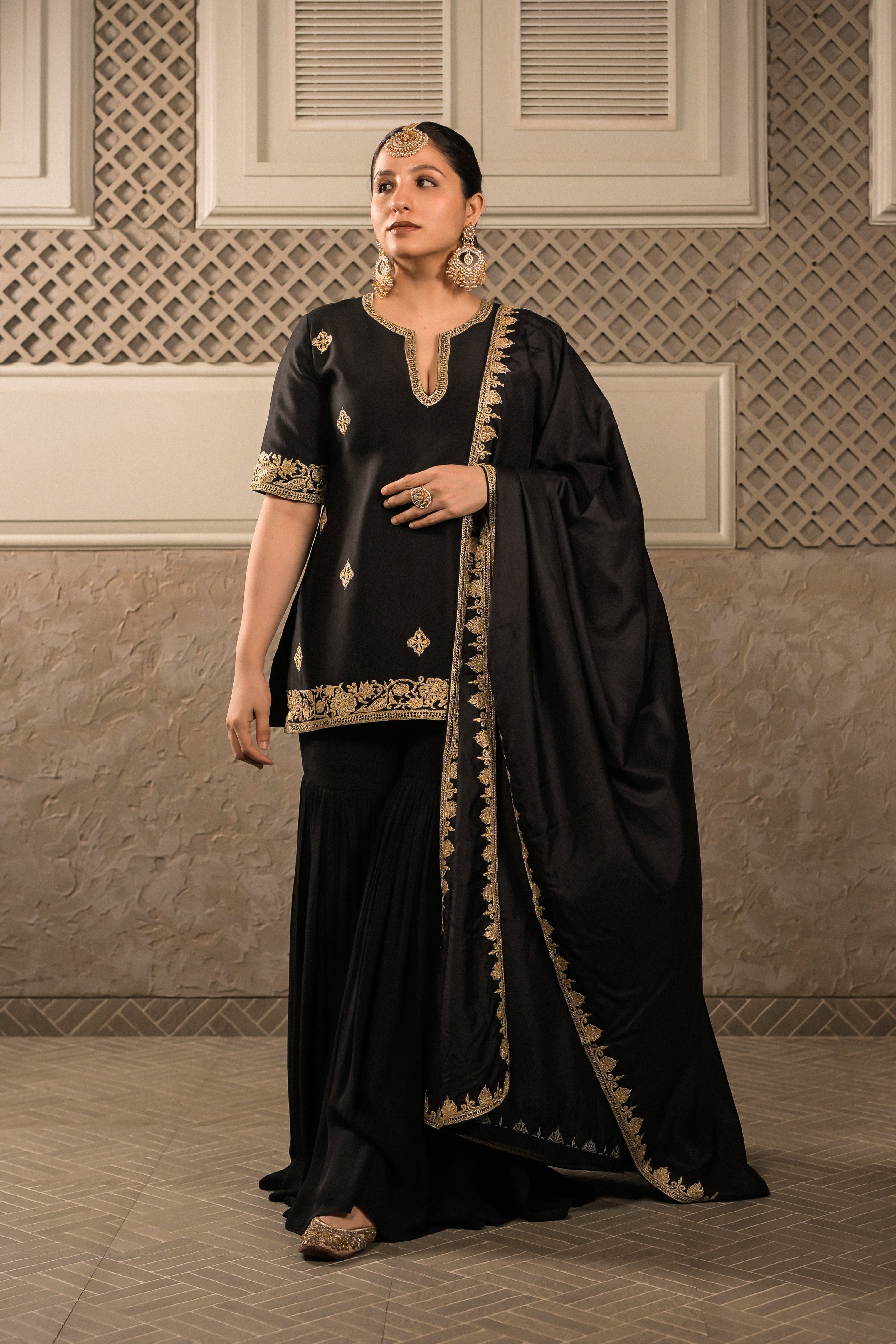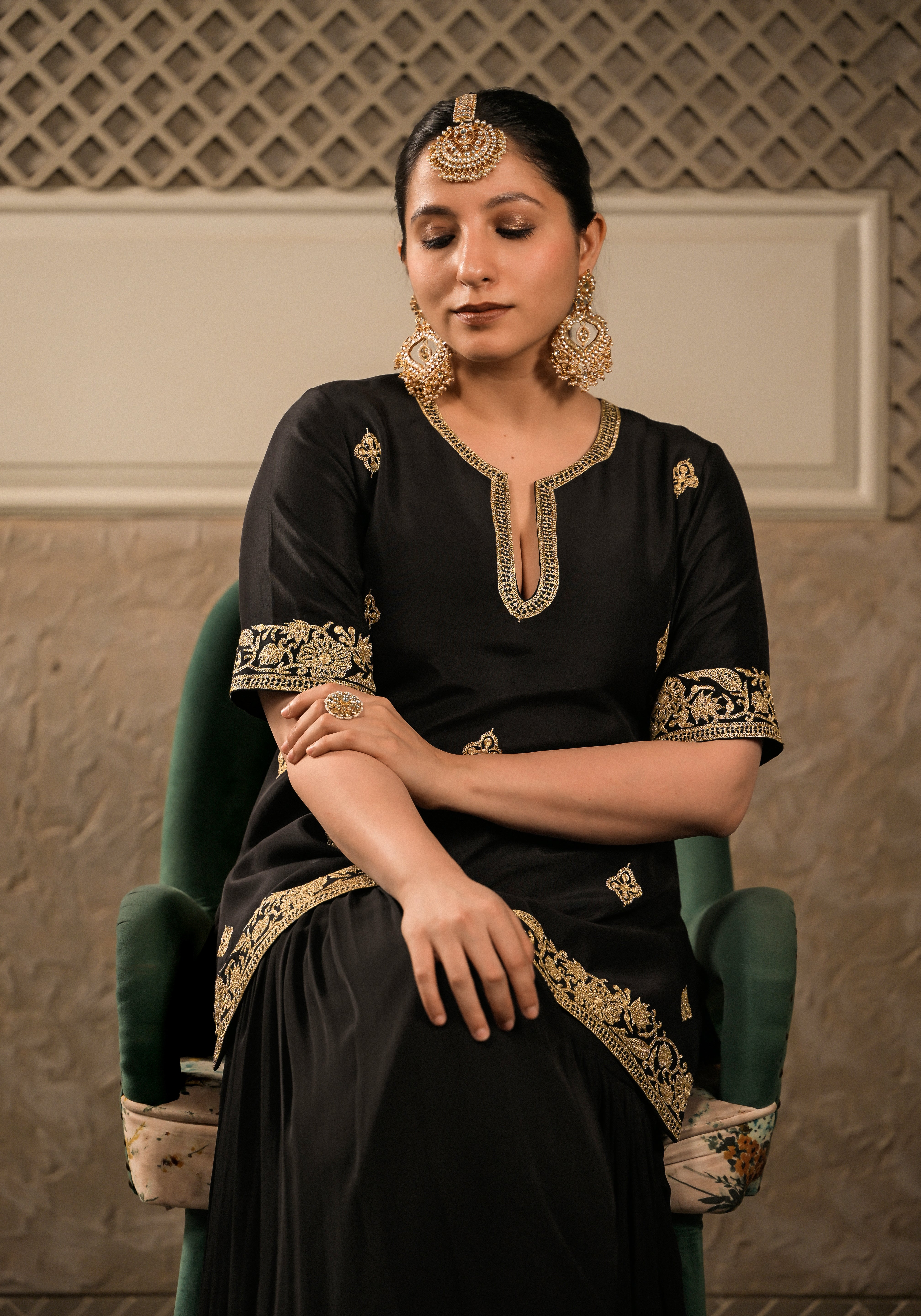 ‘Aloka’ Black kurta with sharara crafted from Dupion Silk features intricate hand embroidered Kashmiri tilla embroidery. It is paired with matching silk black dupatta.
