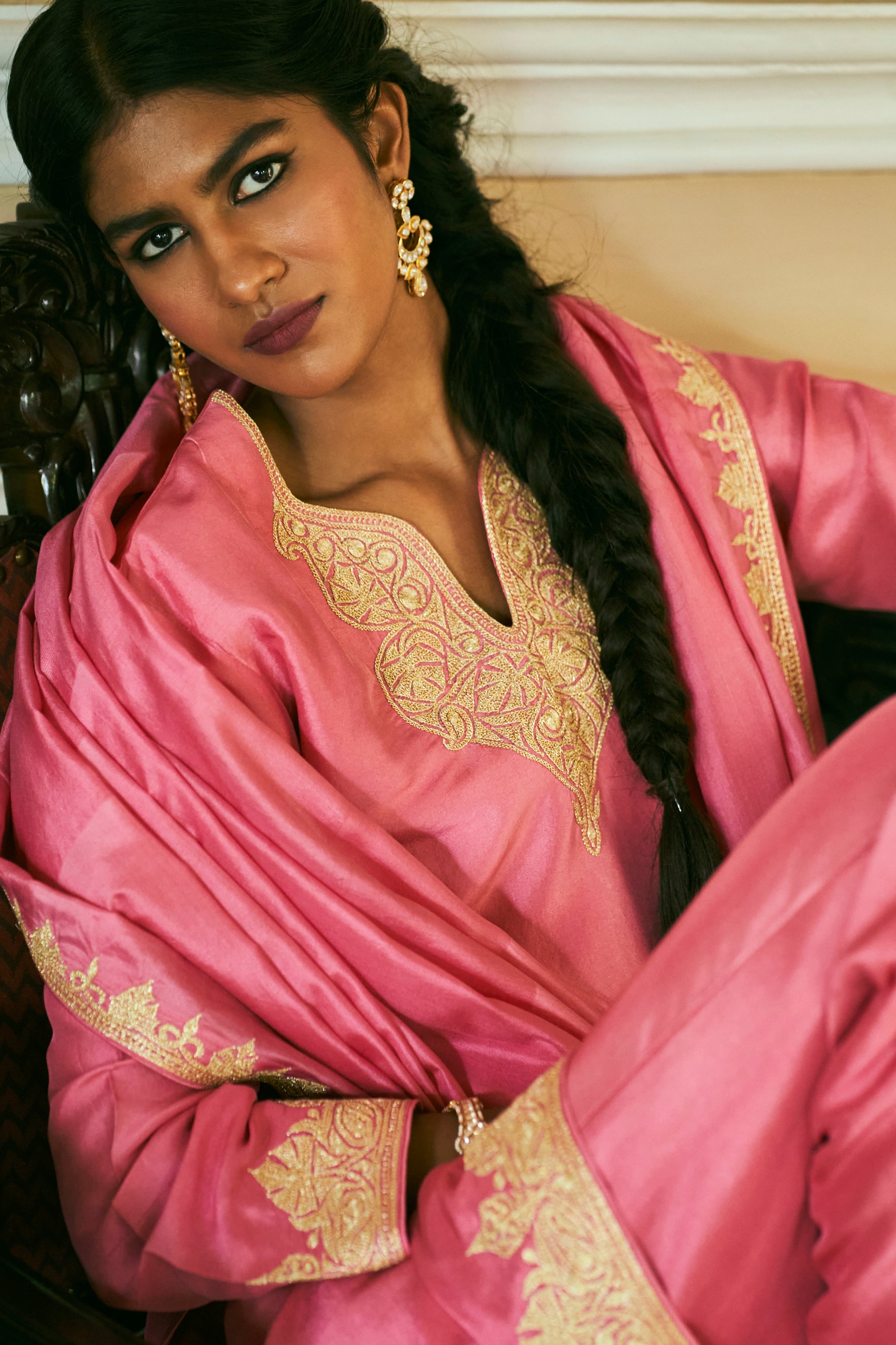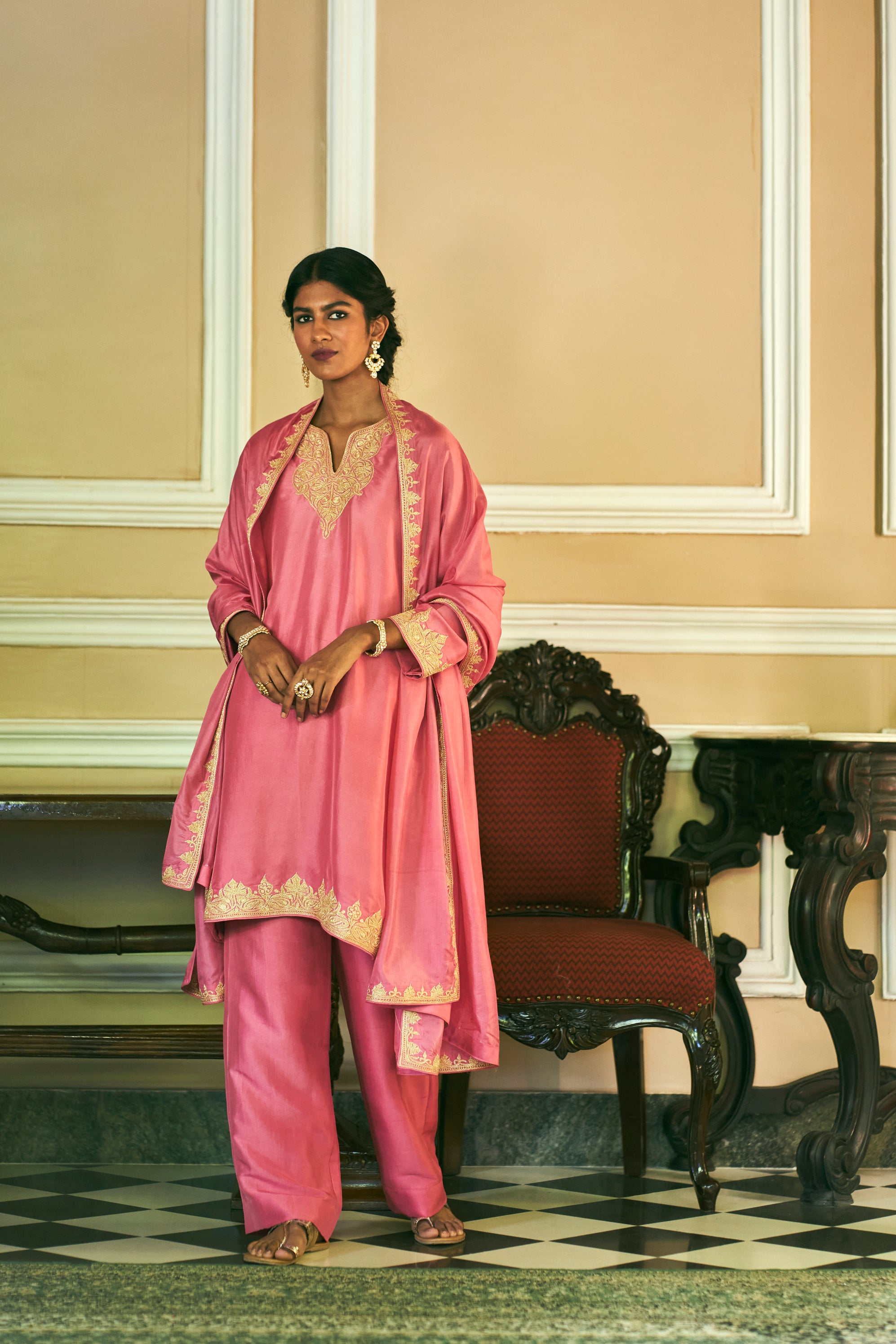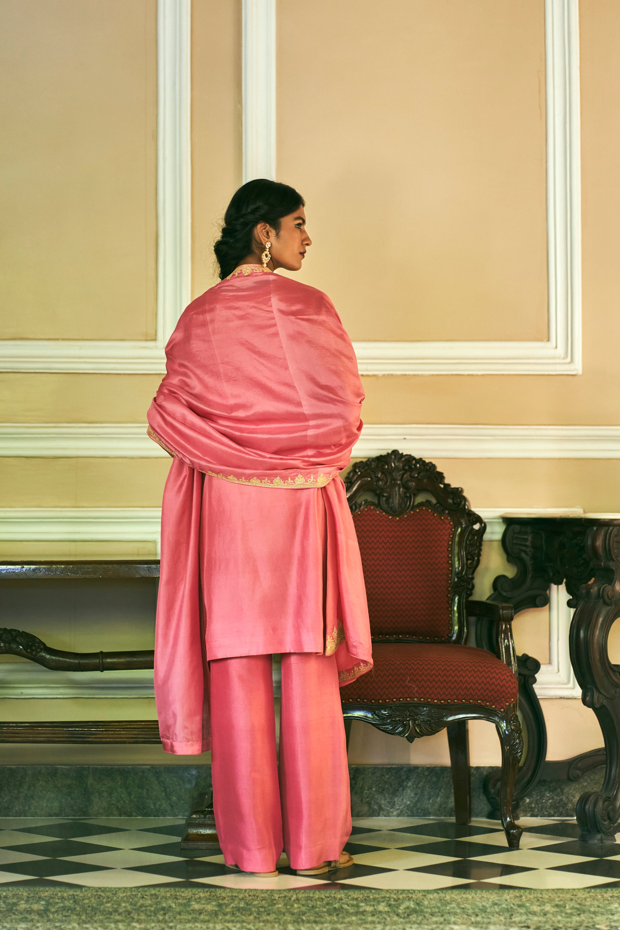 ‘Nitara’ Candy pink Kurta set crafted from Dupion silk features delicate hand embroidered motif border and neck line. It is paired with matching hand Embroidered pink silk Dupatta.