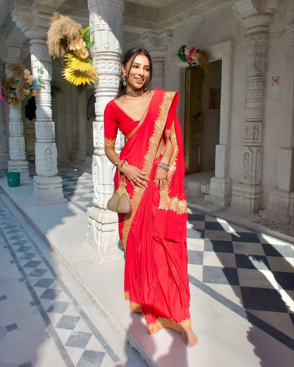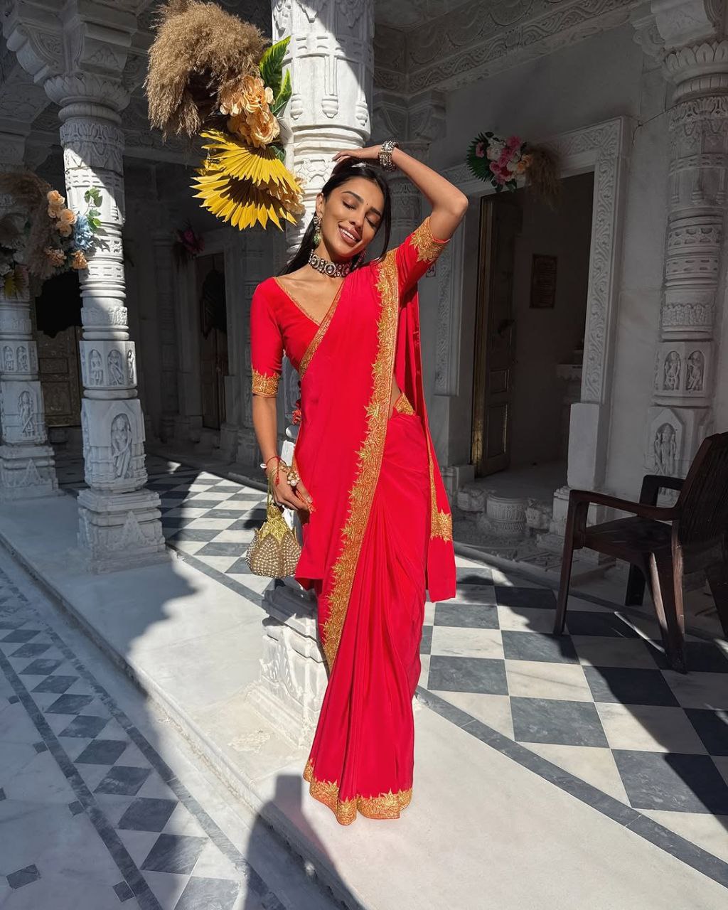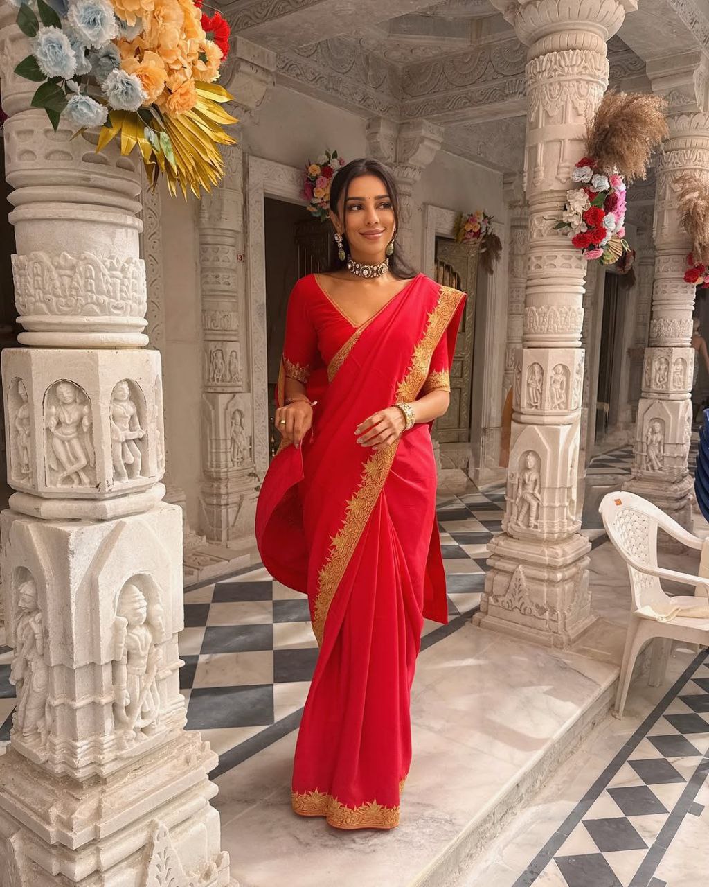 'Shaheen' Red Kashmiri tilla work saree signifies Royalty. It features a Hand Embroidered Chinar leaf border inspired by the Chinar trees of Kashmir which are almost 600 years old. It is worn with a matching hand embroidered crepe silk blouse.
