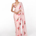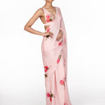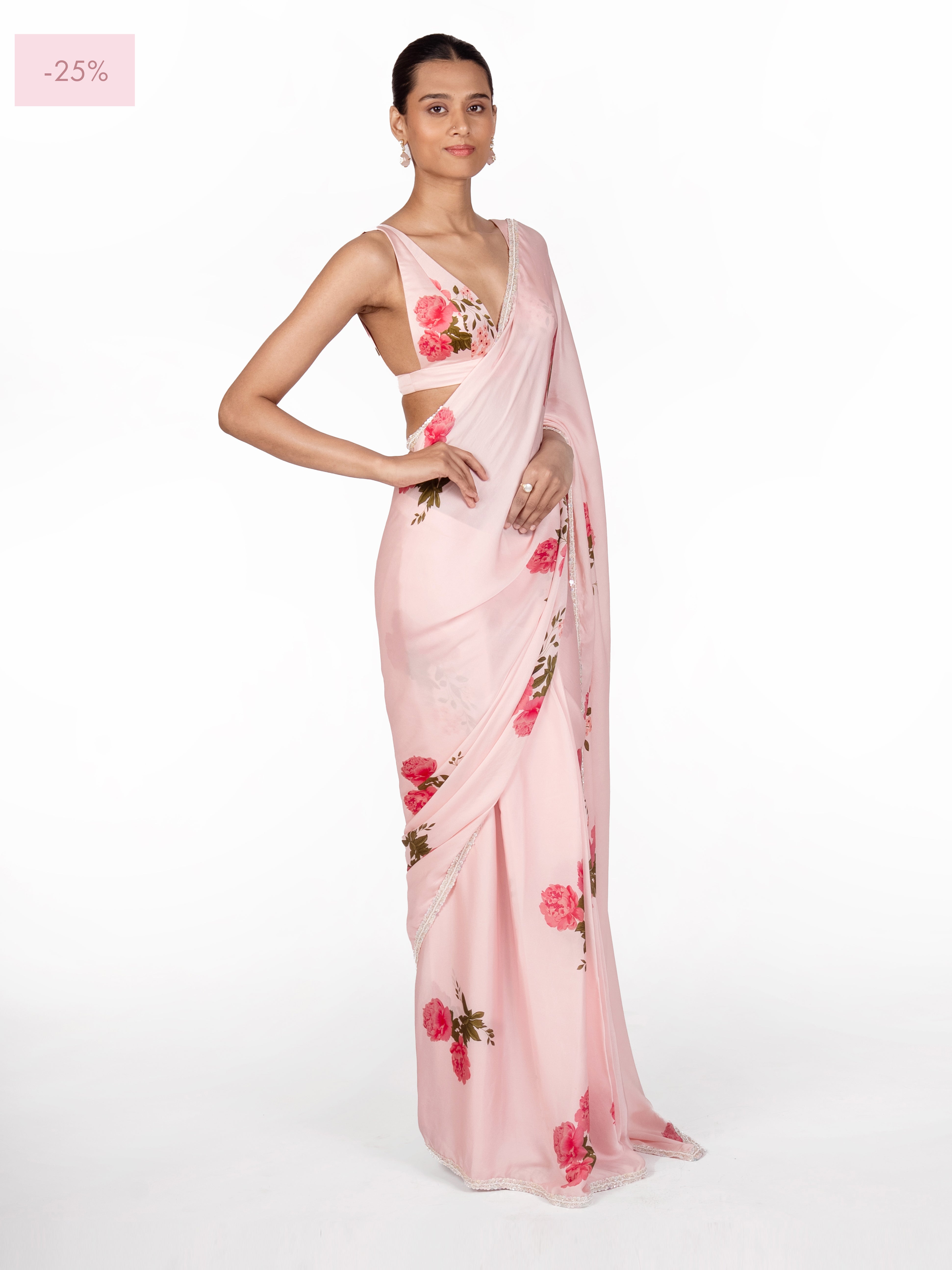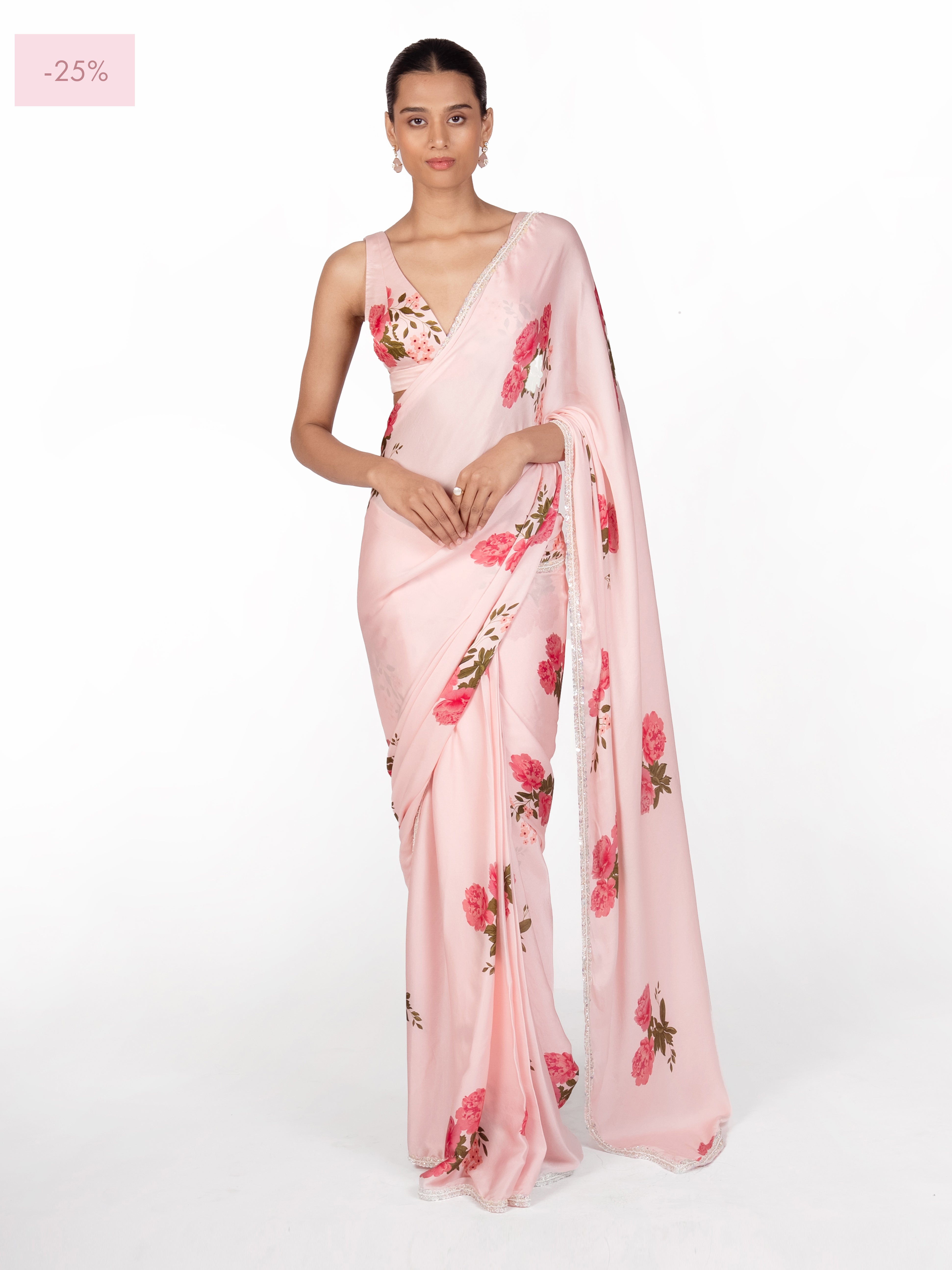 'Selene' Pink floral satin silk saree features floral all over with sequins and beaded lace and comes with matching floral printed sleeveless blouse with plunging v neck.