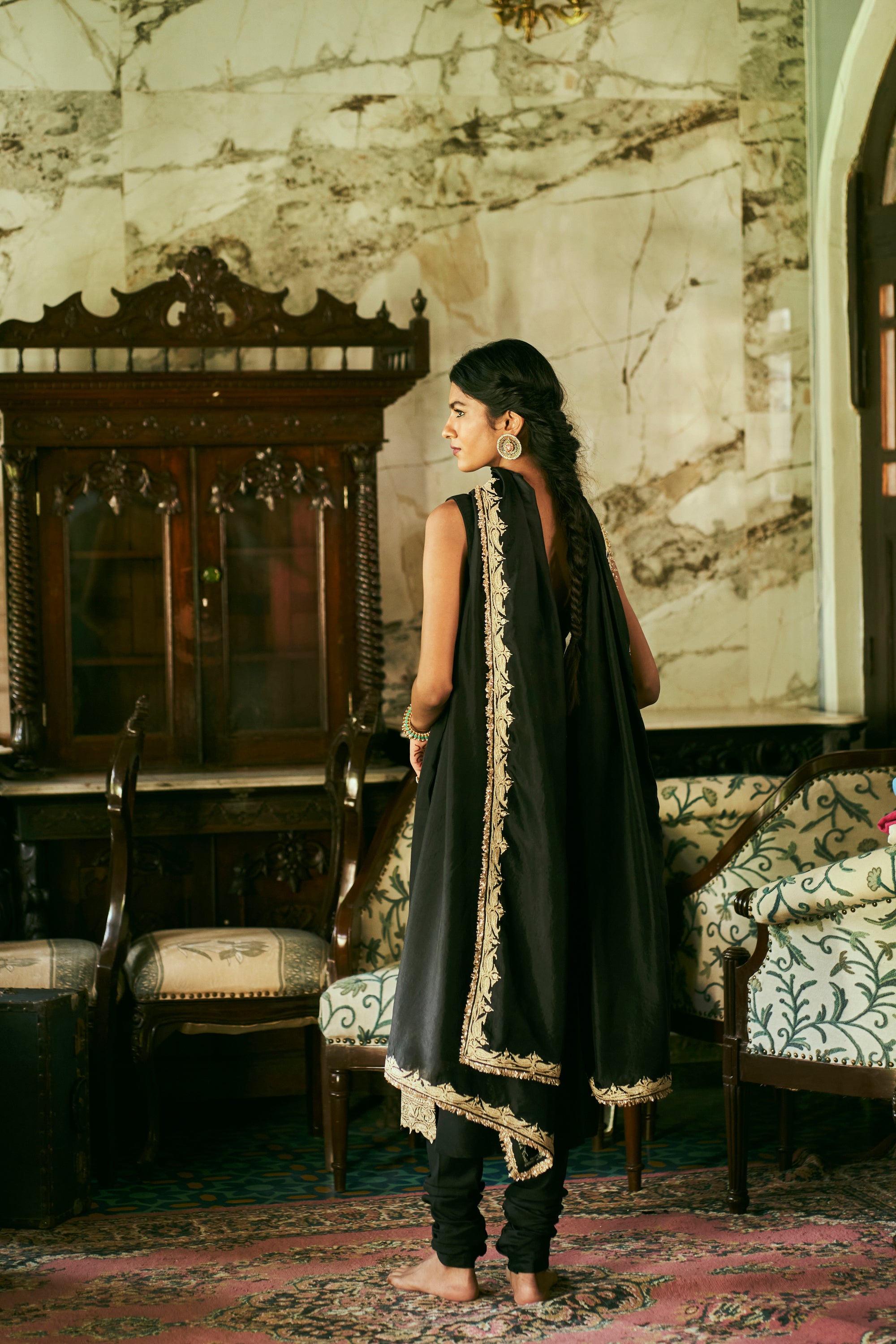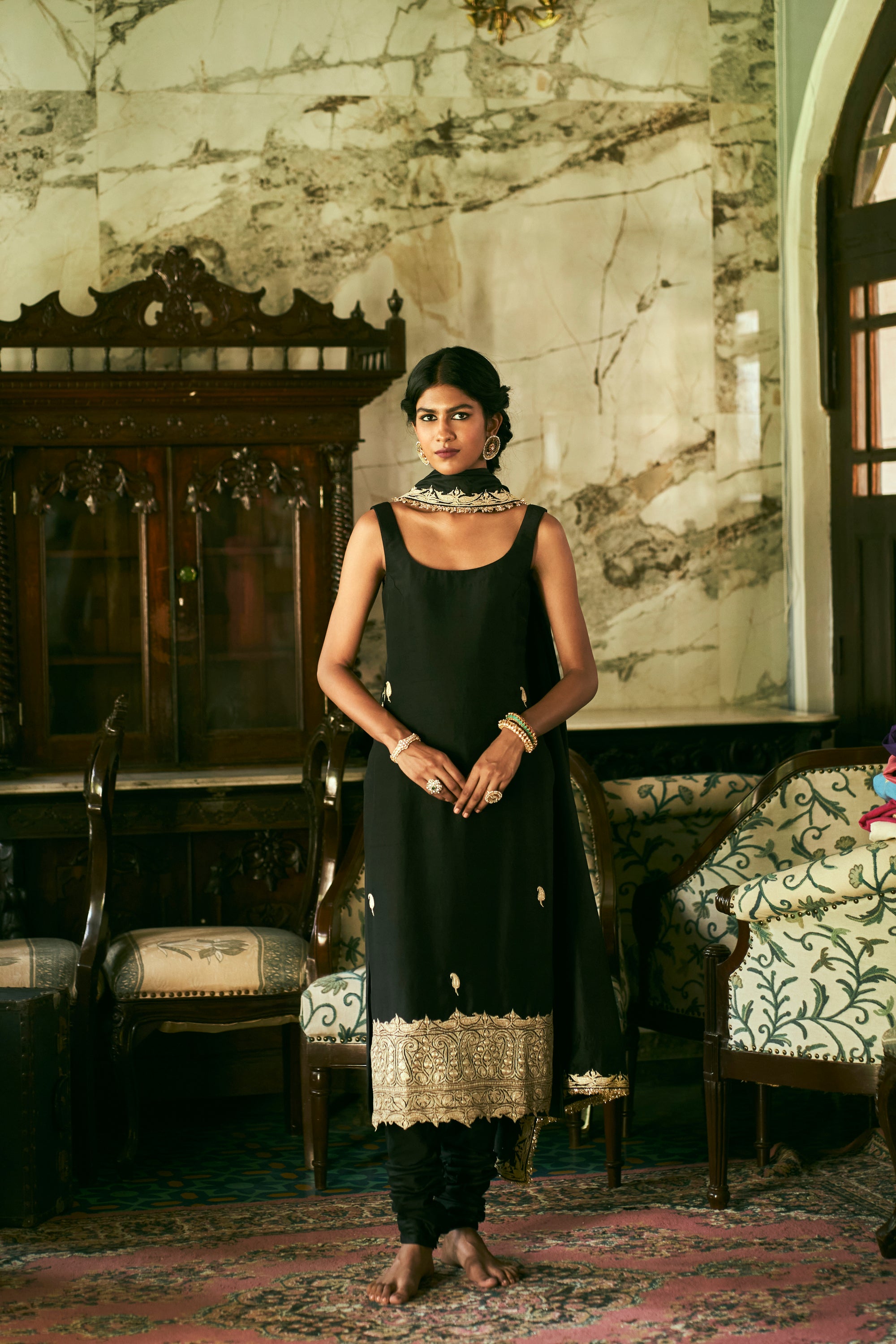 ‘Karvi’ Black Kurta set crafted from Dupion Silk features beautiful giant motif border and punctuated with mango butis all over. It is paired with matching hand Embroidered Black Dupatta.
