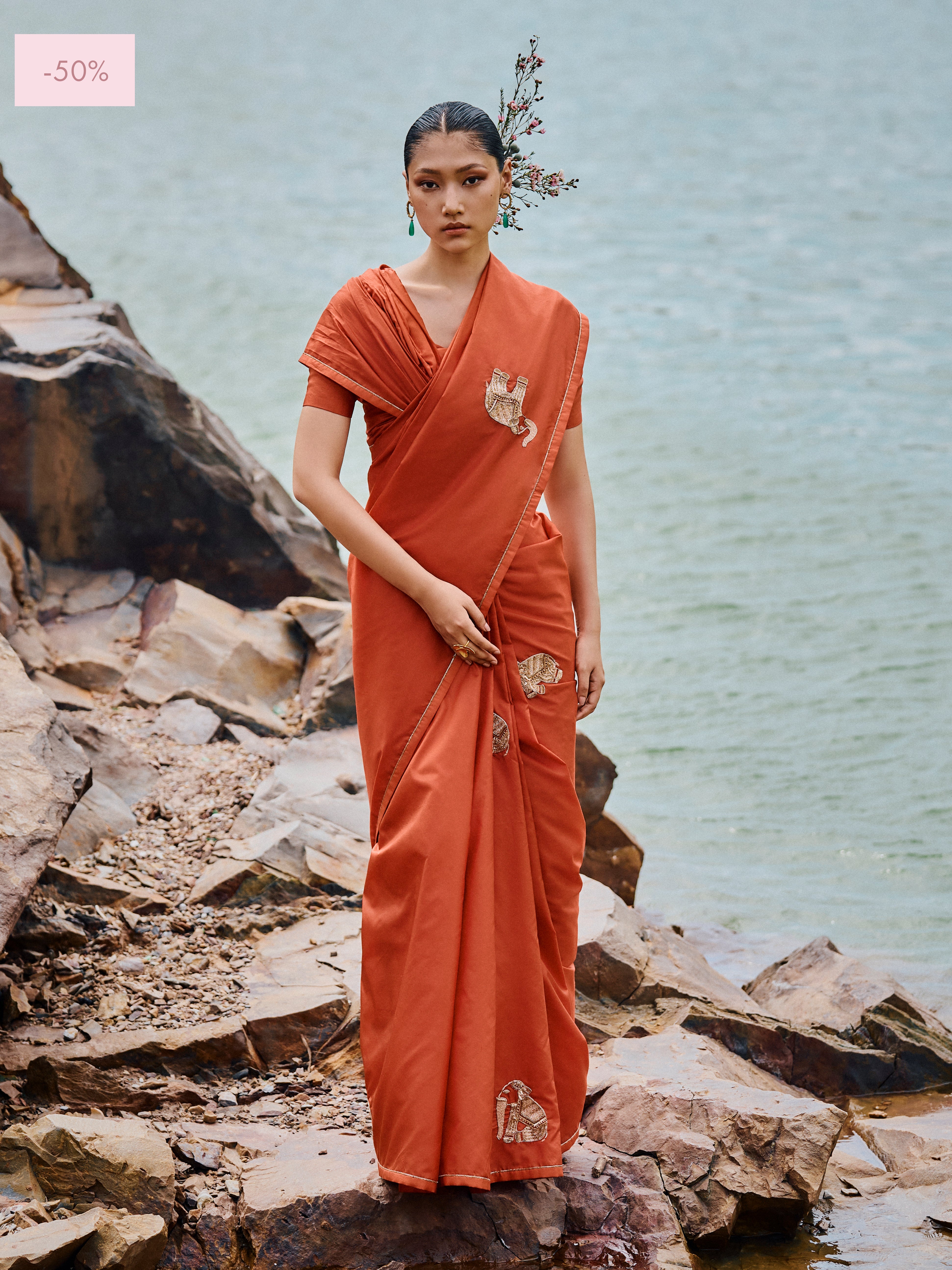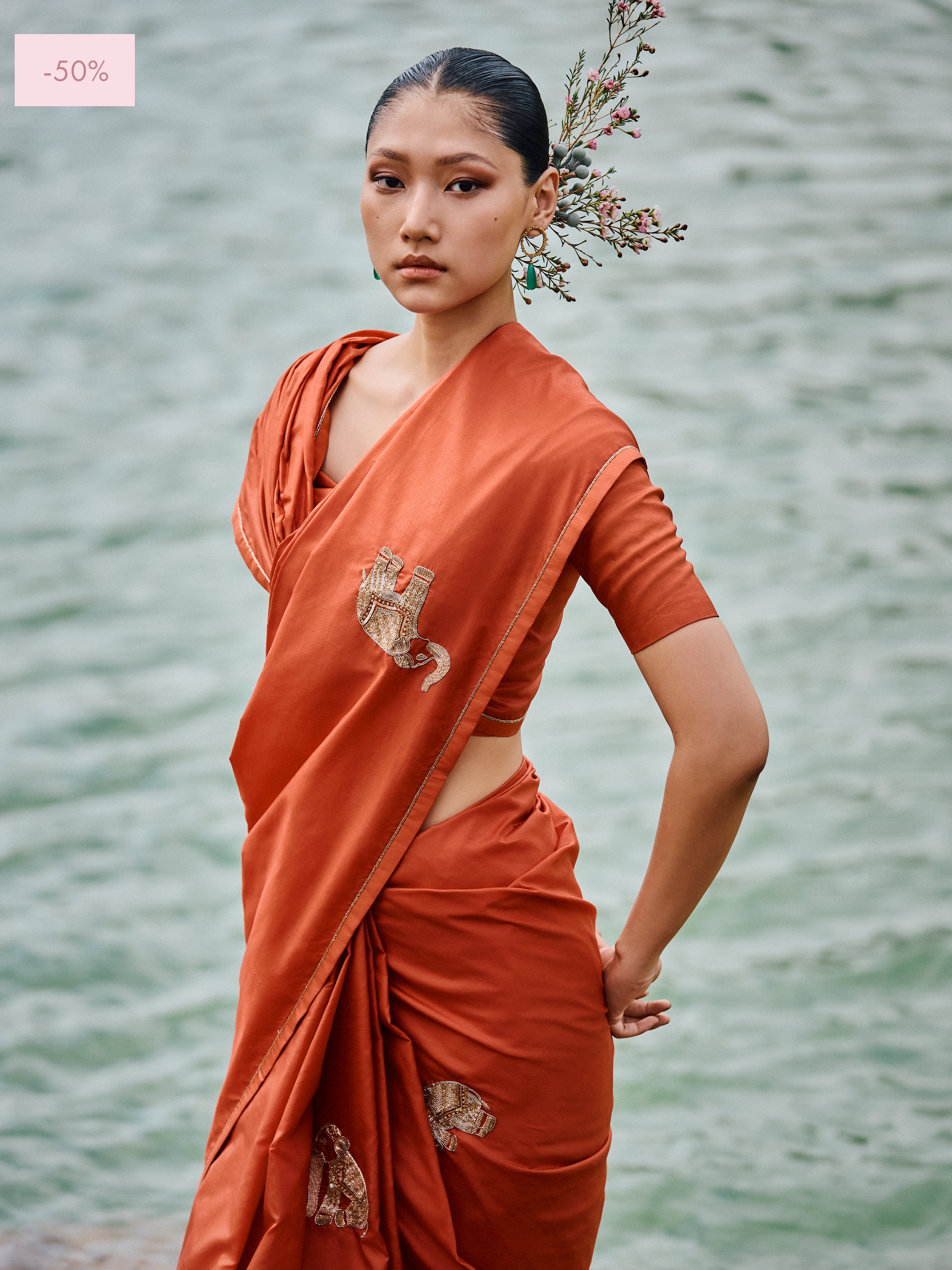 'Rasika' Rustic Orange Saree features Hand Embroidered border along with Gold silver Elephant Butis all over and is paired with pure silk blouse.