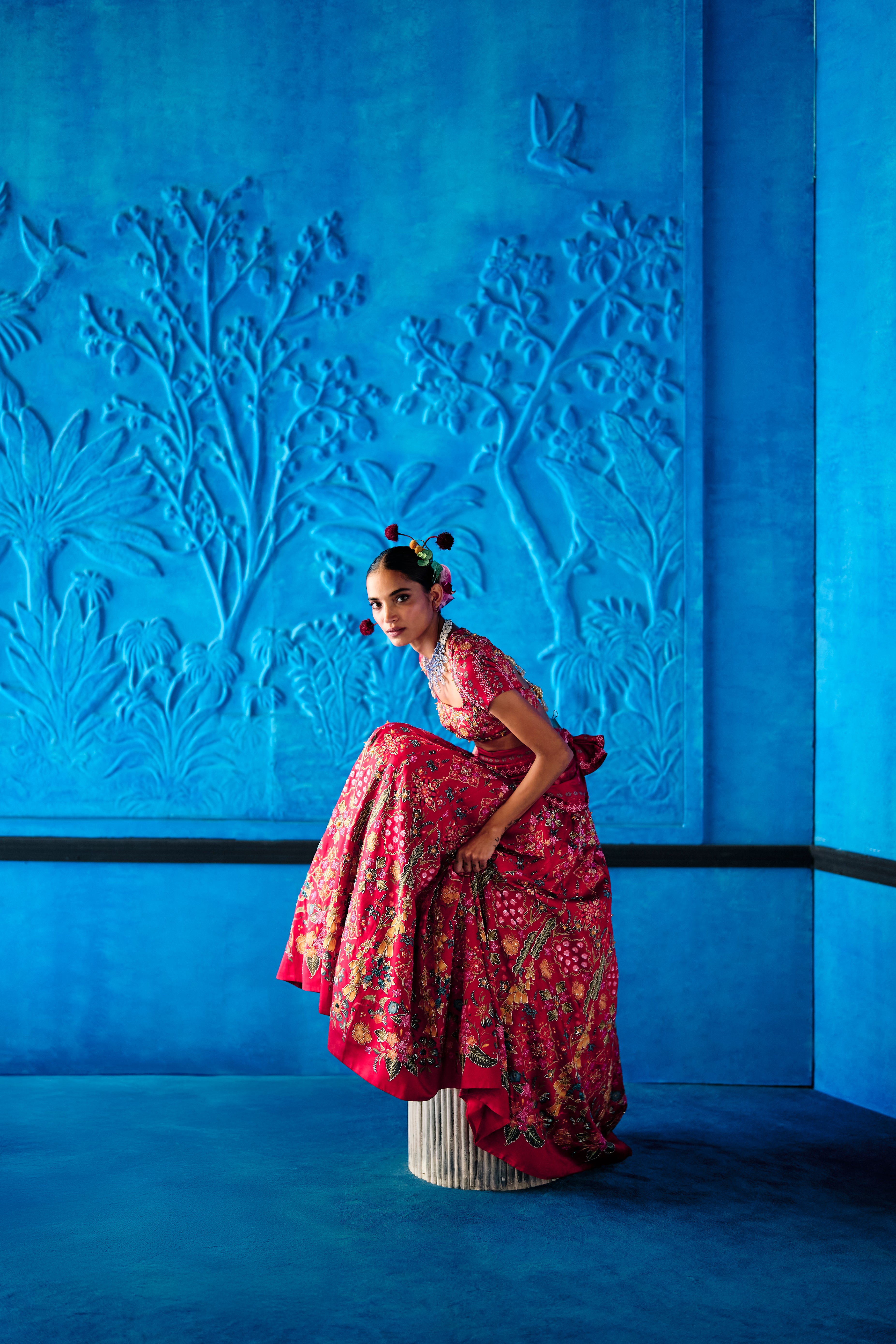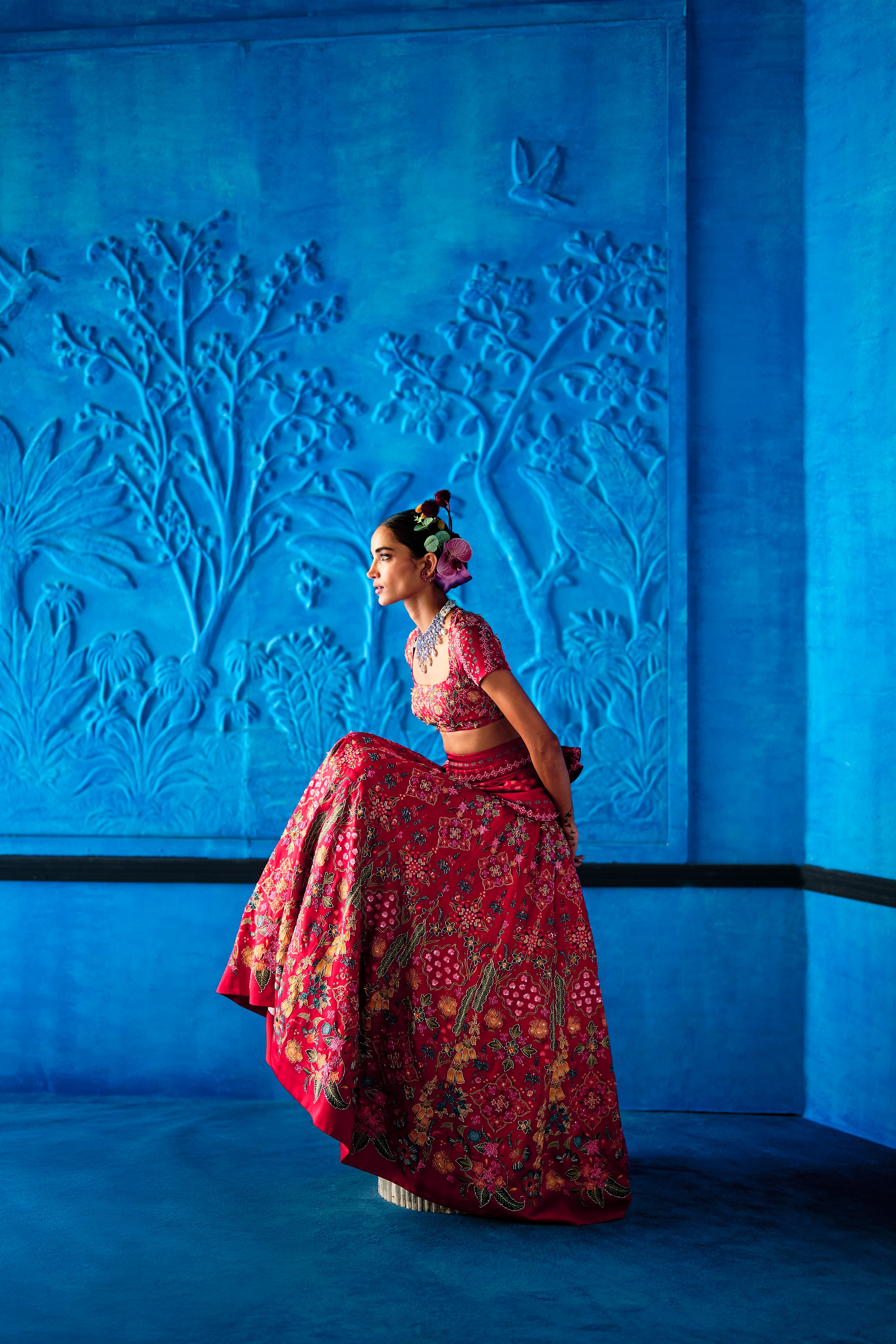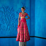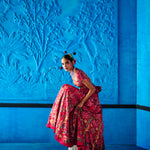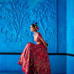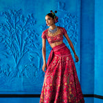 Red floral printed satin dupion lehenga intricately hand embroidered with cutdana, beads and sequins details. Paired with a matching floral printed embroidered blouse featuring cap sleeves and habutai dupatta edged with embroidery.